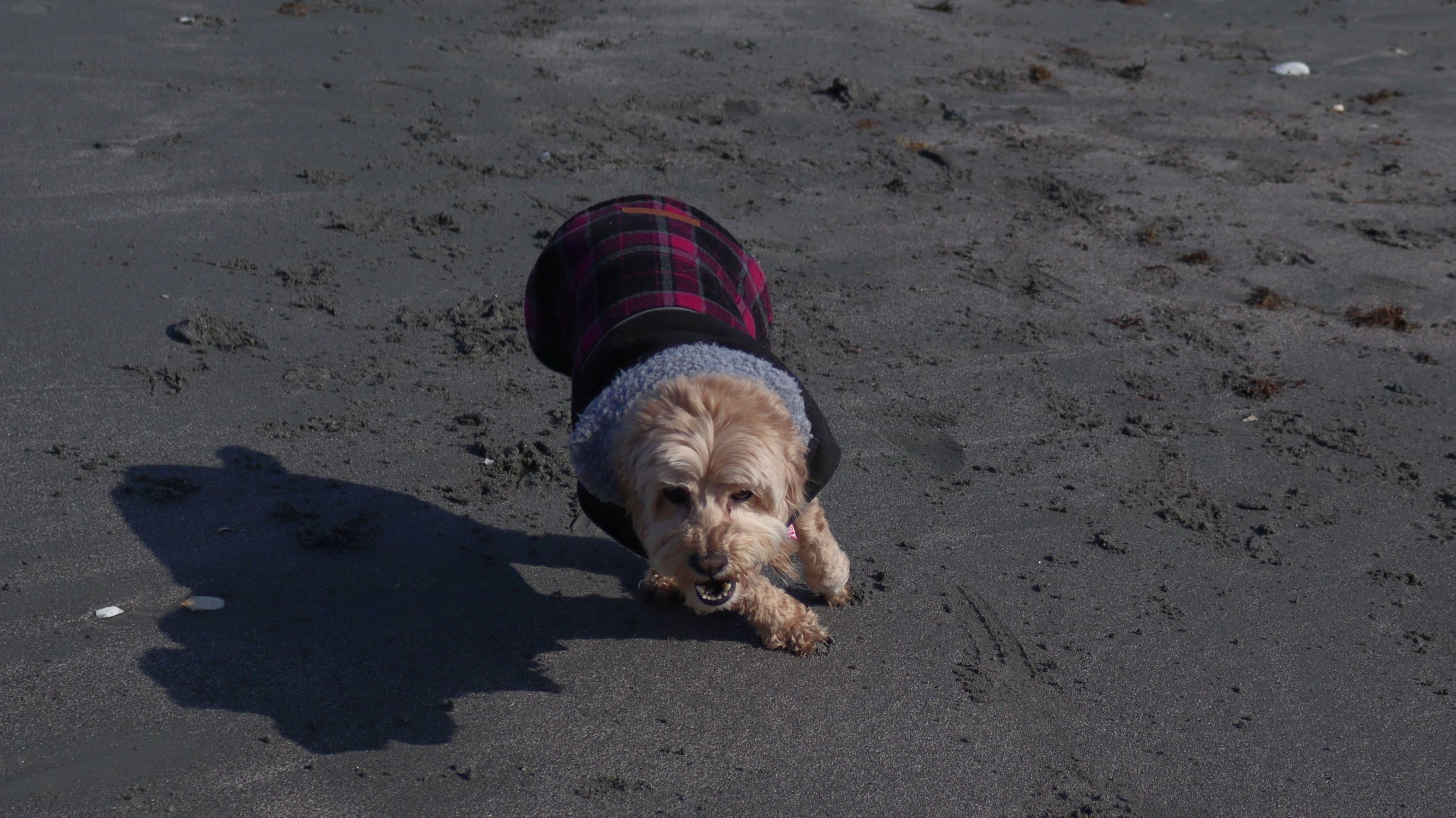 We returned here to do a full walk on the beach when the weather was warmer than January! It was a week after Labor Day, and still real nice out, but there were very few people on the beach. There were a lot of surfers though, as an off-shore storm enhanced the size of the waves. There were some other dogs running around freely on the beach as well. Lexi rolled around in the muddy sand, but fortunately a big wave cleaned her off a little bit later!