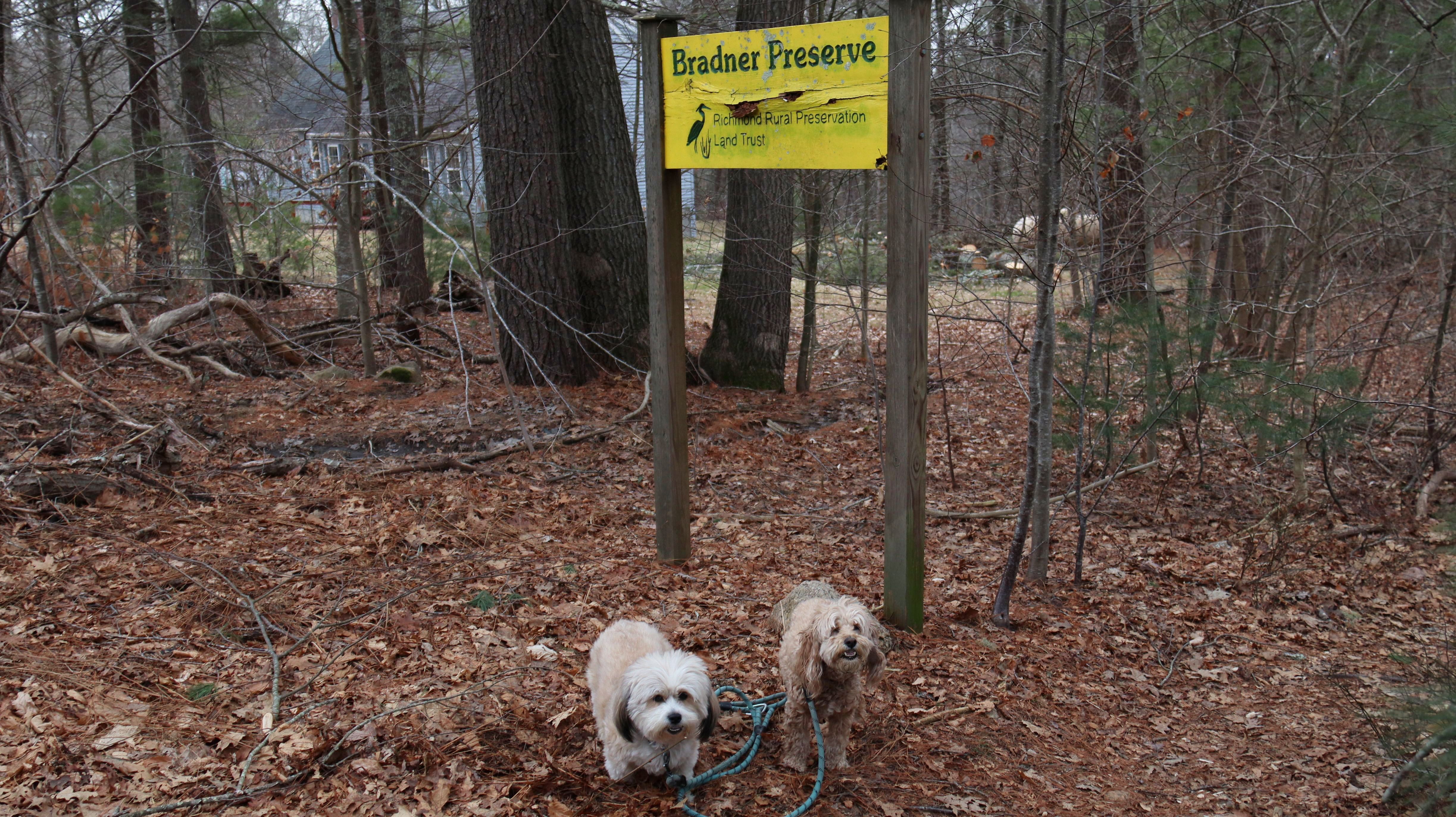 Okay, so I was fascinated by the big blue water tower on this property. The trail passes right next to the tower. It is just such an odd and unusual thing to see on a trail like this. I seem to notice a bunch of these water towers in my travels through Rhode Island. I'm sure they exist in every state, but for some reason I seem to notice them more here. It was a challenge to get the dogs in a picture with the big blue water tower. It reminded me of a giant Smurf in the sky! Okay, enough about the giant Smurf.. I mean water tower. The trail here is short, it's a half mile, perfectly flat, stone dust loop trail. There are educational signs along the way that feature tidbits about the history of the town of Richmond. On the back side of the loop, is the trail head for another longer trail. Since this visit was the 2nd stop of the evening, and I didn't leave the house until after work, and it was an hour and a half drive to this part of Rhode Island, we did not have time to walk the longer trail. Perhaps we will return someday, to walk the other trail under the watchful eye of the giant Smurf!