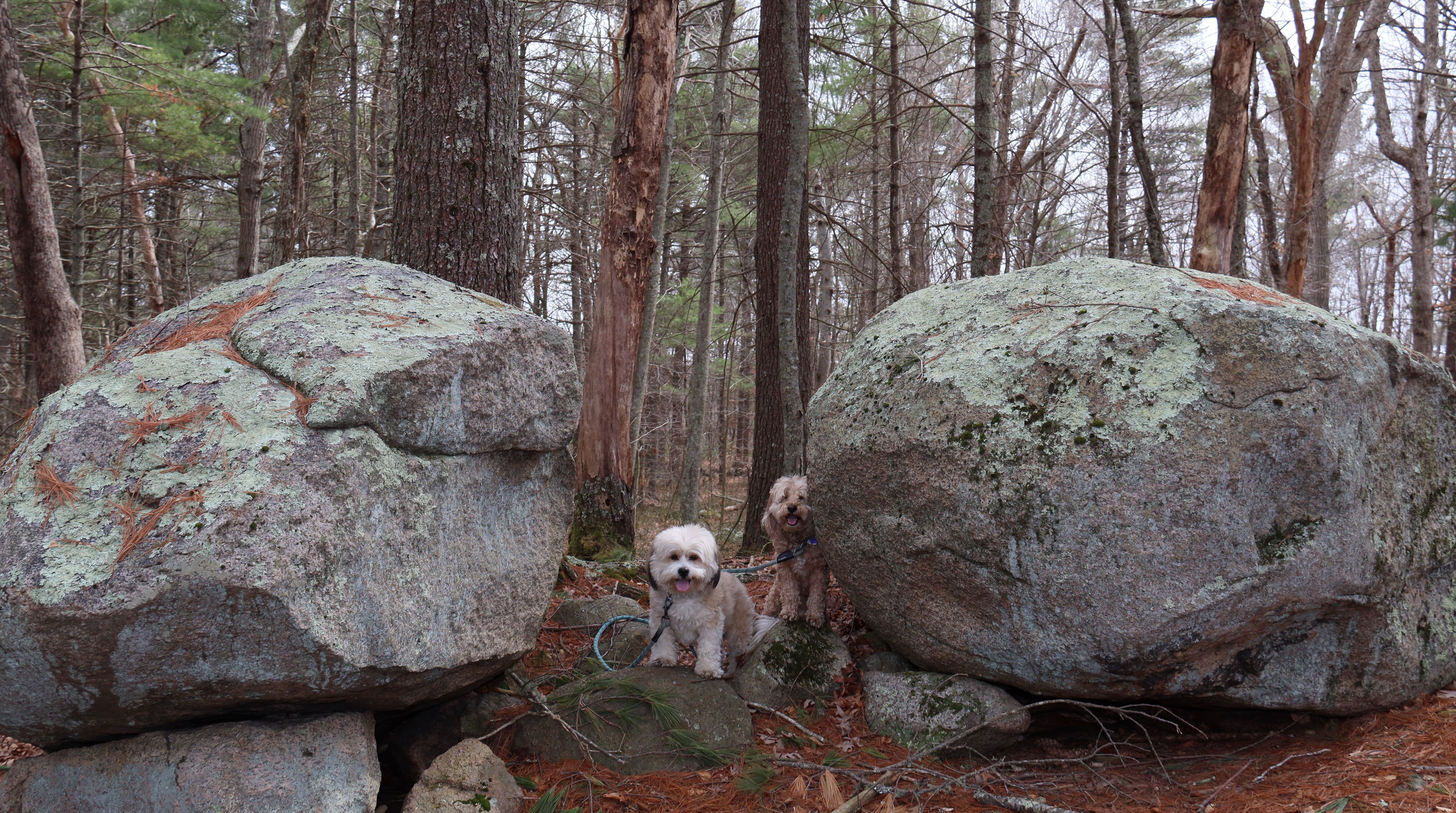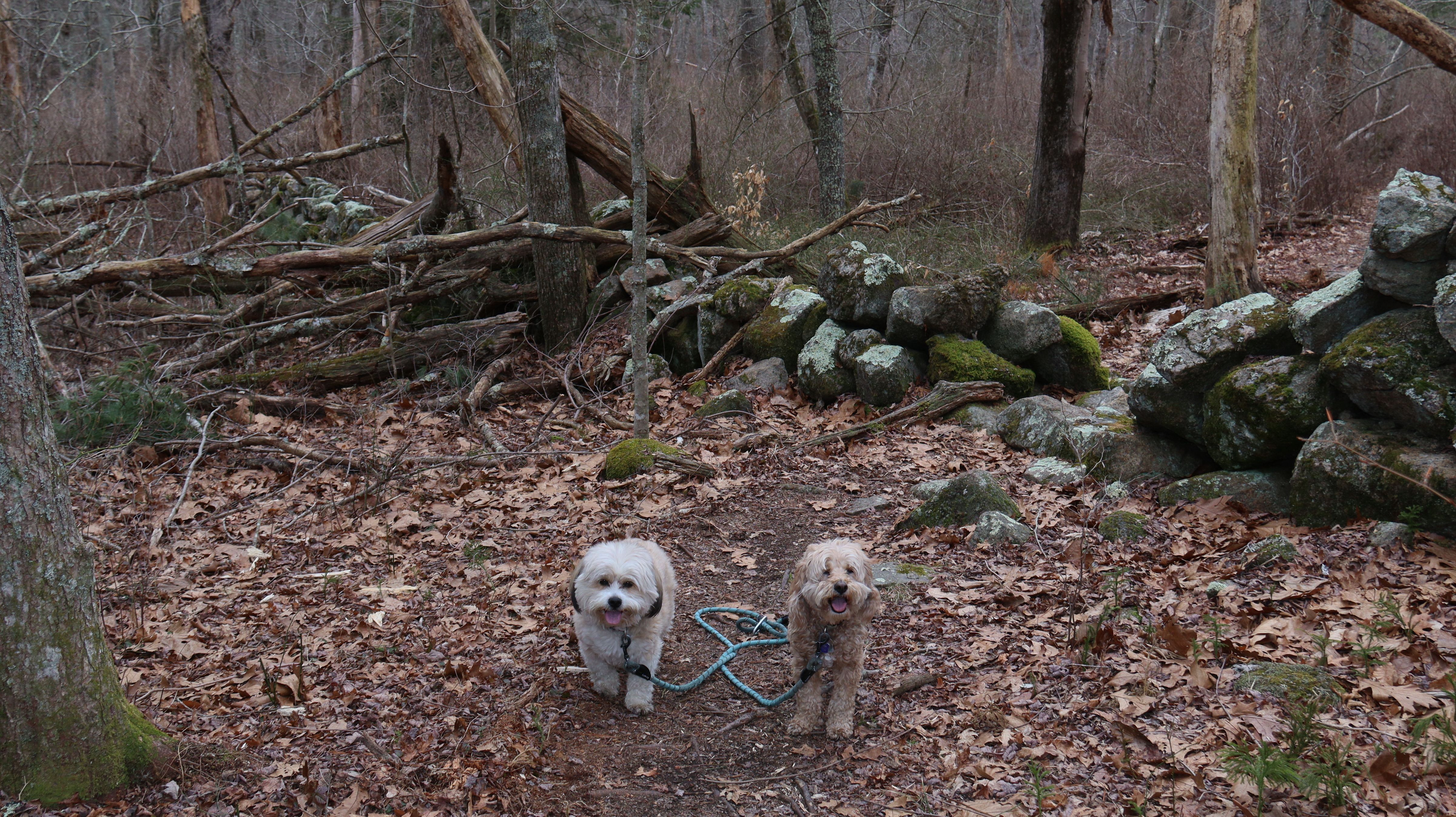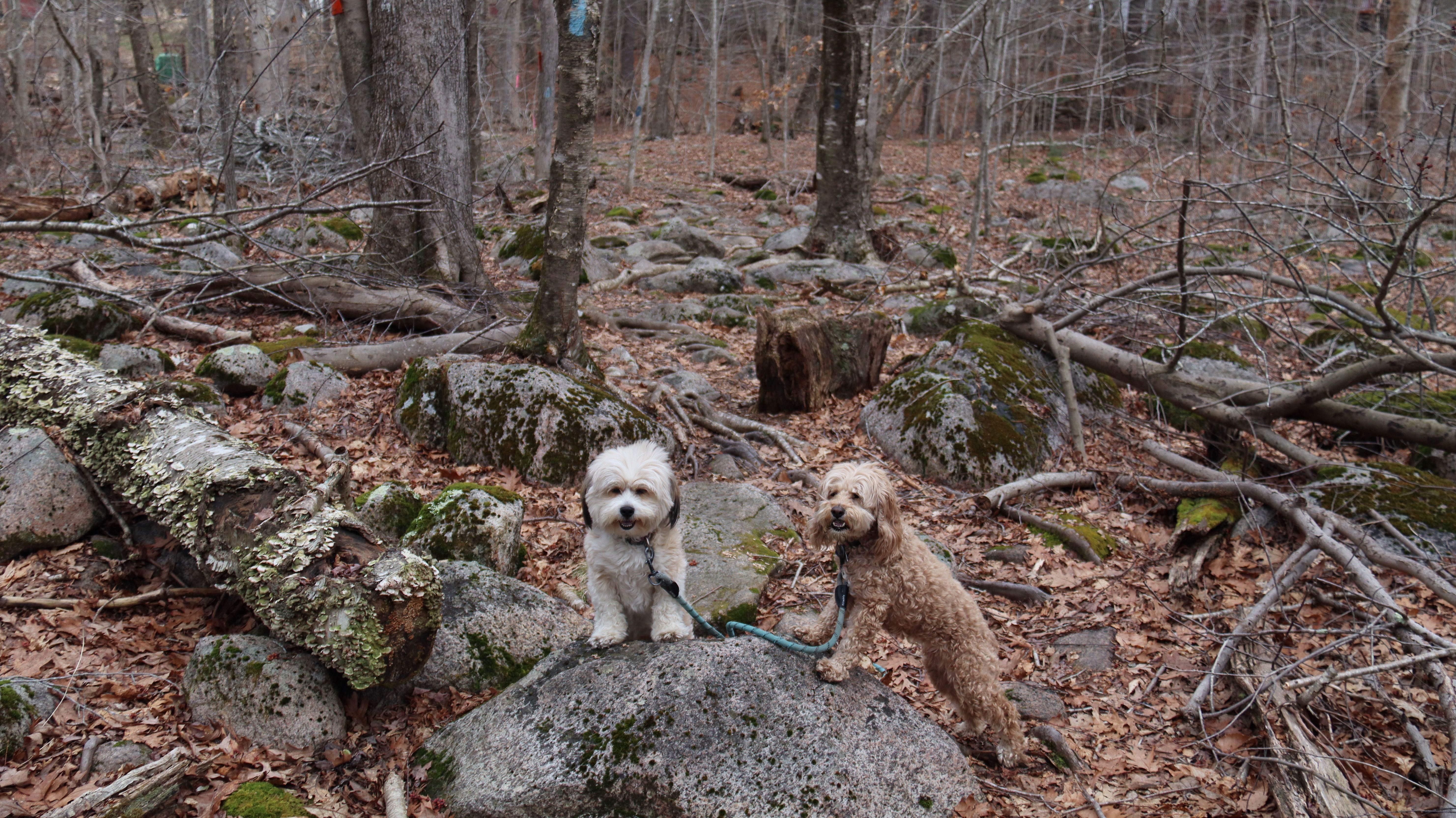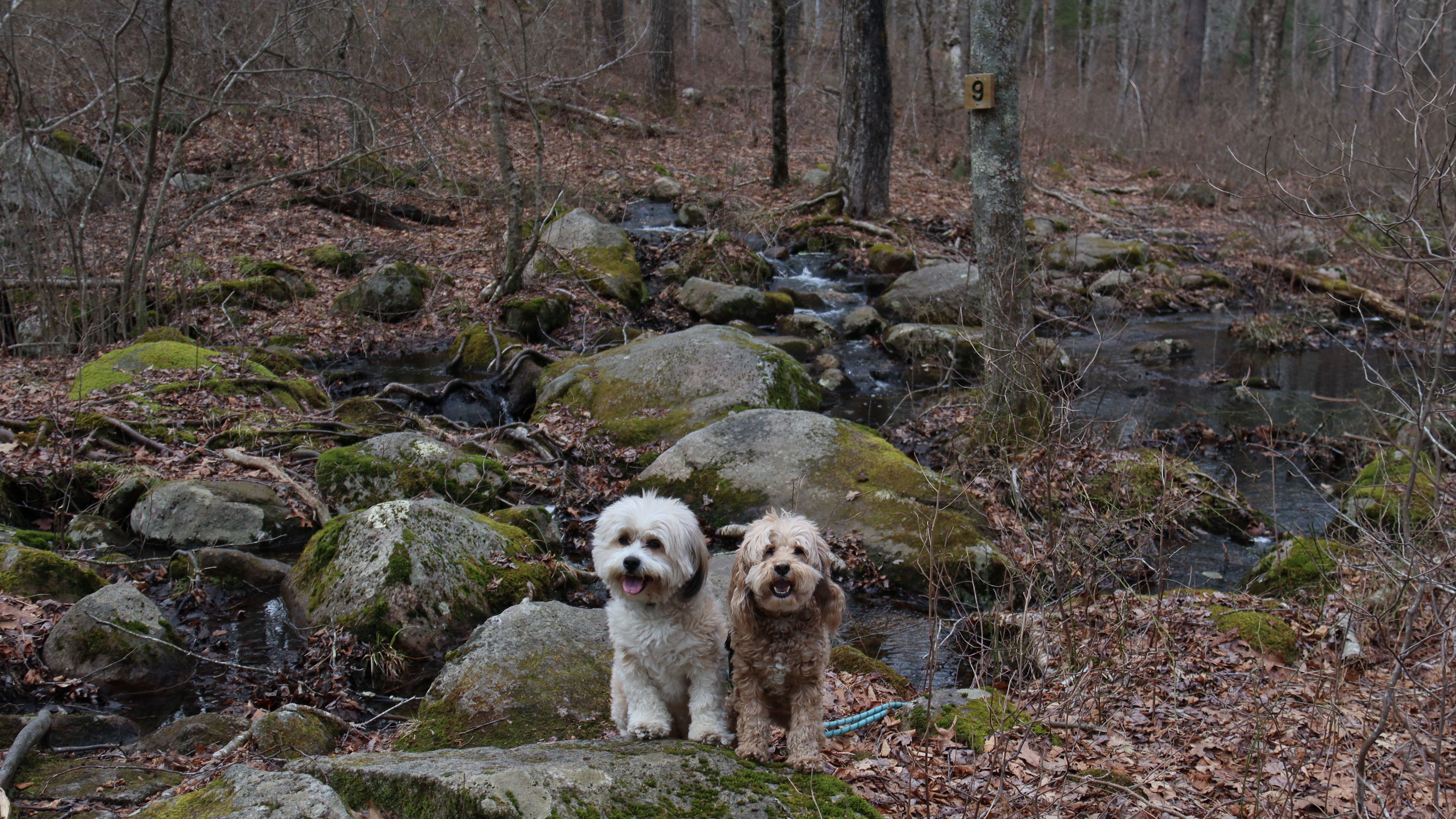 This wasn't too bad for a simple walk in the woods. The blue blazed trail leads out to Hanging Rock, a giant rock at the top of a small hill. You can hike it as an out and back, or you could use the yellow blazed trail and make it a loop. We made it a loop. The blue trail was pretty easy, and mostly dry. There is a rocky section toward the beginning, and a few small ups and downs, but nothing too crazy. There are nice foot bridges over a stream as well. The yellow trail is more rugged, and includes a stream crossing on rocks. Of course, Mandy decided to just go through the stream instead. There were three muddy, or flooded areas on the yellow trail that I had to carry the dogs across so I wouldn't need to give them a bath when I got home. The whole thing wasn't too bad, and it was just under two miles.