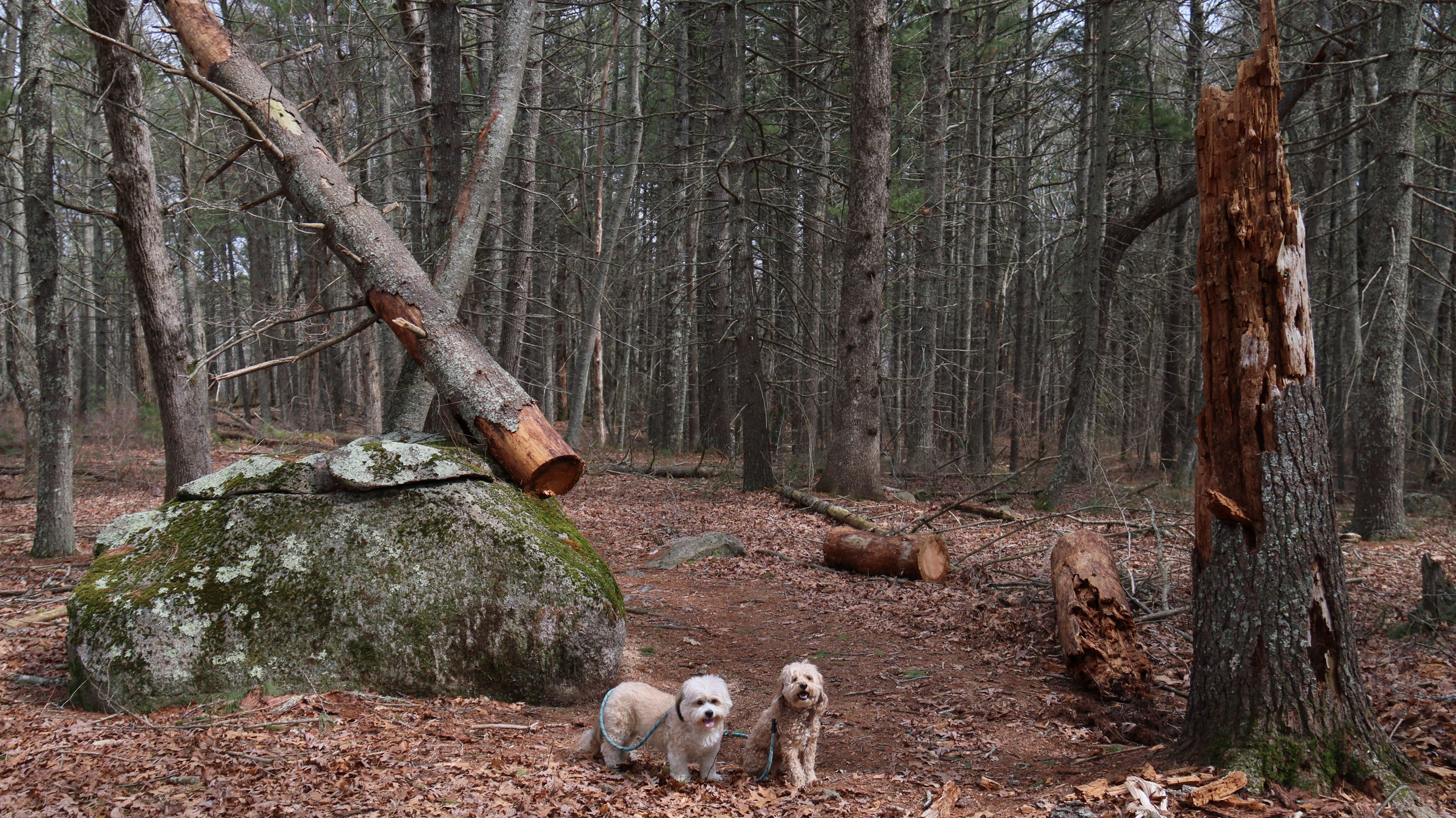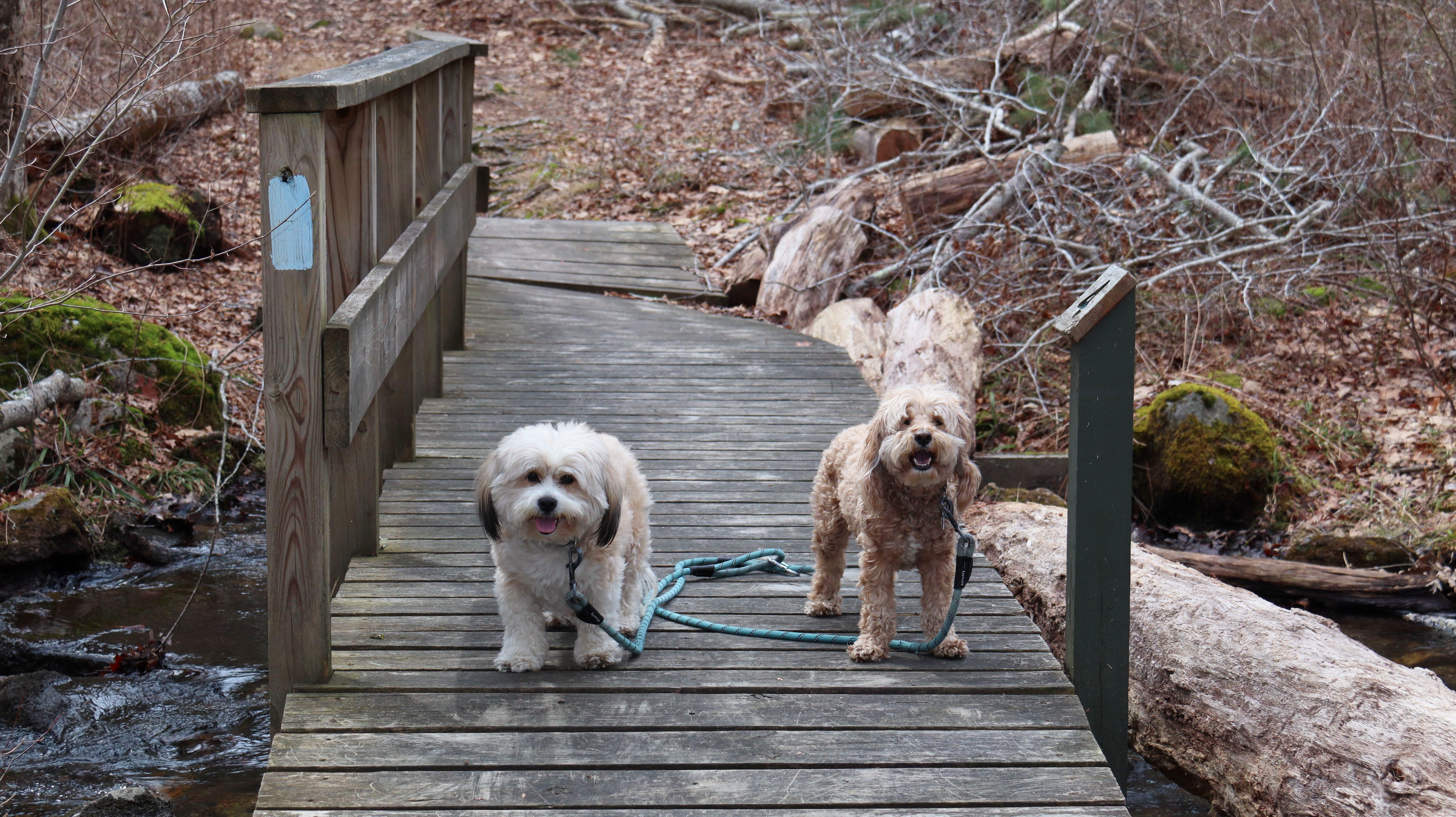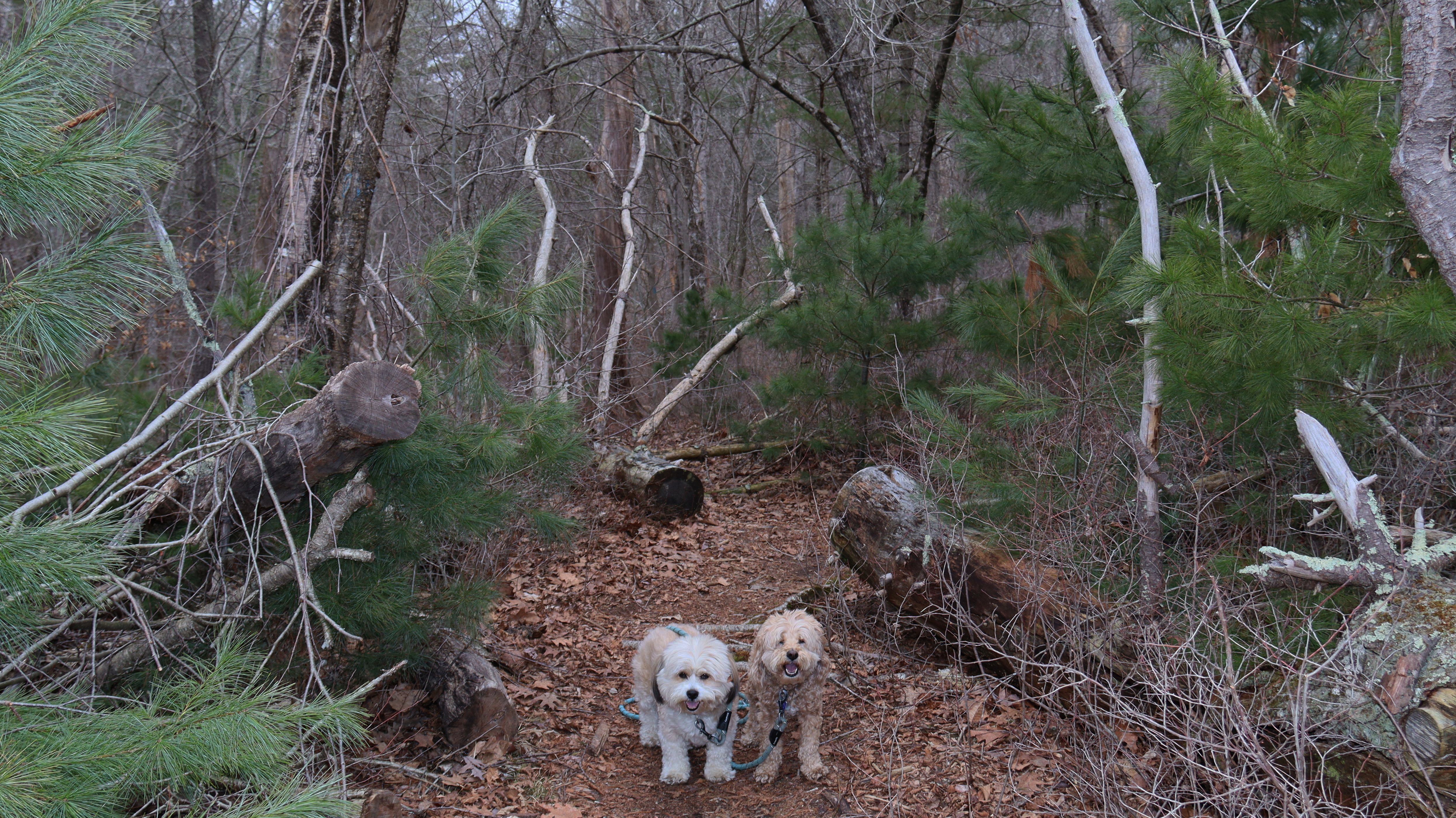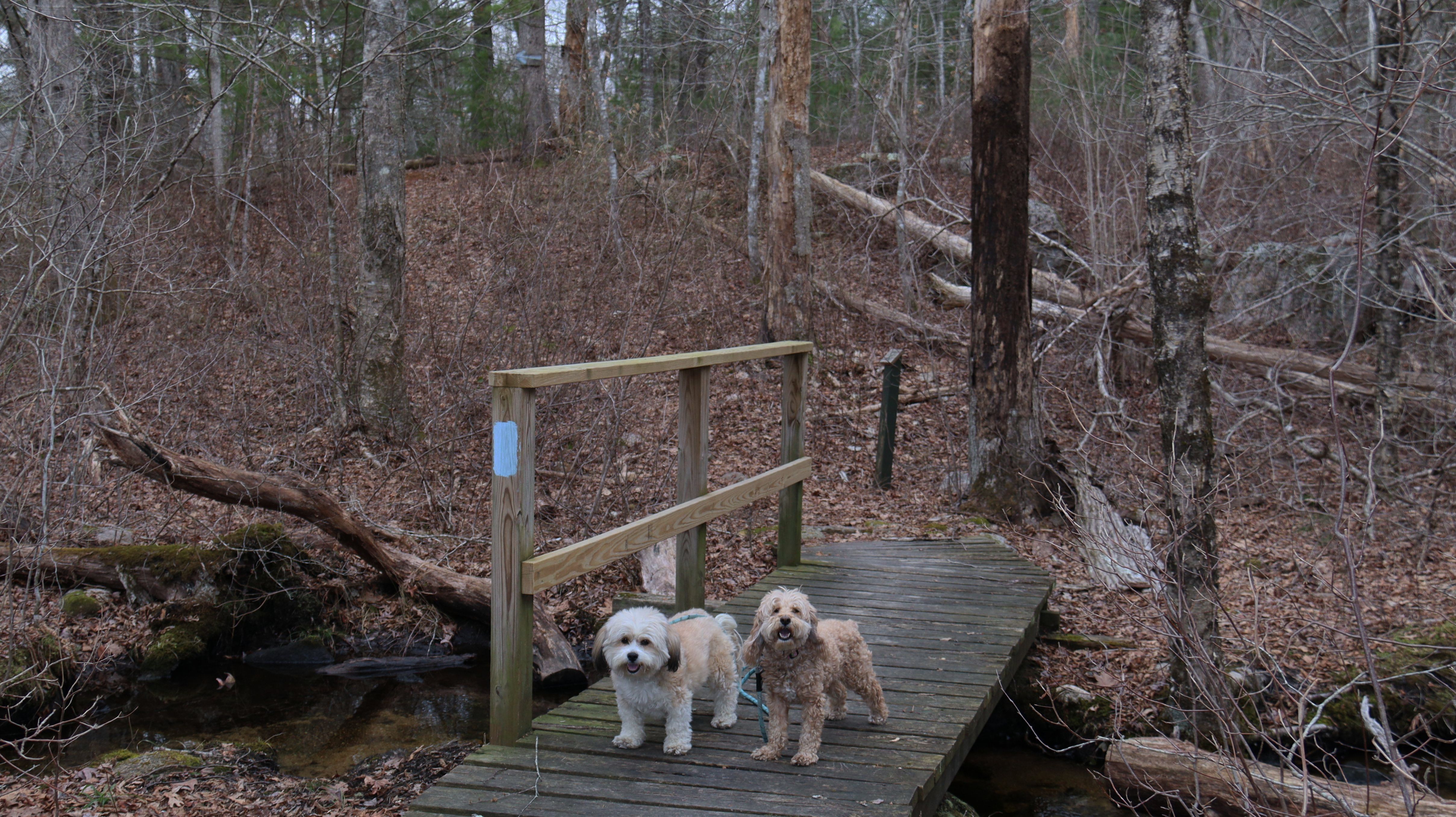 This wasn't too bad for a simple walk in the woods. The blue blazed trail leads out to Hanging Rock, a giant rock at the top of a small hill. You can hike it as an out and back, or you could use the yellow blazed trail and make it a loop. We made it a loop. The blue trail was pretty easy, and mostly dry. There is a rocky section toward the beginning, and a few small ups and downs, but nothing too crazy. There are nice foot bridges over a stream as well. The yellow trail is more rugged, and includes a stream crossing on rocks. Of course, Mandy decided to just go through the stream instead. There were three muddy, or flooded areas on the yellow trail that I had to carry the dogs across so I wouldn't need to give them a bath when I got home. The whole thing wasn't too bad, and it was just under two miles.