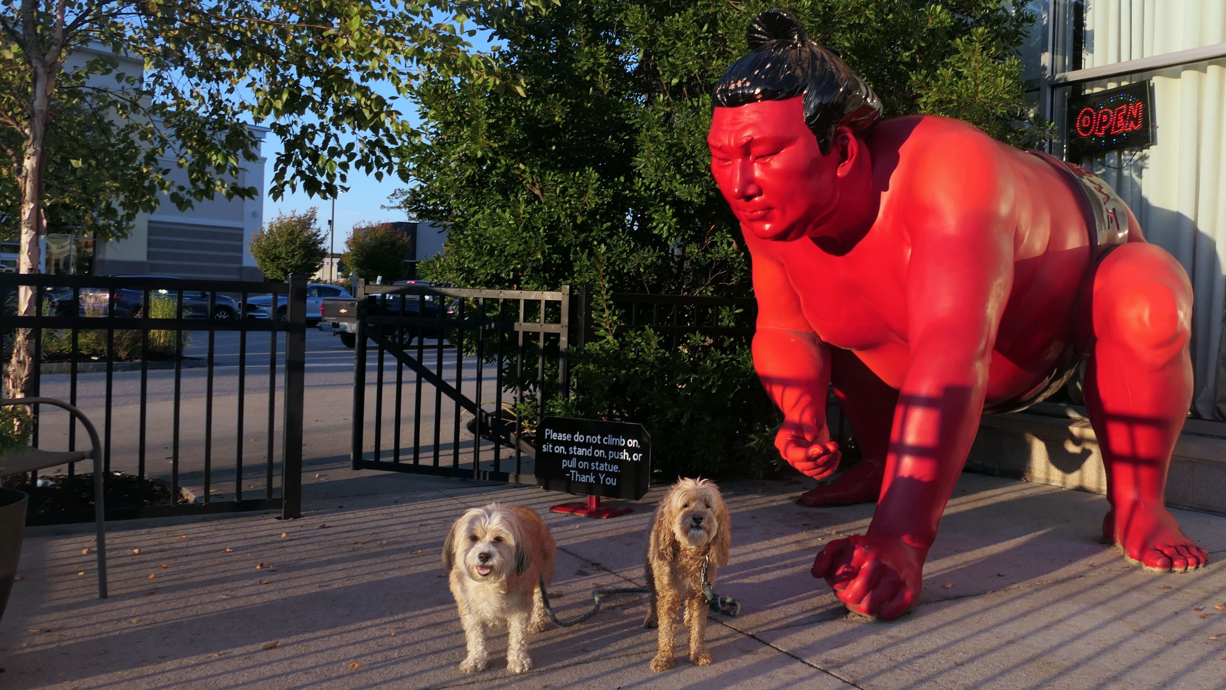 We stopped at this plaza for a bite to eat on our way home from Maine. The statue is in front of Kume Japanese Steakhouse. That's not actually where we ate, but I had to take a photo of the dogs in front of the statue!