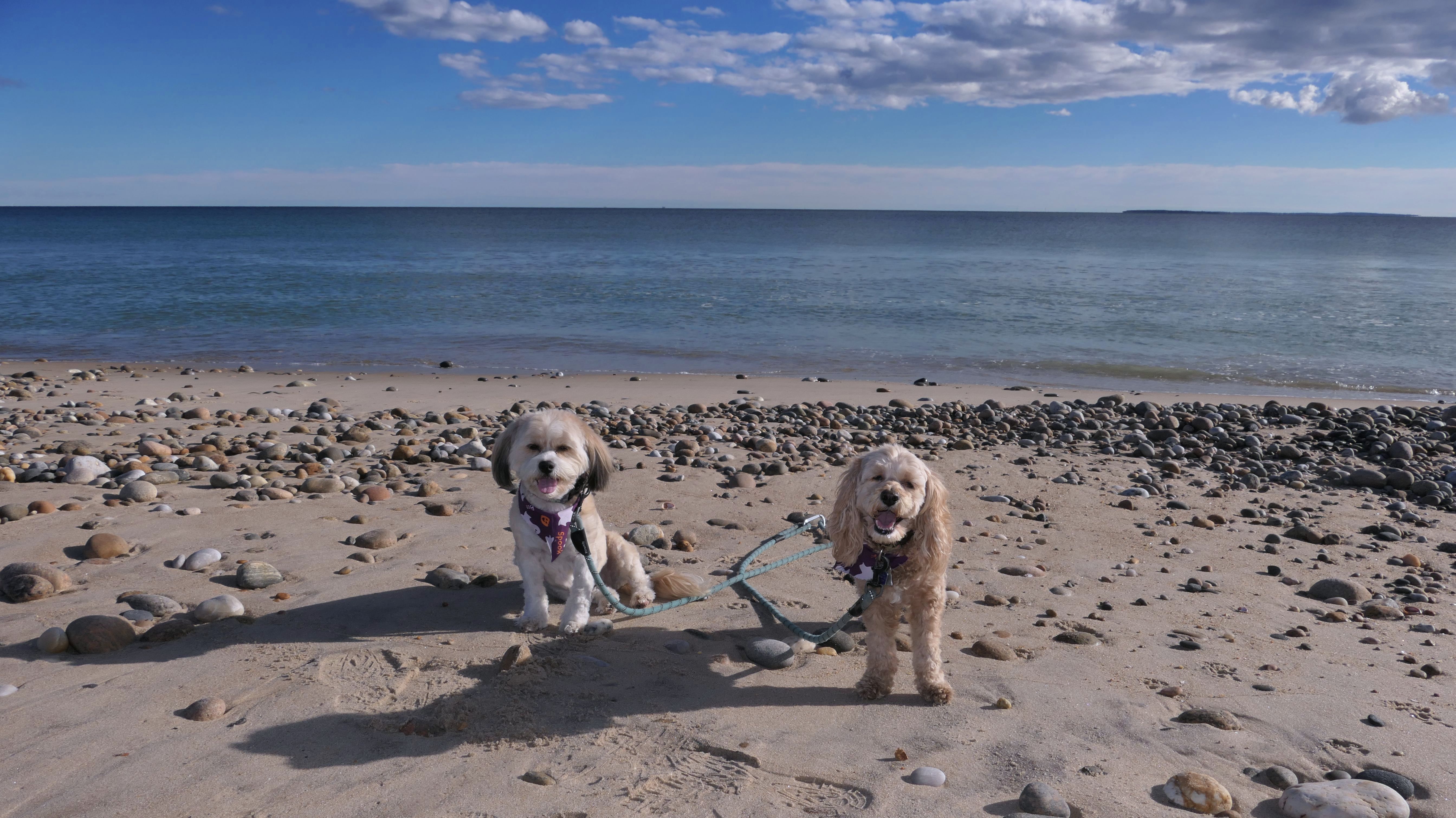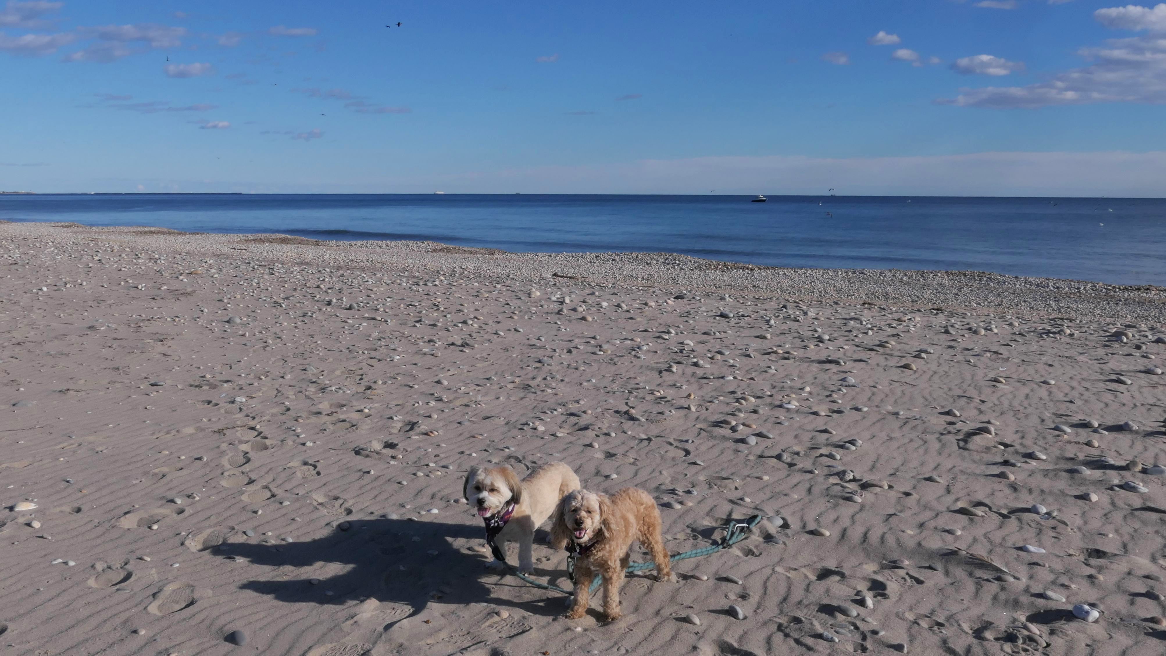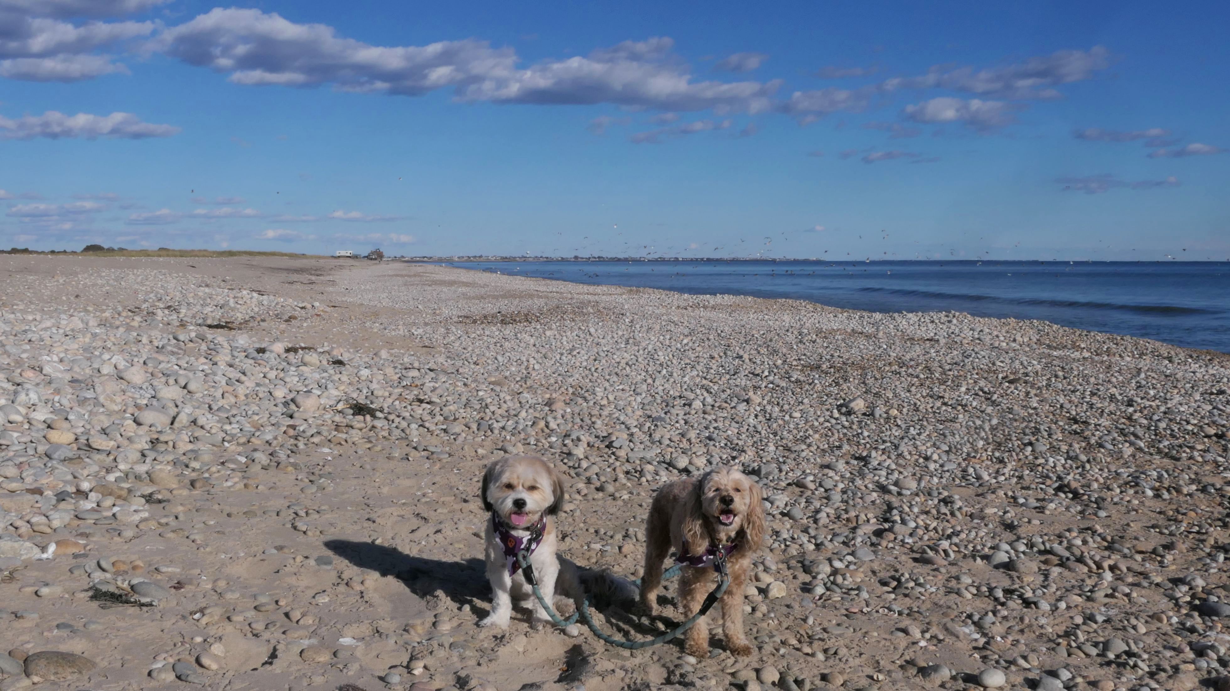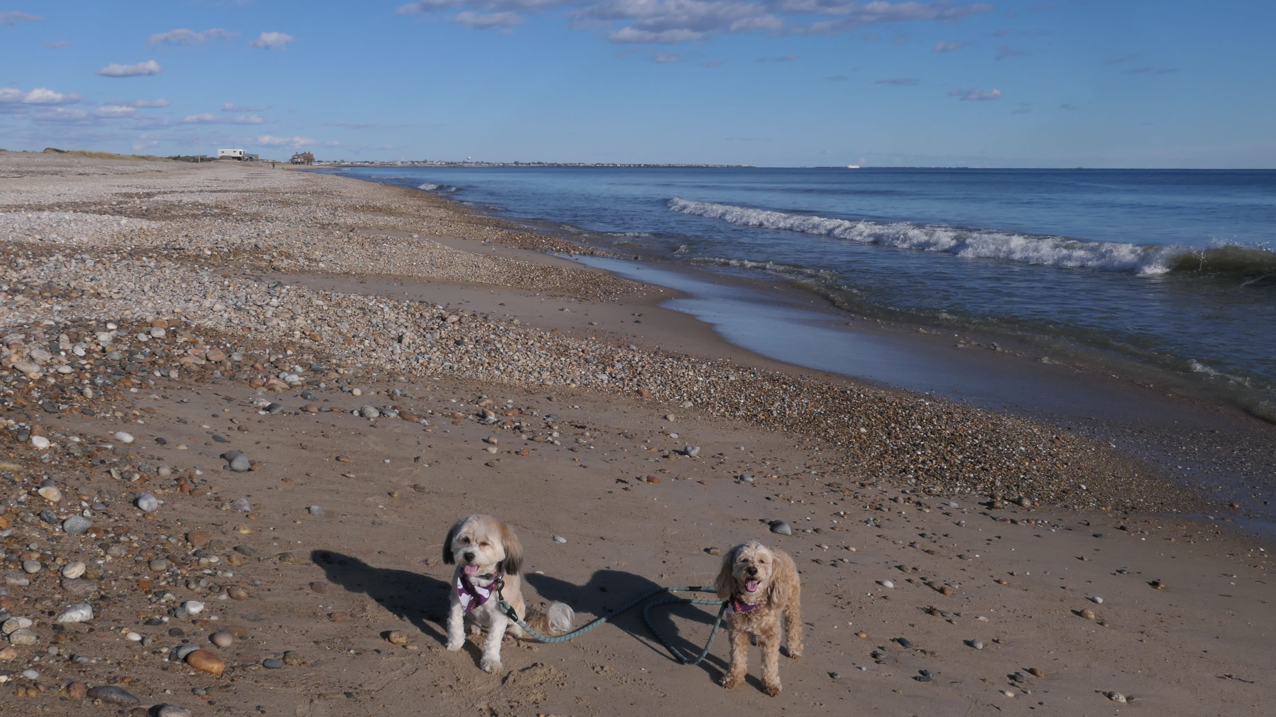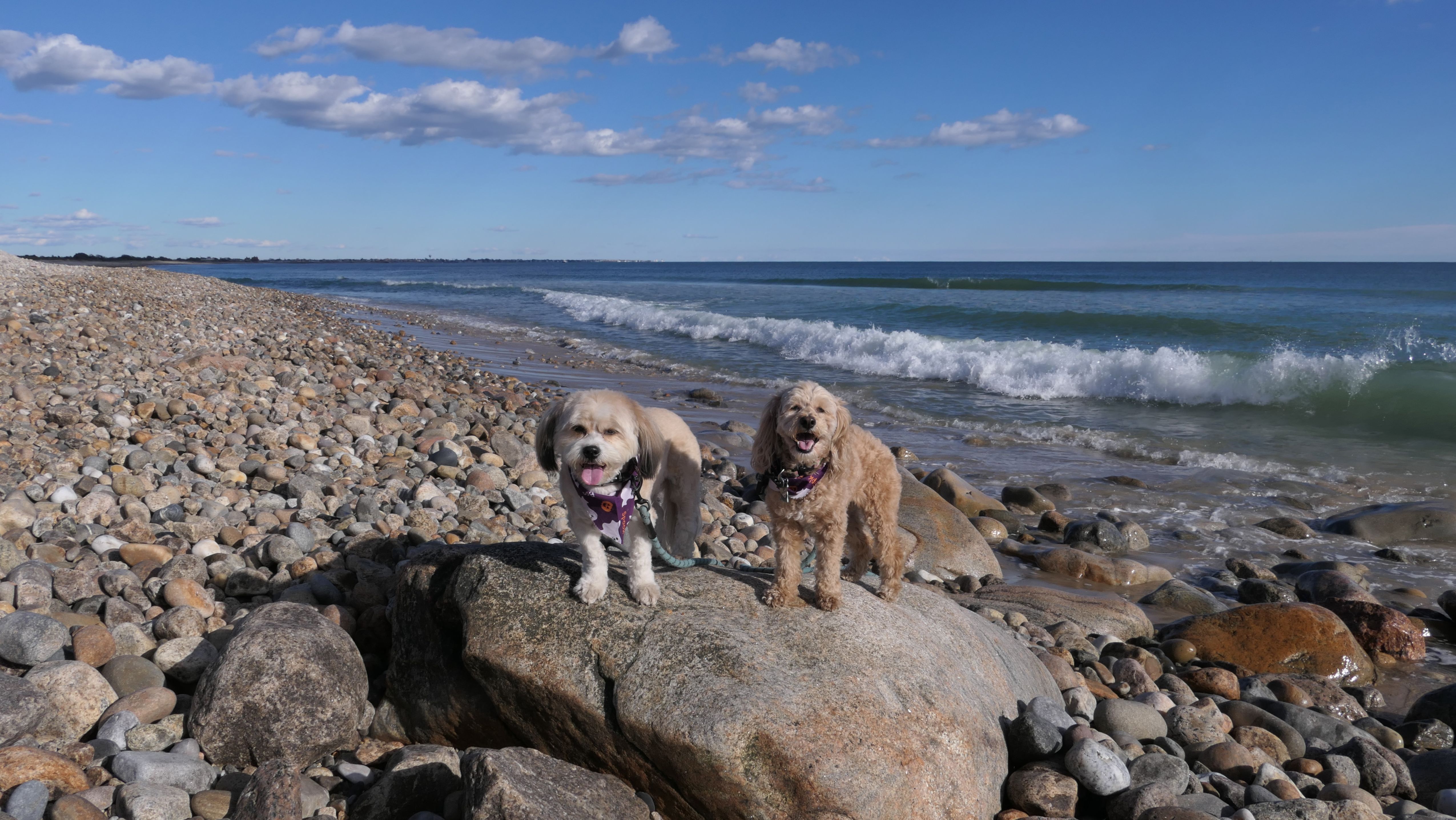 This was our second visit to this "secret" beach. We visited at the end of November last time, but this time it was a hot summer day in June! We stopped here while walking back to our car parked at Deep Hole, returning from the Ocean Avenue Shoreline Access Point. There's plenty of seaweed and muck at the edge of the beach, so it's not a great spot for the dogs to go into the water. We found a clean area near the rocks, where Mandy and Lexi were able to cool off. This is a neat spot for photos, but not a great beach for swimming or wading.