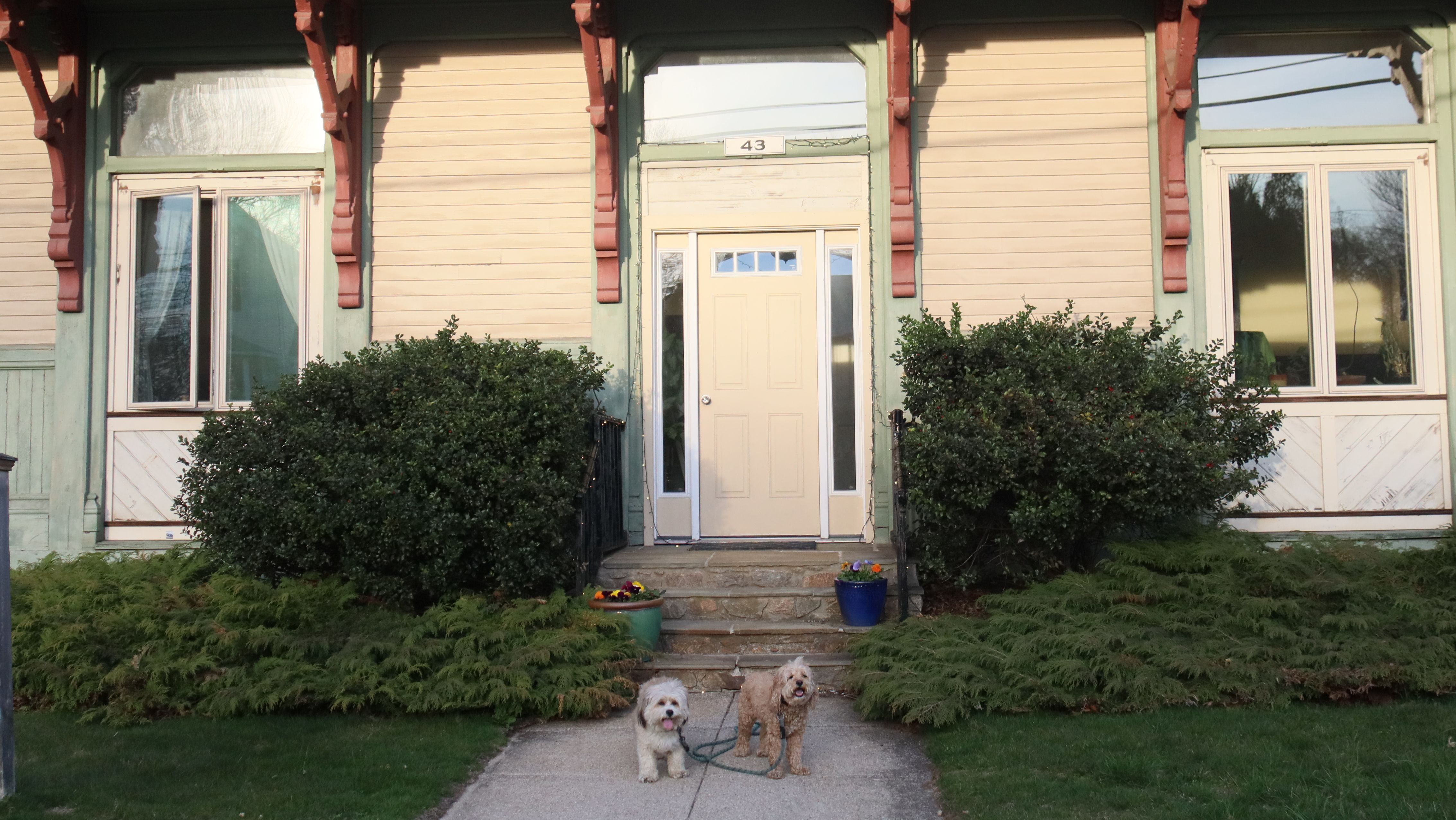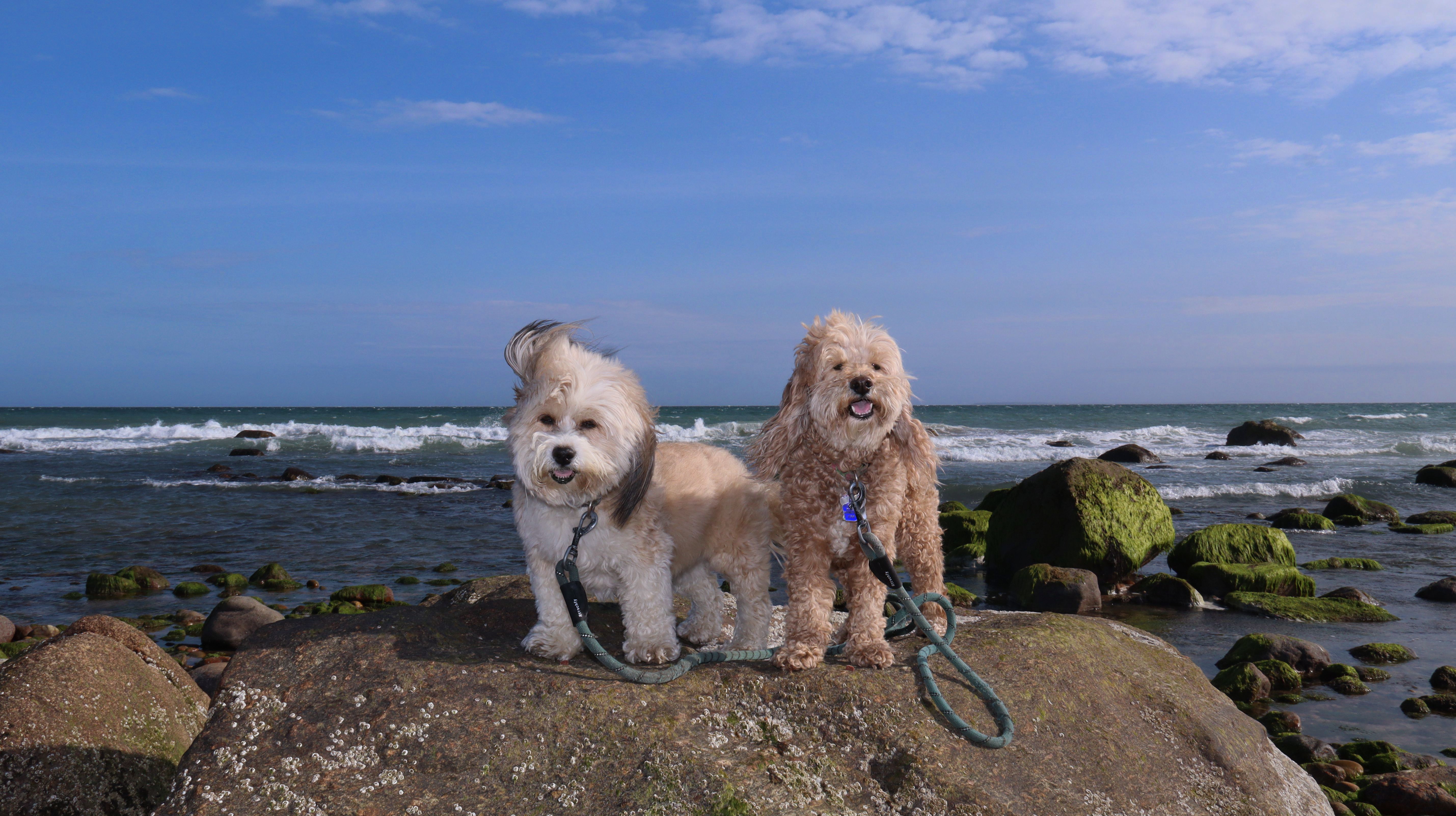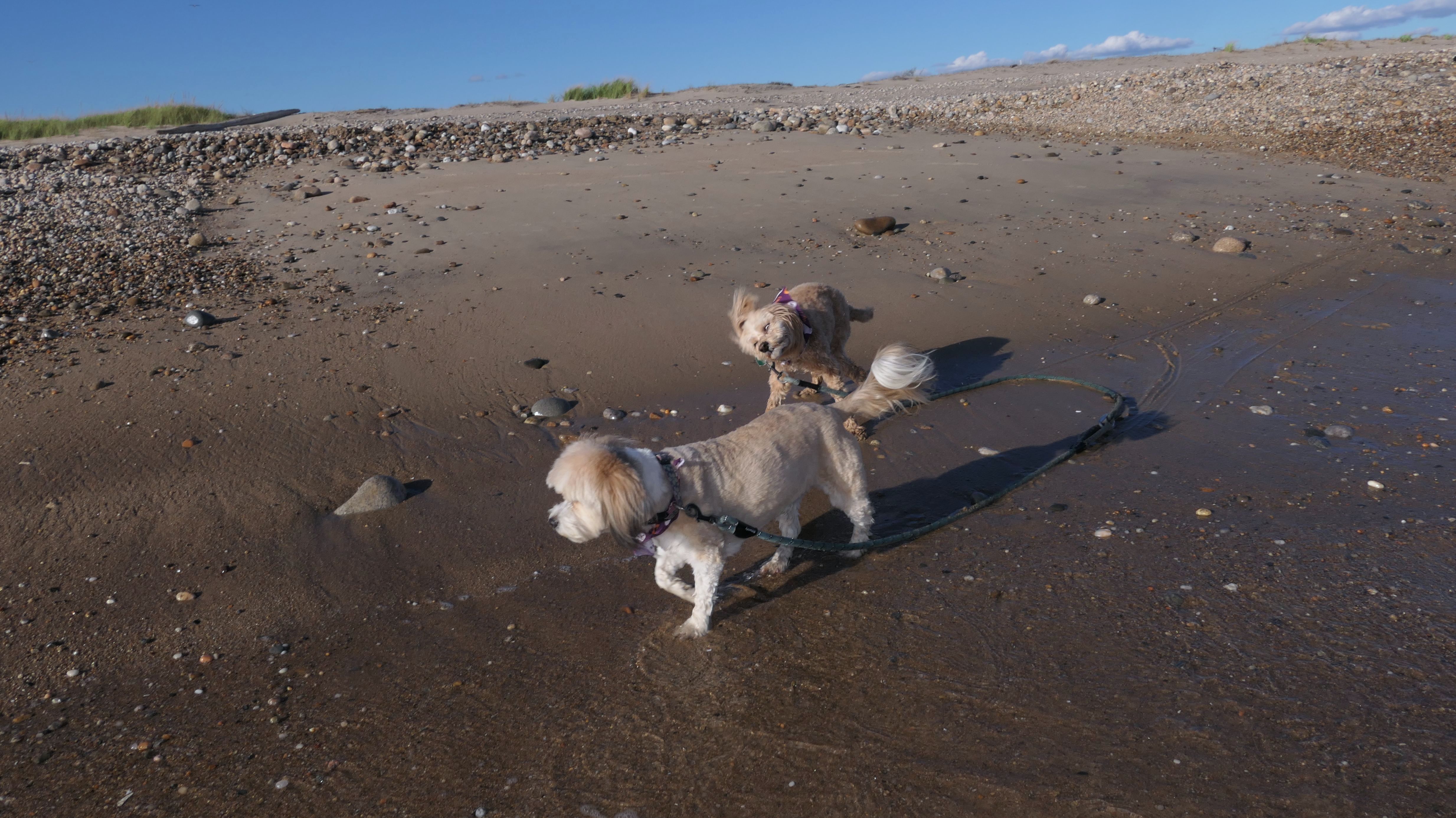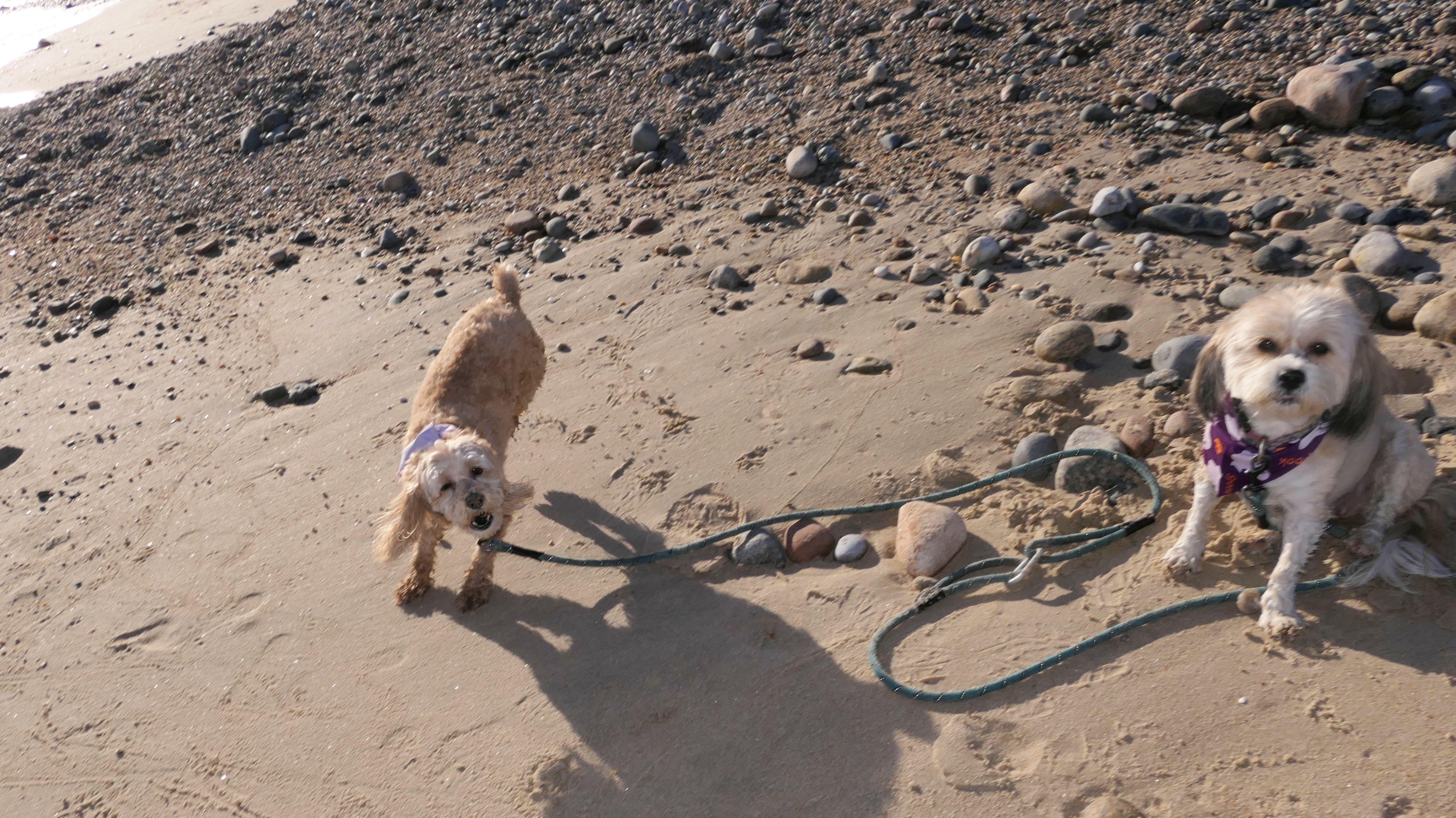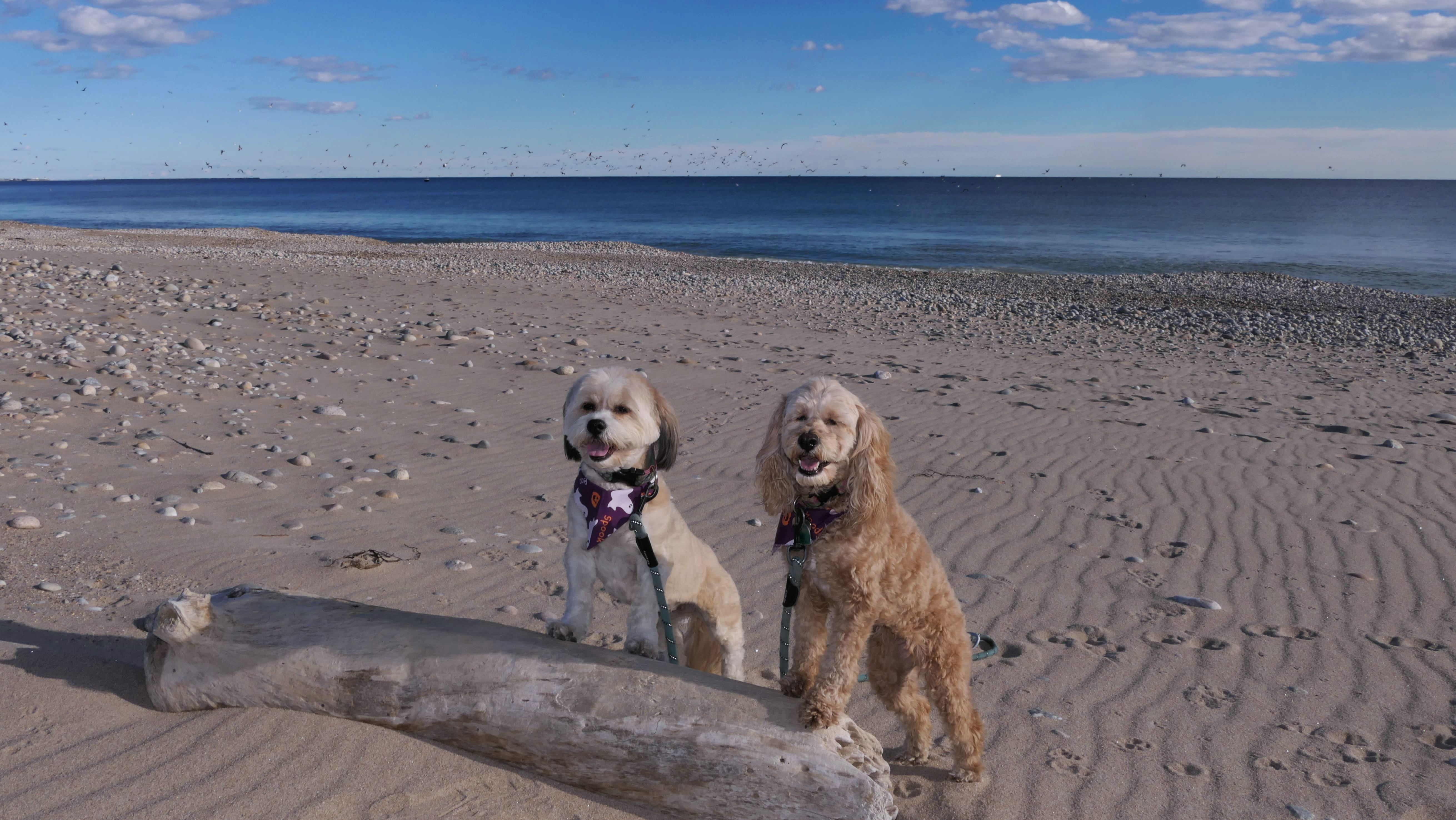 This was our second visit to this "secret" beach. We visited at the end of November last time, but this time it was a hot summer day in June! We stopped here while walking back to our car parked at Deep Hole, returning from the Ocean Avenue Shoreline Access Point. There's plenty of seaweed and muck at the edge of the beach, so it's not a great spot for the dogs to go into the water. We found a clean area near the rocks, where Mandy and Lexi were able to cool off. This is a neat spot for photos, but not a great beach for swimming or wading.