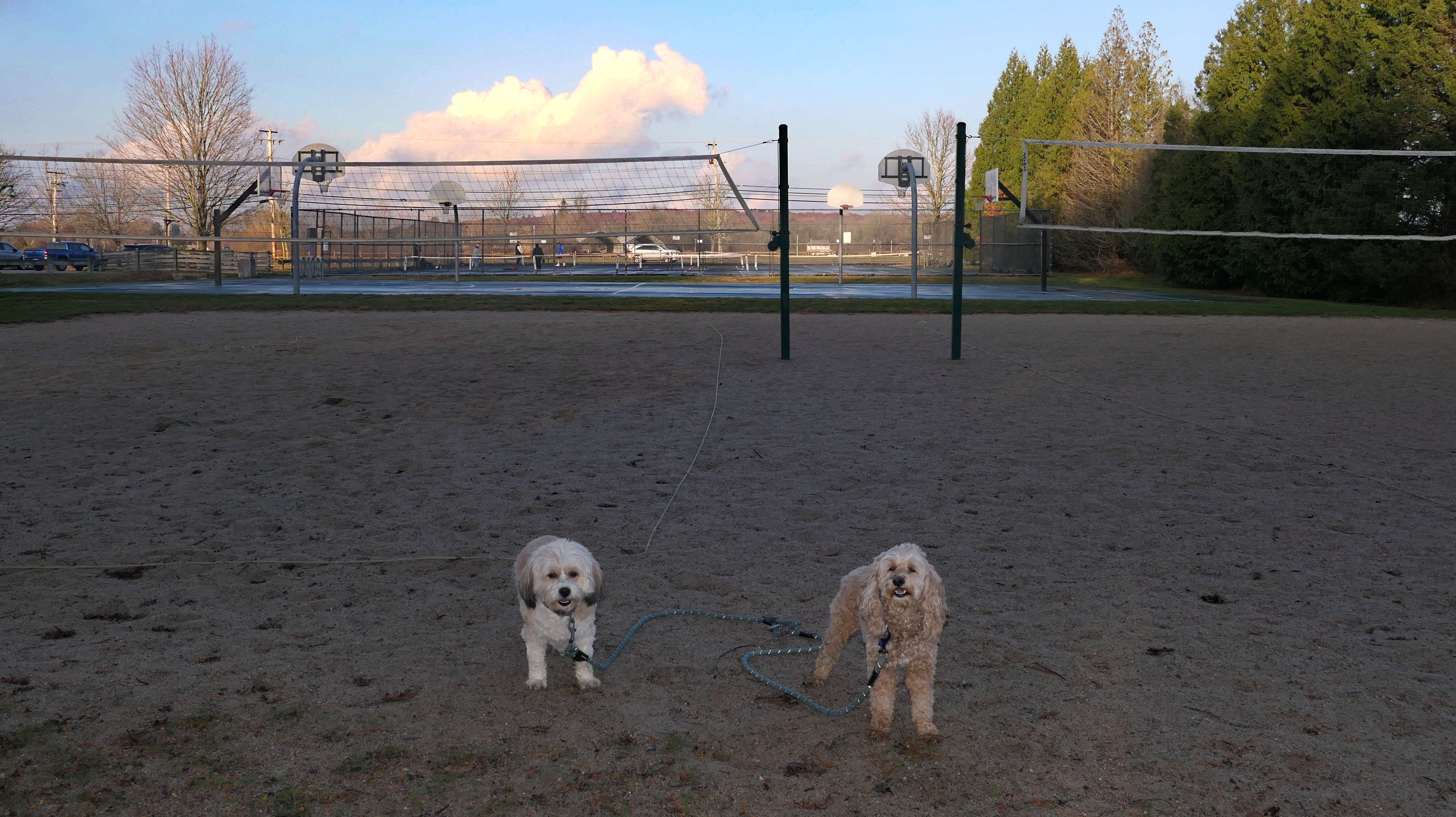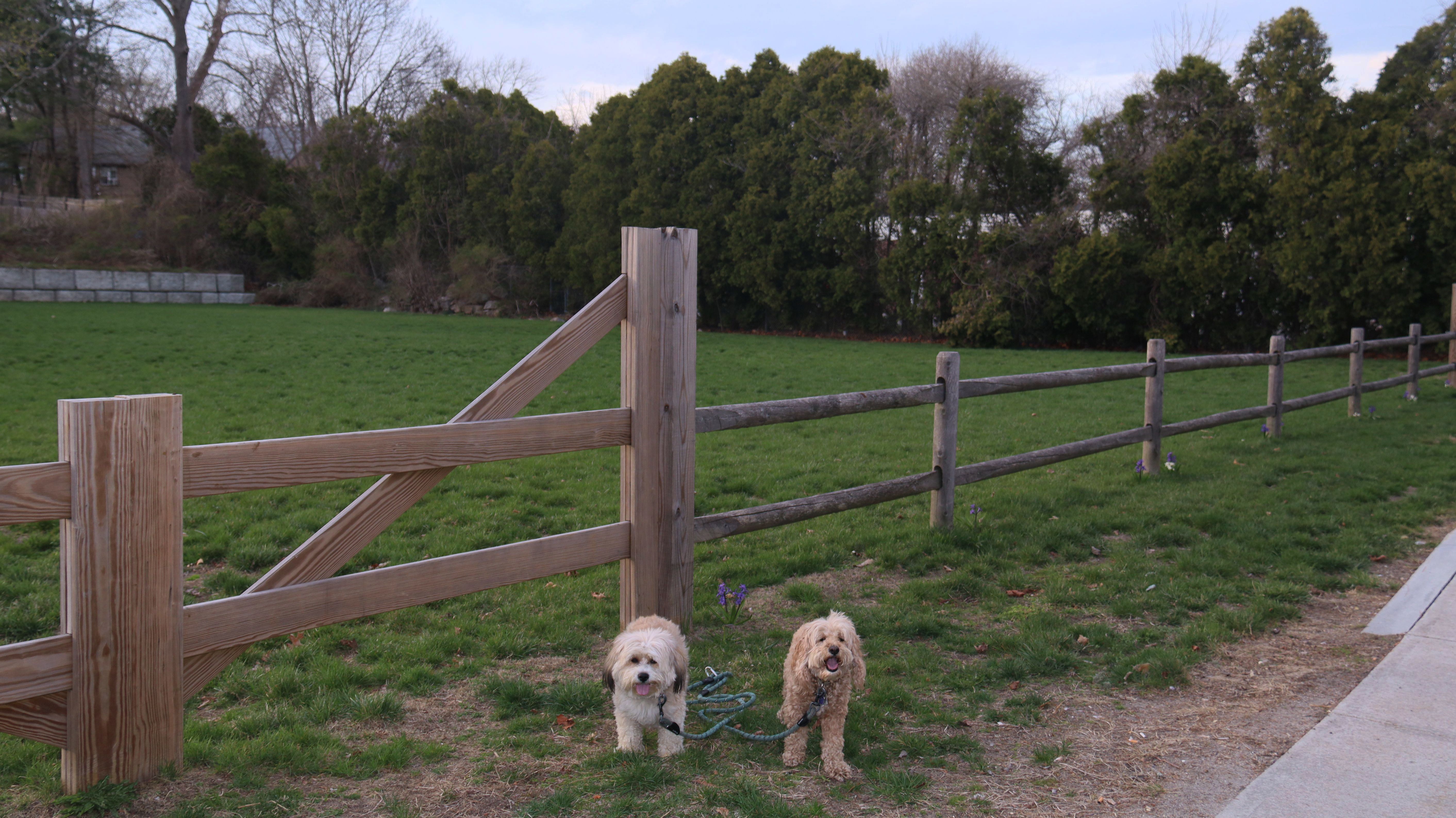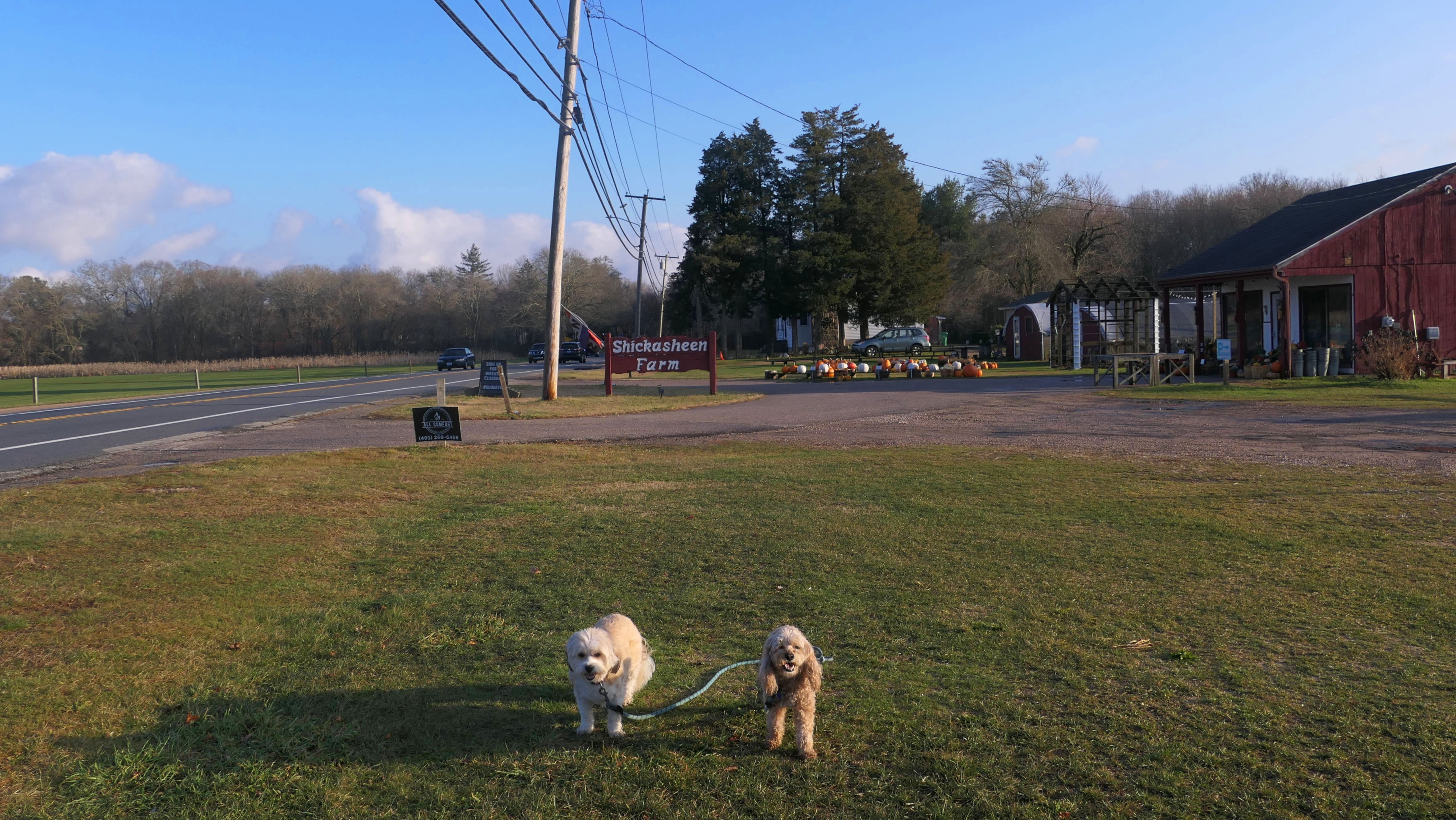This is a town park with athletic fields, pickle ball and tennis courts, a volley ball court, playgrounds, and even real restrooms. Dogs are allowed in the park, but not on the athletic fields, although there was a man with two dogs playing fetch on one of the fields as we were leaving. We looped the edge of the park, but the walk was only about three quarters of a mile long, including a brief stop at the farm next door. It's a nice, clean park, but not one with a lot of walking space for dogs.