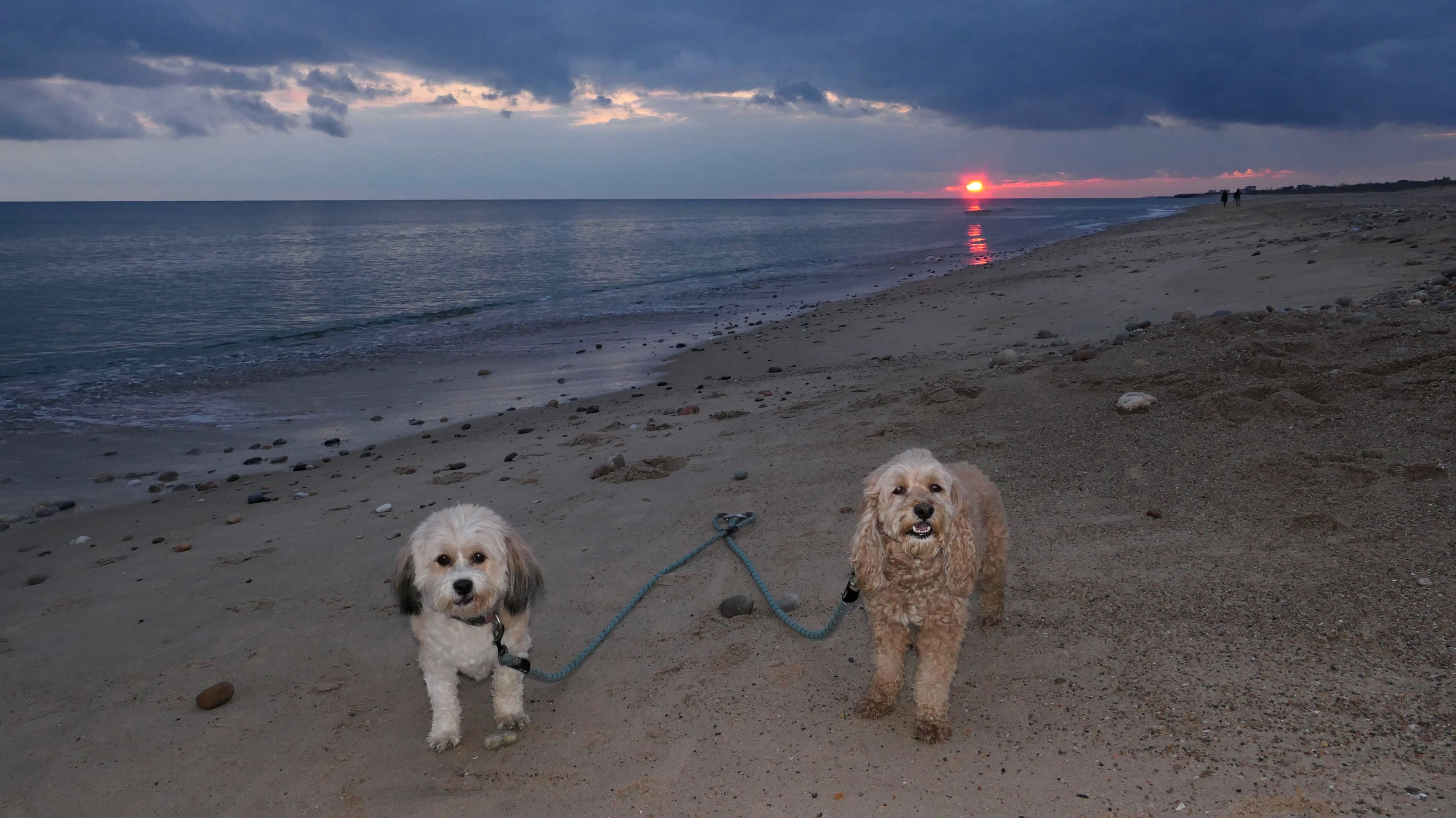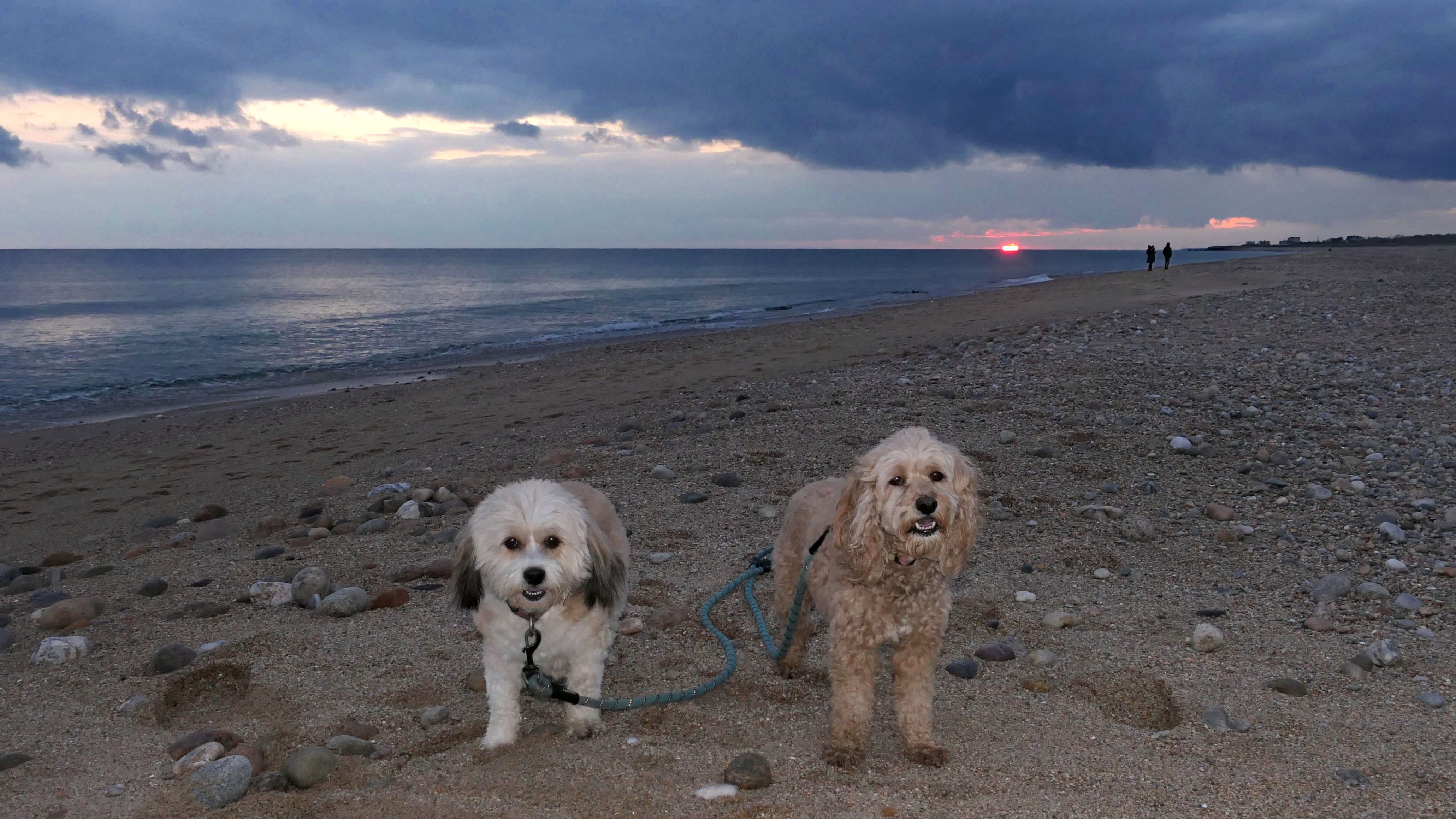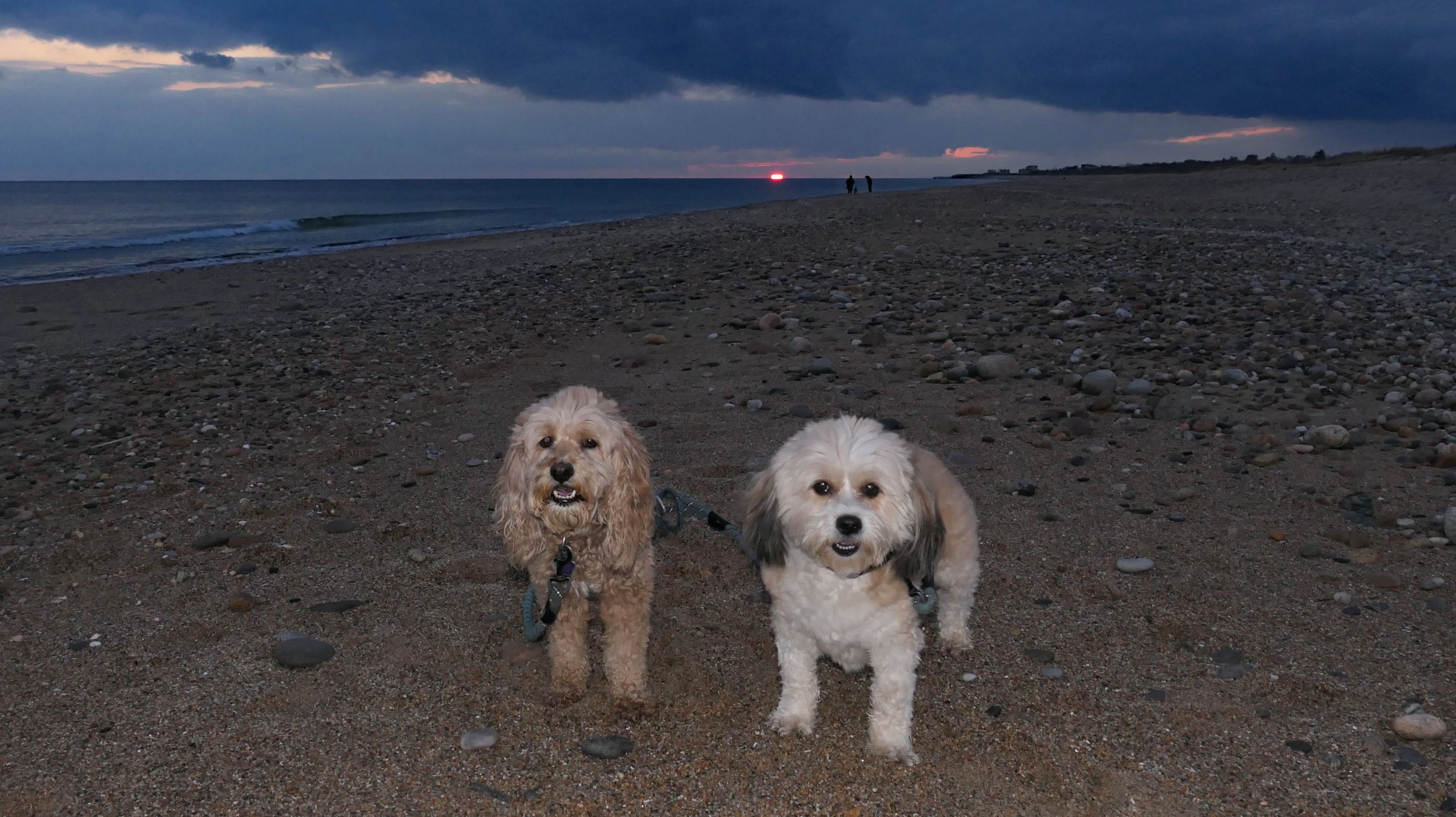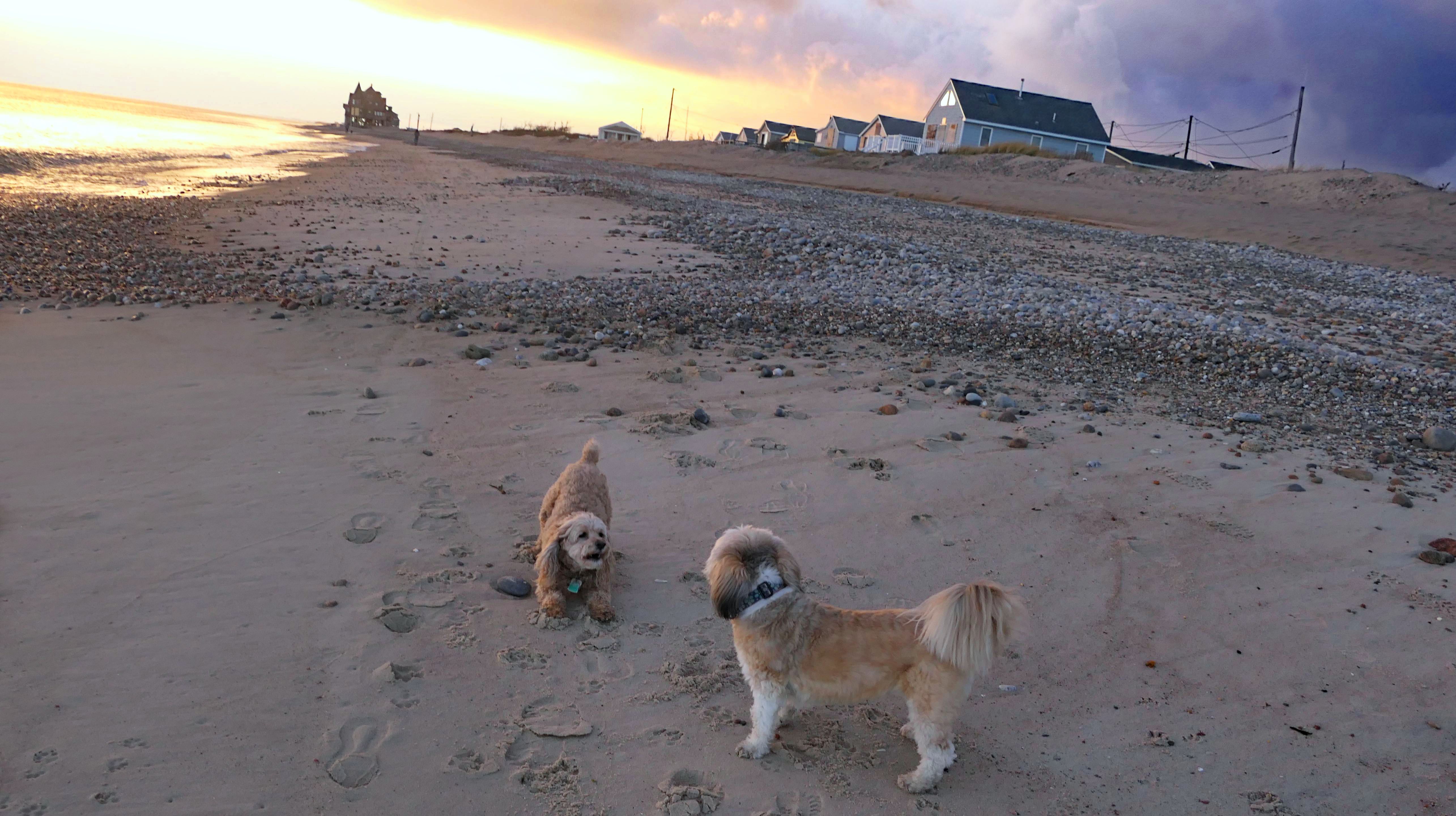 We visited this beach again on a cool fall late afternoon. It's not Photoshop - you are seeing it correctly. There were a few people in bathing suits who just finished their swim. It was about 40 degrees out, but that doesn't seem to phase New Englanders! This isn't the first time we've witnessed winter swims at the beach! We walked the length of the beach, and even continued on to Moonstone Beach, since the tide was low enough for us to get around the three houses on stilts. About halfway through our walk, Lexi came down with a case of the zoomies, so I let the dogs off-leash to run a bit. The clouds made for a dramatic sunset, but it also caused difficult lighting conditions for photos, but we did the best we could.