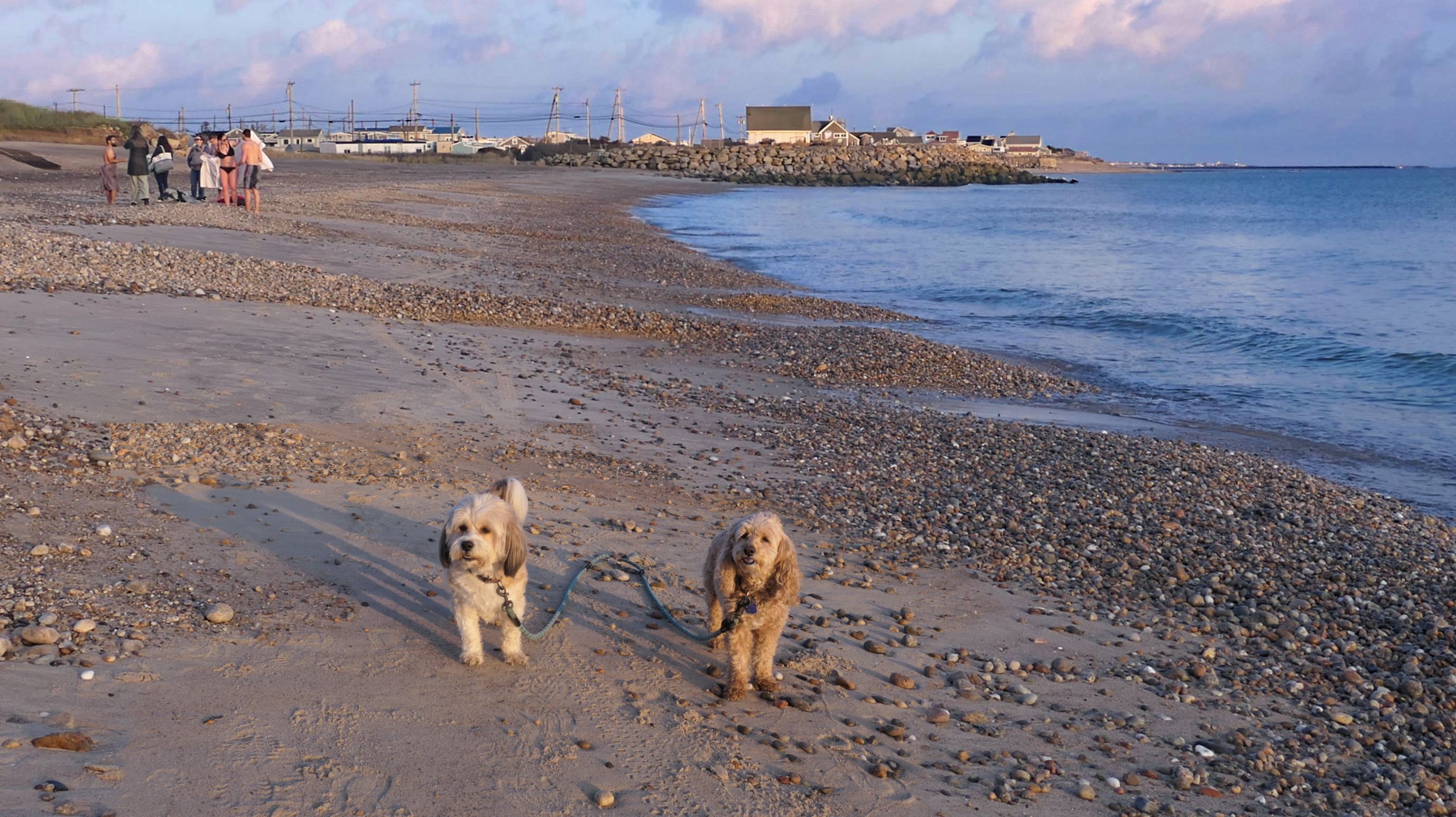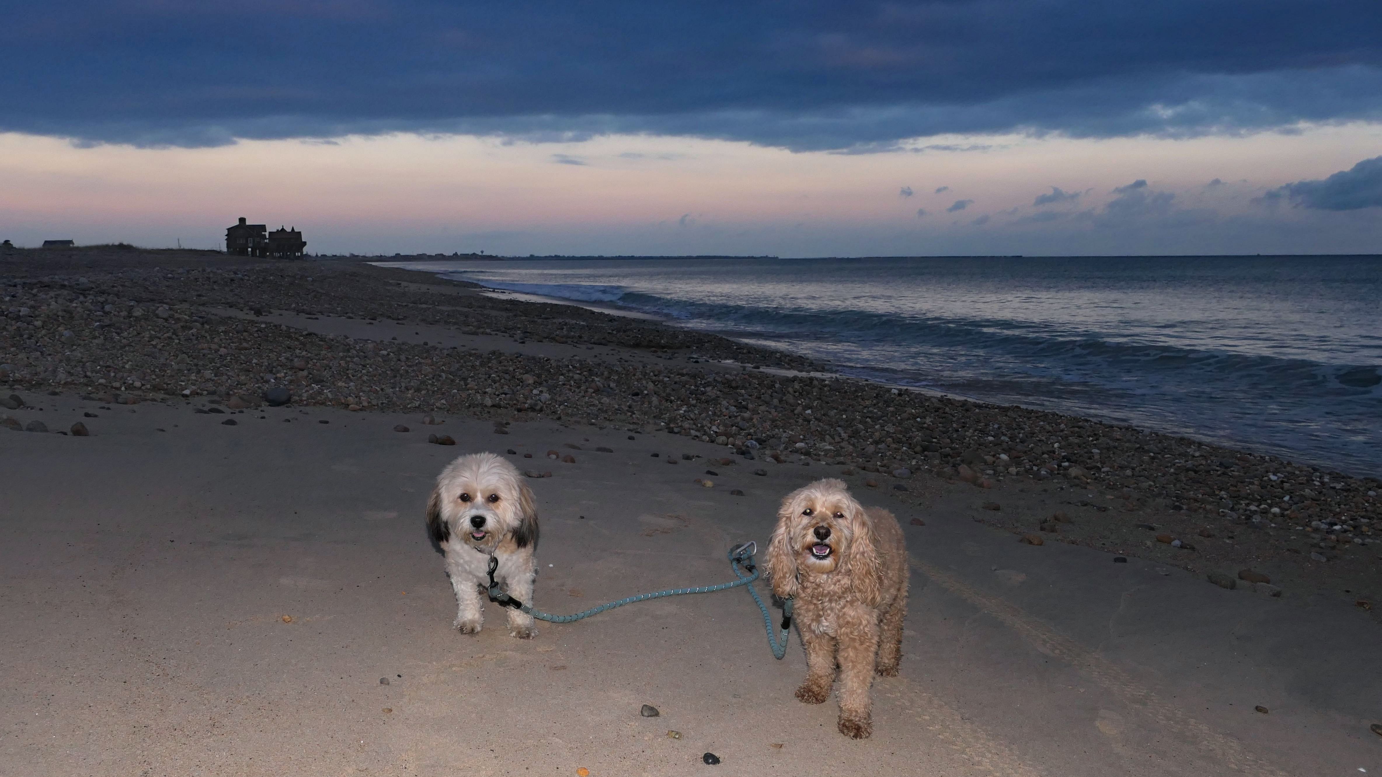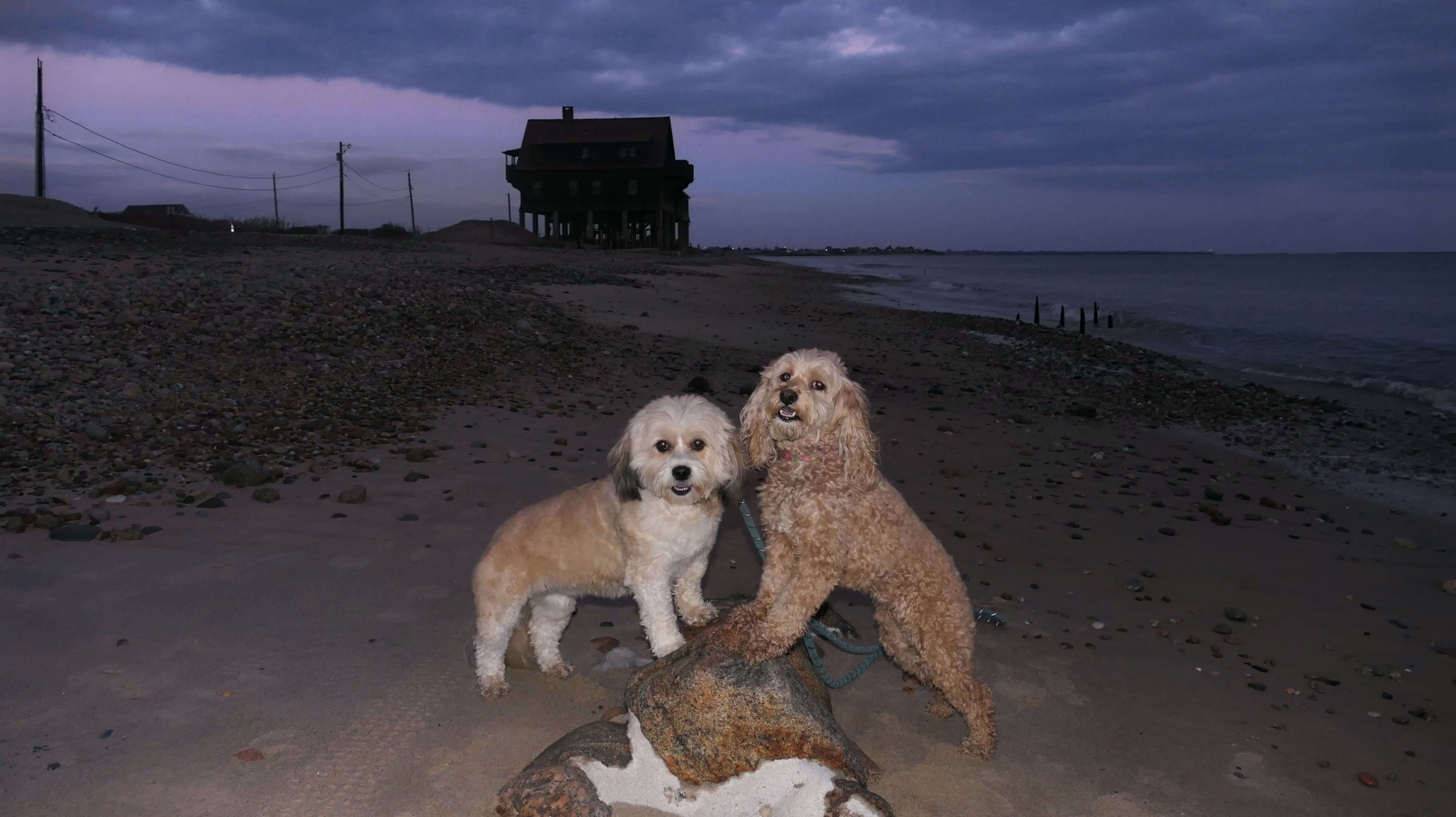 We visited this beach again on a cool fall late afternoon. It's not Photoshop - you are seeing it correctly. There were a few people in bathing suits who just finished their swim. It was about 40 degrees out, but that doesn't seem to phase New Englanders! This isn't the first time we've witnessed winter swims at the beach! We walked the length of the beach, and even continued on to Moonstone Beach, since the tide was low enough for us to get around the three houses on stilts. About halfway through our walk, Lexi came down with a case of the zoomies, so I let the dogs off-leash to run a bit. The clouds made for a dramatic sunset, but it also caused difficult lighting conditions for photos, but we did the best we could.
