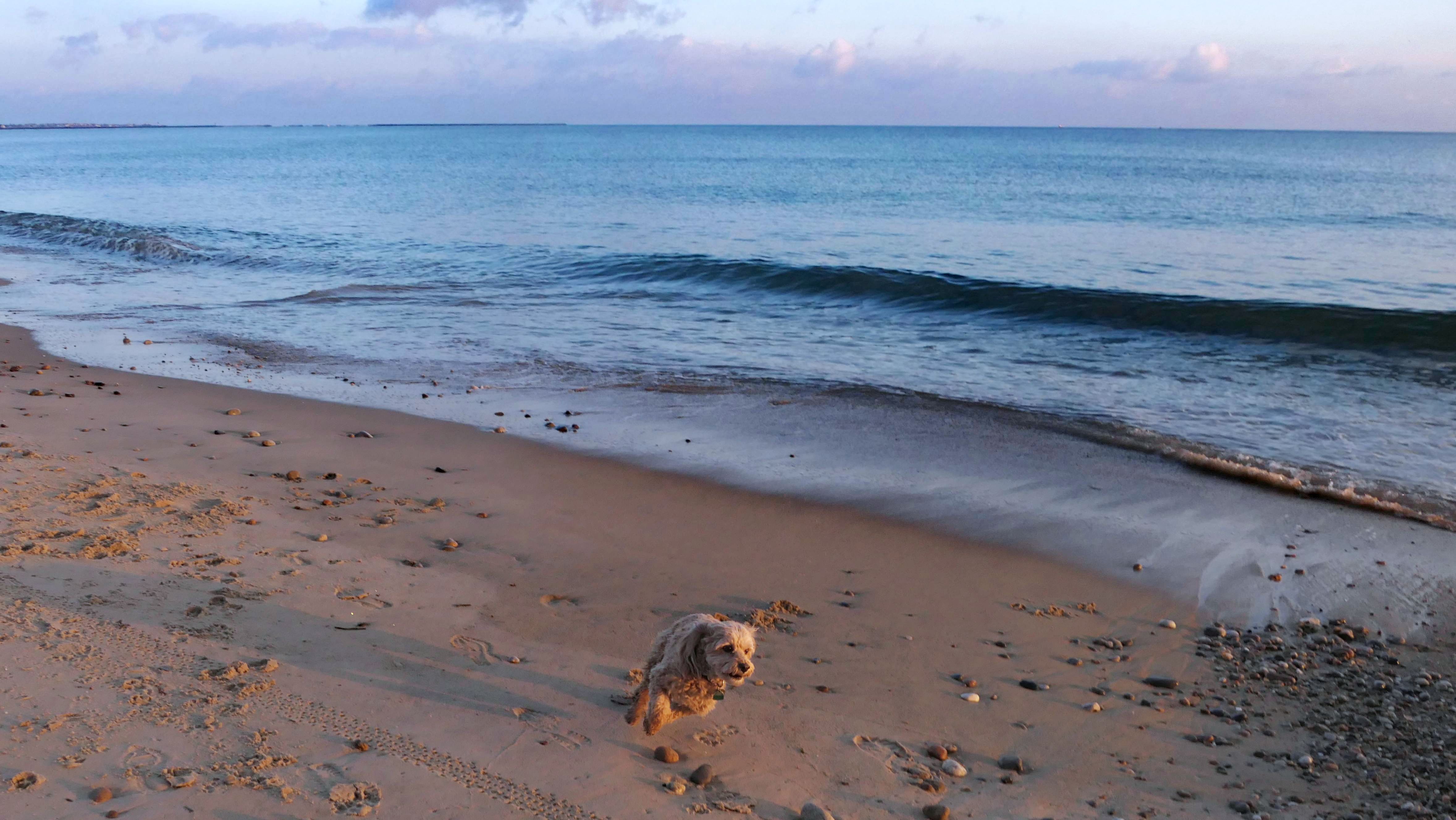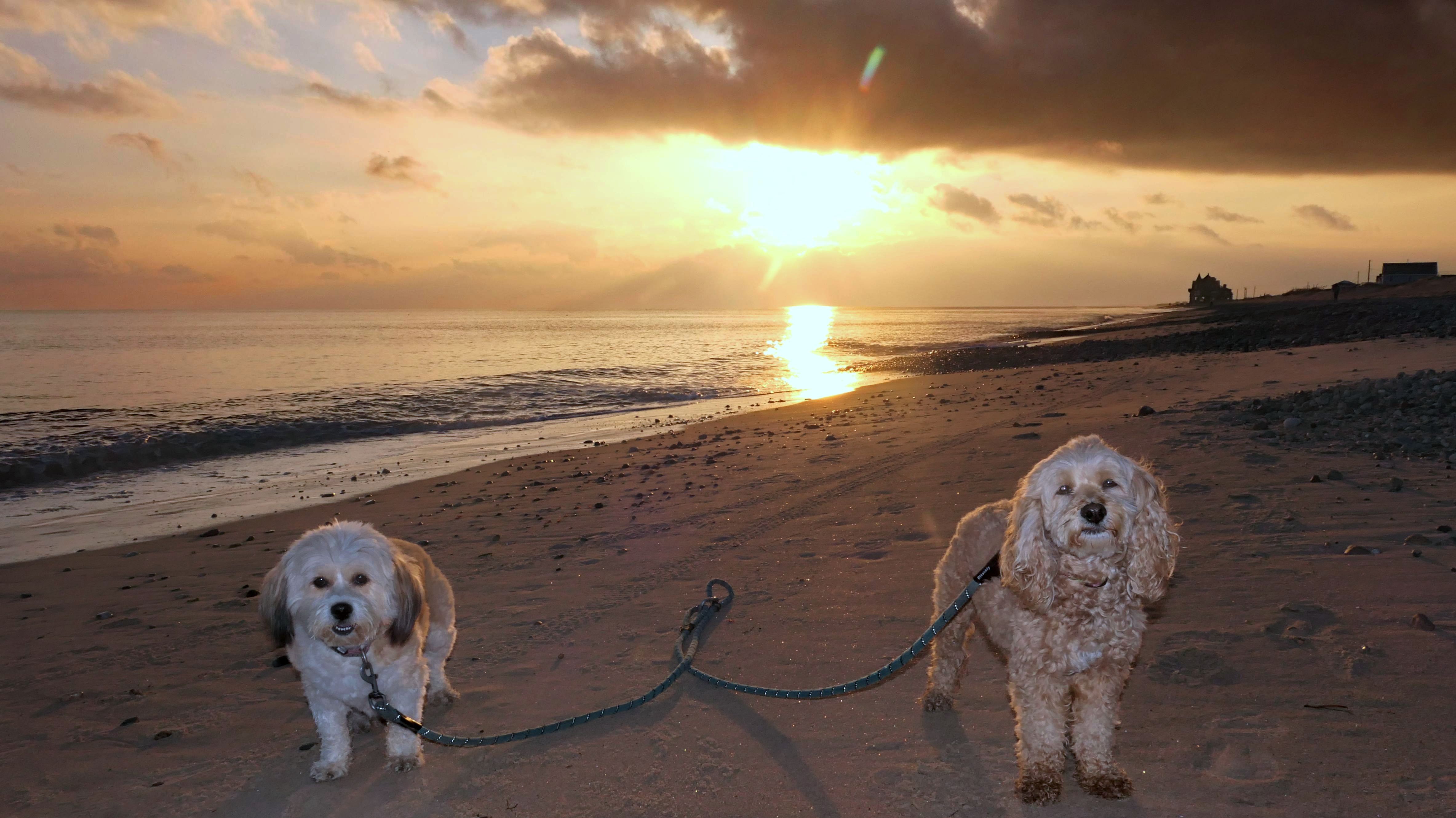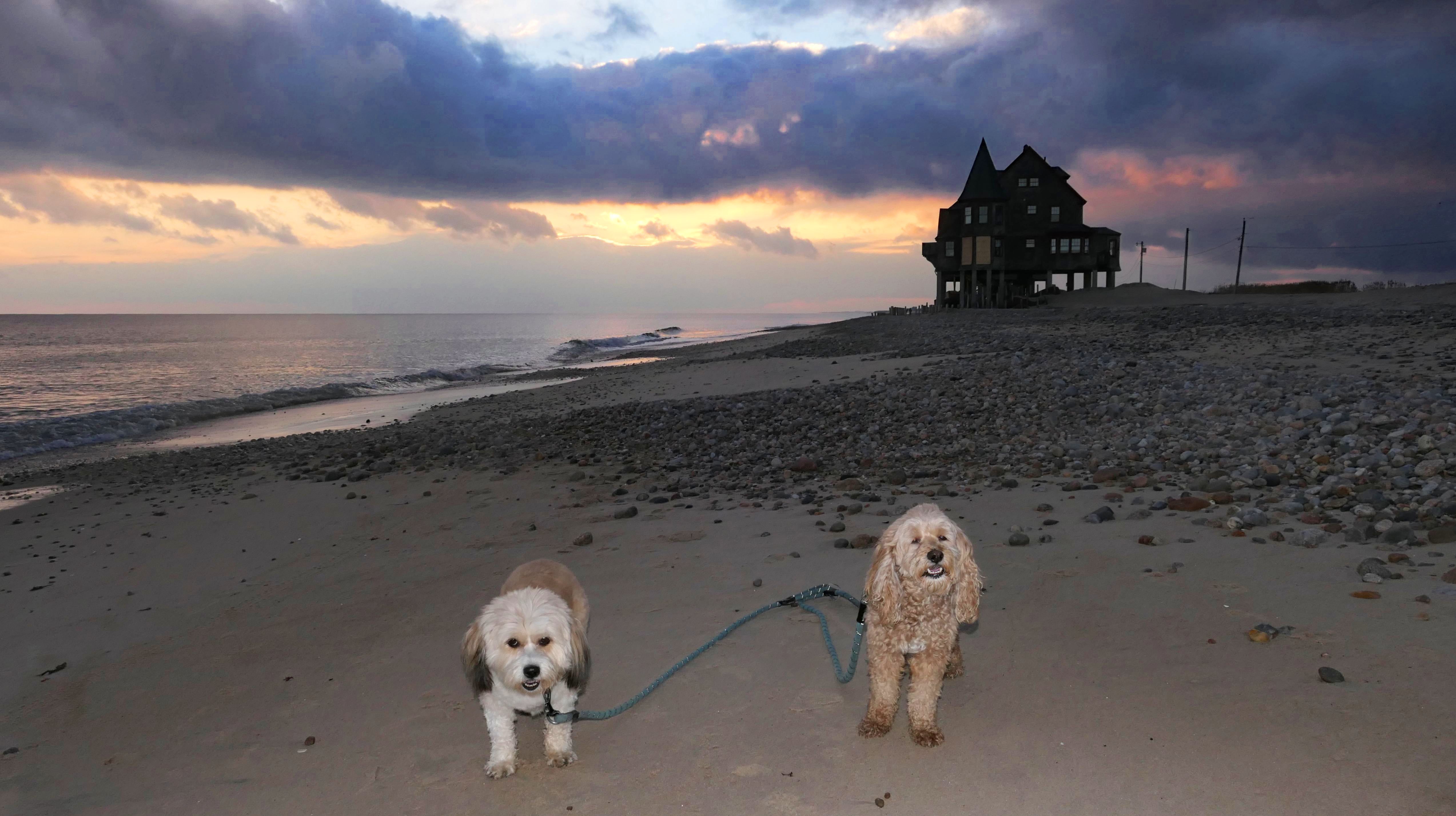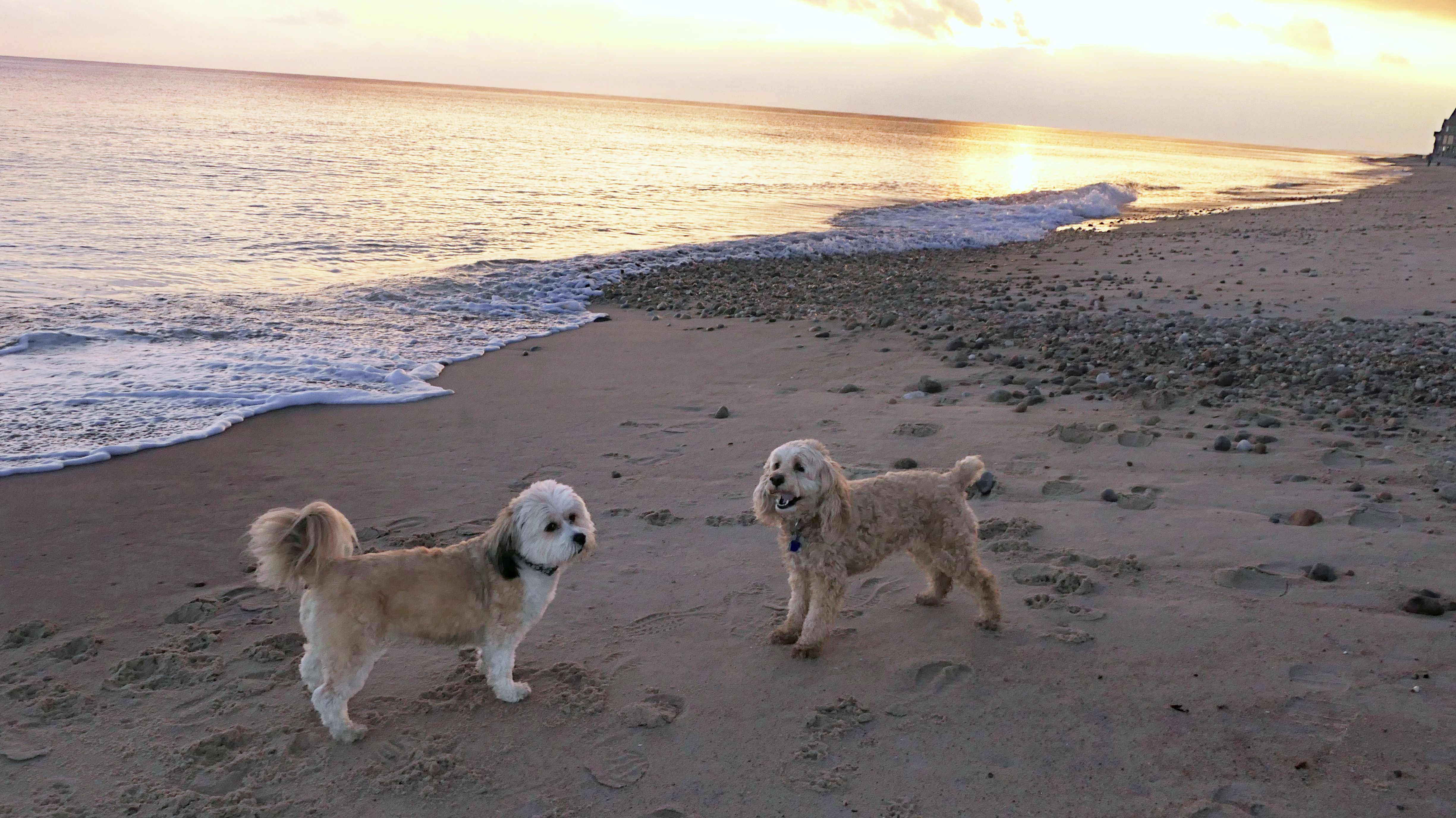We visited this beach again on a cool fall late afternoon. It's not Photoshop - you are seeing it correctly. There were a few people in bathing suits who just finished their swim. It was about 40 degrees out, but that doesn't seem to phase New Englanders! This isn't the first time we've witnessed winter swims at the beach! We walked the length of the beach, and even continued on to Moonstone Beach, since the tide was low enough for us to get around the three houses on stilts. About halfway through our walk, Lexi came down with a case of the zoomies, so I let the dogs off-leash to run a bit. The clouds made for a dramatic sunset, but it also caused difficult lighting conditions for photos, but we did the best we could.