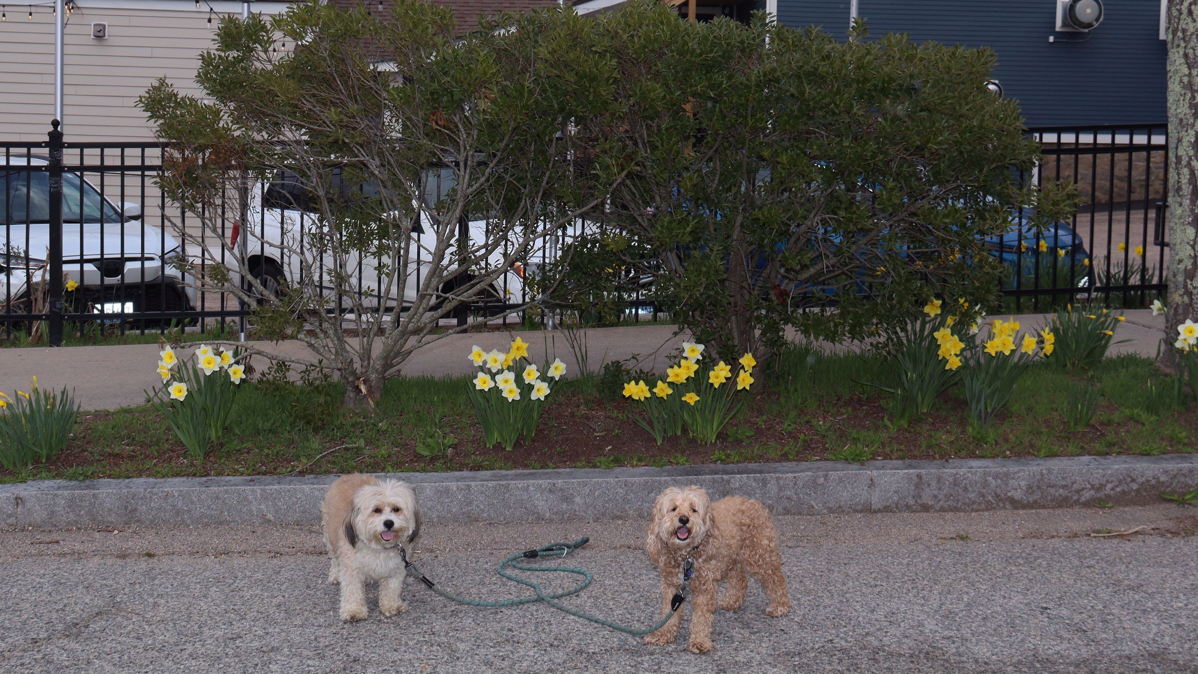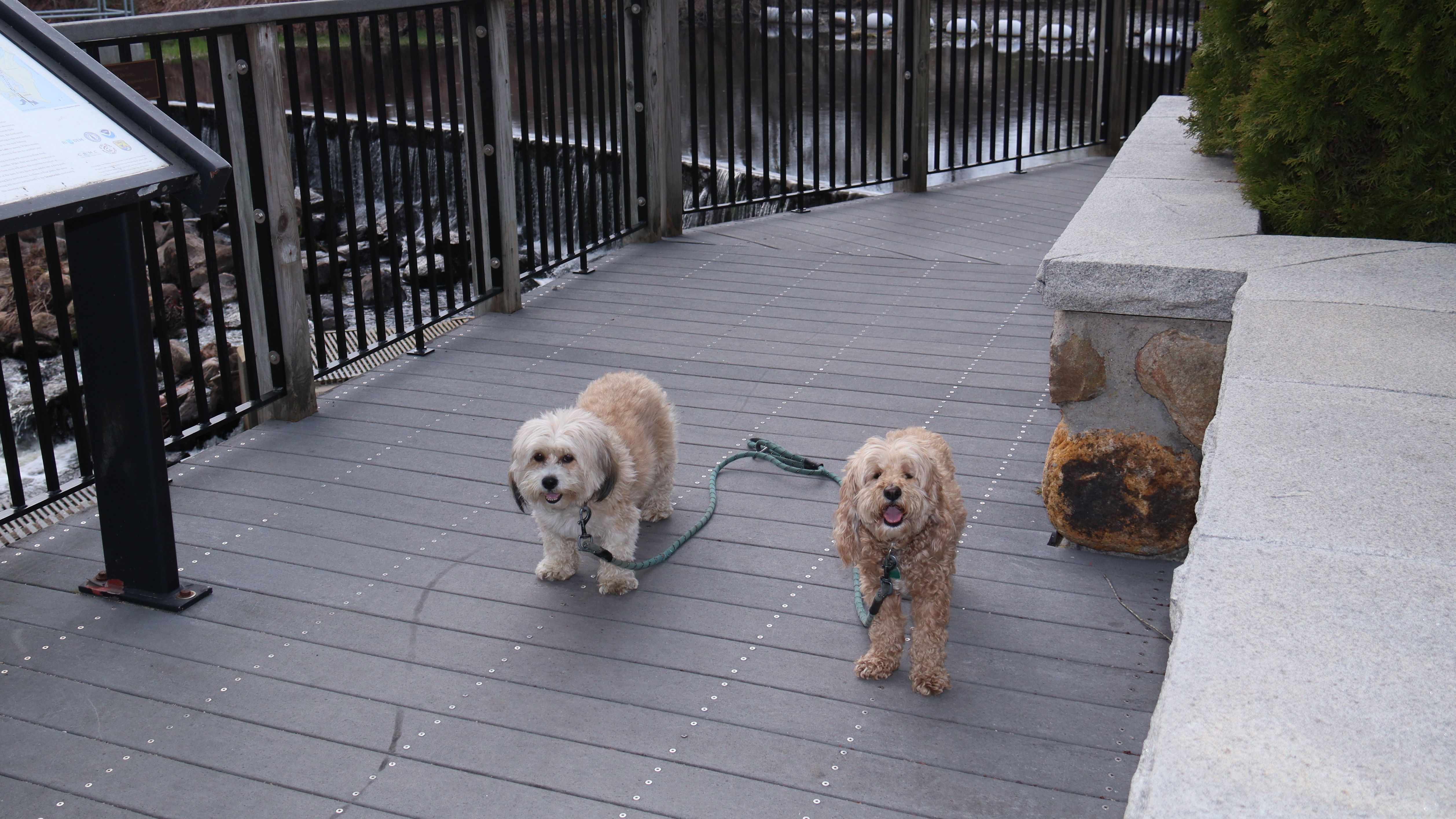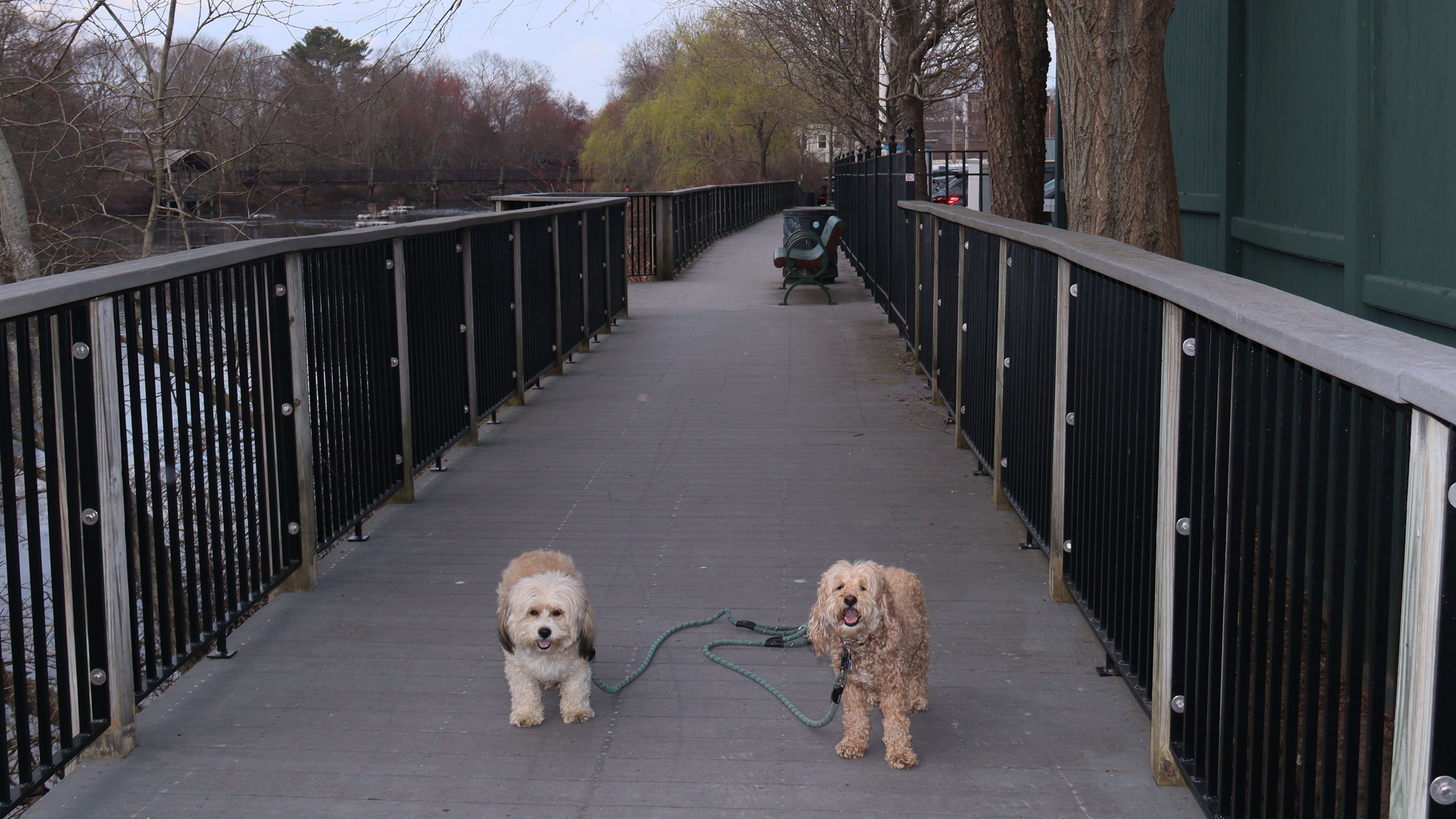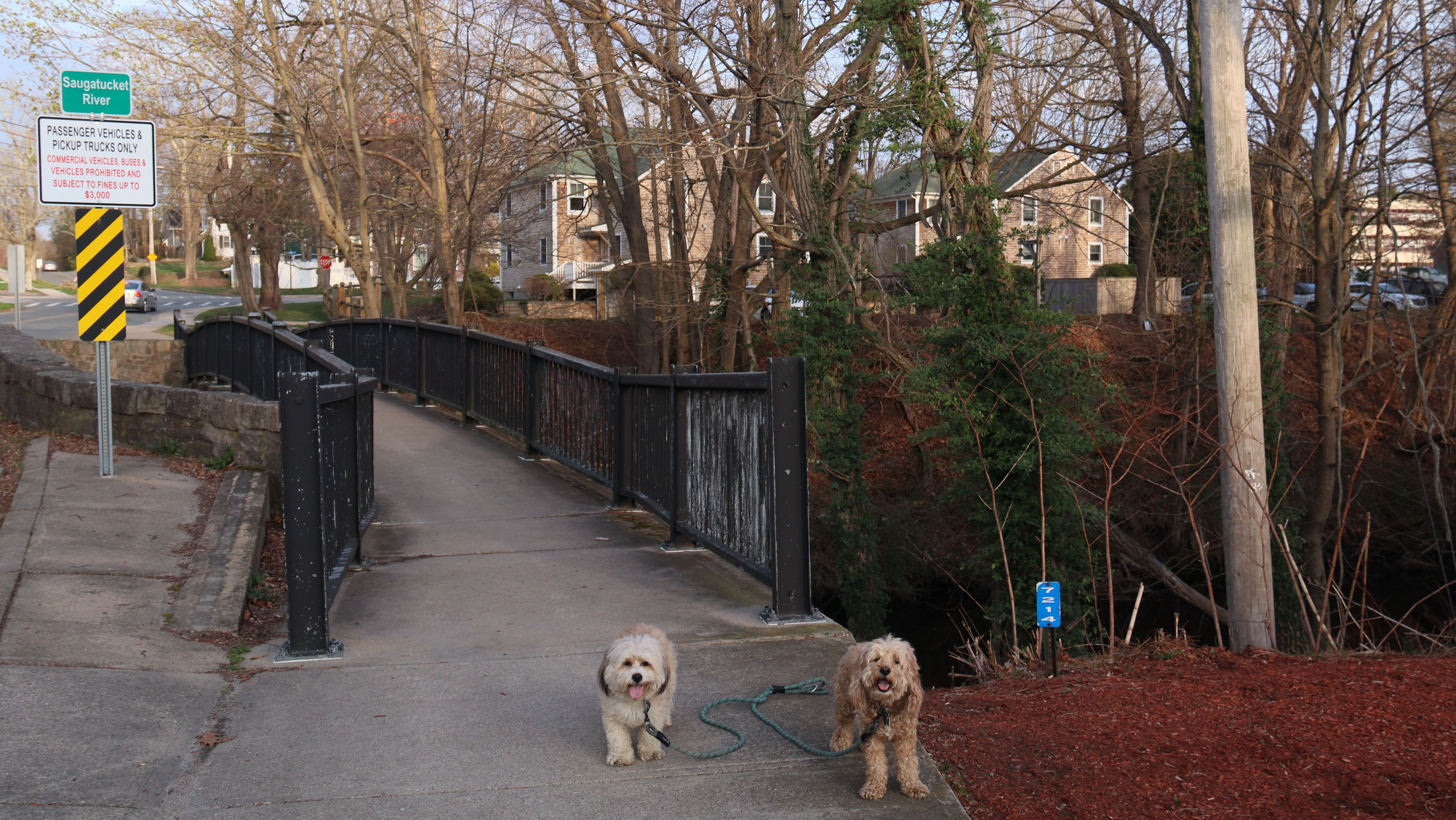 We started out hiking the trail laid out in the All-Trails app, which is basically a loop around Rocky Brook Reservoir, and then an out and back to Asa Pond. The terrain on the out and back portion was a bit rough. There are no hills, but it was very rocky and rooty, with sections of wooden boardwalk over muddy spots. At one point, some trees were down blocking the trail. Mandy decided to go under, while Lexi went over. This presented a problem because their leashes are always connected together! It wasn't really that rough, and we were able to navigate it with little problem, but when we reached Asa Pond, I decided to take another route back that utilized a section of the South County Bike Path, before re-connecting with our loop. It lengthened the trip, but it was a nice day and I needed additional steps anyway. I know it was called "Tri Pond Park", but none of the trails we walked made it out to a third pond. It looks like the third pond is on the opposite side of the bike path, so we'll have to visit it some other day.
