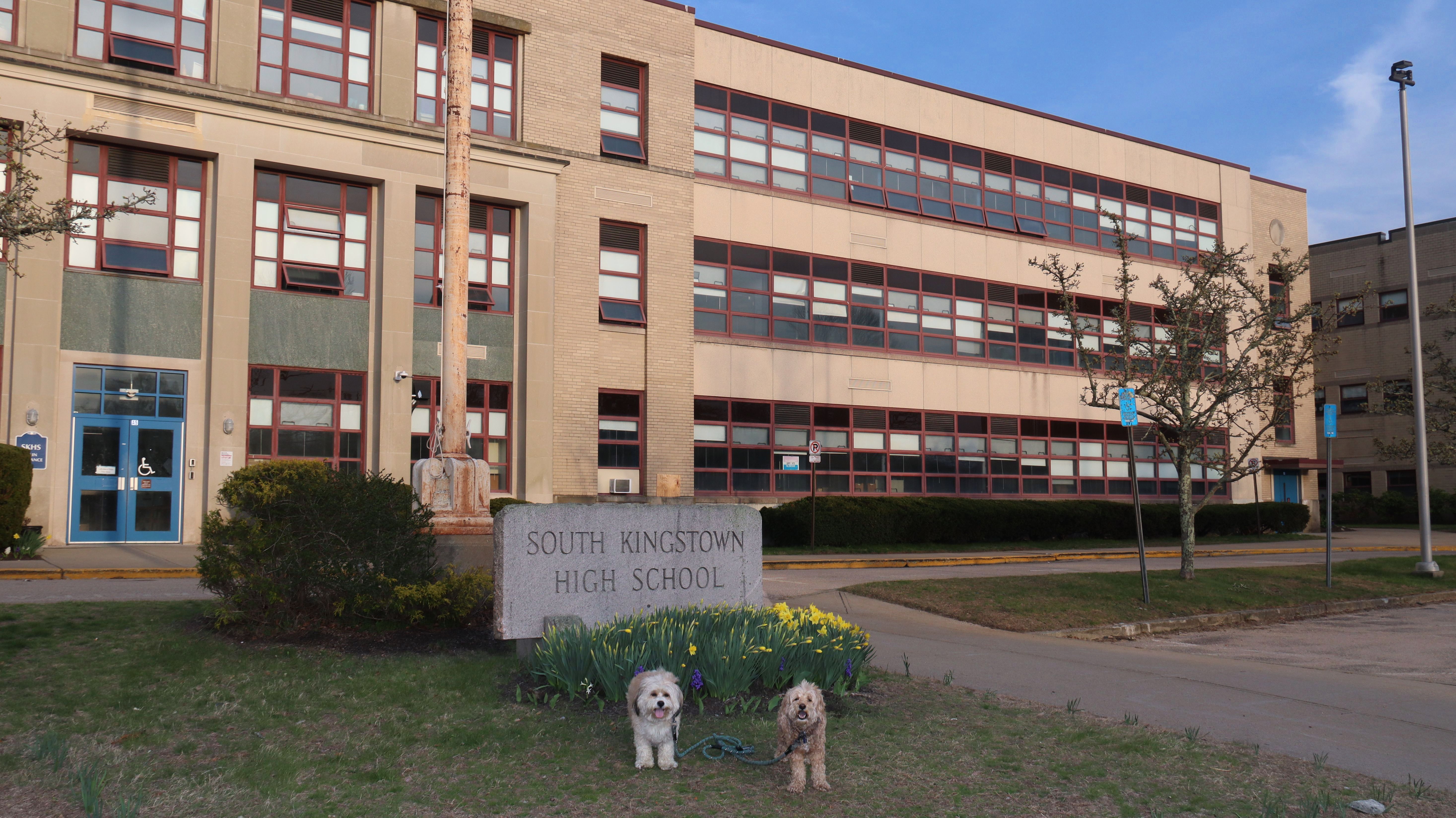 We've been visiting a few college campuses lately. We've actually been to part of this campus before when we walked here on the bike trail. This time we visited the main campus. It's a very nice campus, with a lot of different courtyards and grassy areas. The mascot is Rhody the Ram, and Mandy and Lexi got to take a picture with his statue! The school was holding a new student orientation, so the quad area was filled with kids, despite the college being on summer break. It was warm and hazy, but quite a bit cooler than the more inland areas. We still kept the walk to just about two miles because of the heat. I didn't think the college was quite as nice as Brown, or Bryant, but was still a very nice place to take a walk with the dogs.