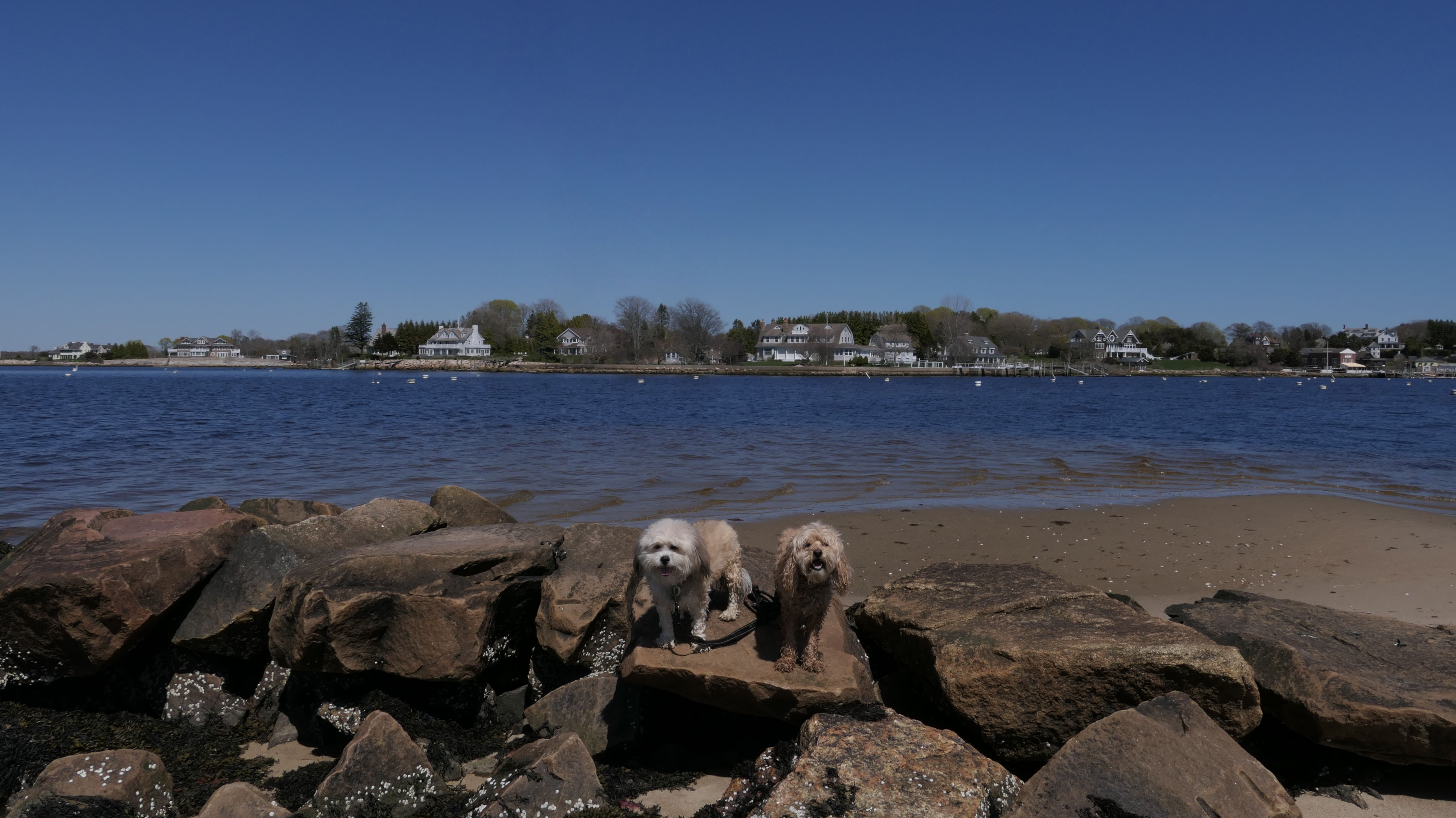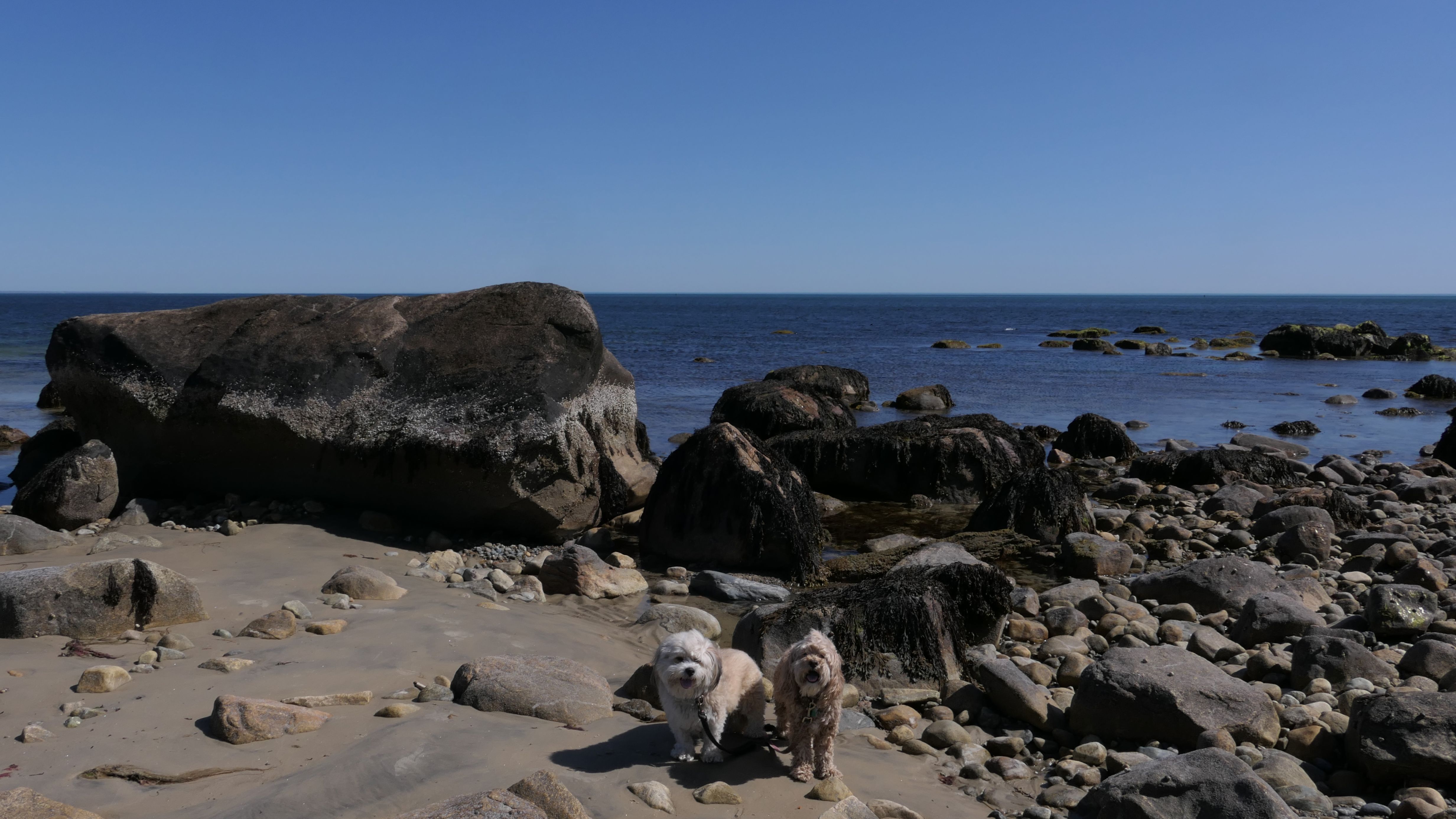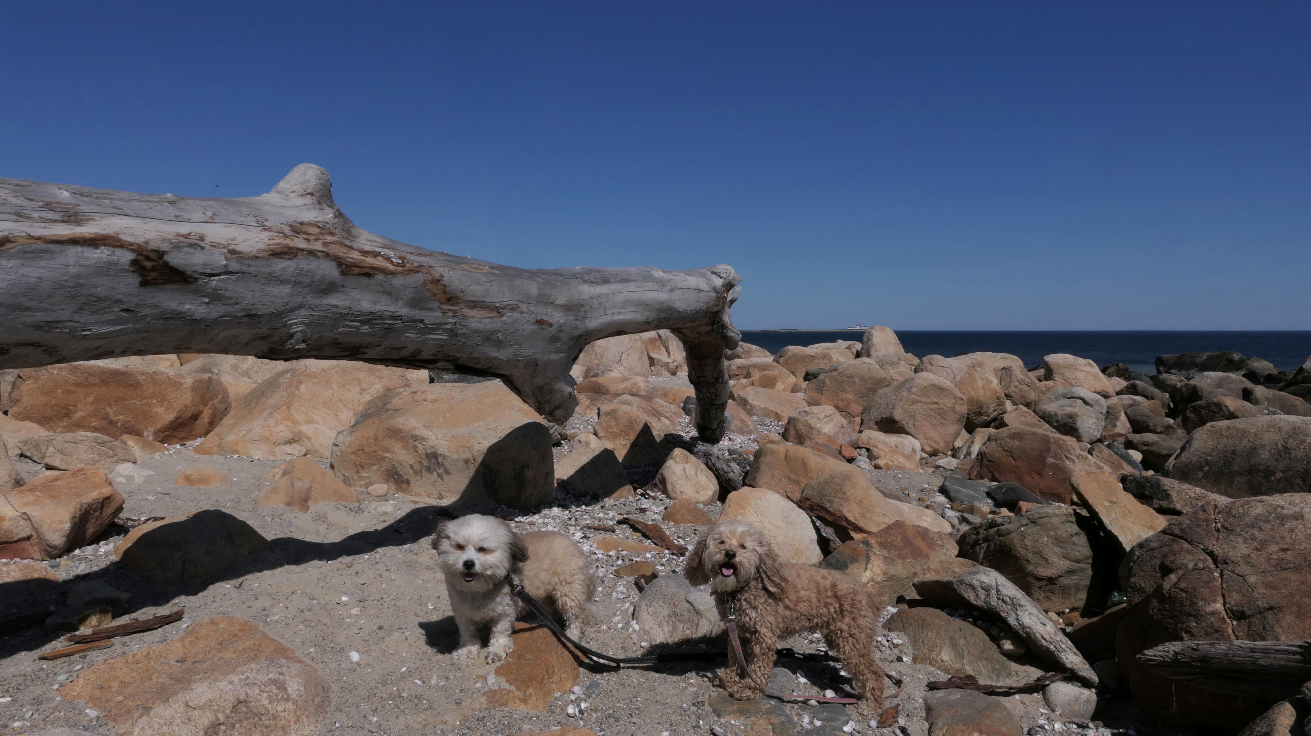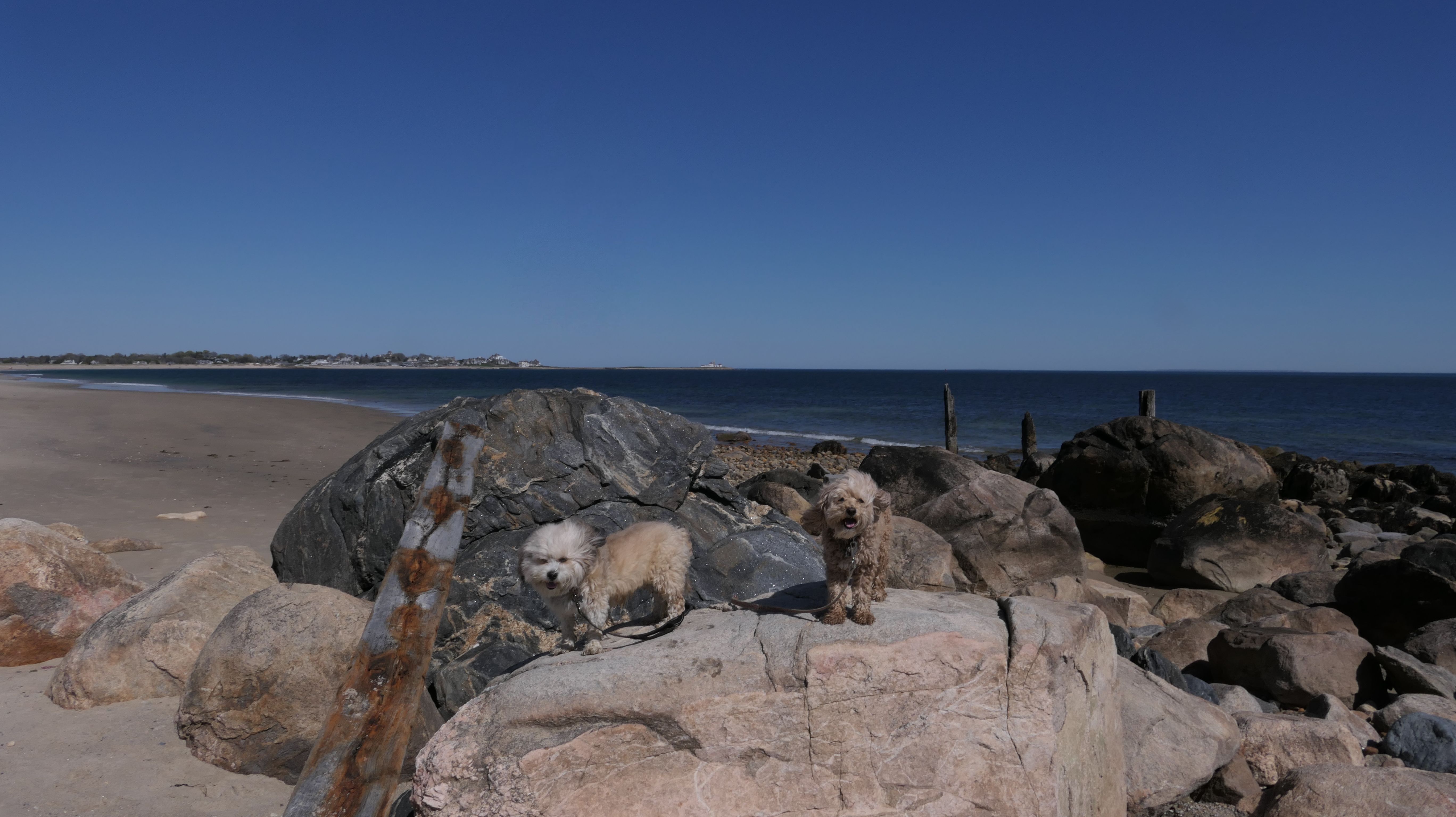We've been here many times before, but this was only the second time we managed to complete the full loop. The first was during our very first trip to Westerly, way back in December 2020. We attempted it again last summer, but high tide and overgrown trails around the rocks stopped us short. This time, we arrived right at low tide and started out on the bay side. The dogs love this part—it's calm, and they enjoy splashing around in the gentle water. Near the tip of the point, there's a small stream we have to cross to finish the loop. Back in 2020, it was cold and windy, and I had to wade through the stream to avoid turning back. Today, I still had to cross it, but the water was so low it felt more like stepping through a puddle. For the first time, we made it up to the ruins—remnants of an old military fort hidden among the dunes. The narrow trails leading there were just barely passable, and they'll be even tougher to navigate later in the summer when growth thickens. It was exciting to explore something new in a place we thought we knew well. (In 2020, we had skirted the rocks to complete the loop—I didn't even know the ruins existed then.) We wrapped up the walk along the ocean side, where the views of Block Island were strikingly clear. Usually, the waves on that side are pounding, but today the sea was surprisingly calm. With the seasonal dog restrictions starting May 2nd—when pups are only allowed after 6 PM—this was one of the last afternoons we could enjoy this walk freely. All in all, it was a great three mile loop on a beautiful spring day.