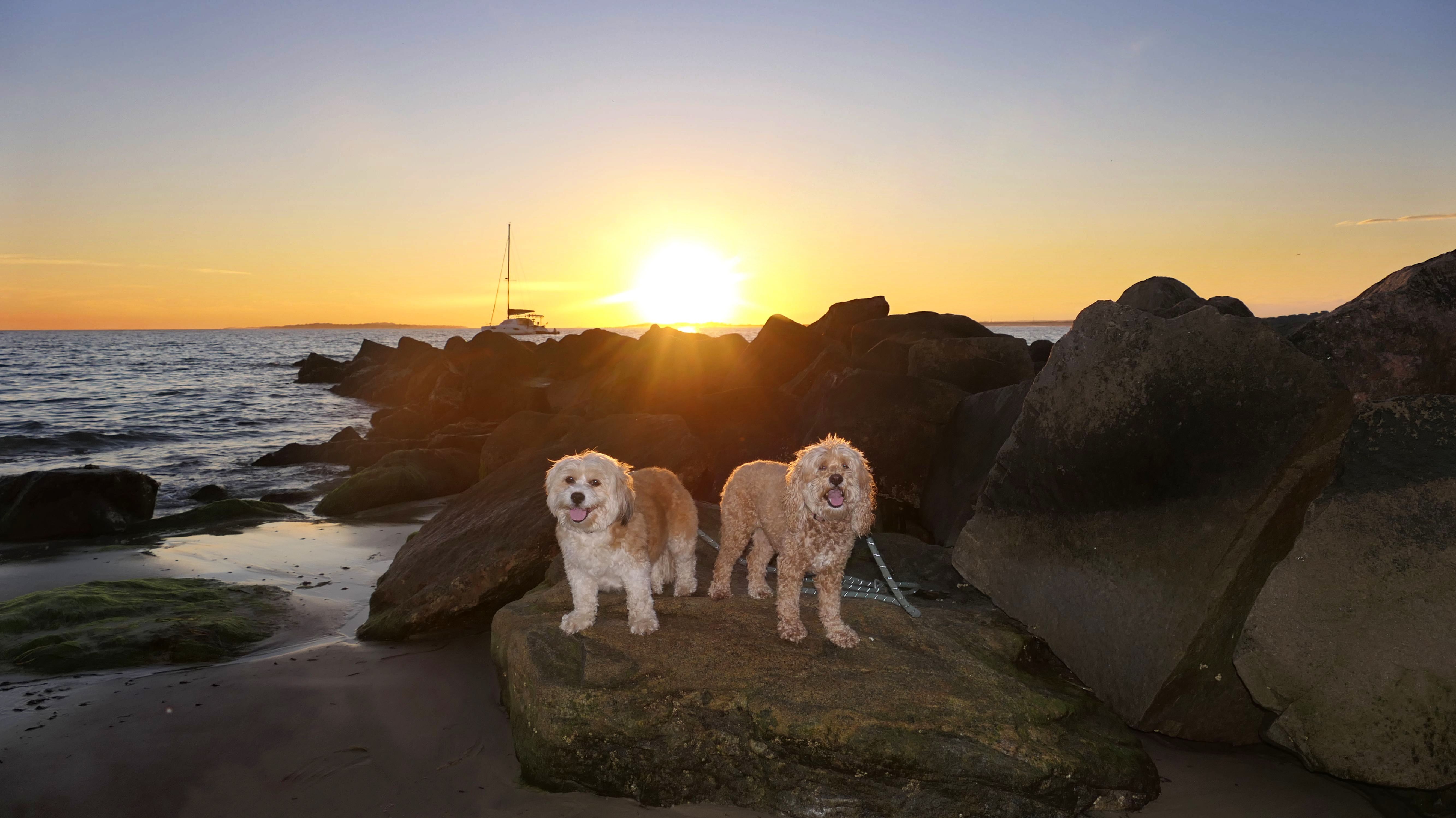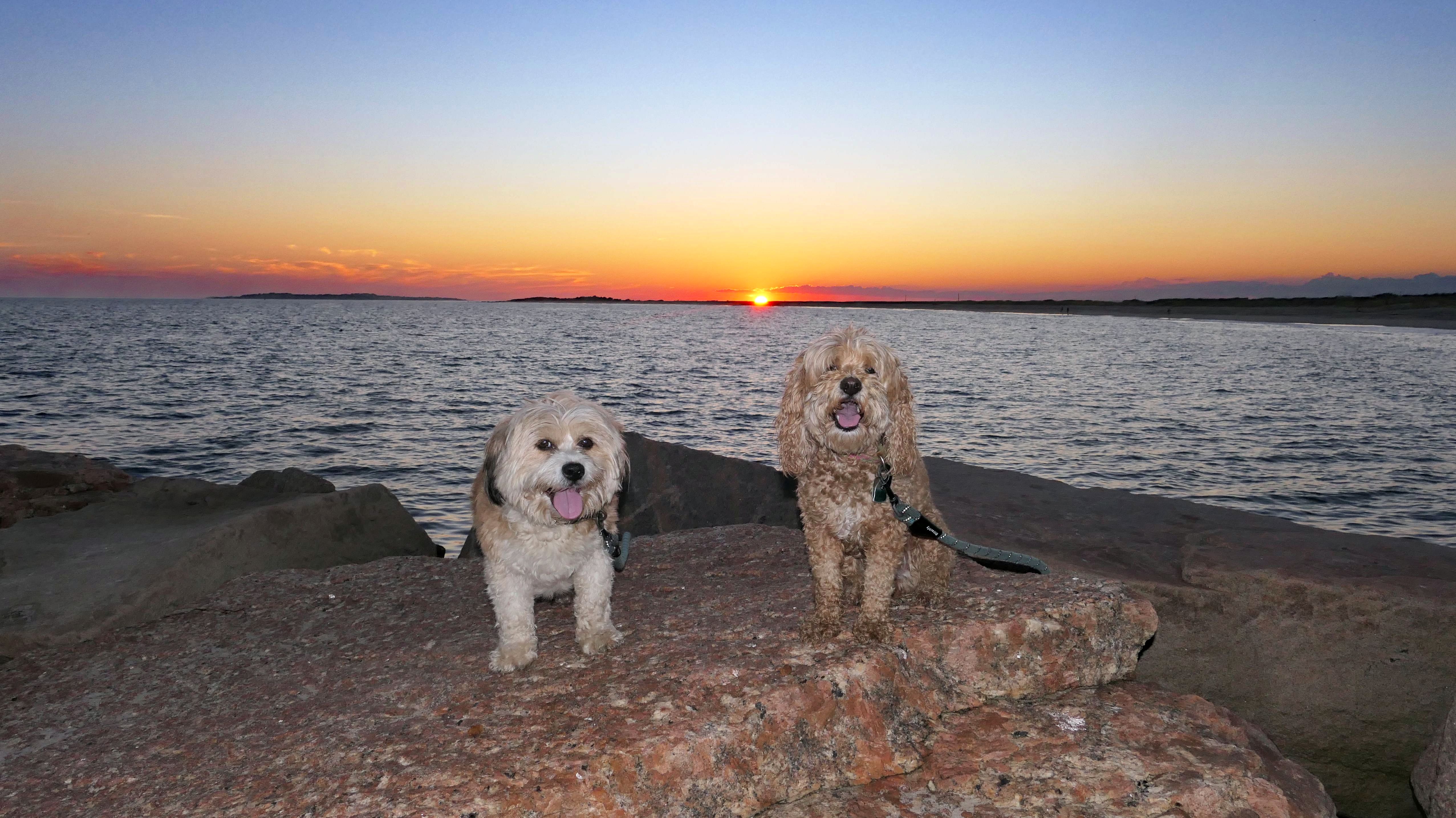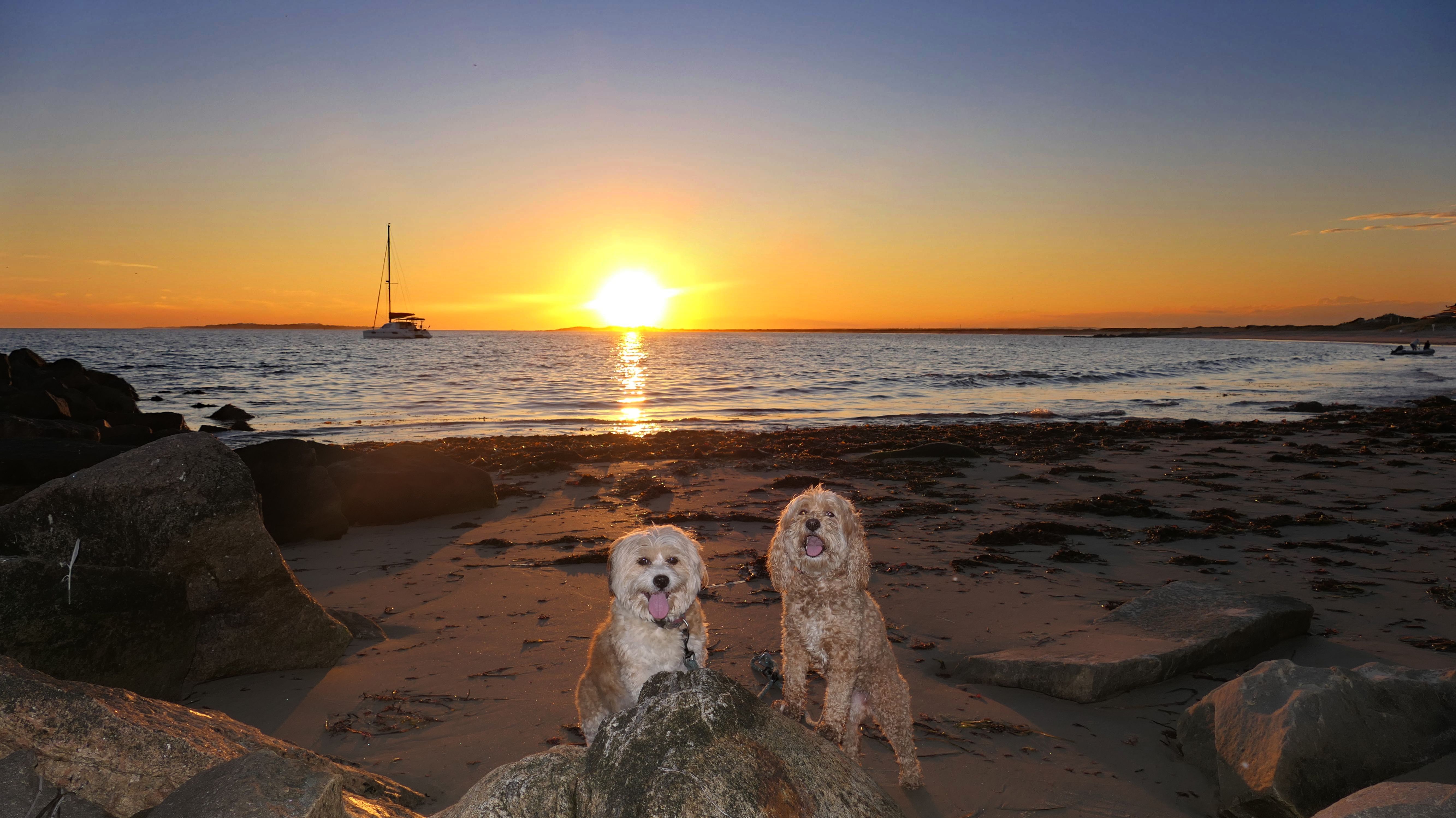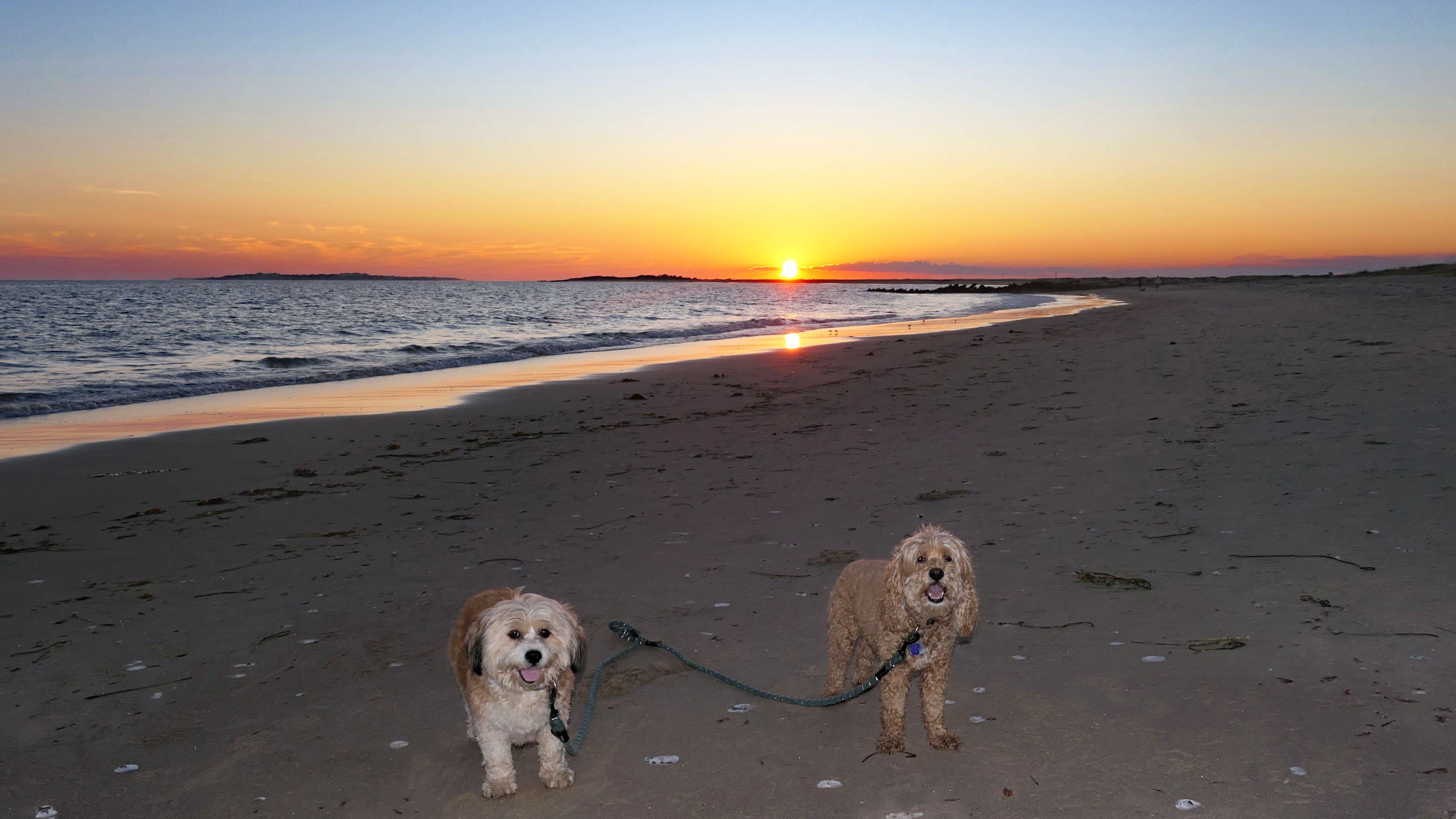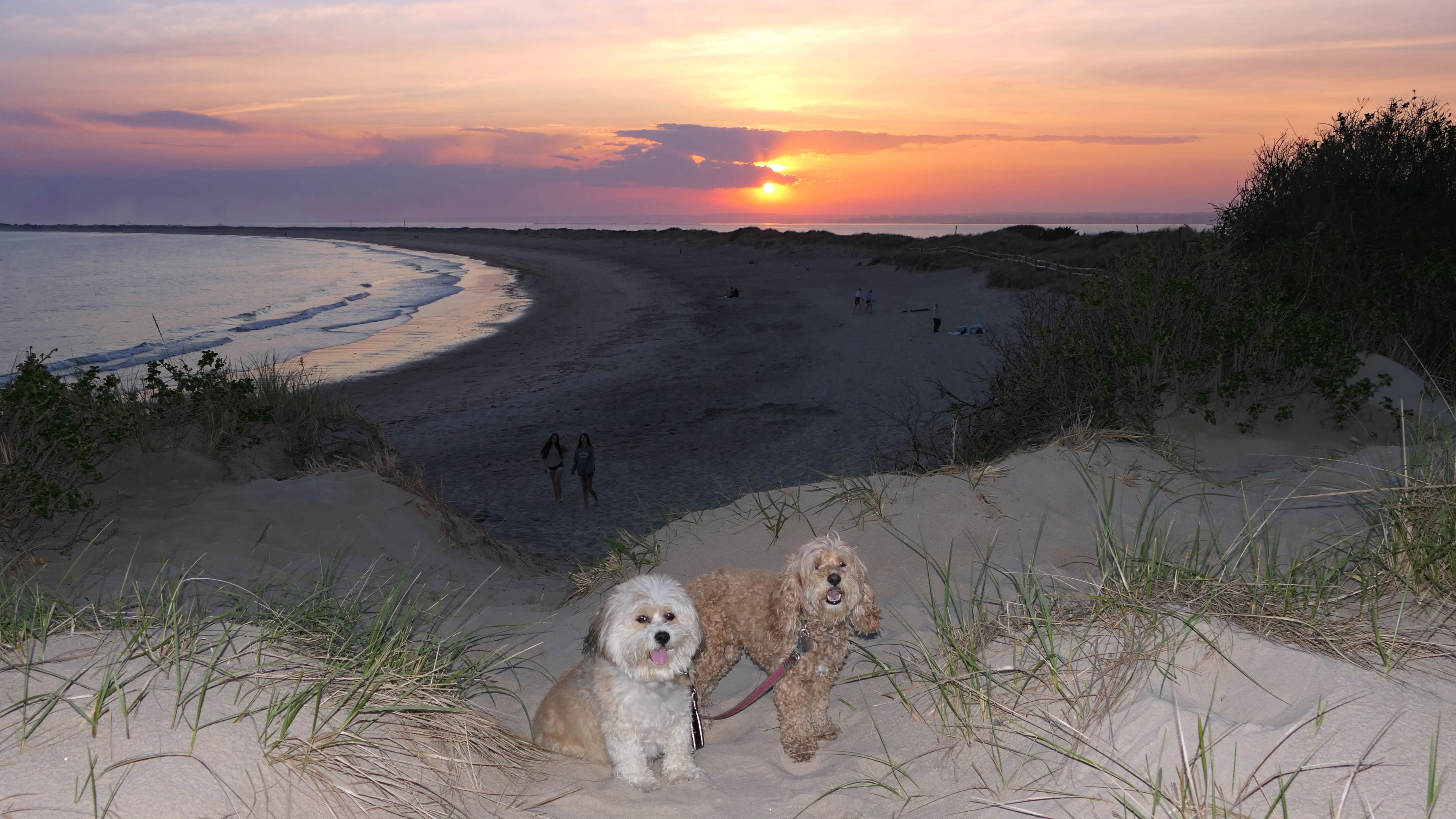 Since it had been three and a half years since the last time we walked the full loop here, it seemed like a good time to revisit this fantastic spot. The first time it was 30 degrees in December, so I thought going in the middle of summer might be a nice change! Dogs are allowed here in the summer time after 6PM, and we got started around 6:15PM, shortly after a considerable rain storm had moved through the area. Napatree Point is a small peninsula that sticks out of the southwest end of Westerly, blocking Stonington, CT from the open waters of the Atlantic. We started on the ocean side, which is pretty must just a nice walk on the beach. It was just after high tide, and the waves were pretty strong. Once we got to the rocks at the tip of the peninsula, there wasn't a way I could find to safely get to the other side of the point. There are a few cross-over trails along the way, but they were roped off due to piping plovers nesting, so we couldn't walk the same loop that we did back in December of 2020. We had to head back along the beach the way we came, and cross over to the bay side much closer to our starting point. We made it just in time for the sunset, which was barely visible between the few clouds that had moved through. Since the waves are tame on the bay side, the dogs enjoy the water much more on this side! This was a wonderful evening hike, even if we couldn't walk the entire route as planned.
