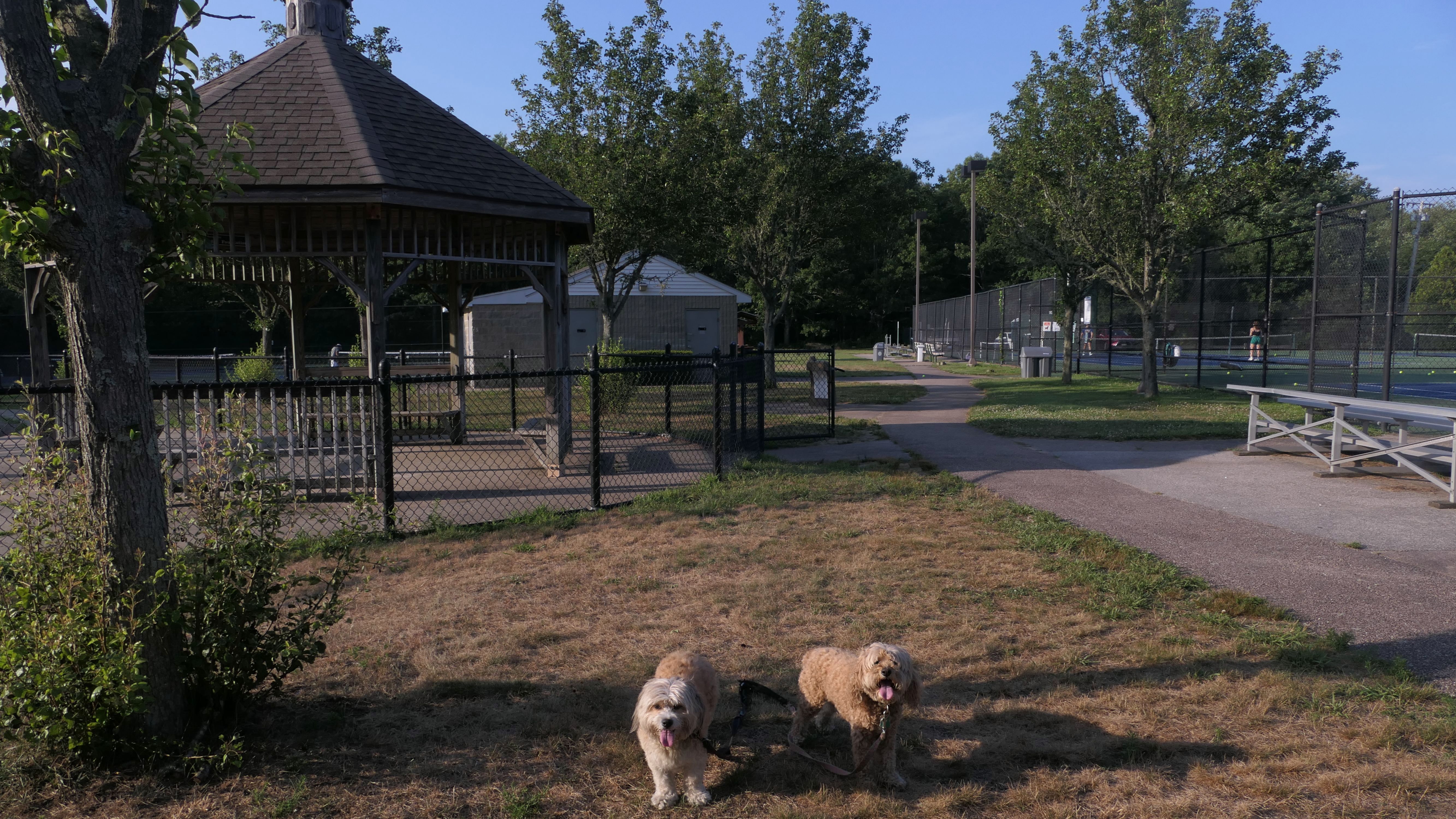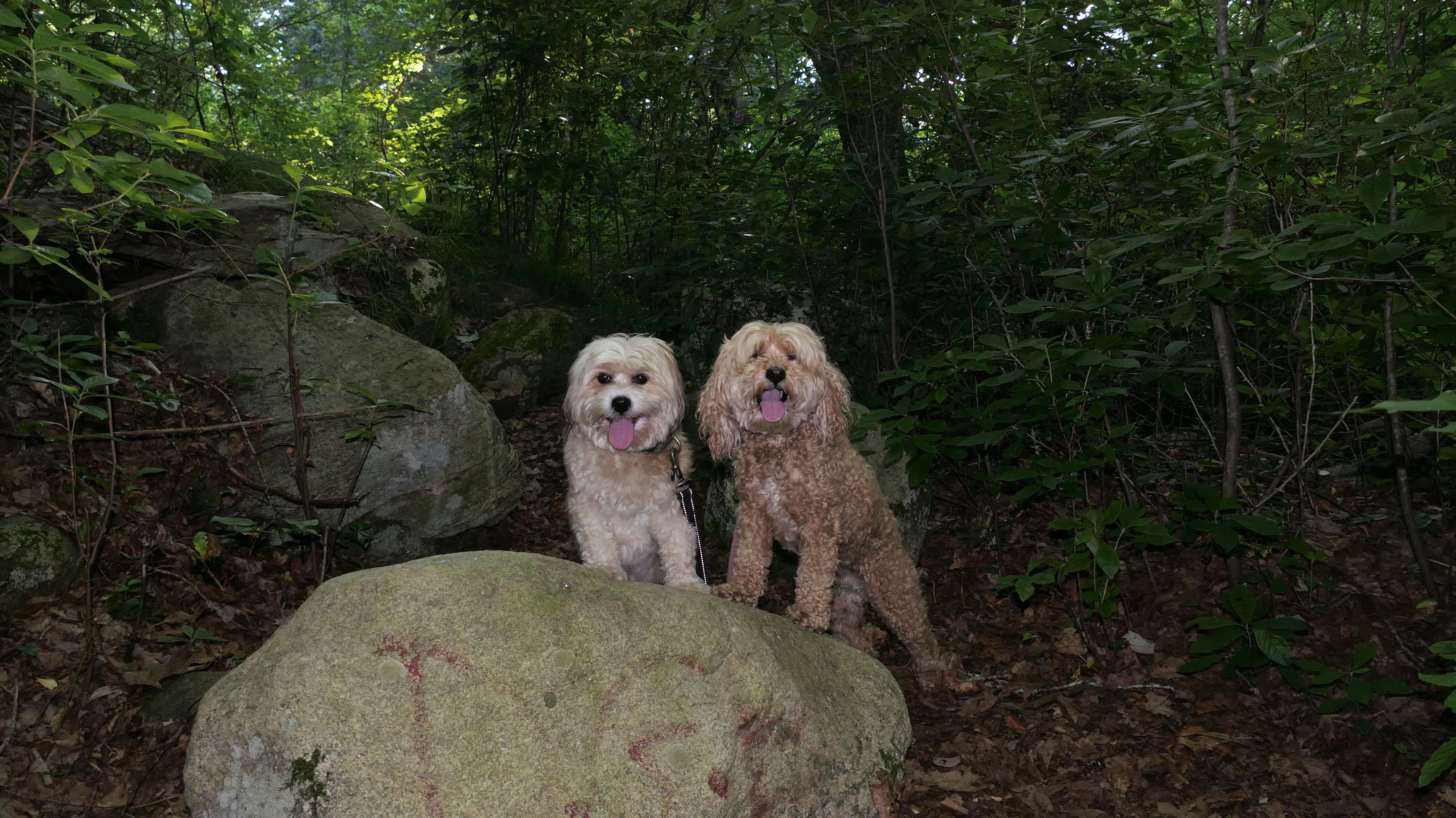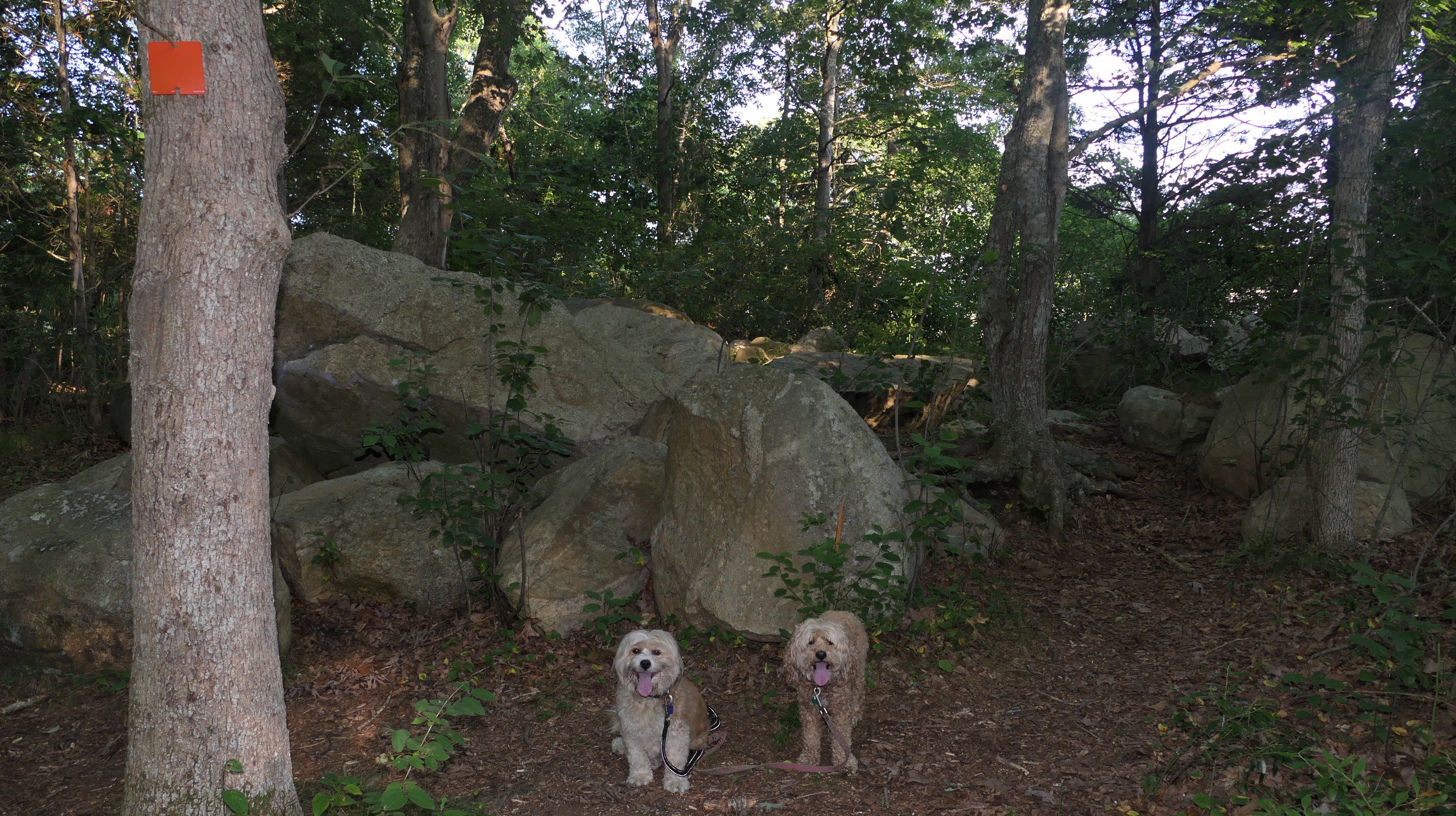 This looks like a nice place, with the stone walls and the cairns, and the salt pond, but this was a rough two mile hike. The trail is in the shape of a three prong fork, with the three prongs going out to the salt pond. The problem was that the kind of trails here need to be mowed, and they haven't been mowed in a while. Most of the trails were overgrown. The first part of the trail, sort of the handle of the fork if you will, is easy enough to traverse, despite the long grass, but each of three prongs caused challenges. The first one was the most overgrown, but the also the driest, with only a little bit of mud. We were able to get the closest to Winnapaug Pond here. The second and third trails were easy at the start, but got muddier and more overgrown the closer to the pond we got. I wound up carrying the dogs over long stretches on the 2nd trail, and we simply turned around when we reached the mud on the 3rd trail. I also had to pull a few ticks off both myself and the dogs when we got back to the car. The long grass is a breeding ground for ticks. While there was only a few ticks on us this time, I wouldn't advise coming here earlier in the season, when tick season is at it's peak. This seems like it could be a wonderful spot, but it needs a bit more maintenance.
