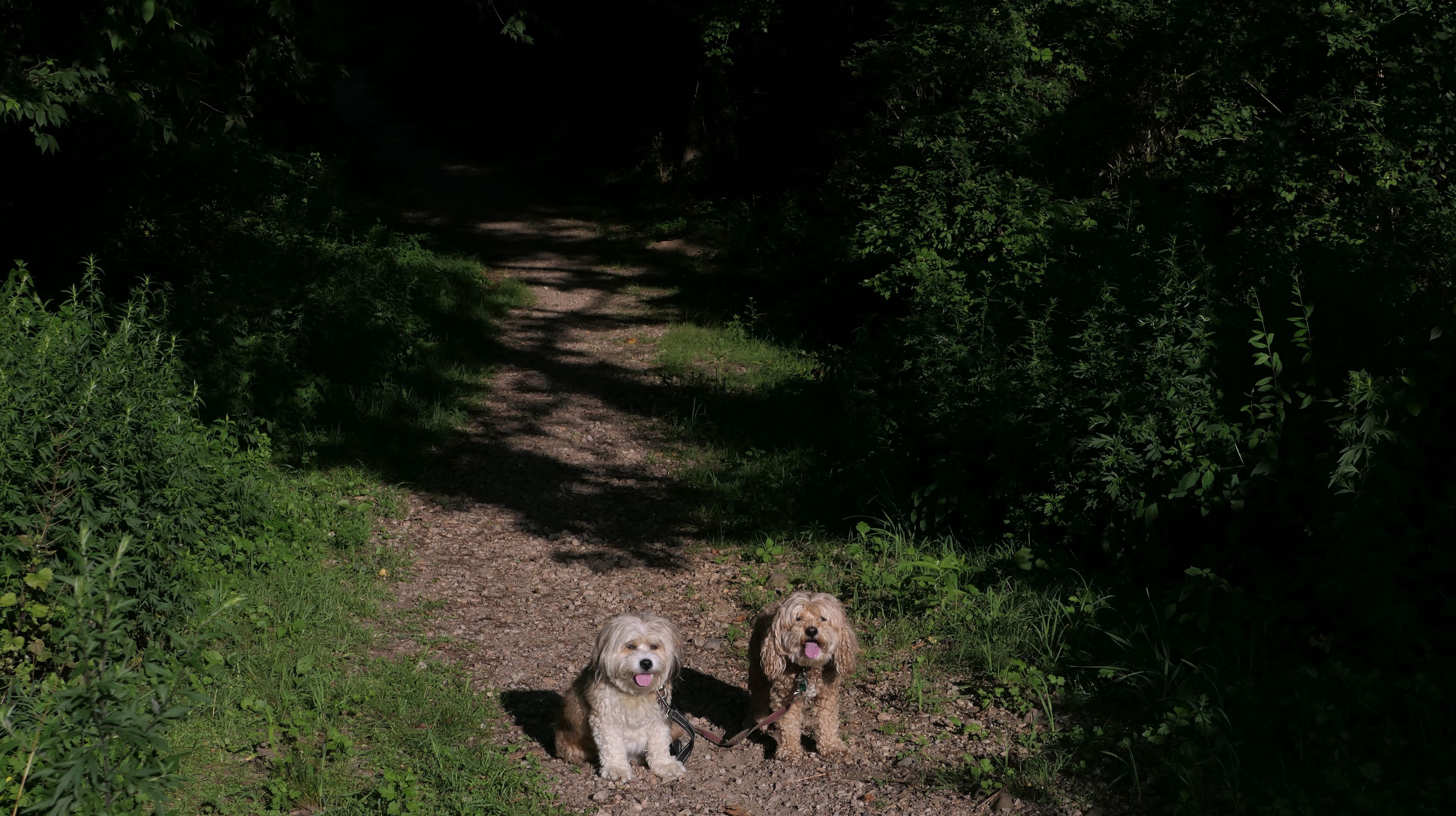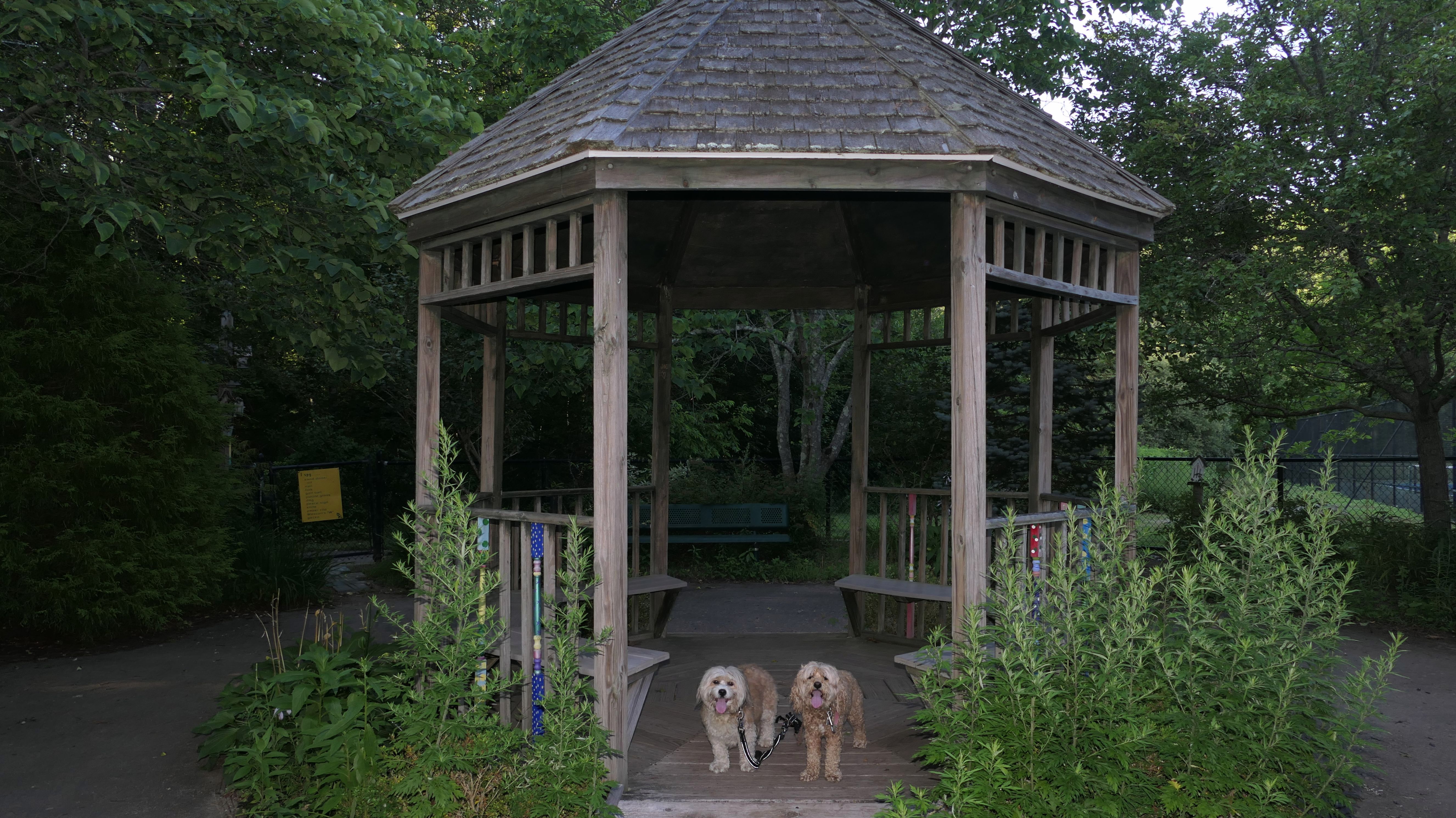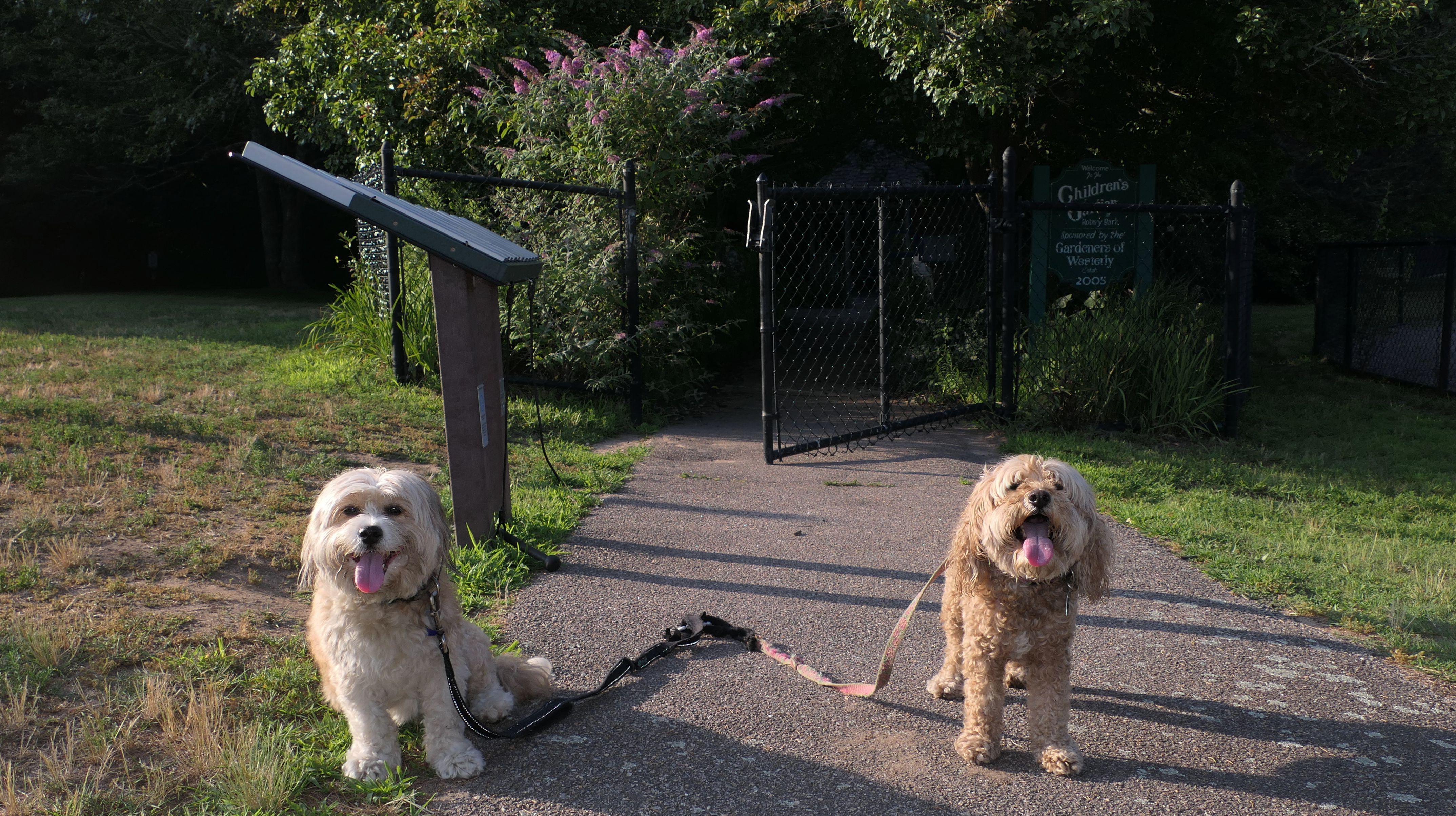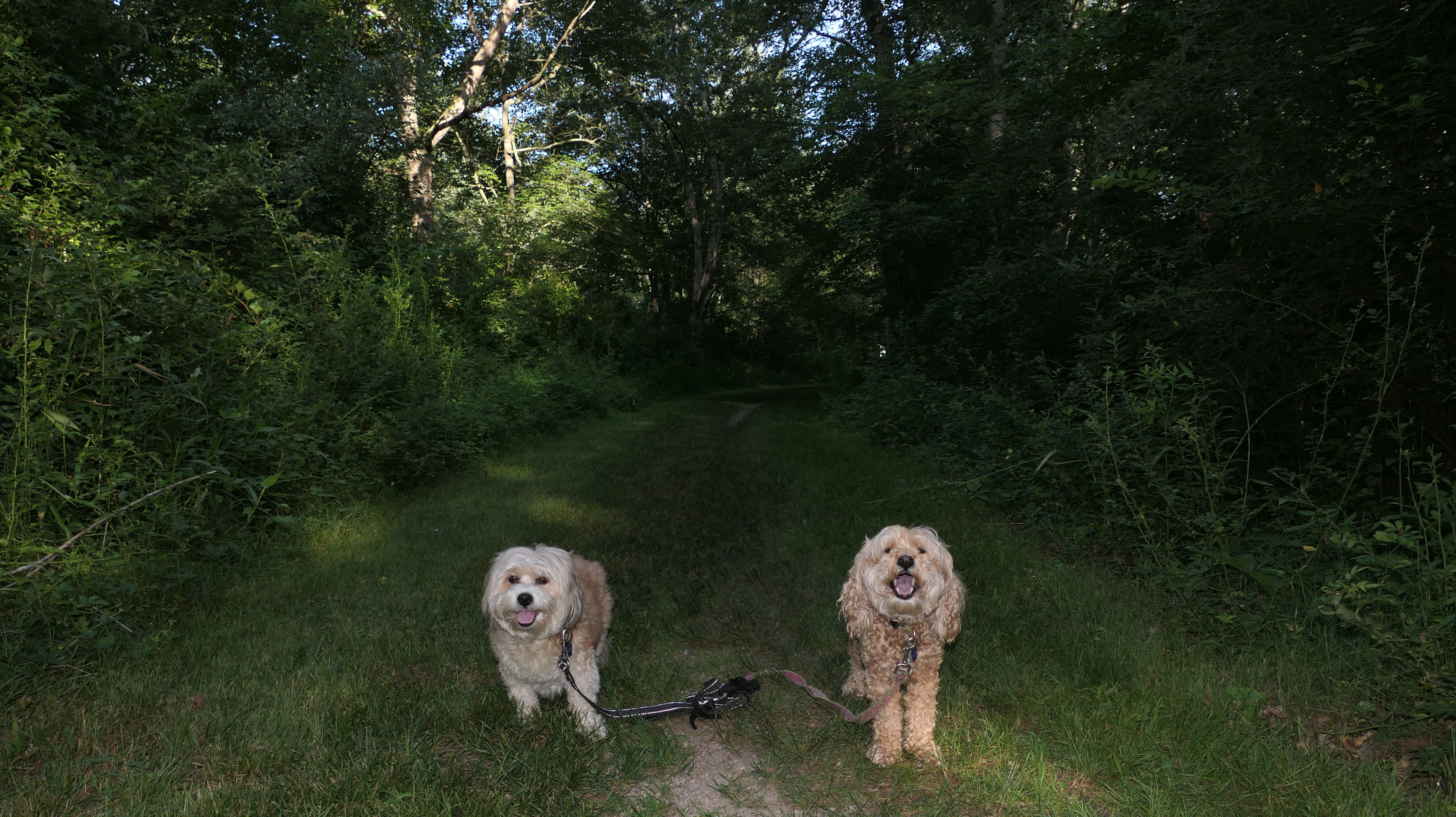 This looks like a nice place, with the stone walls and the cairns, and the salt pond, but this was a rough two mile hike. The trail is in the shape of a three prong fork, with the three prongs going out to the salt pond. The problem was that the kind of trails here need to be mowed, and they haven't been mowed in a while. Most of the trails were overgrown. The first part of the trail, sort of the handle of the fork if you will, is easy enough to traverse, despite the long grass, but each of three prongs caused challenges. The first one was the most overgrown, but the also the driest, with only a little bit of mud. We were able to get the closest to Winnapaug Pond here. The second and third trails were easy at the start, but got muddier and more overgrown the closer to the pond we got. I wound up carrying the dogs over long stretches on the 2nd trail, and we simply turned around when we reached the mud on the 3rd trail. I also had to pull a few ticks off both myself and the dogs when we got back to the car. The long grass is a breeding ground for ticks. While there was only a few ticks on us this time, I wouldn't advise coming here earlier in the season, when tick season is at it's peak. This seems like it could be a wonderful spot, but it needs a bit more maintenance.