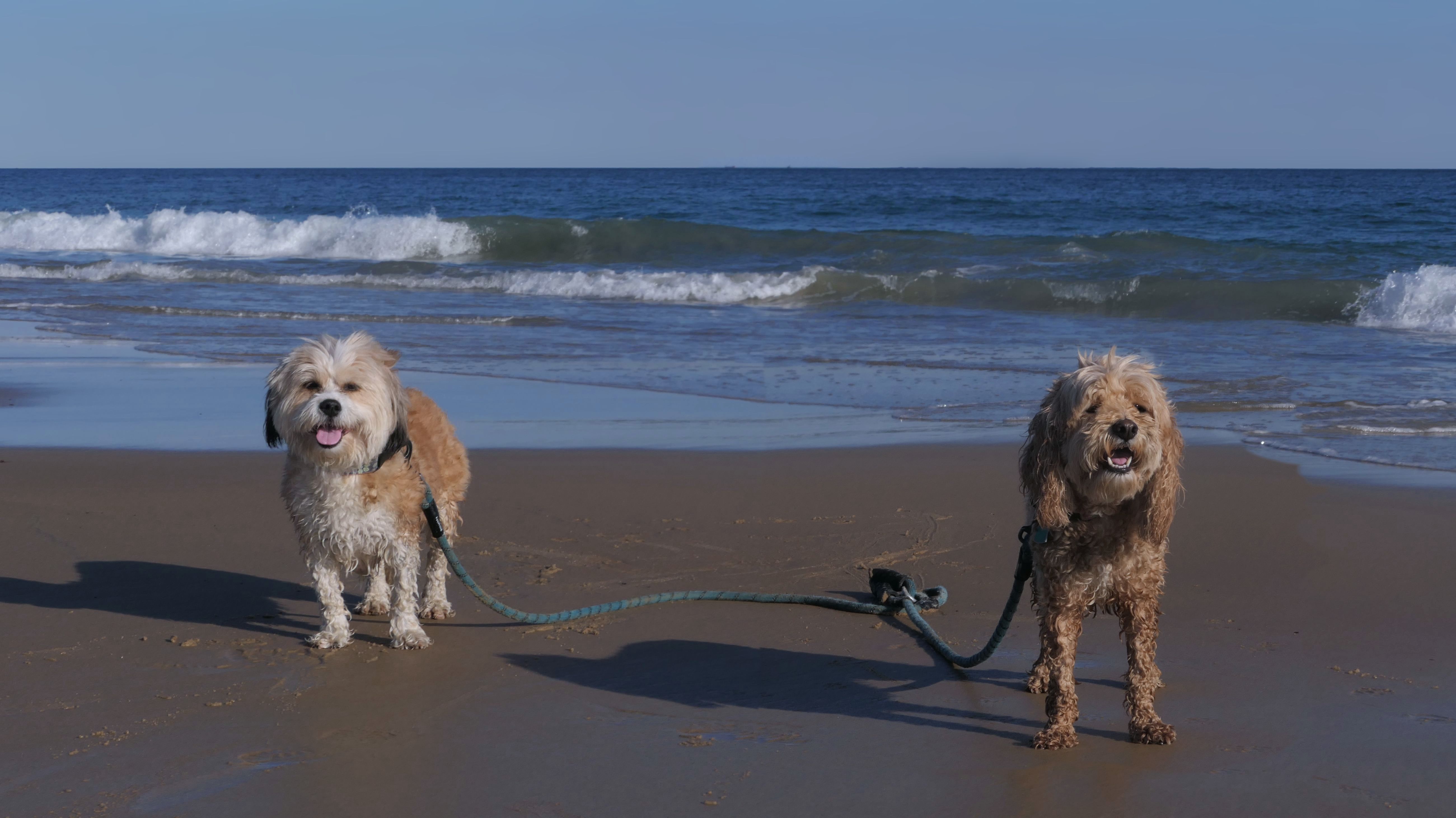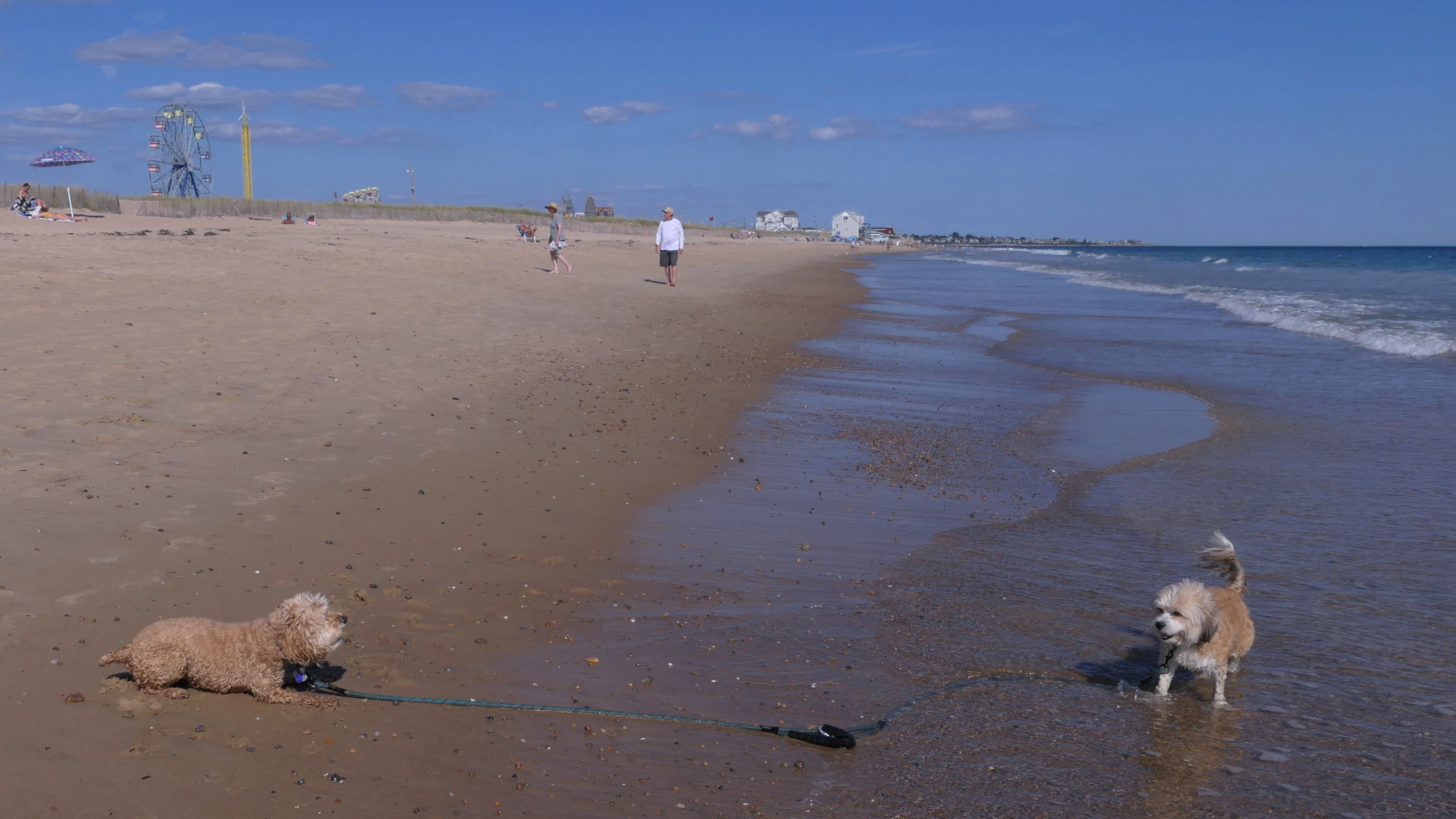 This was a wonderful late summer walk on the beach. Although dogs are technically allowed on the state beach until October, the town beaches on either side allow dogs after Labor Day. It's unclear where the borders are, so we basically just walked from Westerly Town Beach through the main tourist beach, and over to Misquamicut Fire District Beach, and back. The beach was moderately busy. It was a Thursday afternoon during the week, so even though it was a warm day, crowds weren't anything like what you'd see here during the summer peak. There were actually a good deal of people with their dogs here as well. We were here a day before the annual Fall Fest, so you can see the amusement park rides in the background of some of the photos. Lexi tried to get Mandy to play a couple times, but all Mandy wanted to do was relax in the water!
