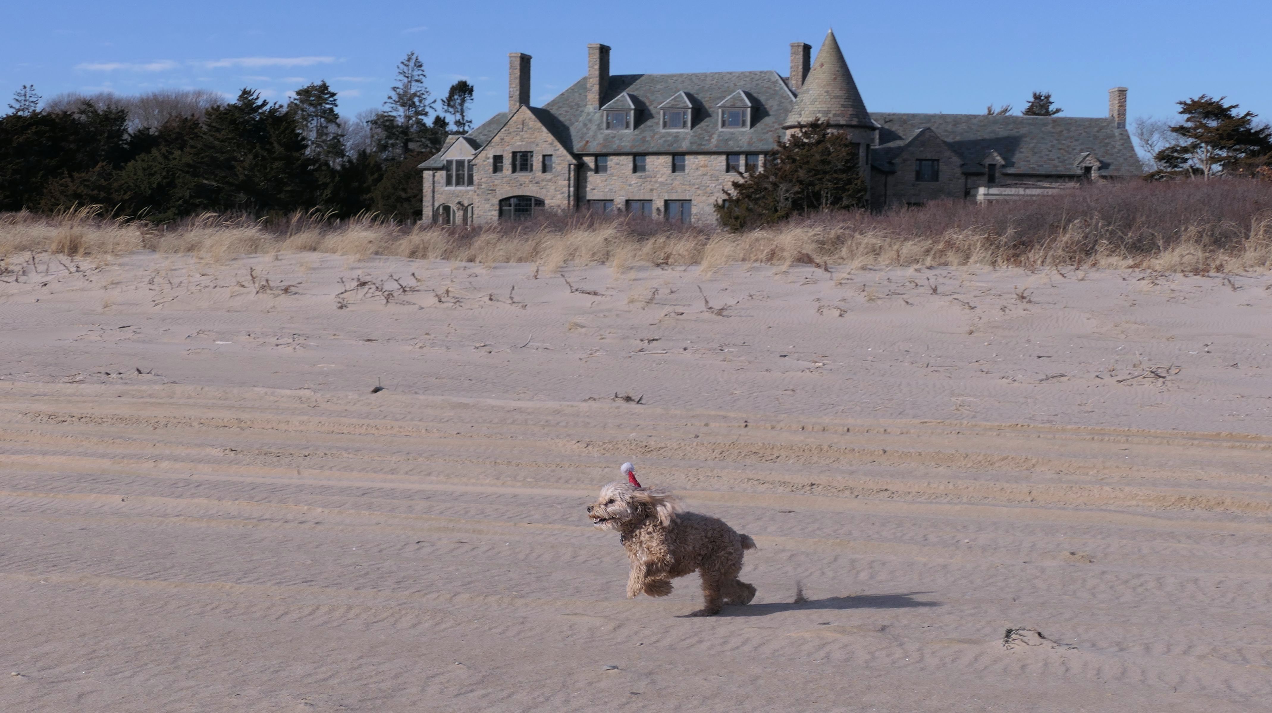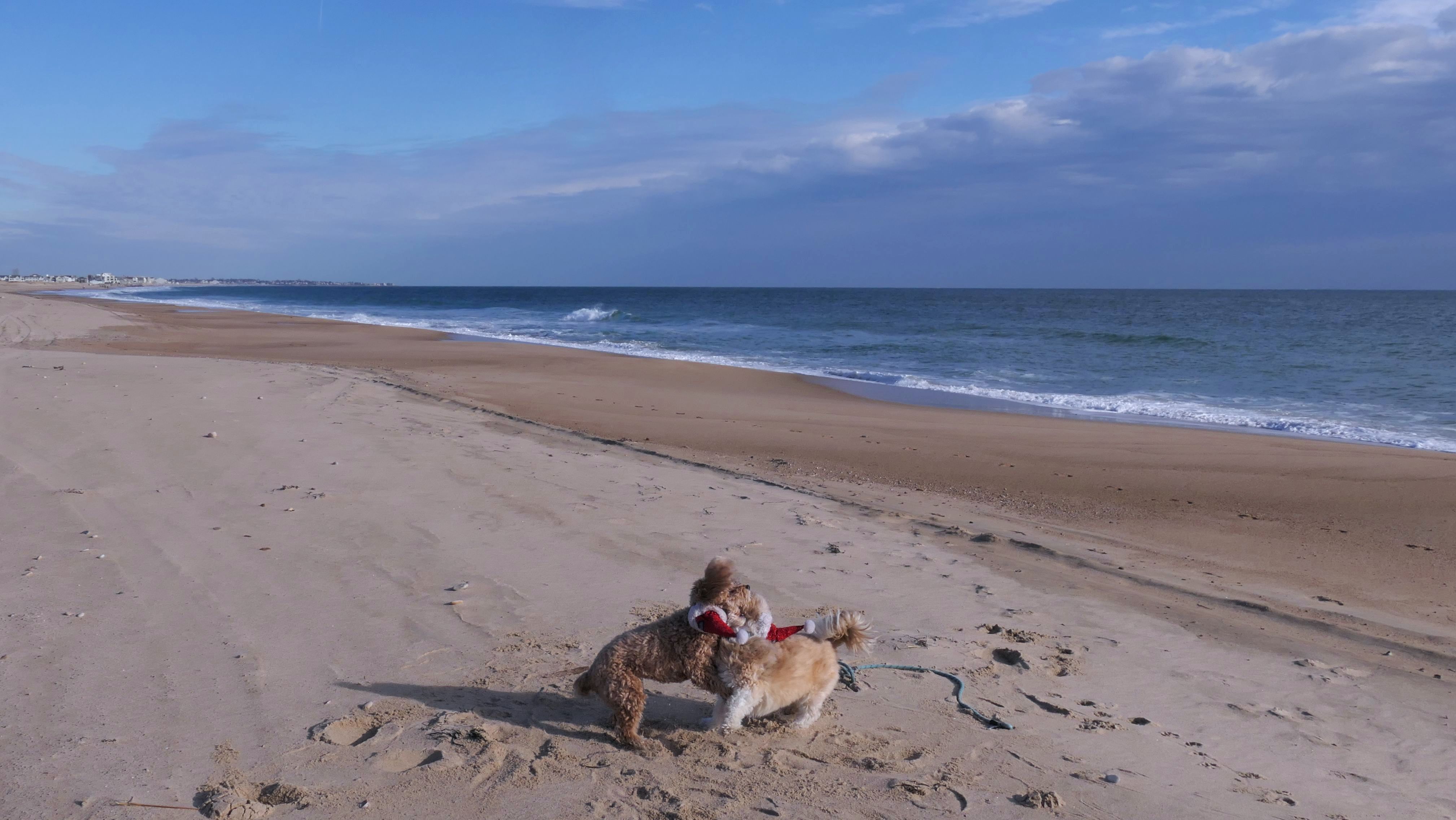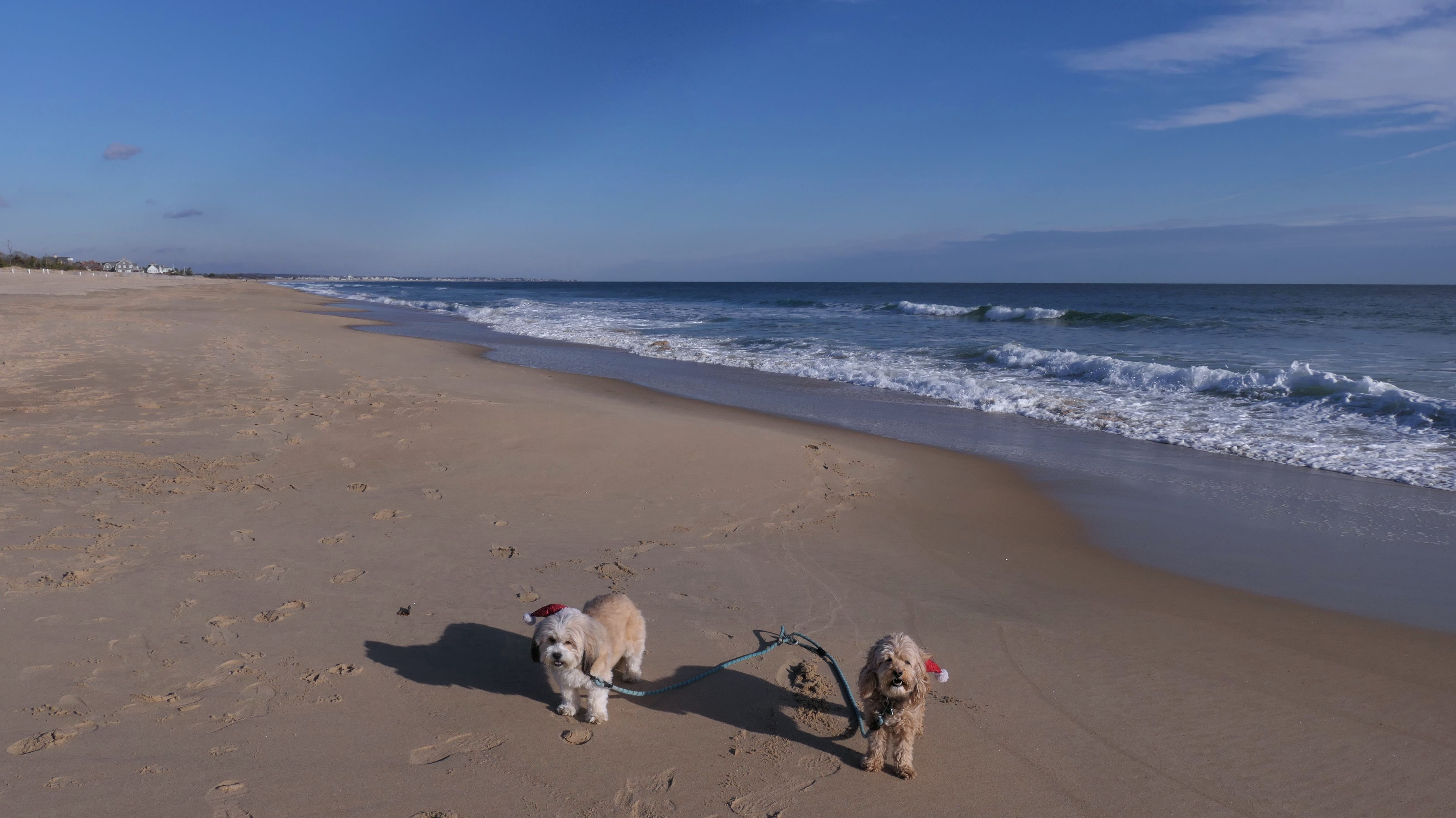 Nothing says Christmas in New England like a trip to the beach! We had a great four mile walk on Christmas Morning. It was damp, dreary, cloudy and foggy in the Hartford Connecticut area, but sunny and near 60 in Westerly. We couldn't park at the main lot since Atlantic Avenue was still flooded from the storm the week before. We parked at Dunes Park just to the west of the breachway, and walked west along the beach. Our route overlapped a bit with a section of the beach we we walked when we were at Misquamicut last year. The dogs were great sports with their Santa hats! And with the hats, we can tell these photos were taken on Christmas and not some day in July!