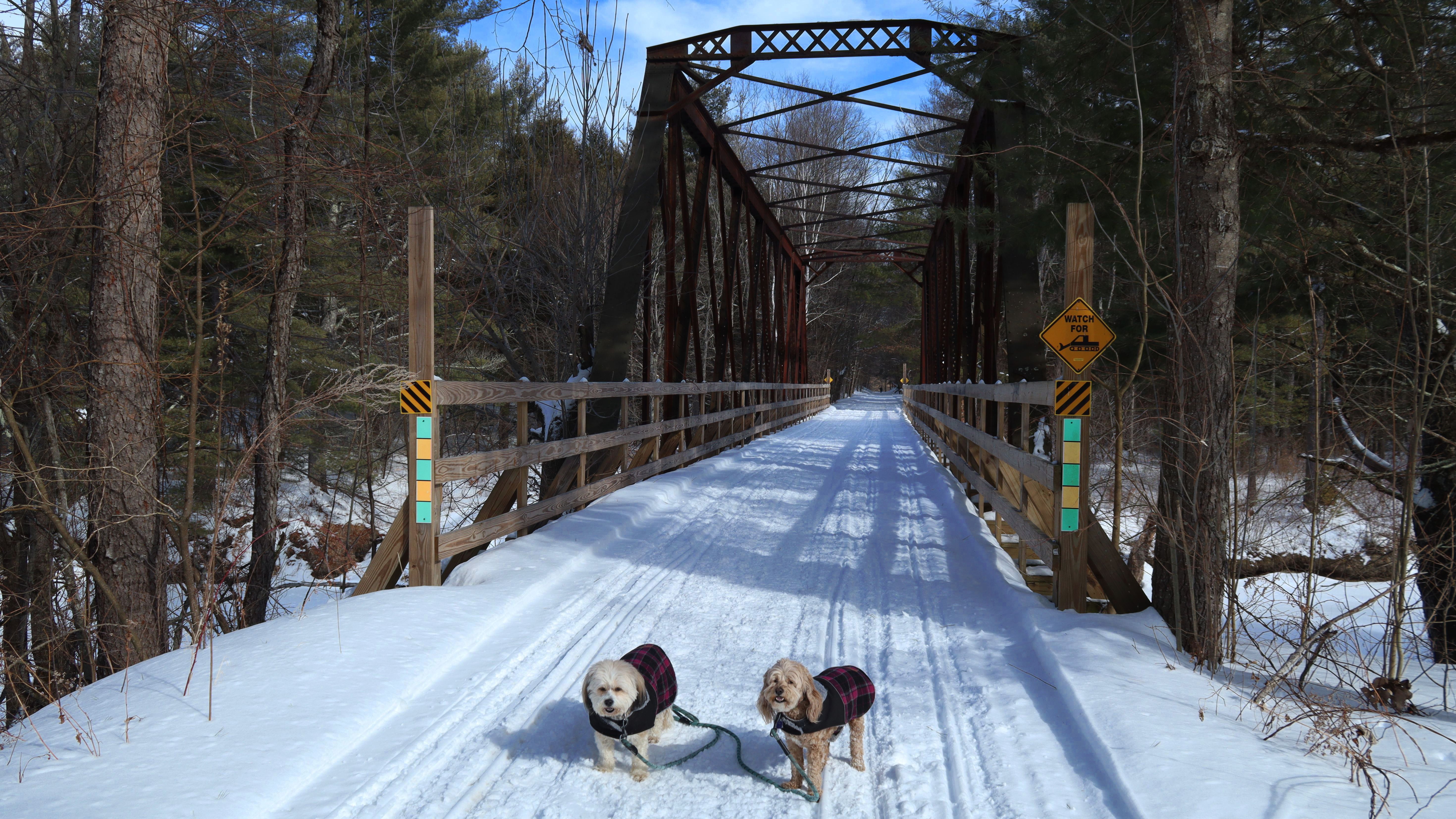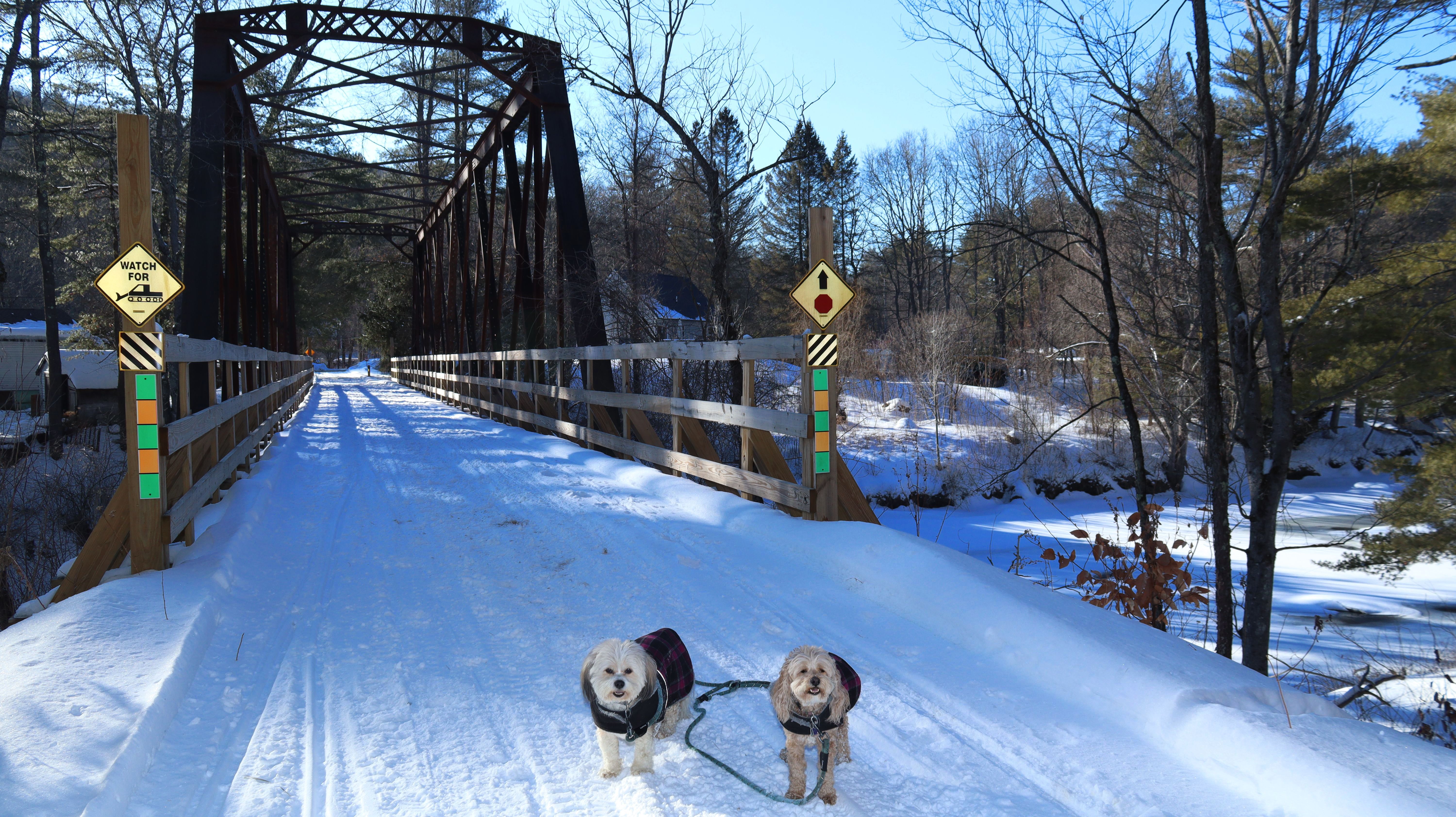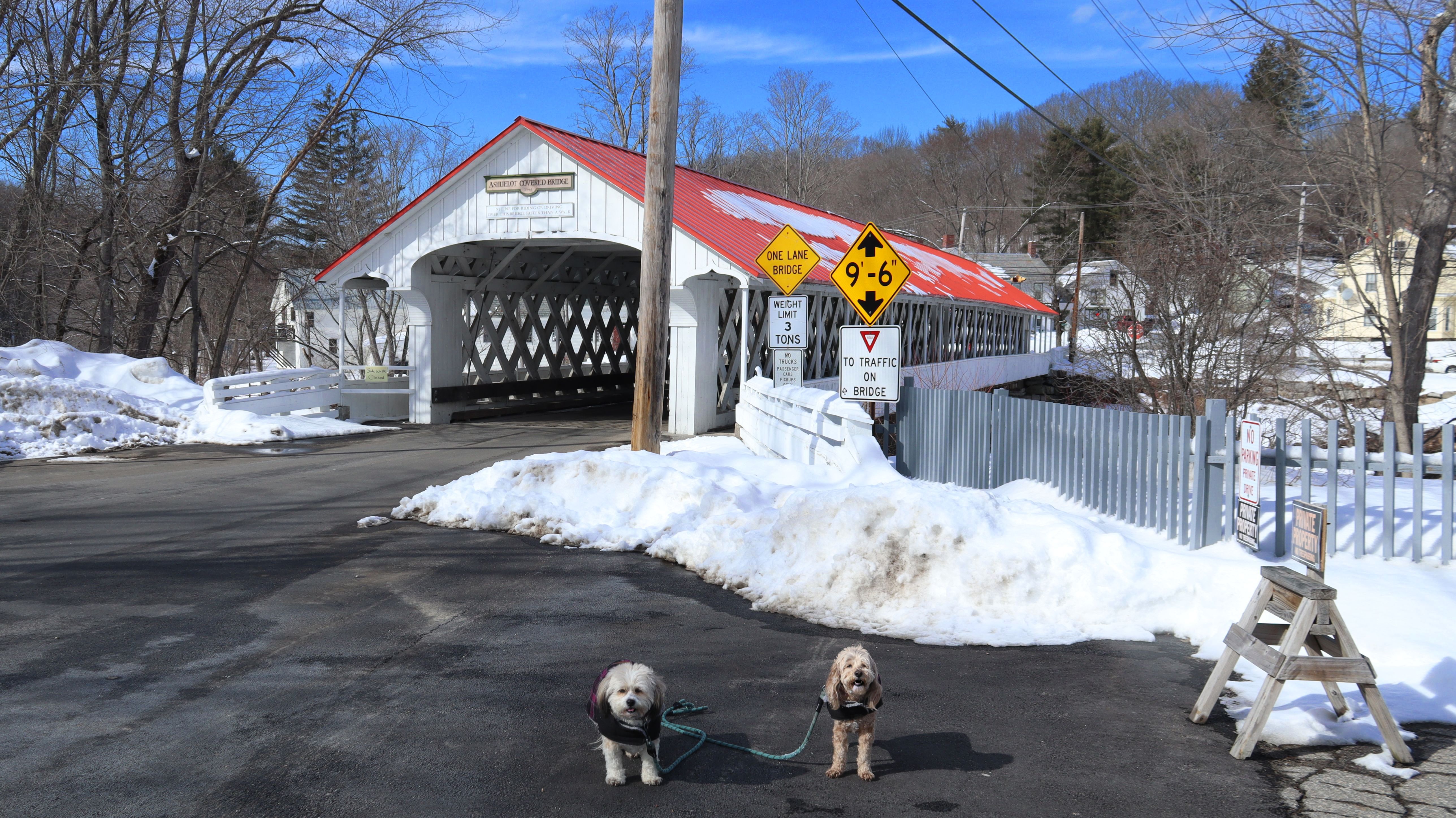 Mandy and Lexi had been a little off-the-wall of late. With the 'Blizzard of '26' dumping feet of snow around the area earlier in the week, it's been difficult finding places to visit. There was actually less snow to the north, and a sunnier forecast, so we headed up to southern New Hampshire. The plan was to take a few photos near this bridge, then head to the Downtown Historic District for the majority of our walk. This is a very cool covered bridge. It features pedestrian sidewalks on either side, but one side was closed. It's also very near the Ashuelot Rail Trail, which to my surprise, was passable so we actually headed there next.