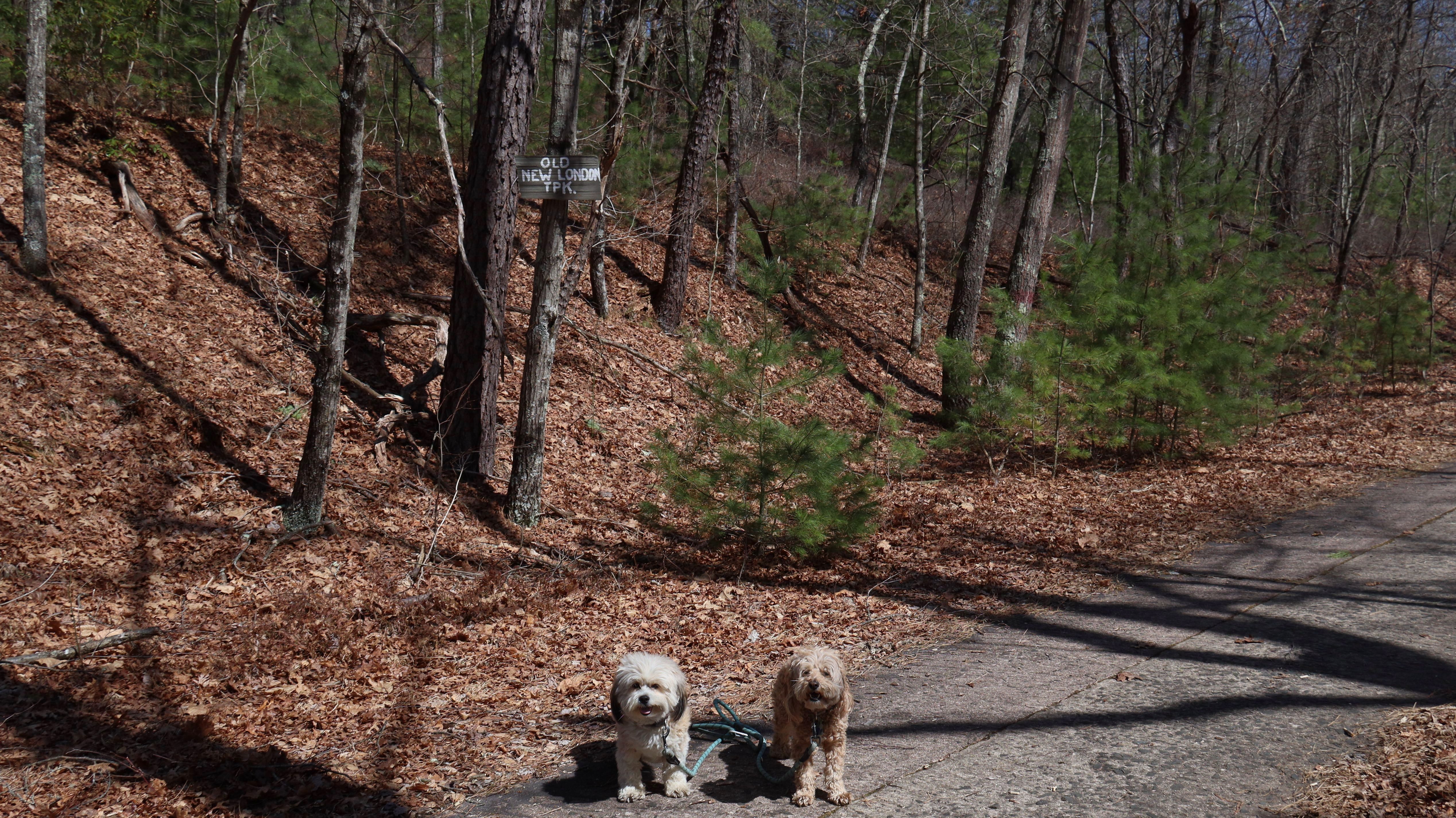 We hiked what is Google Maps calls "North Mesh Trail", that runs through the northern part of the forest. We went out about one and half miles before turning around. The trail is pretty well maintained, and there are a number of side trails that you can take to make it longer if you want. Portions of the trail run along the old New London Turnpike, and alternate between a gravel and cement surface, before turing into a dirt trail. A couple things to be aware of...the trail passes a gun range. Luckily nobody was using it when we were there. There was a number of downed trees and some muddy spots, but we were able to navigate around them without too much trouble. There is also a fair amount of highway noise as the trail runs pretty close to Route 2 for a good portion of the hike. One of the connecting trails leads under route two through a tunnel, but it's sort of a stream now so you would need to wade through it to get to the other side, and we didn't want to do that with the dogs.