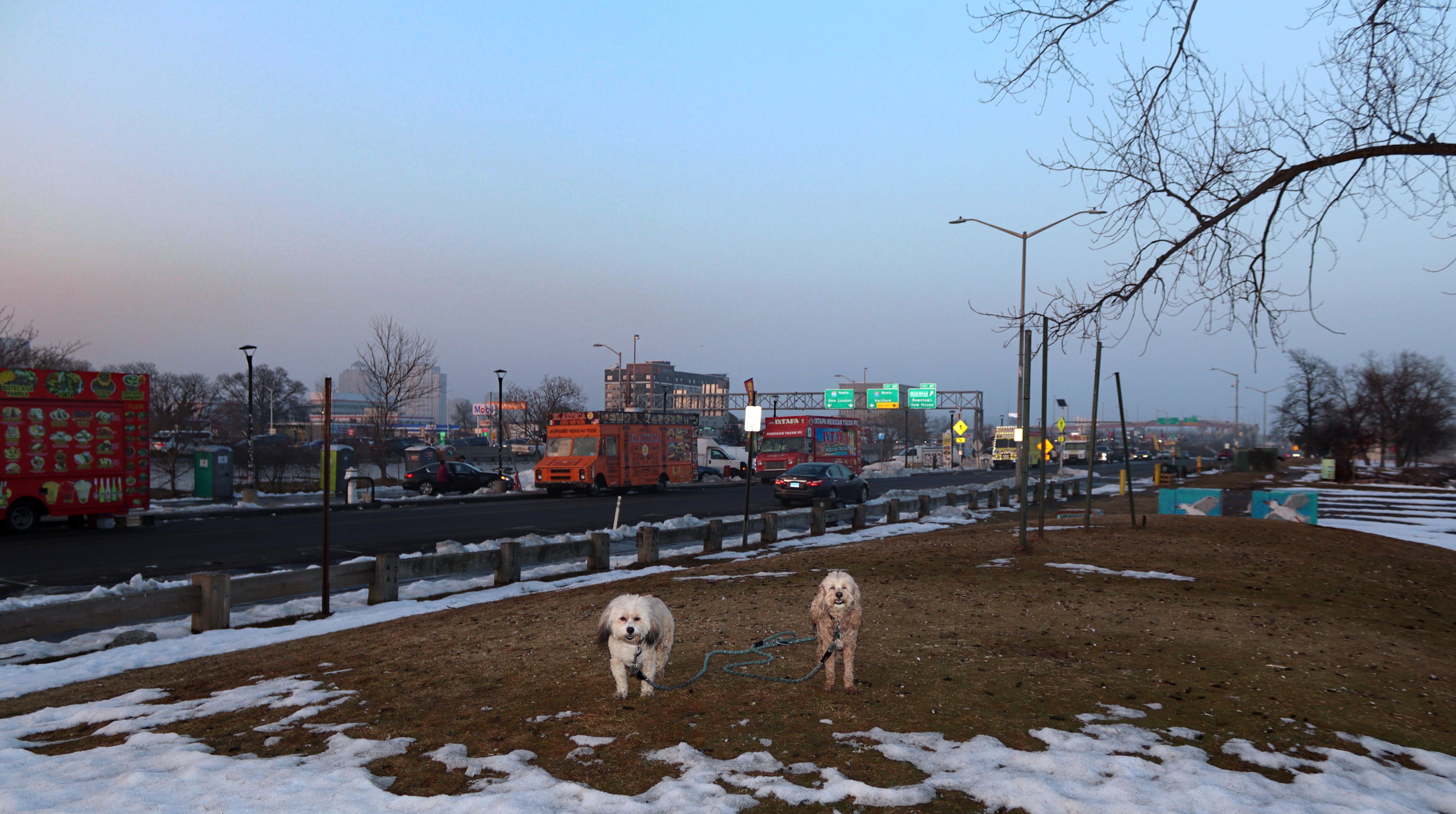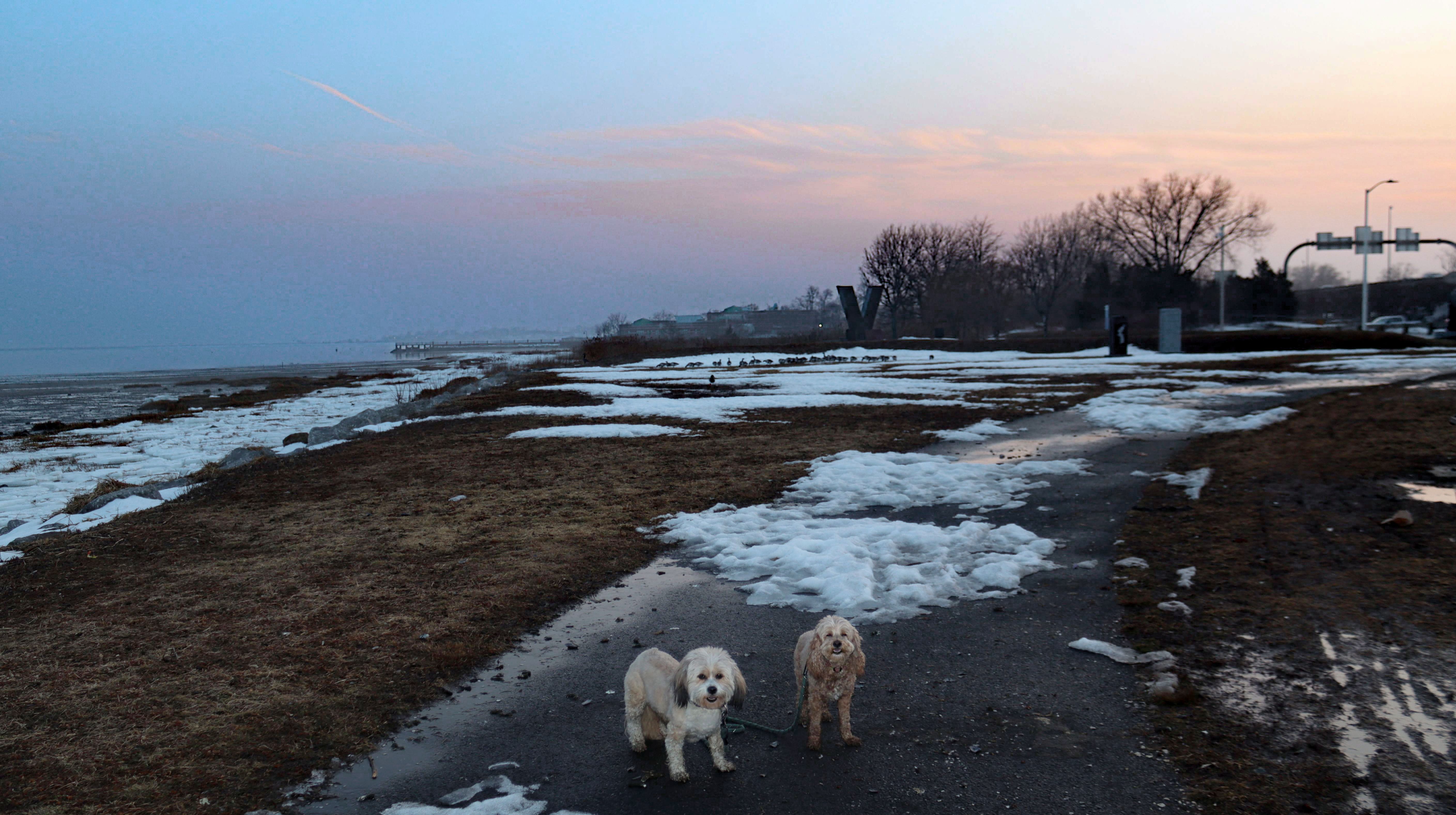 It was gray and gloomy for most of the day. The sun made a brief attempt to break through late in the afternoon, but it only left us with haze and fog, which created some interesting photo opportunities. We had visited before, first back in November of 2020, and later passed through again when we reached the southern end of the Farmington Canal Heritage Trail. It felt strange seeing chunks of ice floating in New Haven Harbor. We walked the full length of the harbor-side walkway, a little over two and a half miles round trip. On the opposite side of the street, food trucks were lined up, but every single one was a taco truck, so there wasn't much variety. The dogs enjoyed the walk, especially Mandy, who made it her personal mission to step in every puddle along the way.