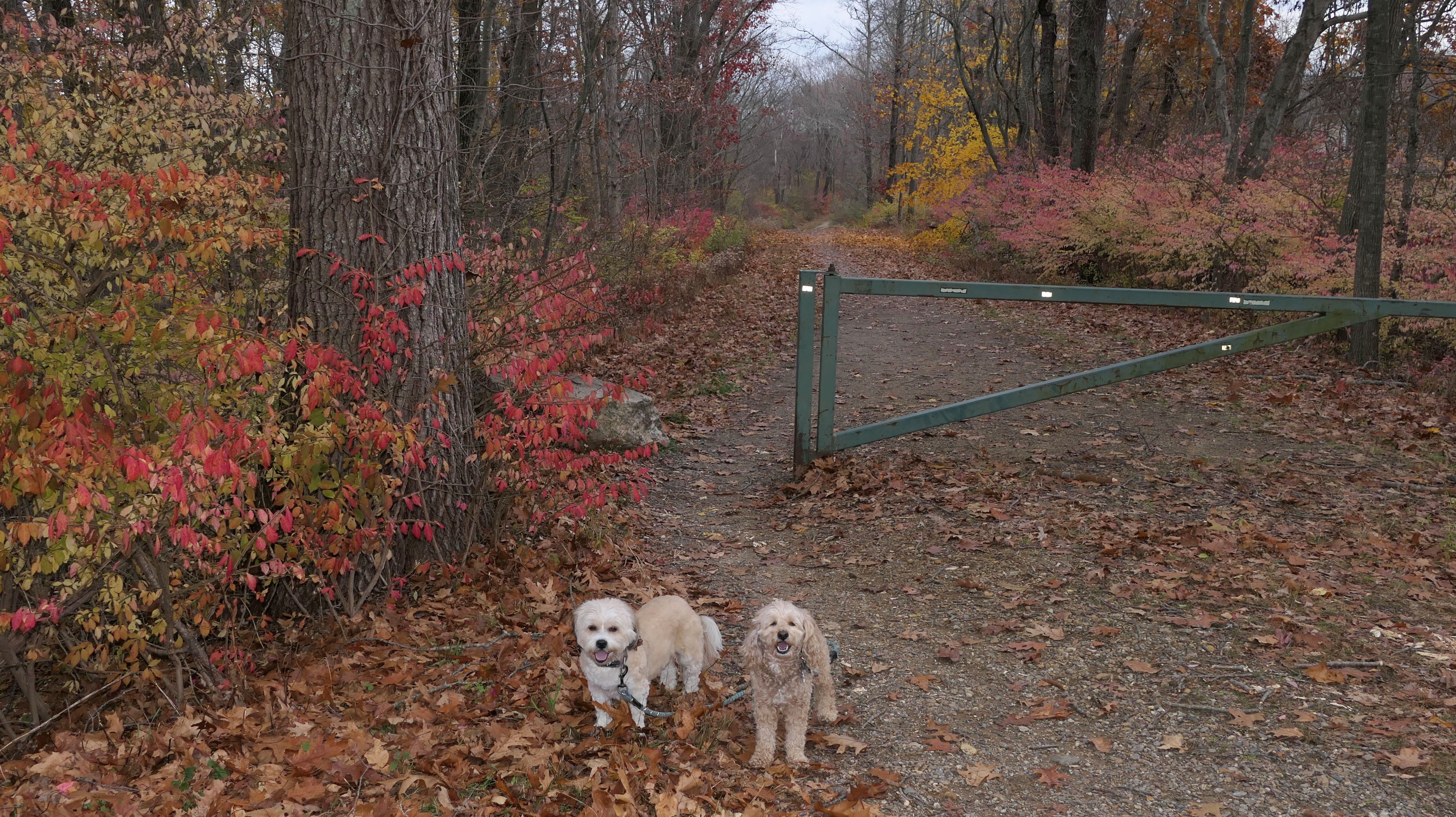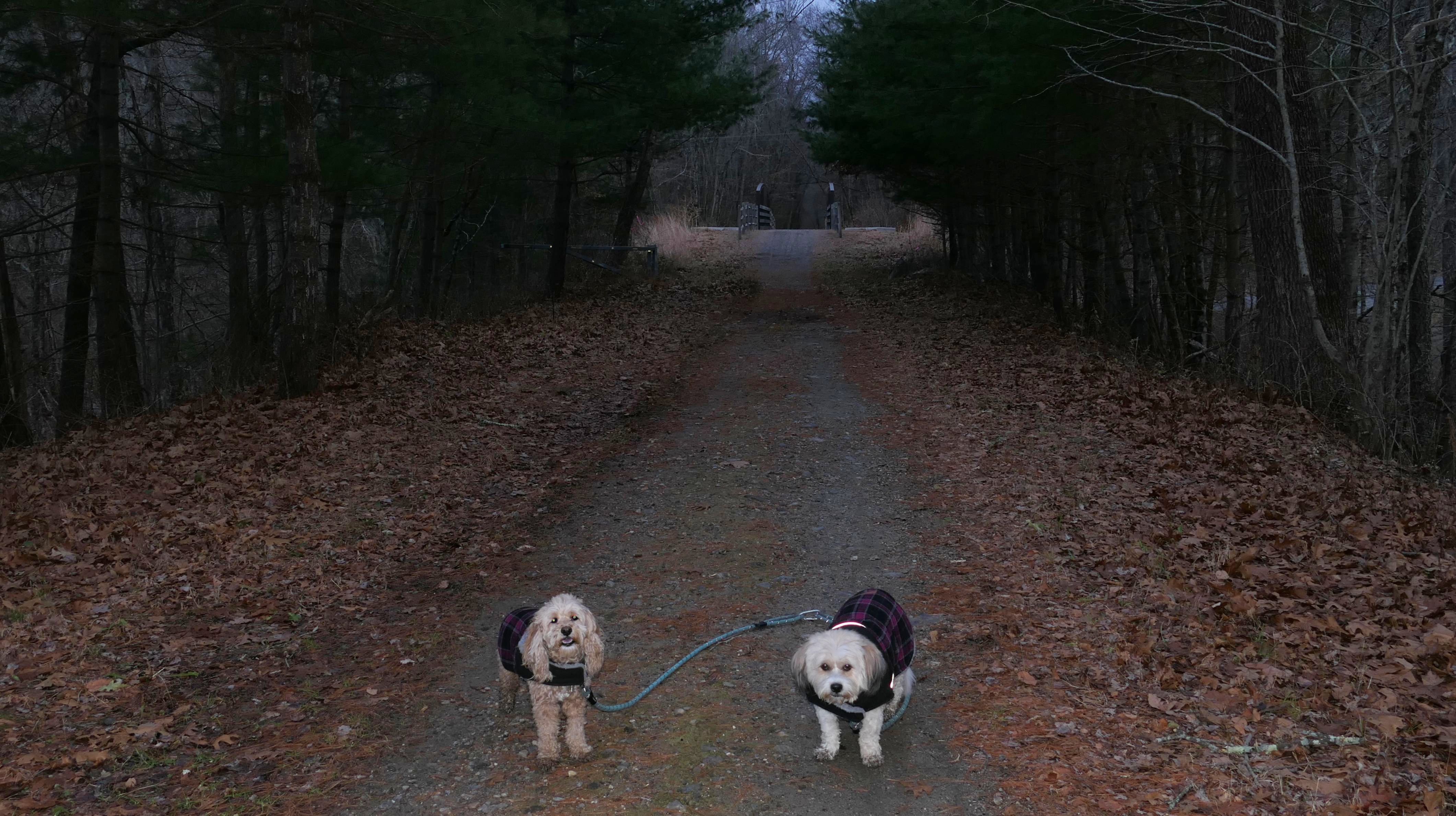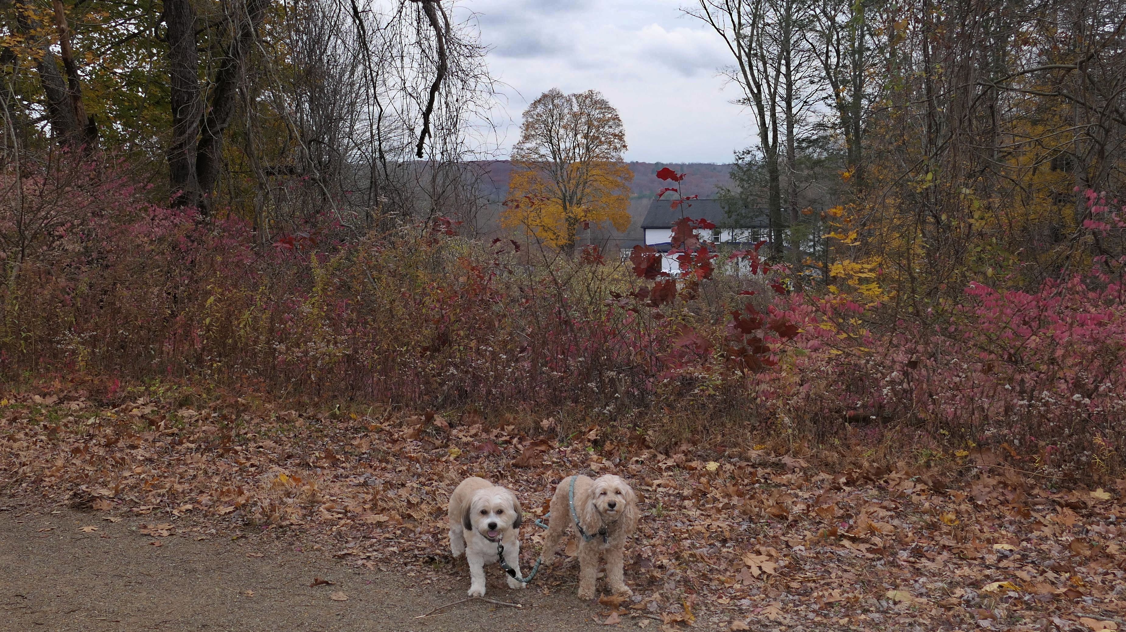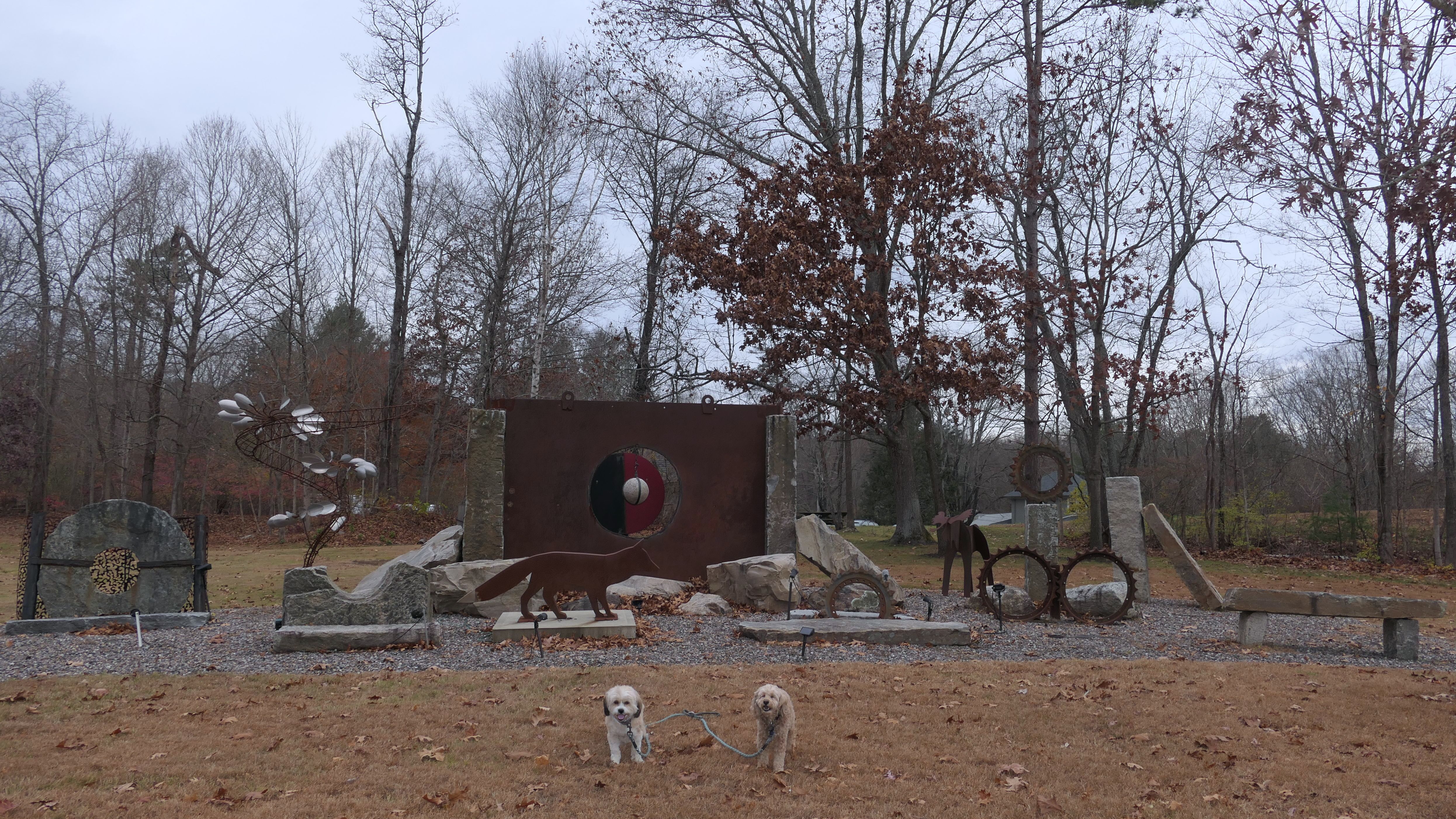 I decided to re-visit the Air Line Trail, the longest multi-town, multi-use trail in Connecticut. We've walked bits and pieces of it in the past, but still have a ways to go to complete the entire trail. This is a 2.5 mile section from the Pomfret Town Hall to the old Pomfret Station. We actually attempted this section once before, but it was too muddy that time, and we turned around after a half mile. It was pretty dry for this walk, but there was one muddy spot near Pomfret Station that I had to carry the dogs over. This trail is not that exciting, but the photo with the horses is pretty cool, and there was an interesting art installation at the Pomfret Station trail head. The weather was dreary and we completed our five mile out and back walk just before it started to rain.