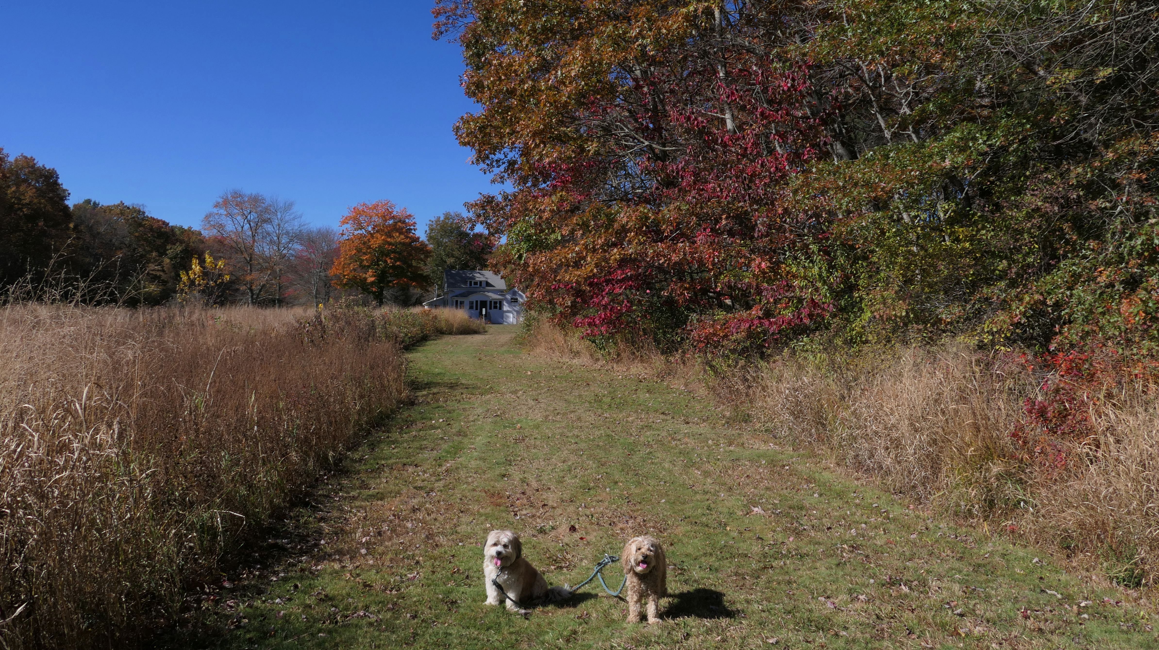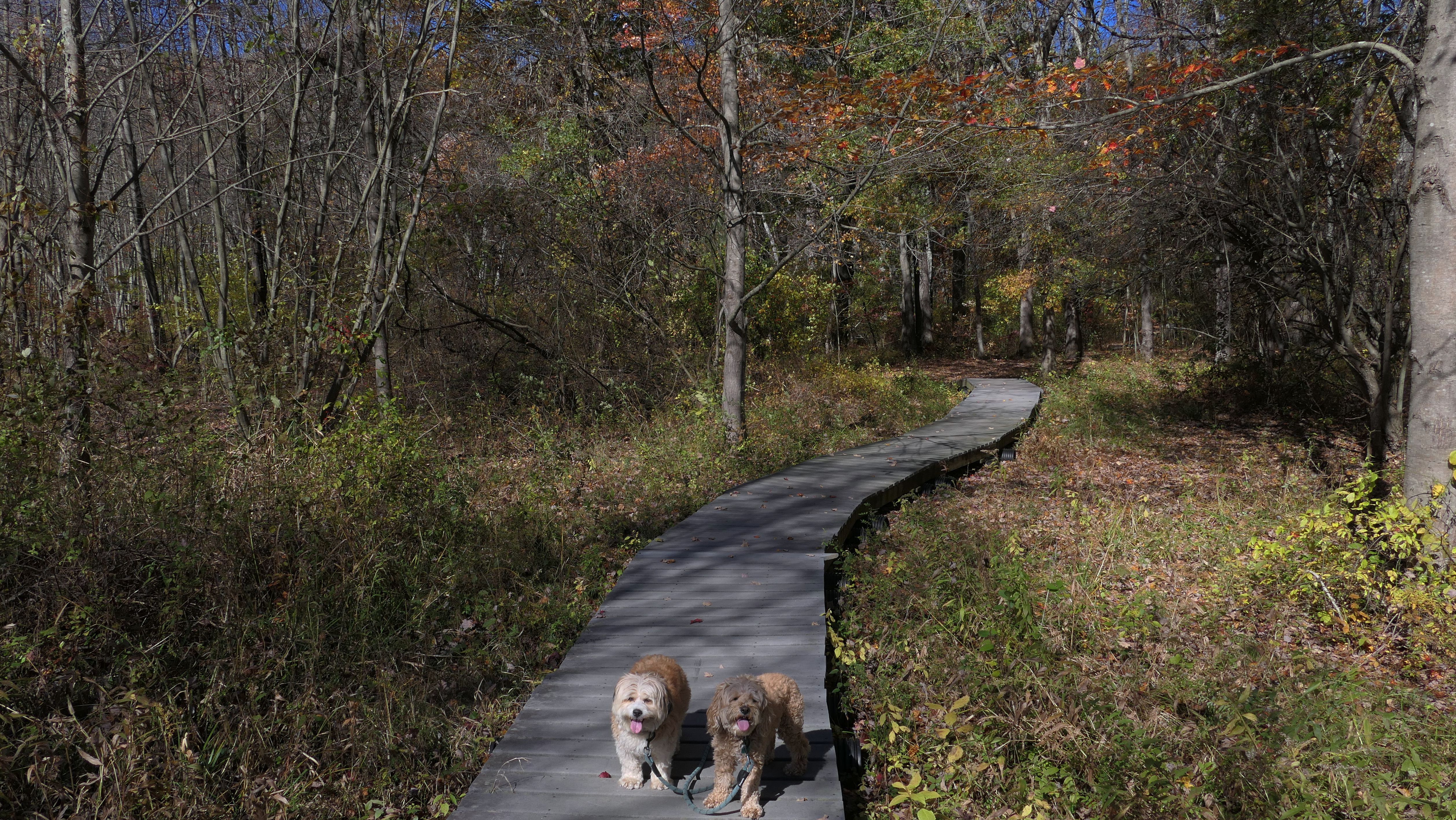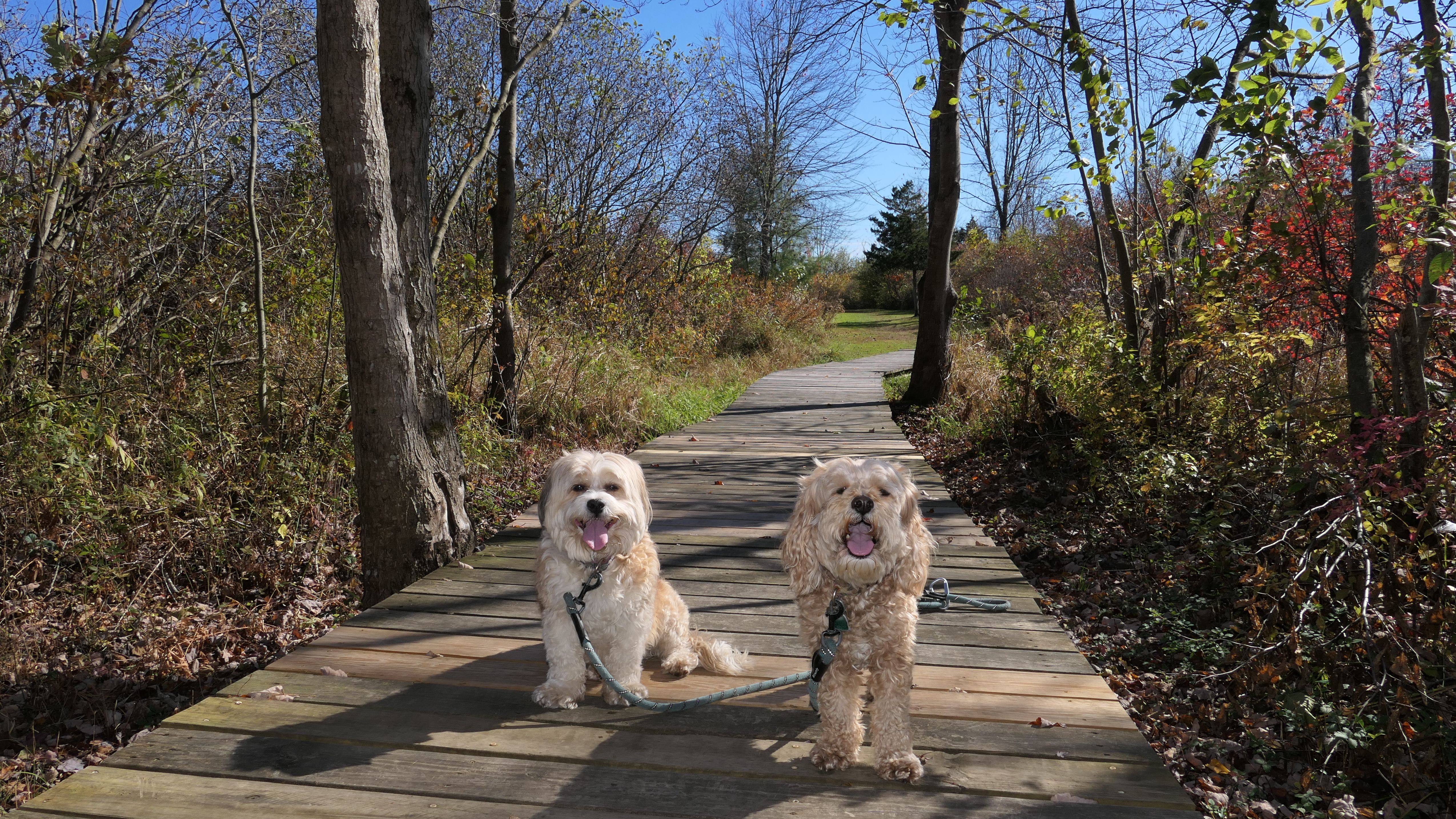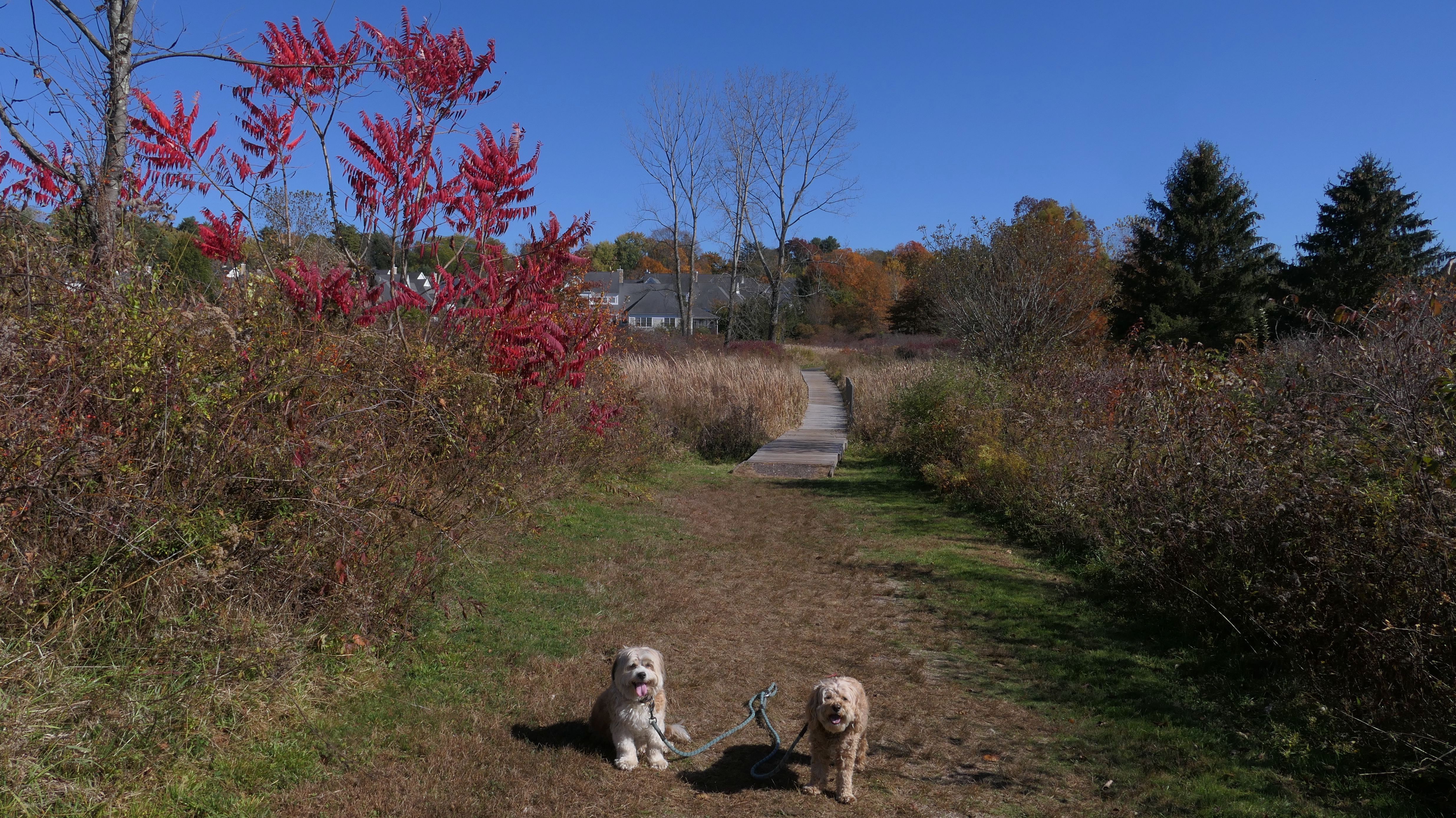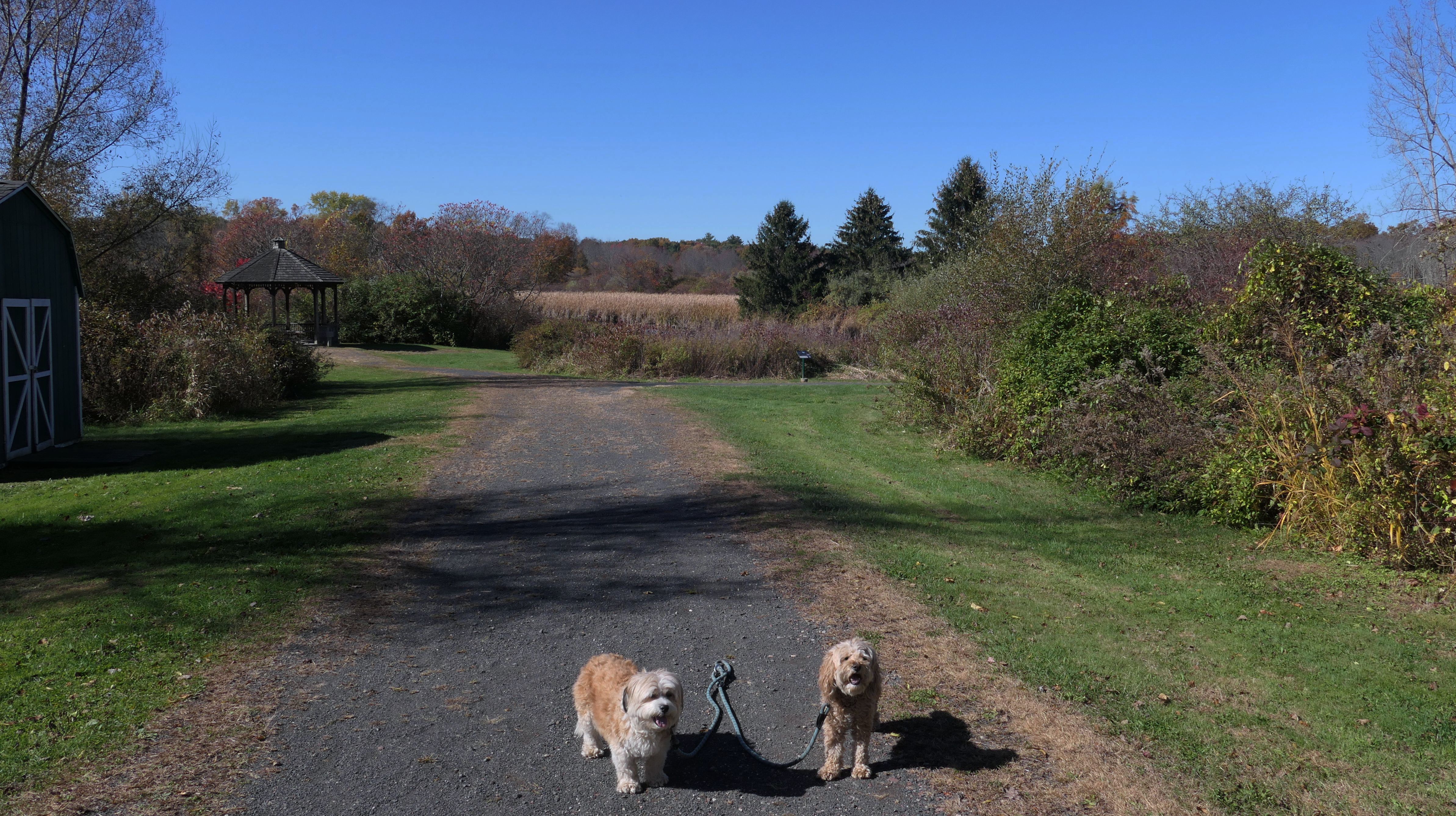It was such a gorgeous day, so instead of taking Mandy and Lexi on a walk through the neighborhood during lunch hour, I took them here. We hadn't walked through here in a couple years. Apart from the new heart shaped patio with benches near the main parking area, not much has changed. I was a bit disappointed that most of the leaves have fallen here already. Many of the trees were already bare, and there wasn't much in the way of fall colors compared to most of the surrounding are. The trail runs through a meadow and heads in an out of the woods. The quick walk made for a nice break in the workday.