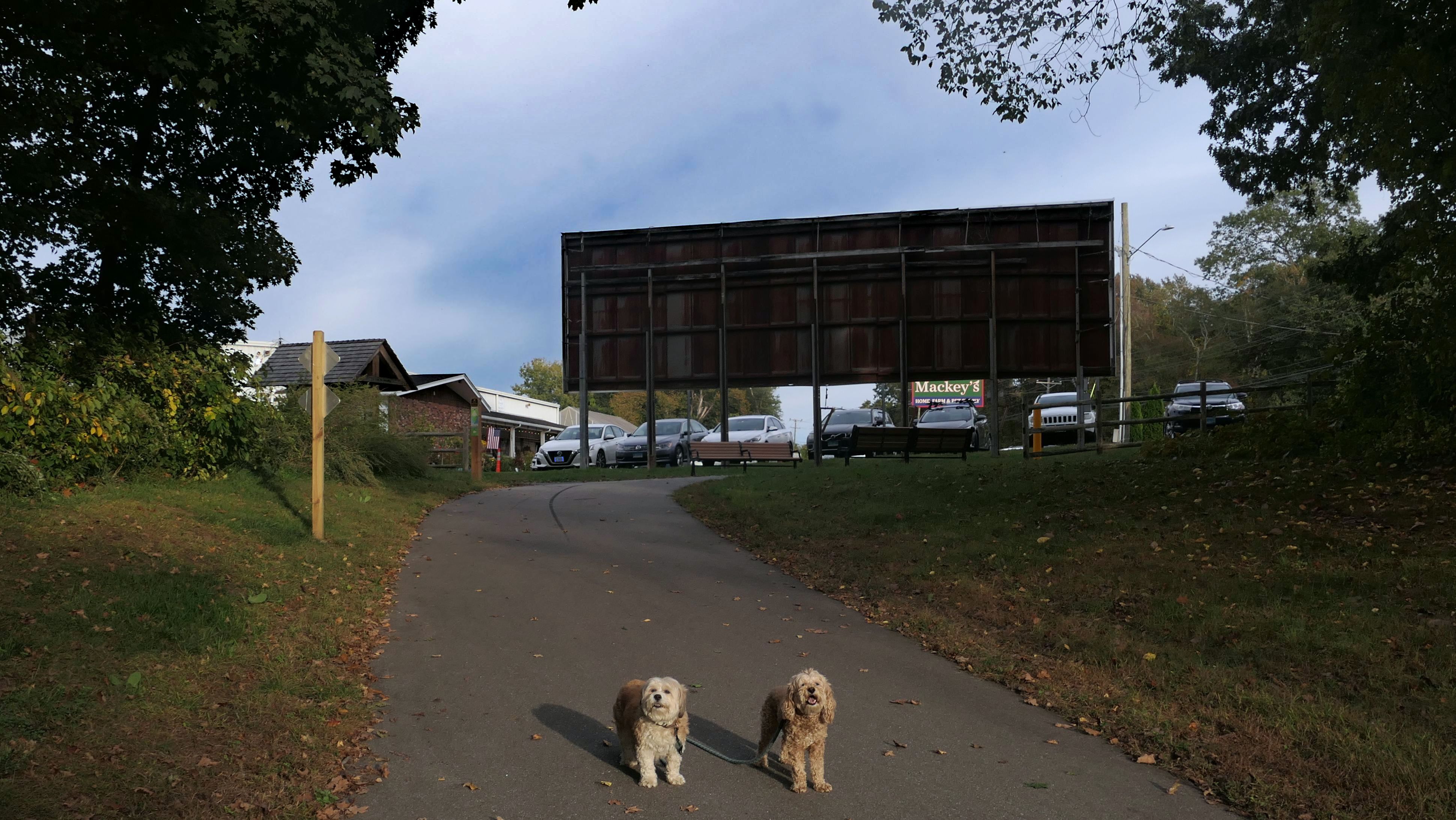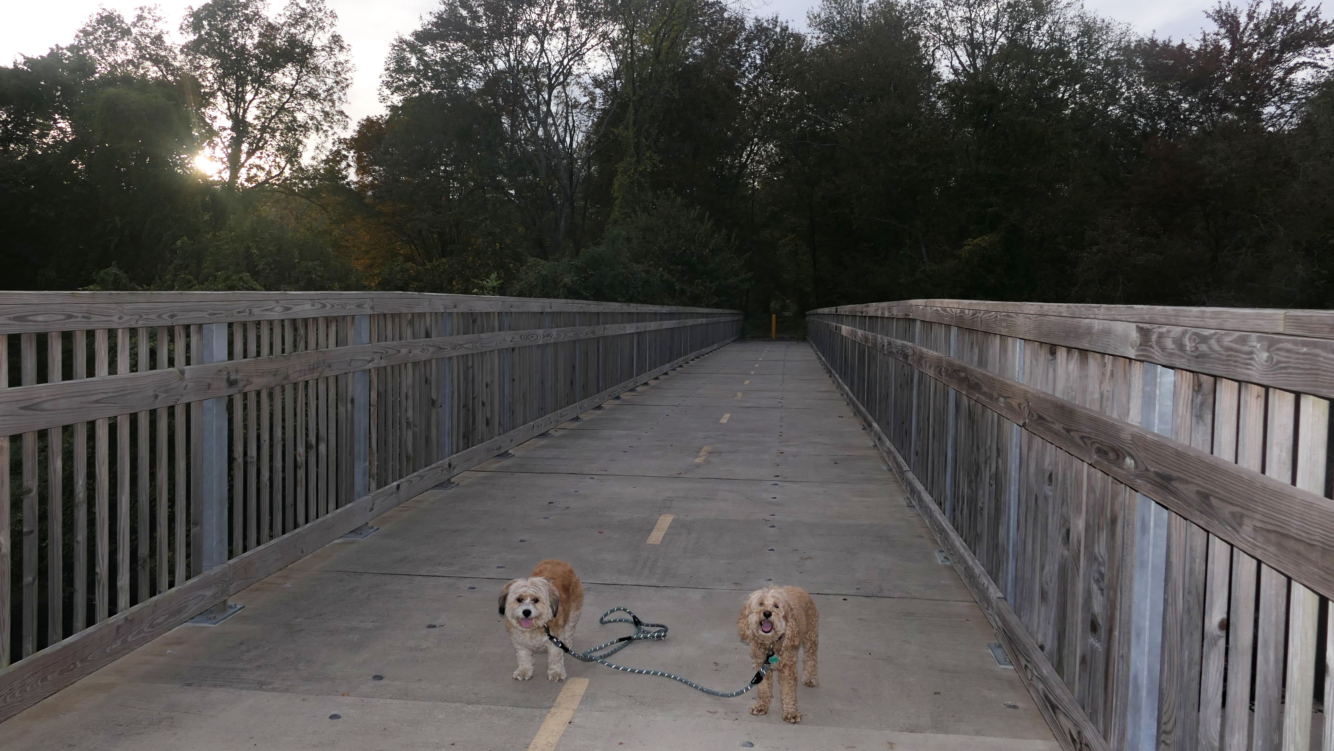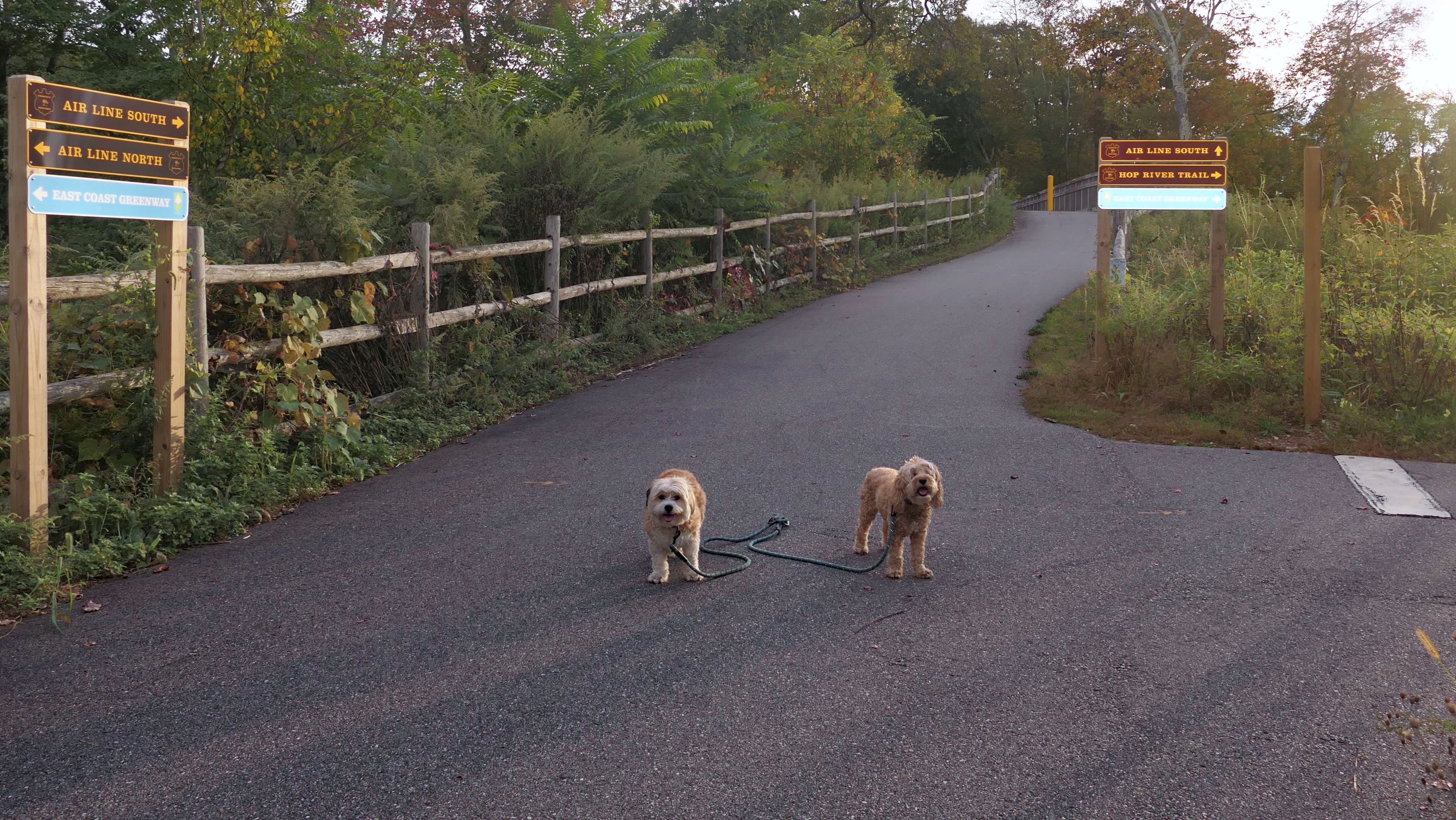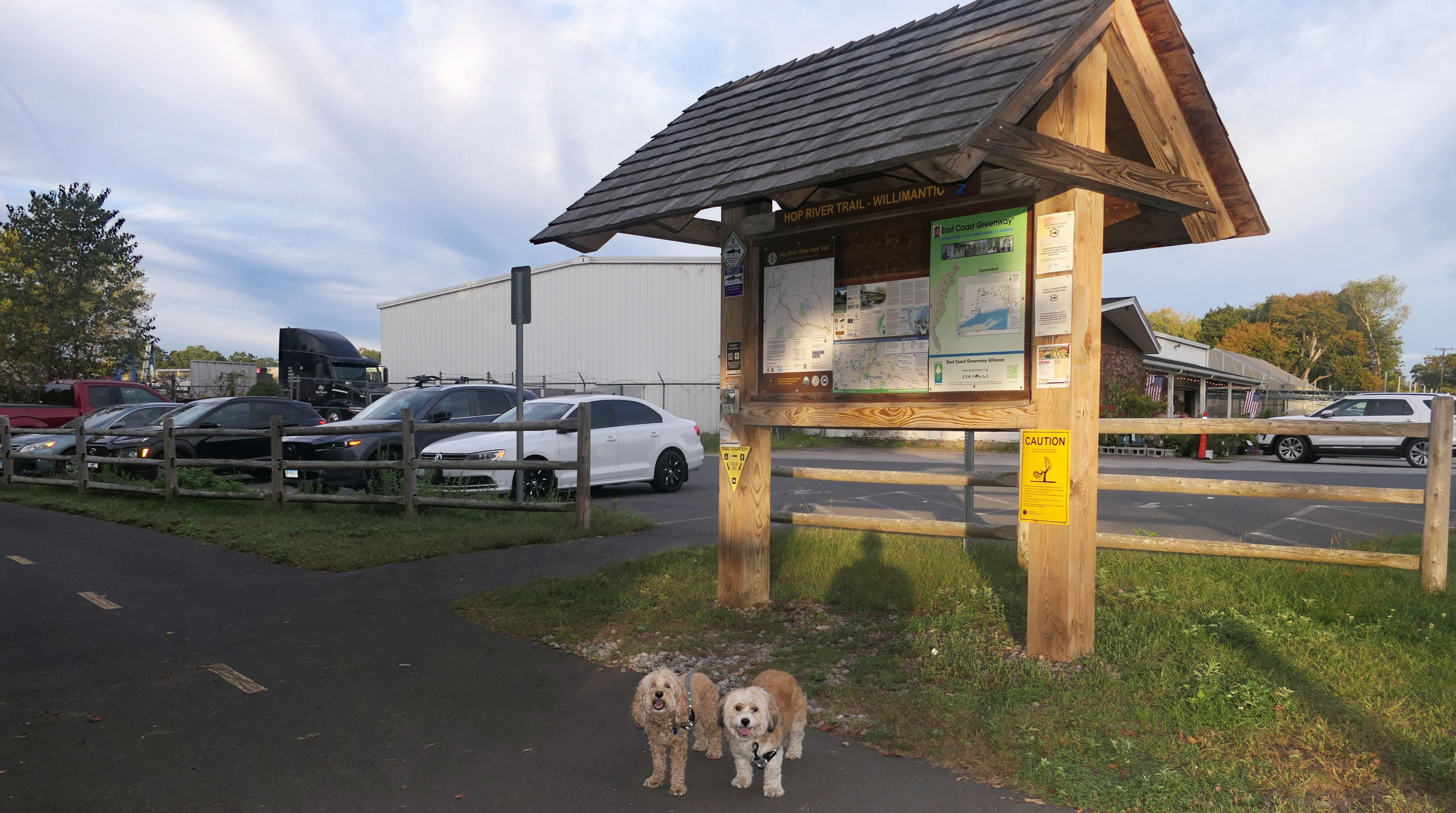This is the end of the Hop River Trail, at an intersection with the Air-Line Trail. We were here the day we completed the Hop River Trail. We came back a little over a year later and walked the portion of the Air Line trail that runs from Kingsley Road in Lebanon to Bridge Street in the downtown Willimantic section of Windham. There's a small gap at Bridge Street where the trail is routed on roads until it picks up again near the Frog Bridge. This entire section is paved, and there wasn't another soul on the trail, but there were people and dogs camped out in a tent near the Bridge Street parking lot. I believe they live there. We made another trip here in December, where we walked from North Windham Road to the Veteran's Memorial Greenway section. This section was adorned in pine trees. Later in December, we returned and walked the Veteran's Memorial Greenway section. It ends near the Frog Bridge. I tried to get a picture of the dogs in front of the bridge, but the sun was in the wrong place. I could only get one of the frogs visible in the photo. The next day, we finished the Windham portion of the trail, walking the section from Beaver Hill Road to Chewink Road in Chaplin.