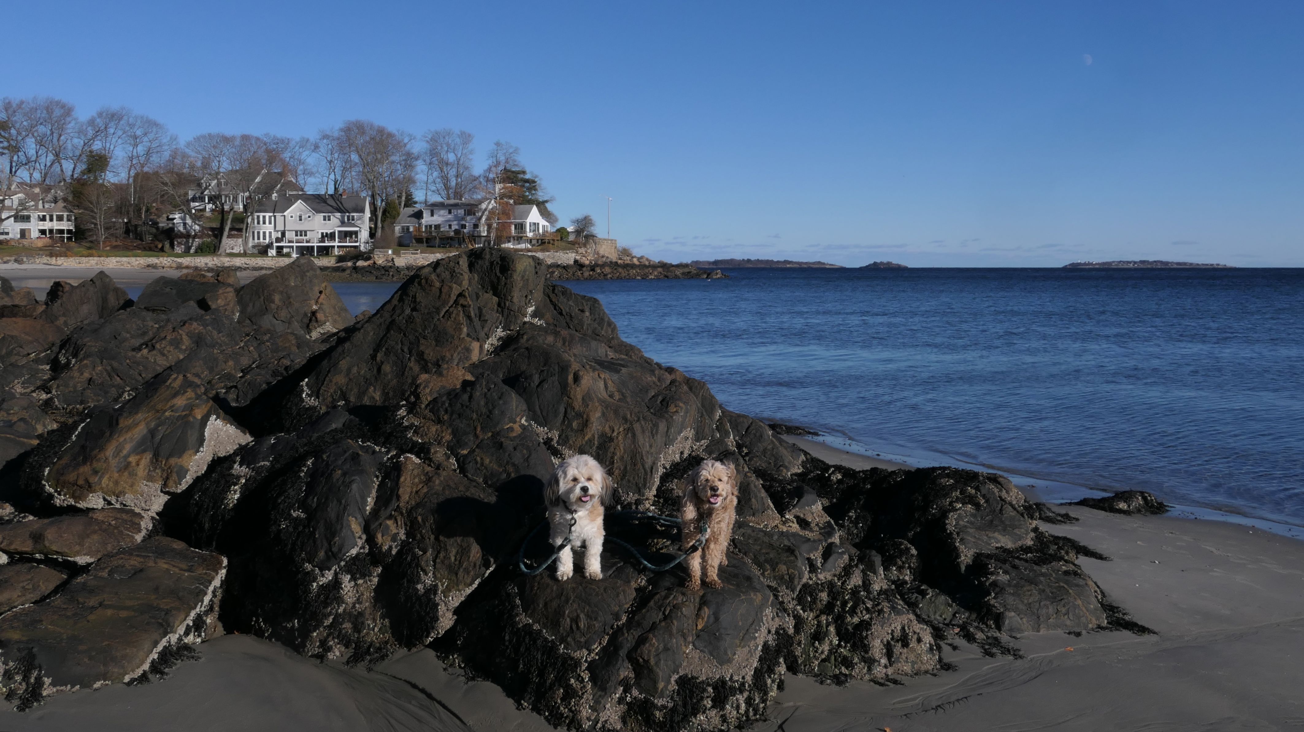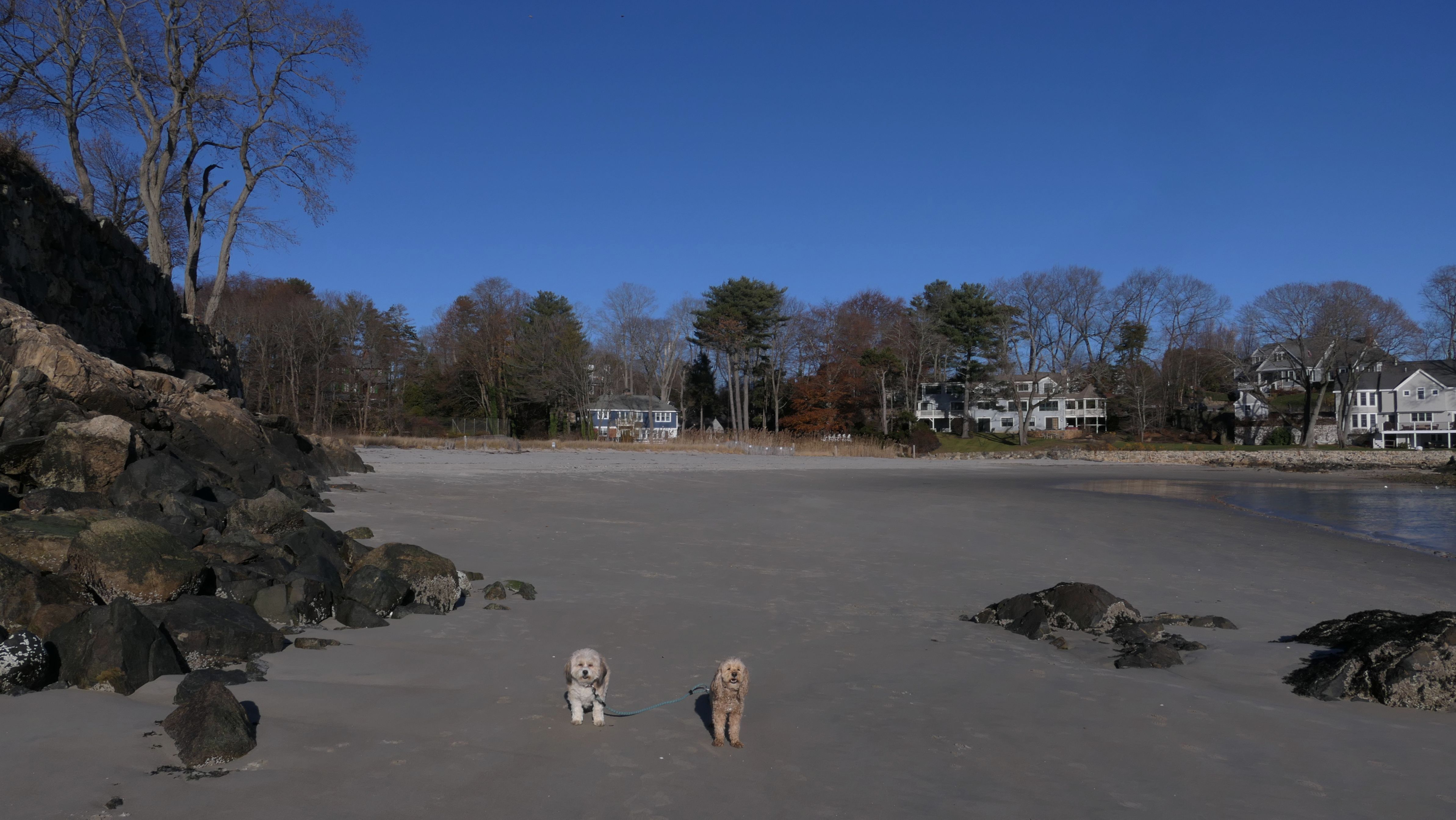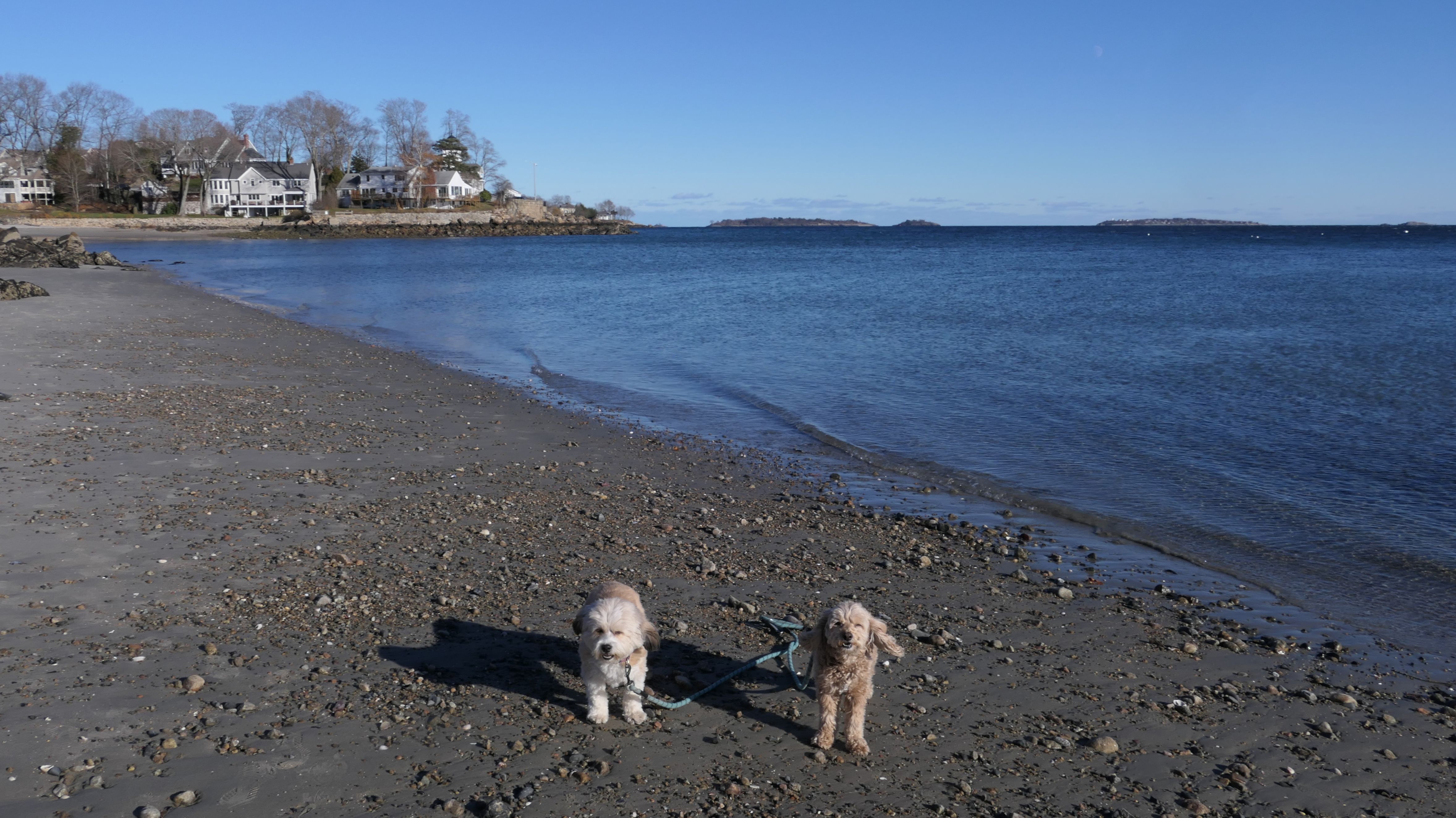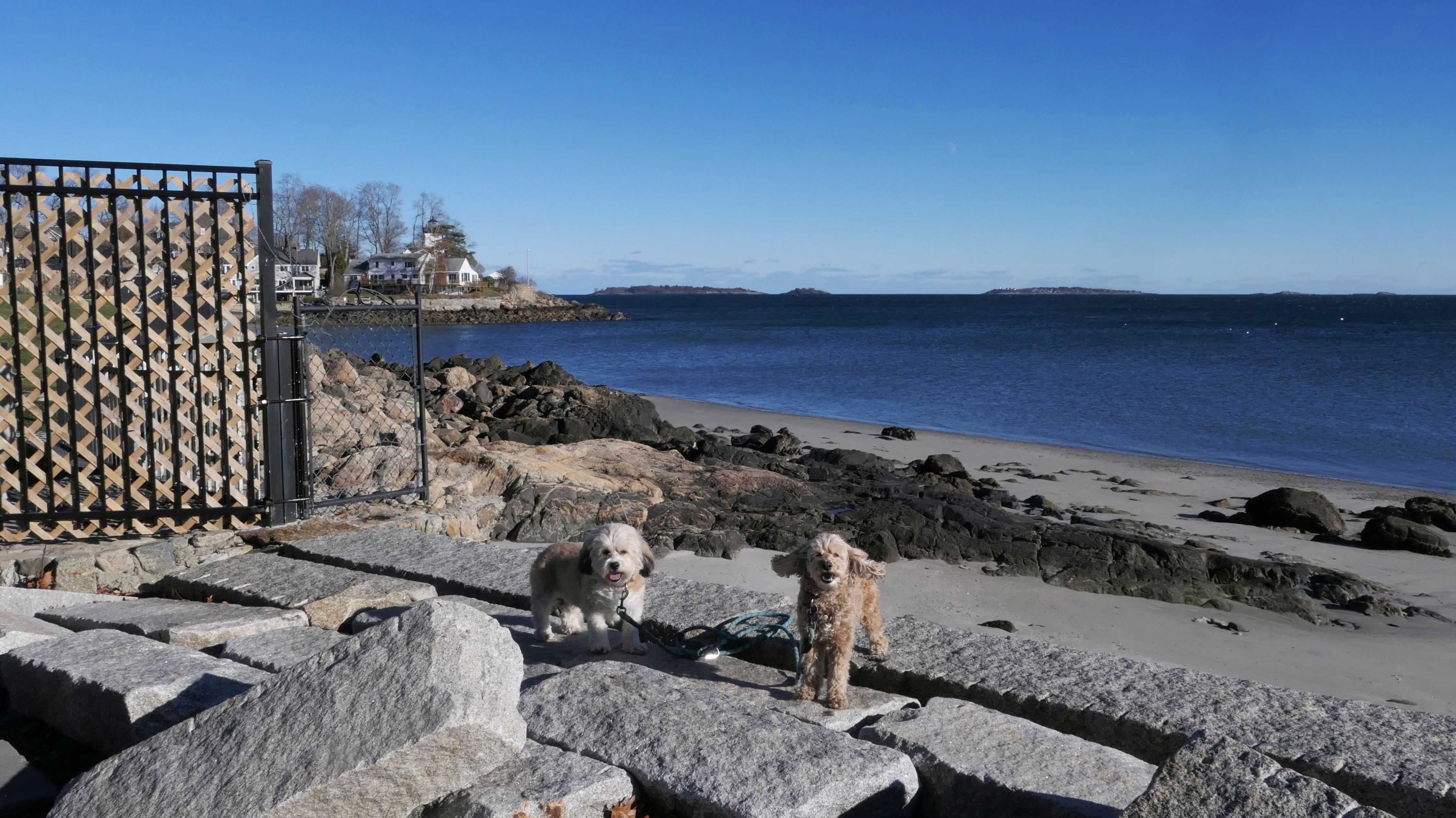 We walked here from Independence Park. There are a number of access points off Lothrop street, but not all of them go all the way down to the beach. Some end at a viewing level, with no access point to get down any further. Once we found an access point that went all the way down, we headed north along the beach until we reached the main beach area. We had to cross a rather large pile of rocks at one point. Once we reached the main beach, there were a few dogs running around off-leash, despite the sign indicating dogs must be leashed. This may be one of those "unofficial" off-leash dog areas. By the way, dogs are only allowed on the beach from the day after Labor Day to the day before Memorial (they are allowed during those times before 8AM and after 7:30PM). The beach opens out to a cove, so the waves are mild. You can look across the cove at Salem Willows Park, a place we visited earlier in the day.