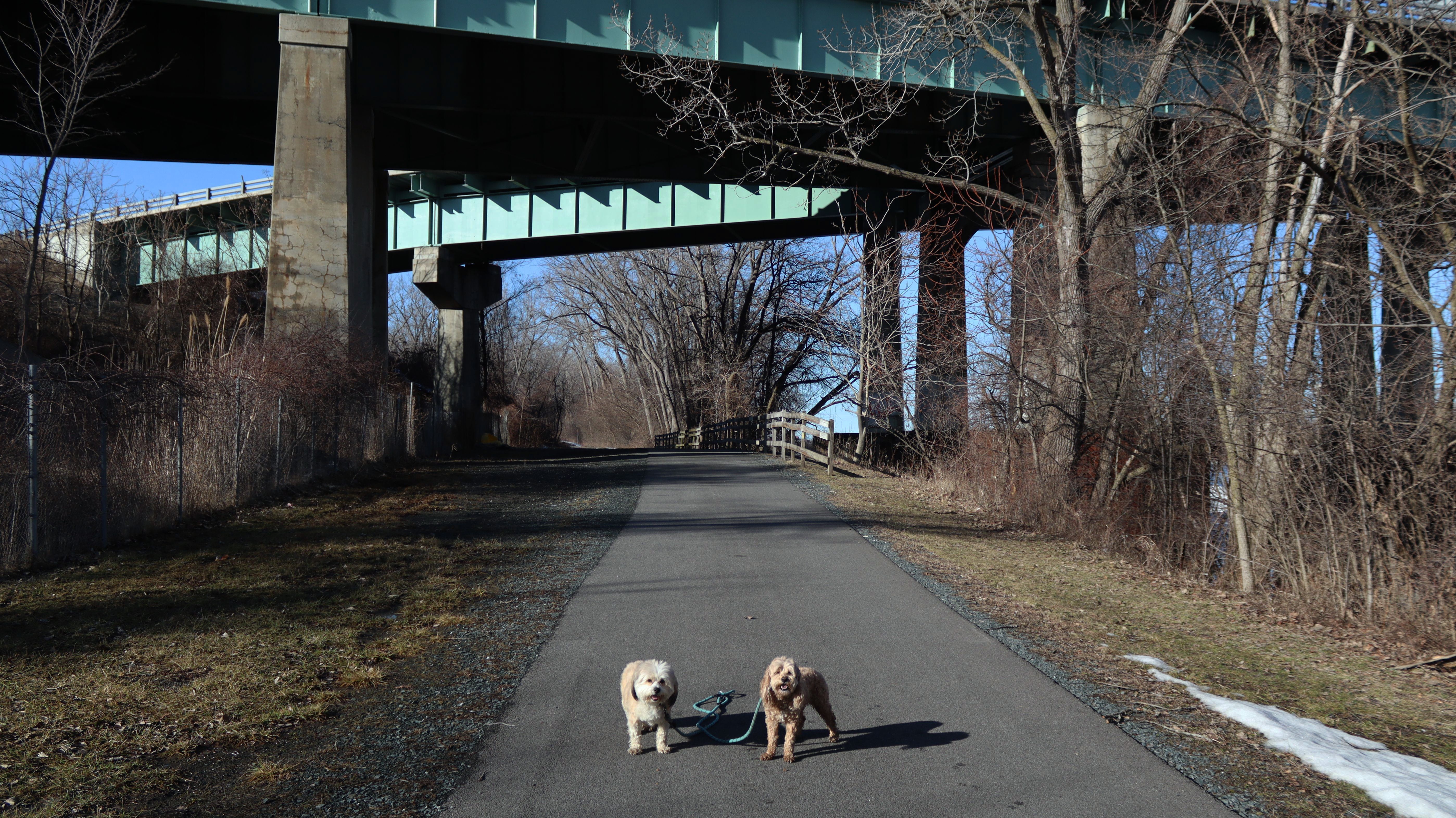 Looking at these pictures, it looks like we went to five different places. There are numerous varied landscapes here on these really interesting trails. We have some wide open fields, a busy stretch near a shopping area, a tree maze, a stretch that passes some farm land with cows grazing, and some wooded sections, along with a cool long bridge over some marsh land. The trails are mostly paved, and are very flat. We walked four miles here. My favorite part was when the trails passed by the small body of water that was named on my map, "The Lake". There is one picture of the dogs in front of the lake that featured ducks, geese, a turtle and even a visible fish in the water! We've been having a stretch of great weather lately, and this was no different. It was in the upper 70's here with low humidity. It is a good thing too, because with the lack of shade on much of these trails, this would have been a no-go if it was any warmer. This was a very fun visit on a beautiful day!