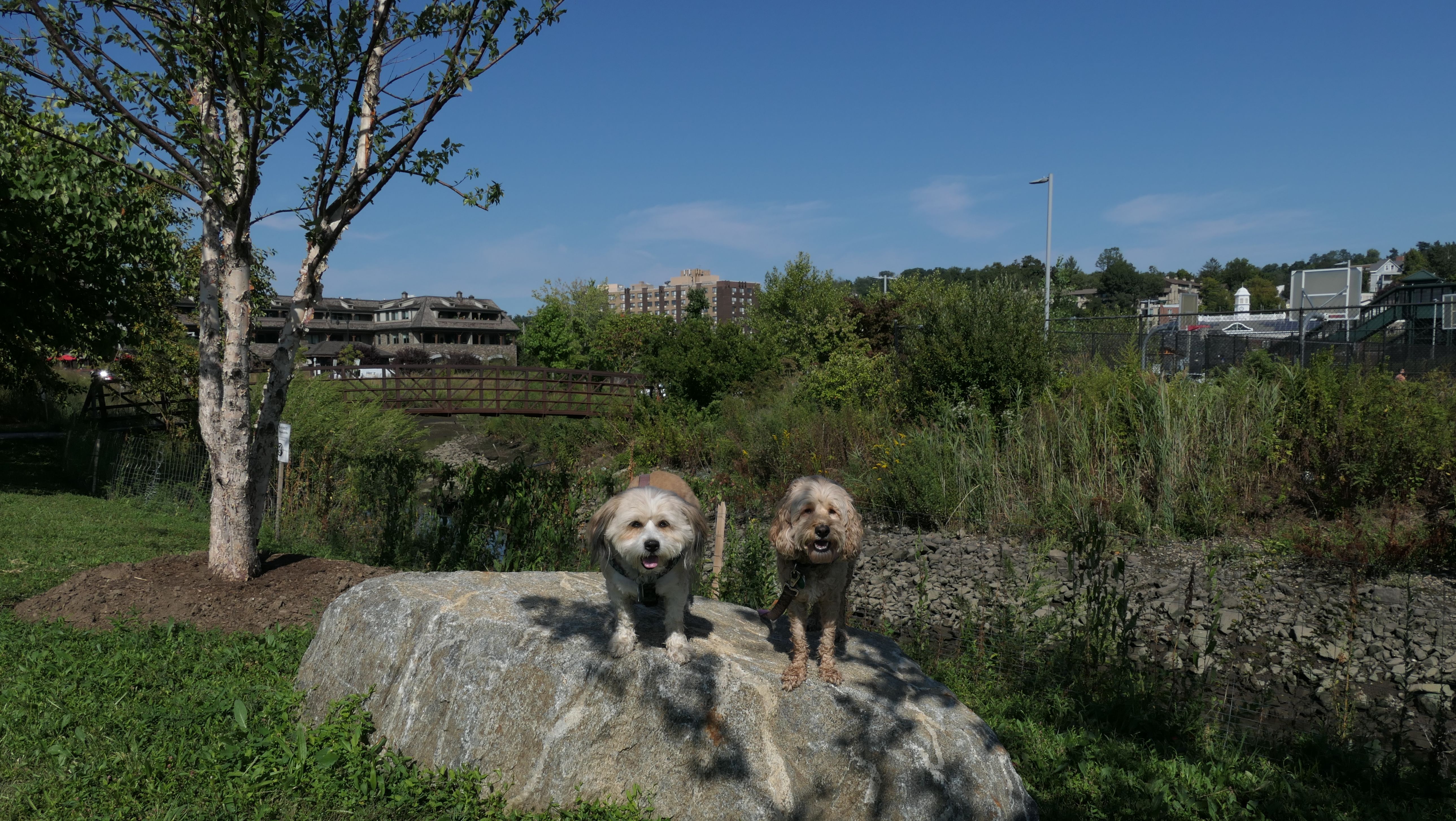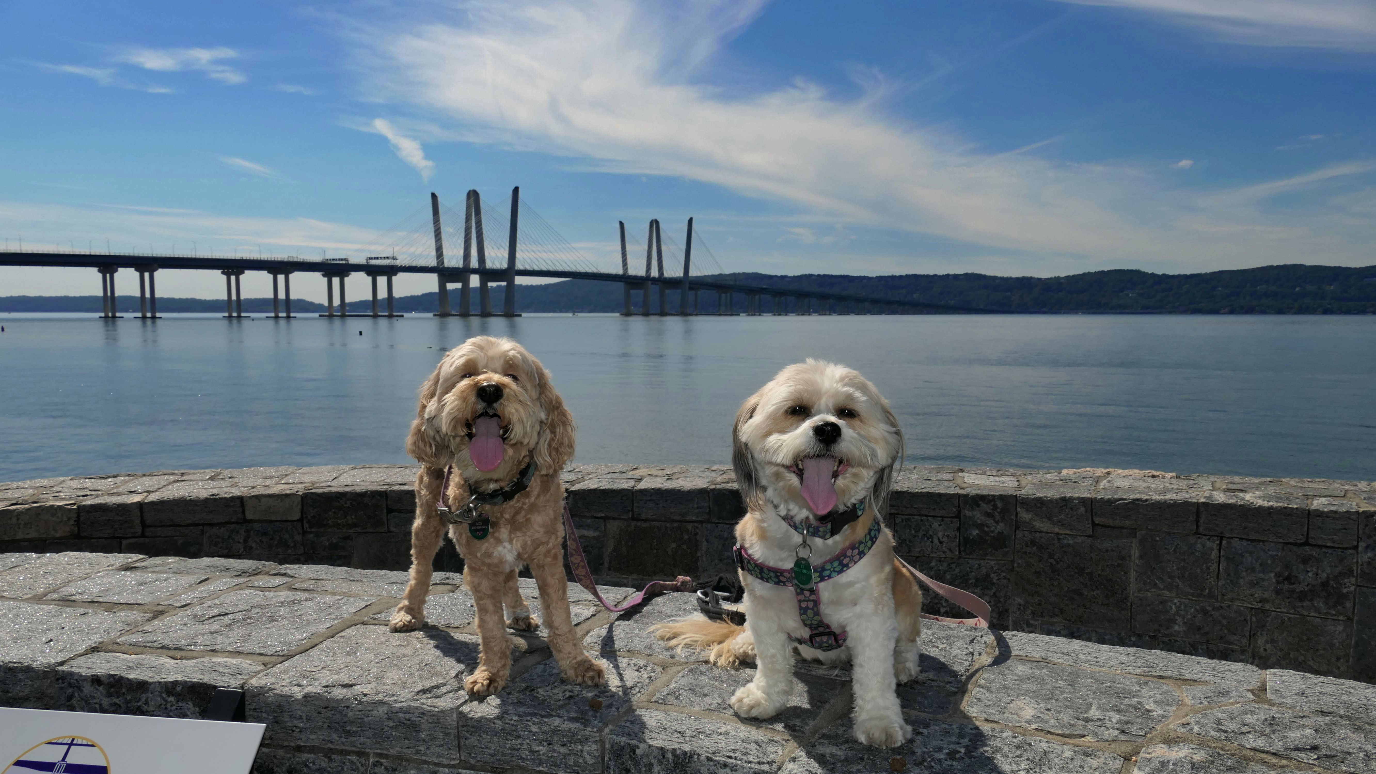We were headed to a place near here, called "Scenic Hudson Park". Unfortunately, when we arrived at that park, there were signs indicating that dogs weren't allowed. The Google AI search results were completely incorrect. At any rate, this park was nearby, and we were planning on visiting this one anyway. It's a small, dog friendly, but nice park, with great views of the Mario Cumomo bridge. Looking to the south, you can also see the New York City skyline in the hazy distance. The only issue is that it is on the small side. After looping the park, we headed to Downtown Irvington next.