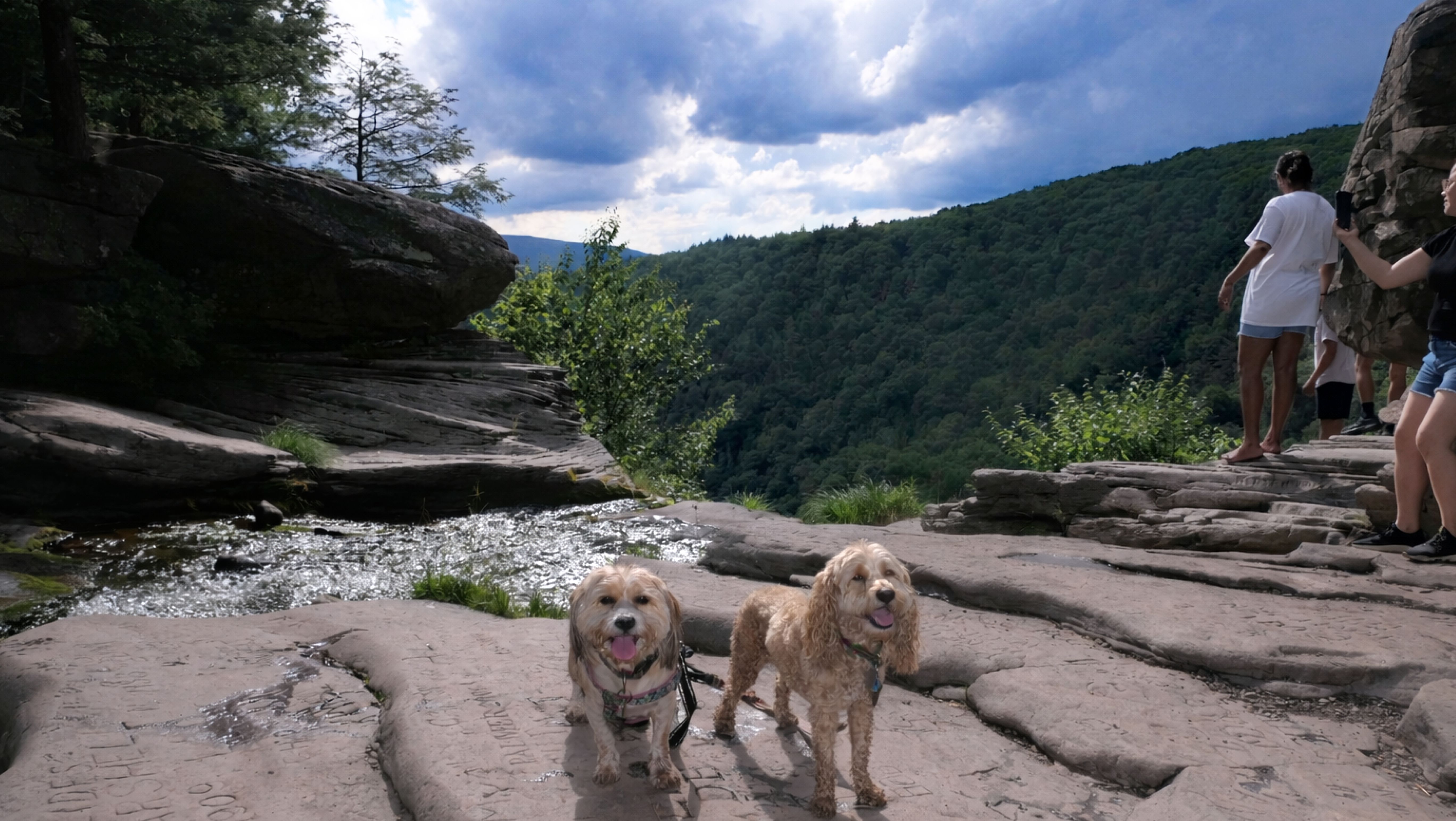 This place was packed. We were the last car they let enter the parking area. The adventure consisted of a hike to a viewing platform near the top of the waterfall, and then actually going to the top of the falls. This was a great spot that Mandy and Lexi went into the water and cooled off right away on a very warm and muggy day. After that, we hiked down a trail featuring a very long stone staircase to the bottom of the falls. We took some photos from the bottom. The waterfall is big, and it wasn't possible to take a photo of the dogs in front of the whole thing. It was hard to take photos in general, because the place was crowded, the terrain was narrow and rocky, and the sun would come and go changing the lighting. (Here is a picture of the waterfall without the dogs). The waterfall had multiple levels and people were swimming in the pools at every level. We didn't actually go to the middle level. The route there looked pretty rugged. We climbed back up the stairs after exploring the bottom for a bit. My Apple Watch reported that we climbed 580 feet, which is a new record for us. Needless to say, we were tired after the climb! This was a good workout, but I wish we did this trip on a cooler day, maybe in the middle of the week, instead of a holiday weekend, when there would be less people.