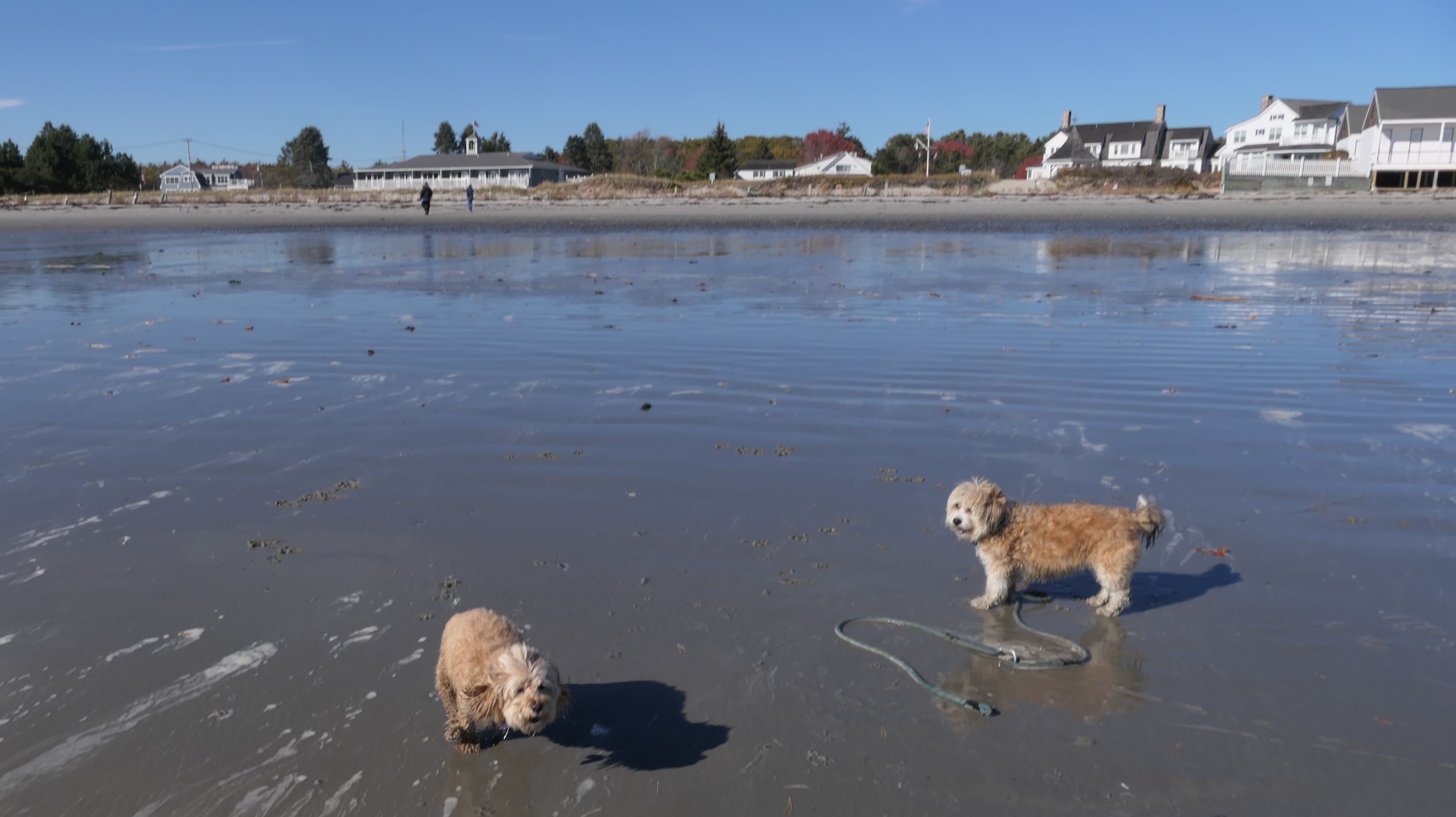 This is a pretty decent beach, located in Kennebunk Maine. Dogs are allowed before 9AM and after 5PM from June 15th to Labor Day, and allowed any time outside of those dates. They also only need to be under voice control, and don't need to be on a leash. We started by the rocky area on the west end of the beach, and made our way to the Kennebunk River breachway on the east end. The whole thing is about a mile long. On our way back, the dogs played a bit off-leash. Lexi always loves running on the beach! It was low tide, but there were still some pretty nice waves. There was a number of surfers taking advantage of them. This beach kind of reminds me of Easton's Beach in Newport. It's sort of the same shape, tucked in a cove but with nice waves. This was a pleasant beach walk on a sunny autumn afternoon.