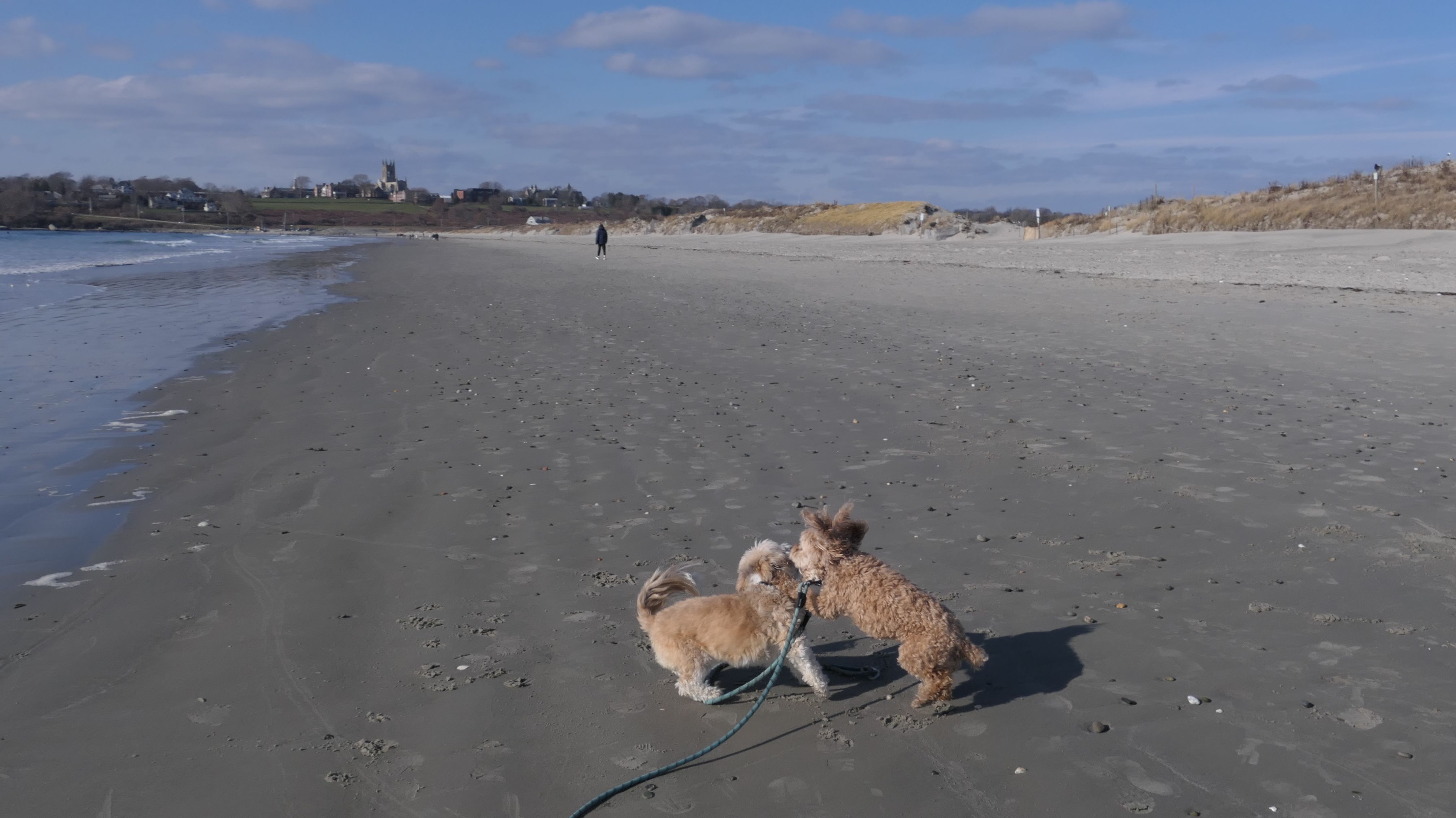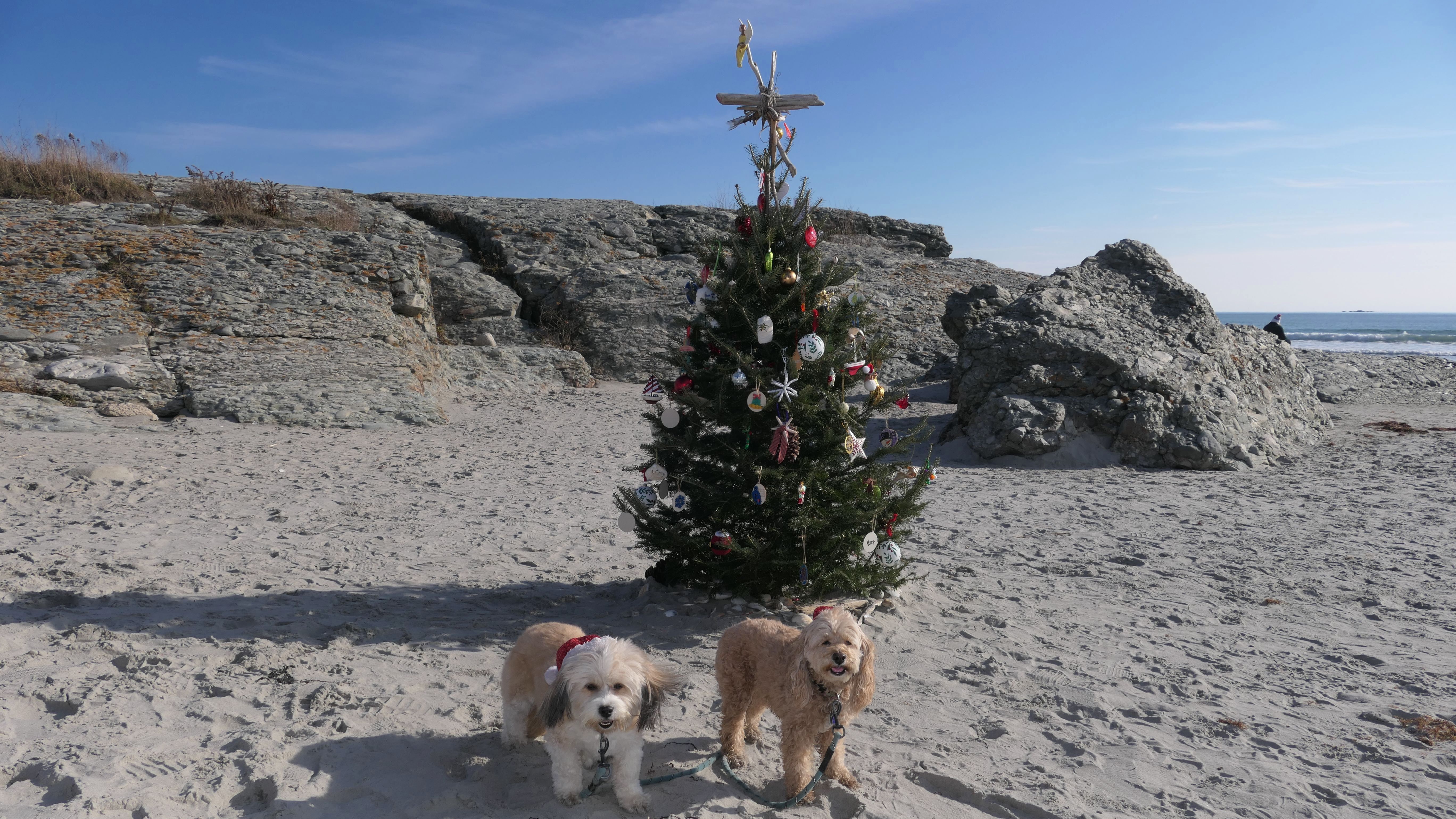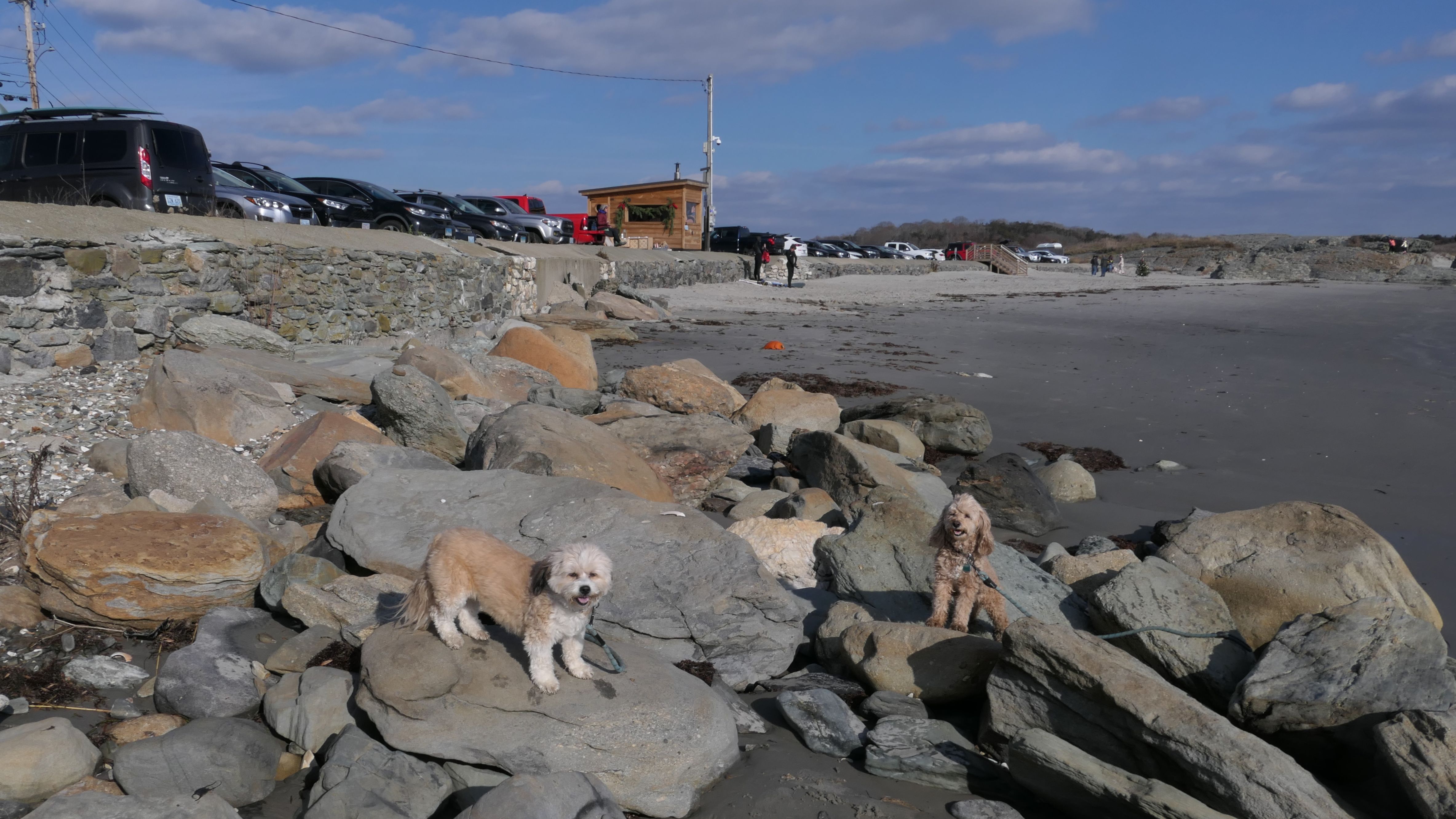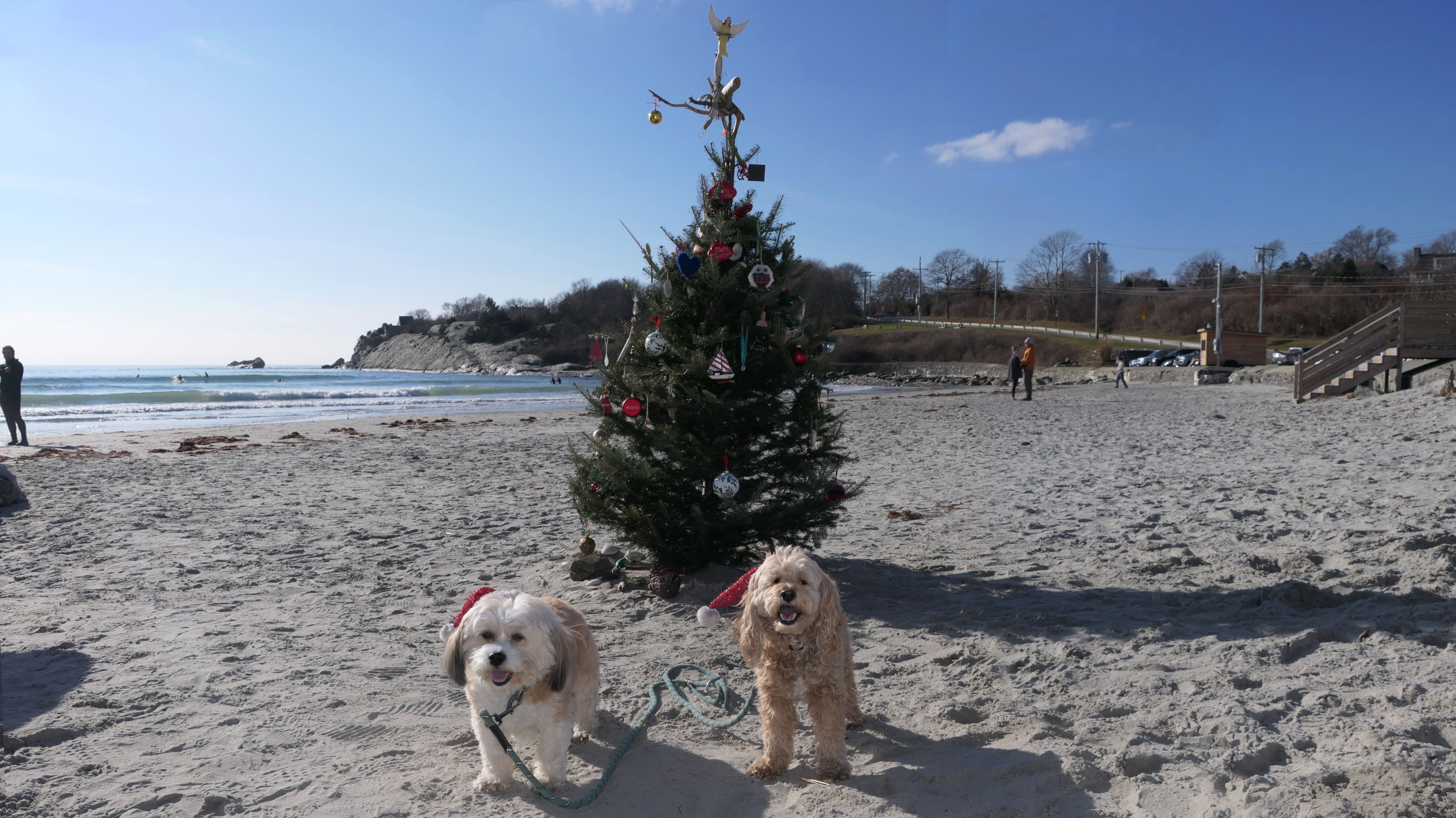 We seem to find ourselves at this beach every fall. Technically, it was still fall for this visit, but lately it has felt much more like winter. Every year they put up a decorated Christmas tree on the sand, and this time we came prepared with our Santa hats. Nothing says “Christmas in Rhode Island” quite like a tree on the beach with surfers in the background. Despite the season, it was a pleasant morning, with temperatures in the mid-40s. The bright sun and lack of wind made it feel warmer than it was. Apparently warm enough for some people to be in bathing suits—thanks to the “Small Wave Sauna” set up on the beach. A group of what looked like college-age kids rotated between the sauna and quick plunges in the ocean. We walked the length of the beach and back, and even though there were plenty of other dog walkers around, we were able to find a vacant spot on the beach where Mandy and Lexi even got a few minutes off-leash to run and play. We followed the path over to the Second Beach Campground and also walked up the road toward St. George's School. All in all, it turned out to be a really nice December adventure.