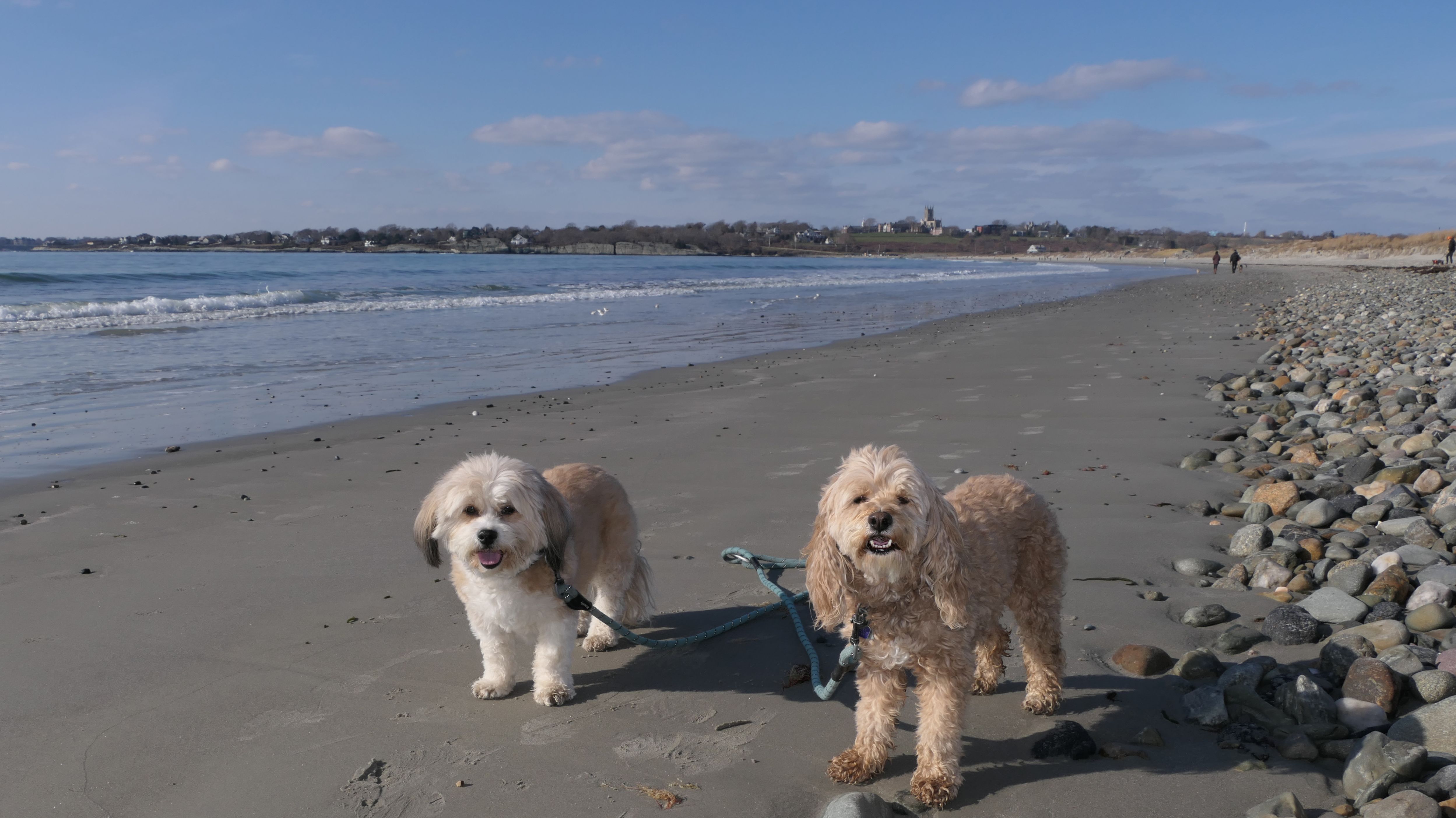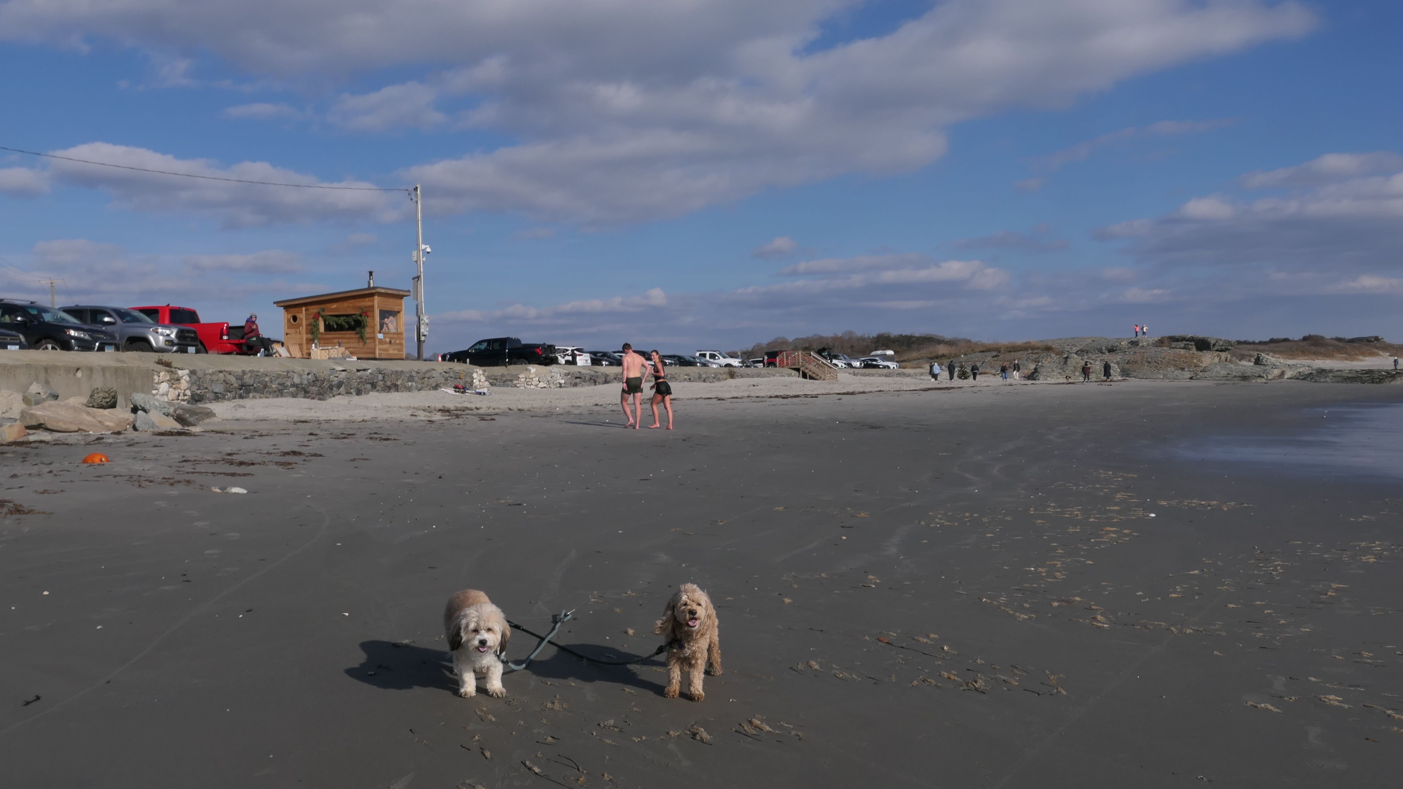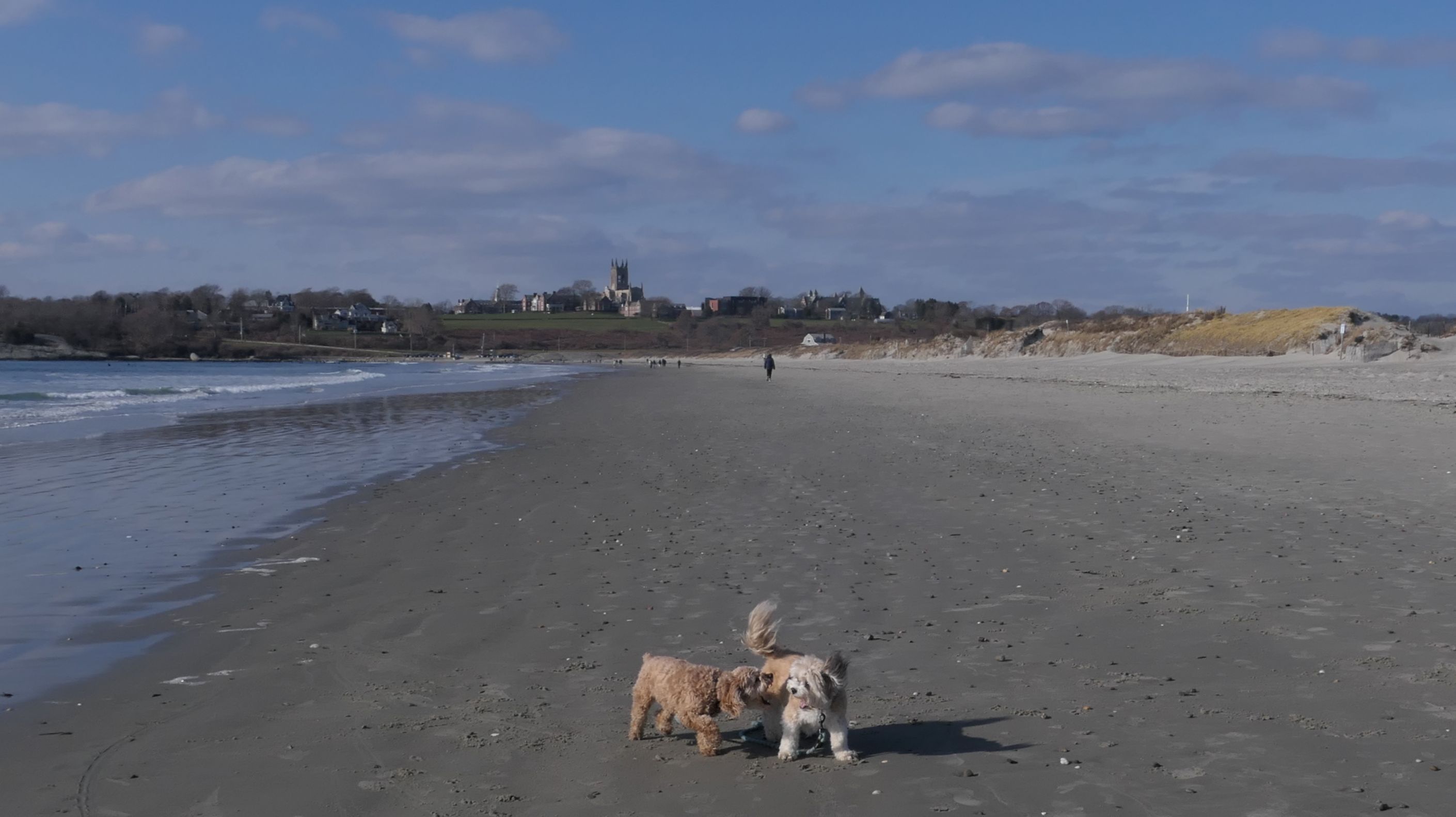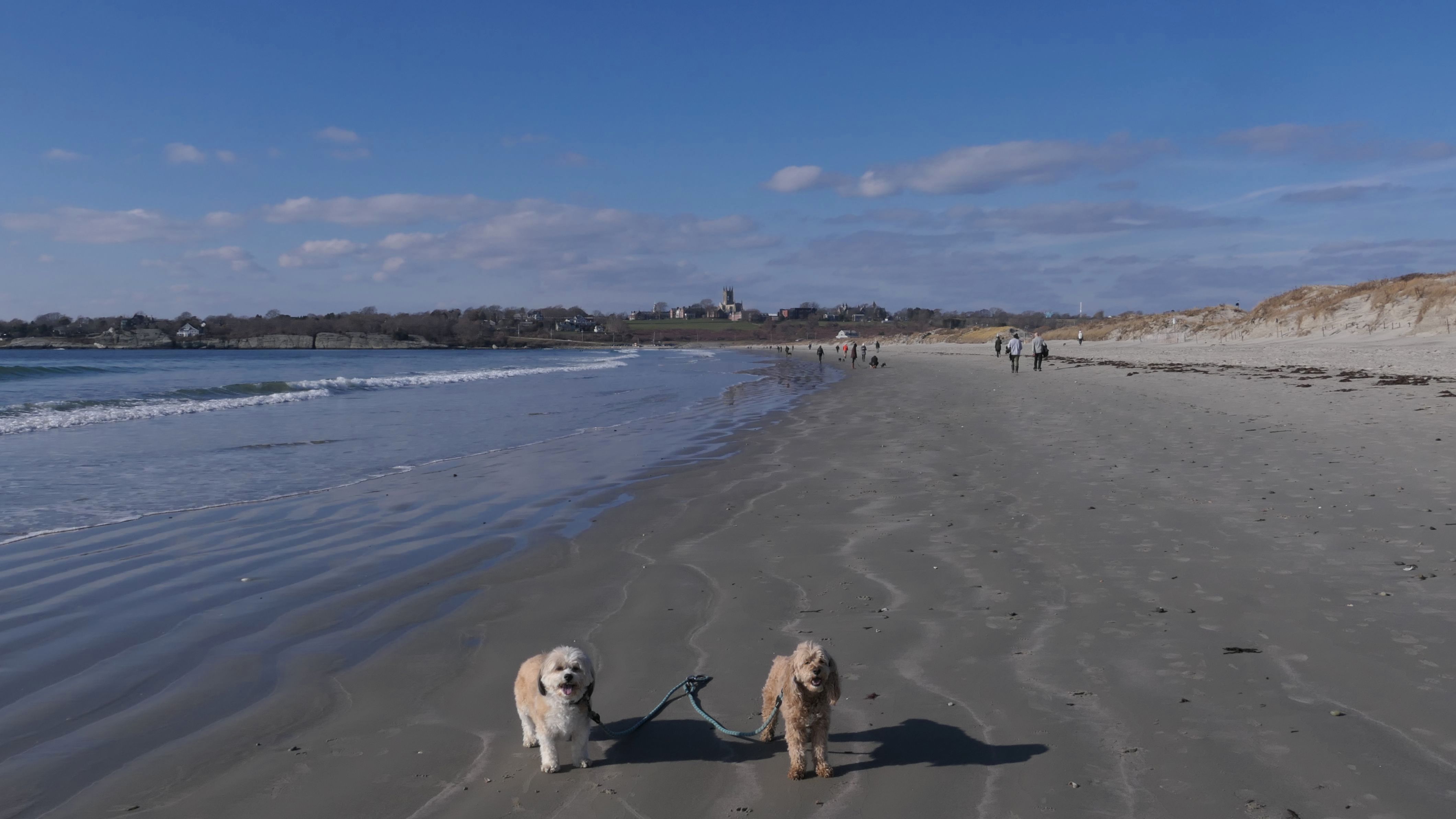 We seem to find ourselves at this beach every fall. Technically, it was still fall for this visit, but lately it has felt much more like winter. Every year they put up a decorated Christmas tree on the sand, and this time we came prepared with our Santa hats. Nothing says “Christmas in Rhode Island” quite like a tree on the beach with surfers in the background. Despite the season, it was a pleasant morning, with temperatures in the mid-40s. The bright sun and lack of wind made it feel warmer than it was. Apparently warm enough for some people to be in bathing suits—thanks to the “Small Wave Sauna” set up on the beach. A group of what looked like college-age kids rotated between the sauna and quick plunges in the ocean. We walked the length of the beach and back, and even though there were plenty of other dog walkers around, we were able to find a vacant spot on the beach where Mandy and Lexi even got a few minutes off-leash to run and play. We followed the path over to the Second Beach Campground and also walked up the road toward St. George's School. All in all, it turned out to be a really nice December adventure.