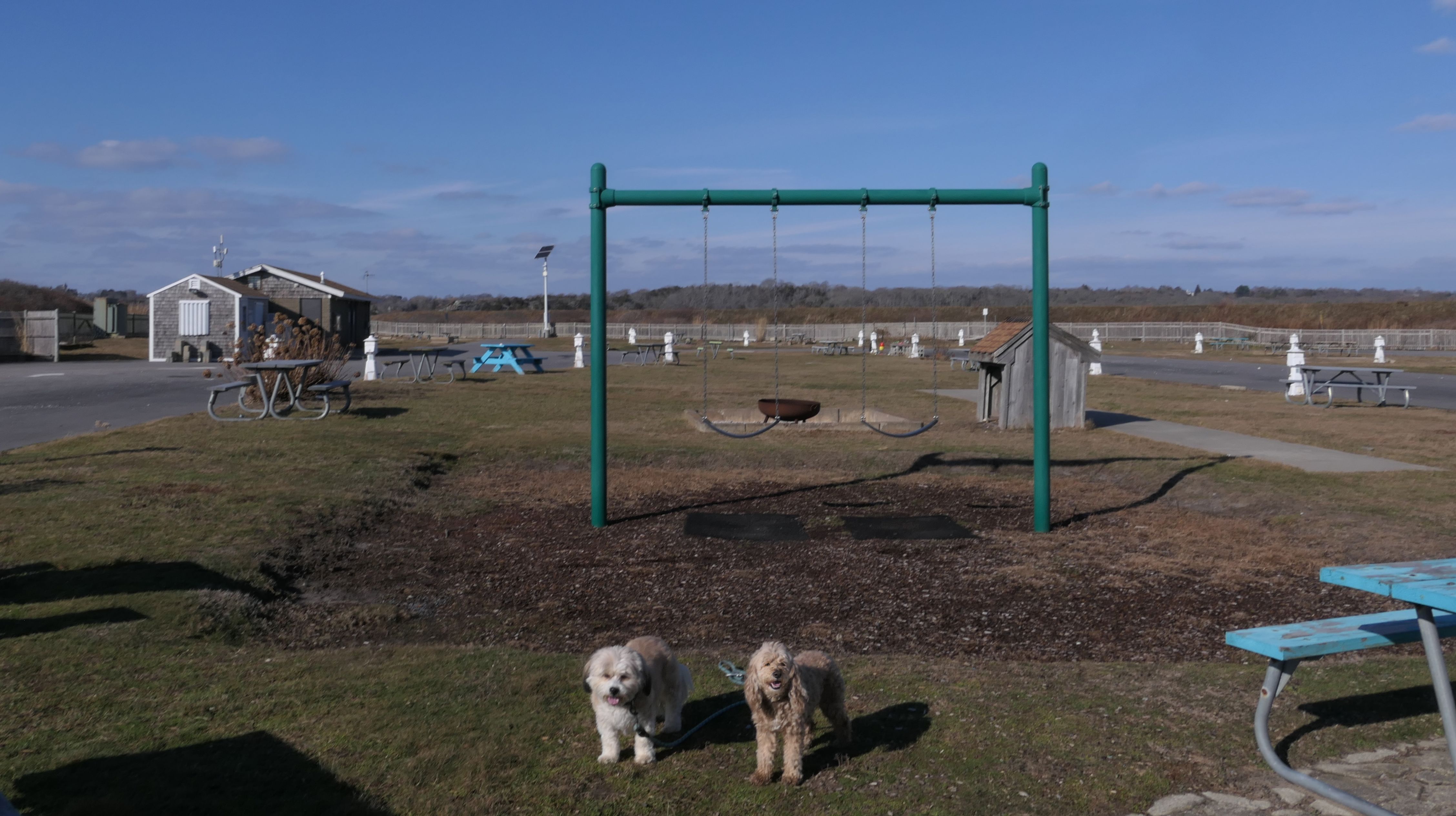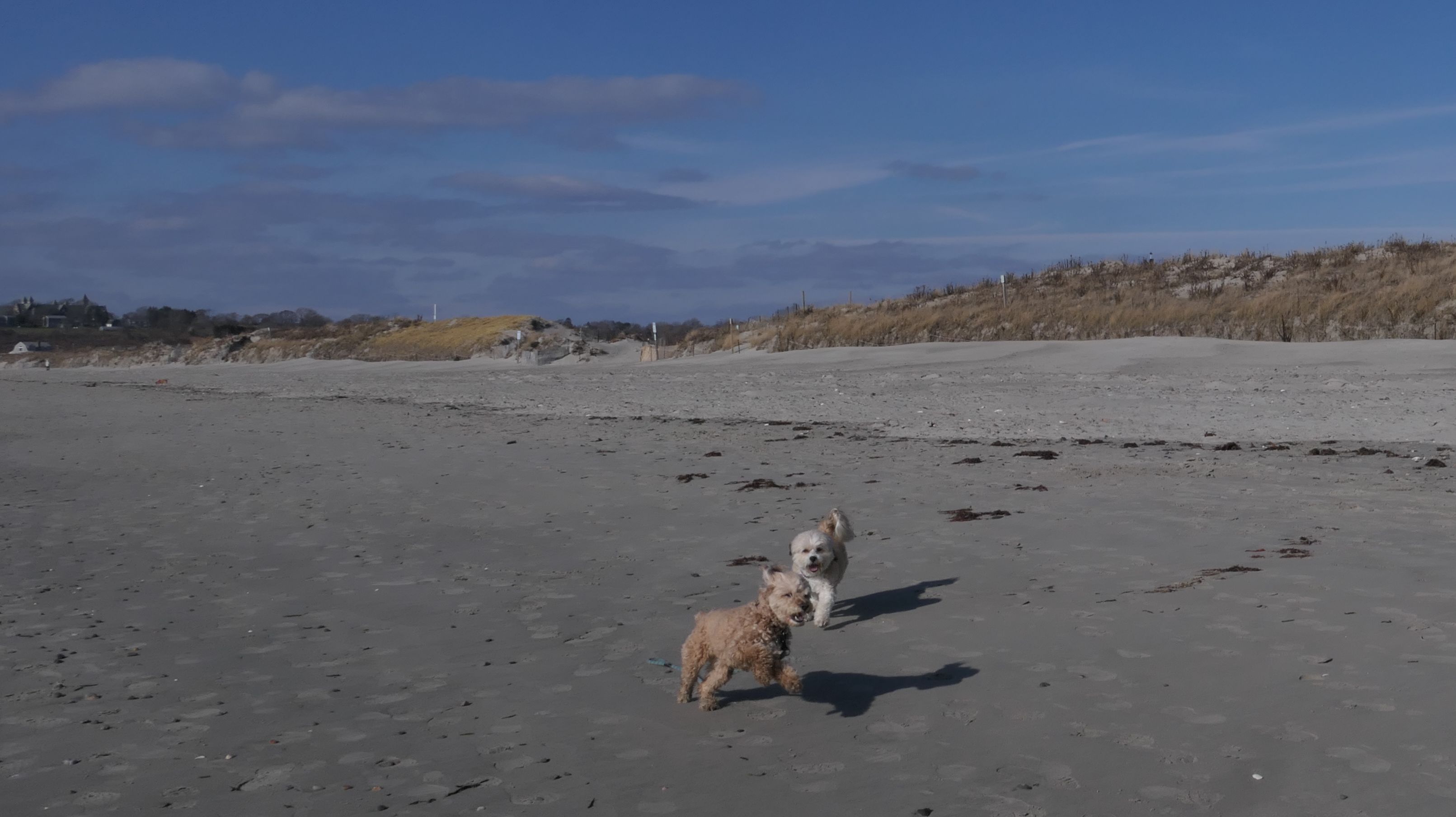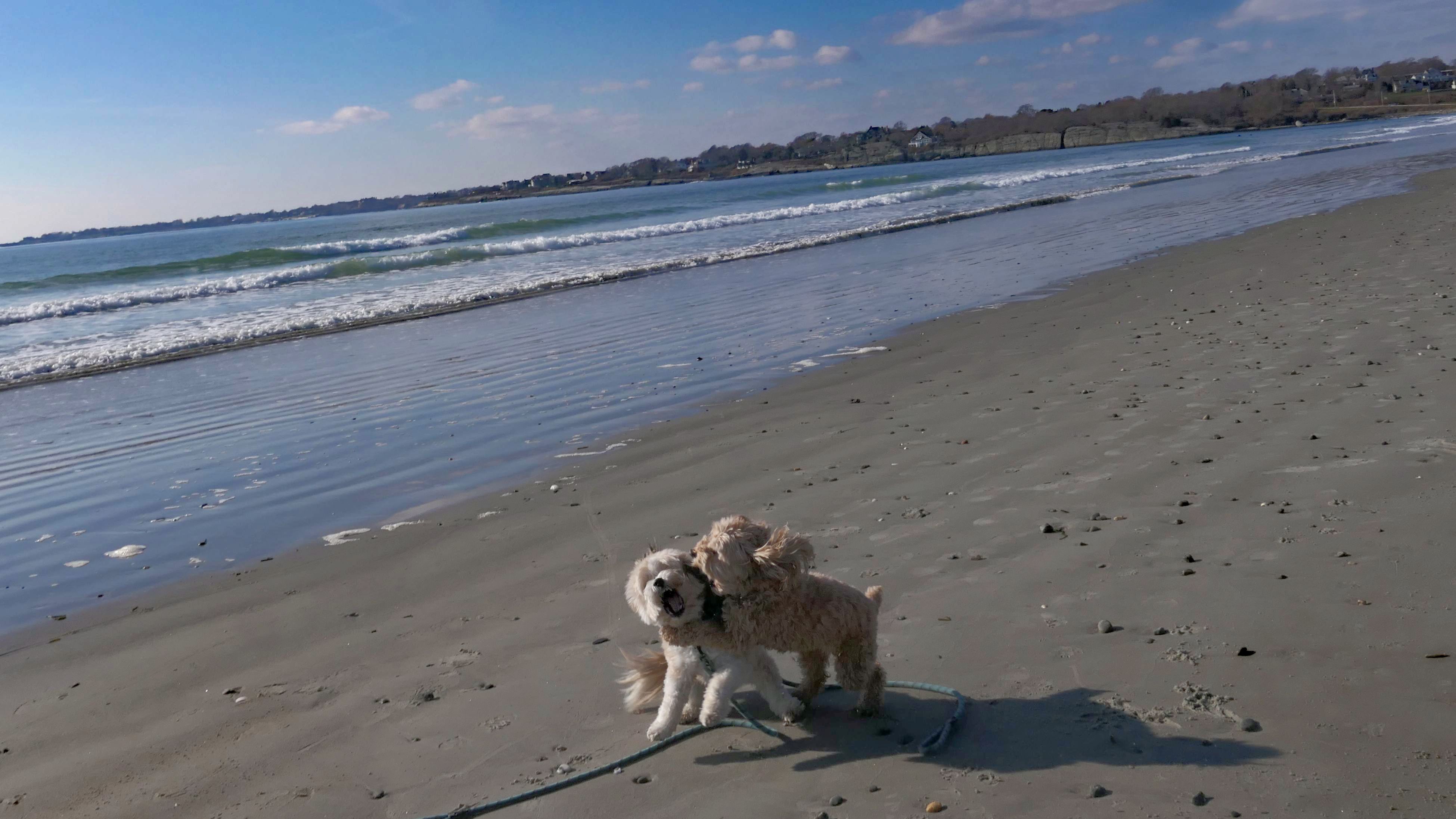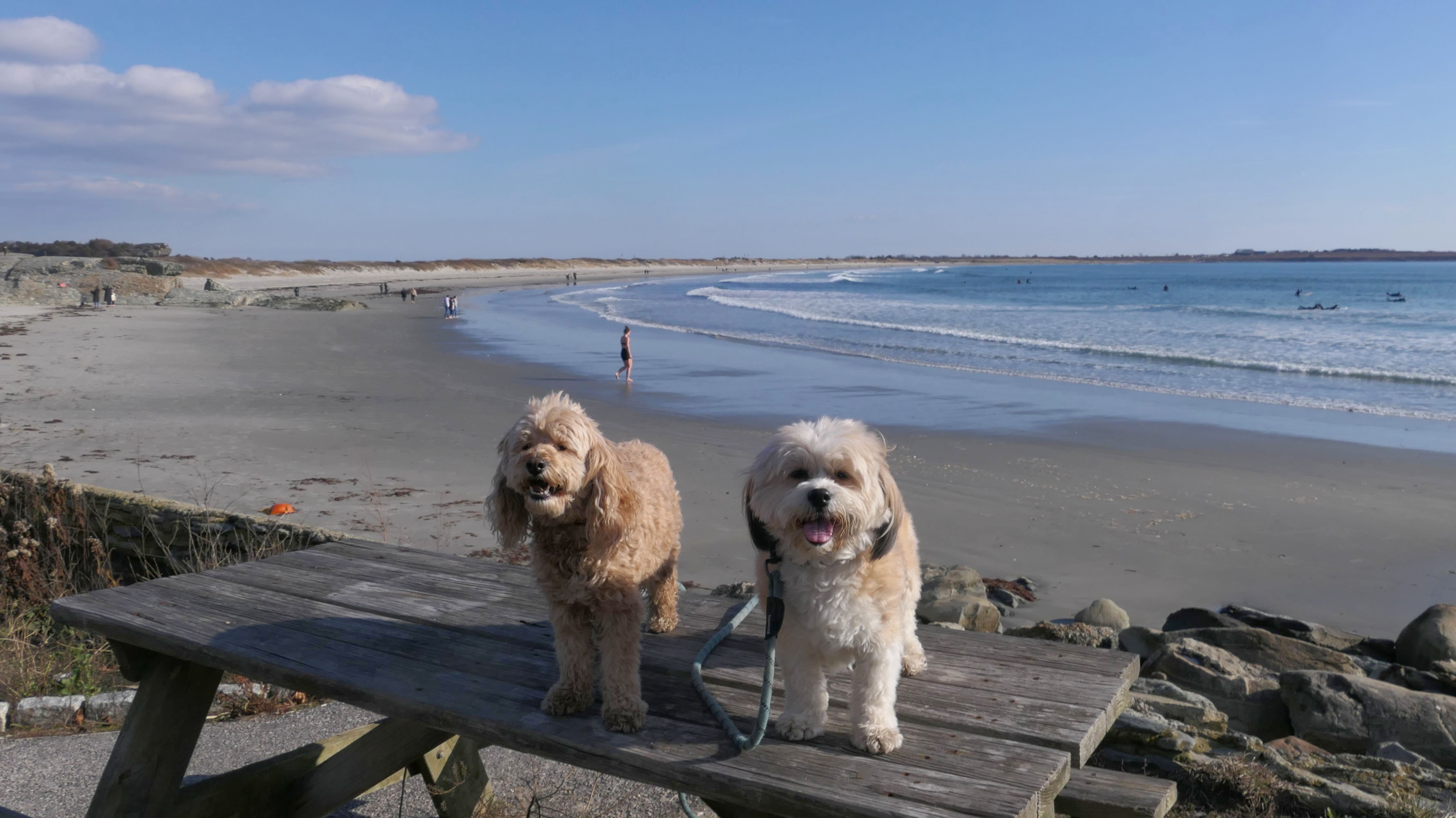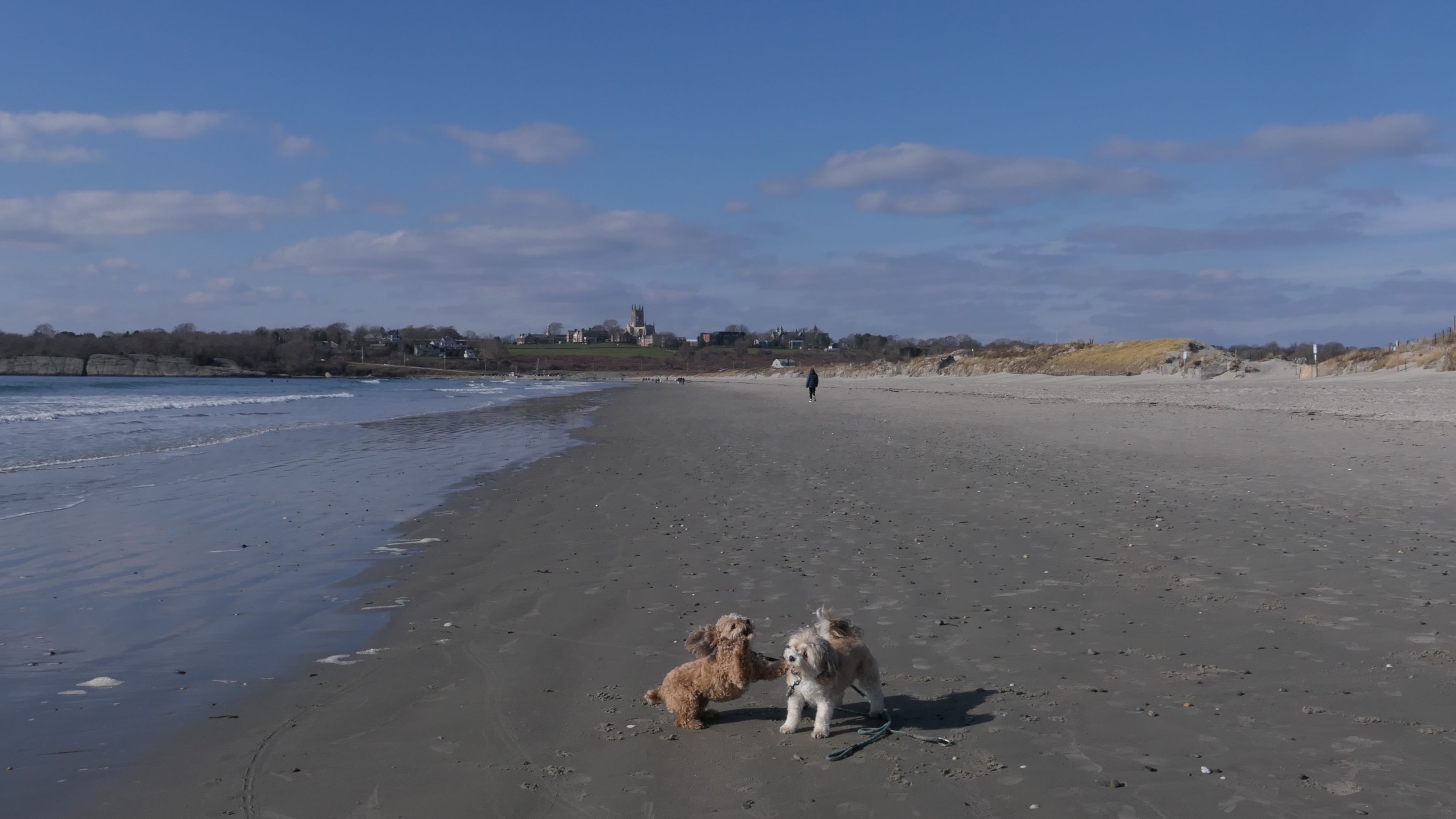 We seem to find ourselves at this beach every fall. Technically, it was still fall for this visit, but lately it has felt much more like winter. Every year they put up a decorated Christmas tree on the sand, and this time we came prepared with our Santa hats. Nothing says “Christmas in Rhode Island” quite like a tree on the beach with surfers in the background. Despite the season, it was a pleasant morning, with temperatures in the mid-40s. The bright sun and lack of wind made it feel warmer than it was. Apparently warm enough for some people to be in bathing suits—thanks to the “Small Wave Sauna” set up on the beach. A group of what looked like college-age kids rotated between the sauna and quick plunges in the ocean. We walked the length of the beach and back, and even though there were plenty of other dog walkers around, we were able to find a vacant spot on the beach where Mandy and Lexi even got a few minutes off-leash to run and play. We followed the path over to the Second Beach Campground and also walked up the road toward St. George's School. All in all, it turned out to be a really nice December adventure.