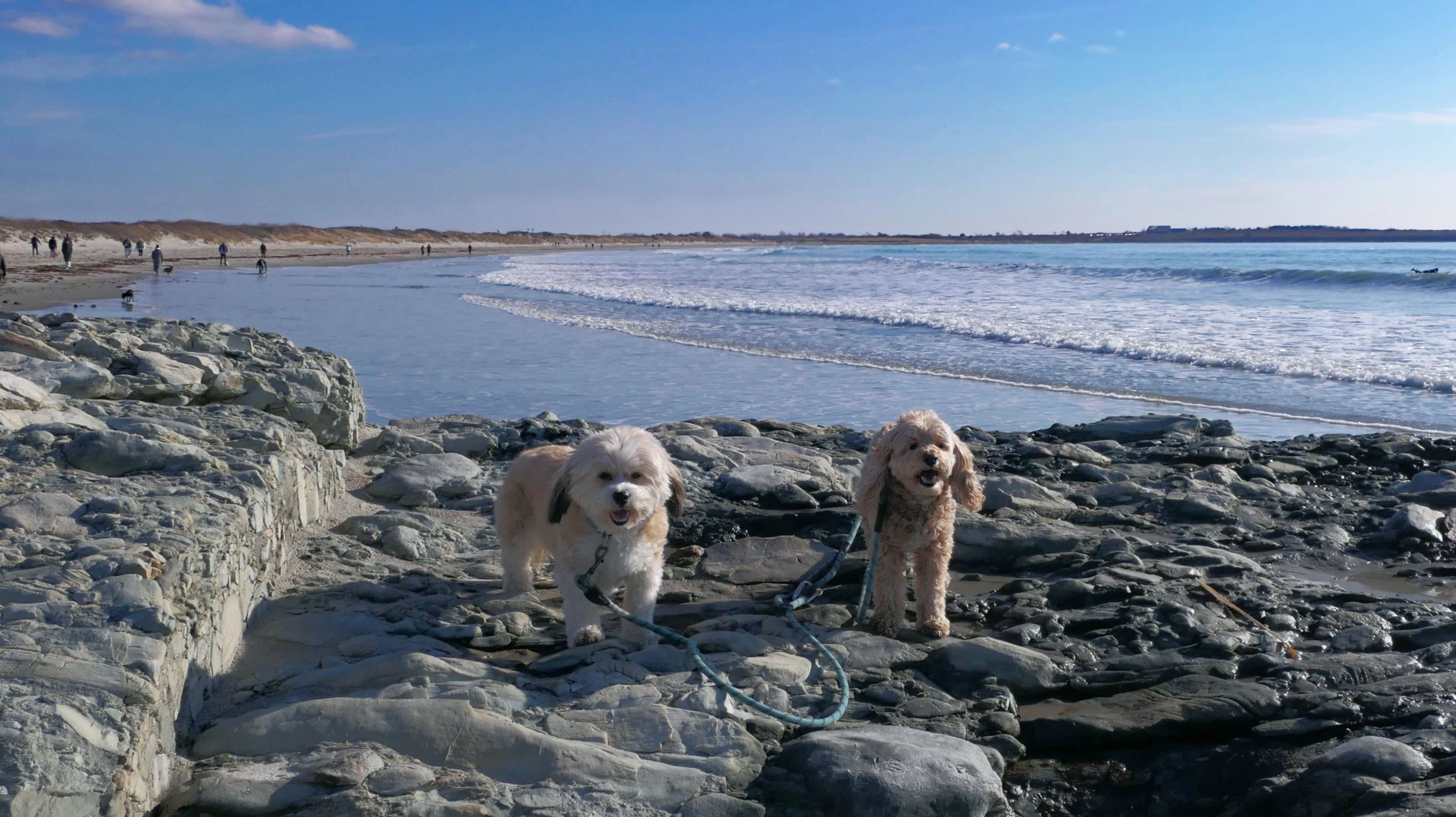 We visited this beach immediately after visiting Sachuest Beach (Second Beach). It was about a minute drive away on the other side of the little peninsula. This beach faces east and opens up to a cove, so the waves are much milder than on Second Beach. It was also much less windy here. This beach is smaller as well, maybe half the size. We also encountered the horseback riders here as well. I'm not sure Mandy and Lexi understand horses all that much! I think they think they are giant dogs!