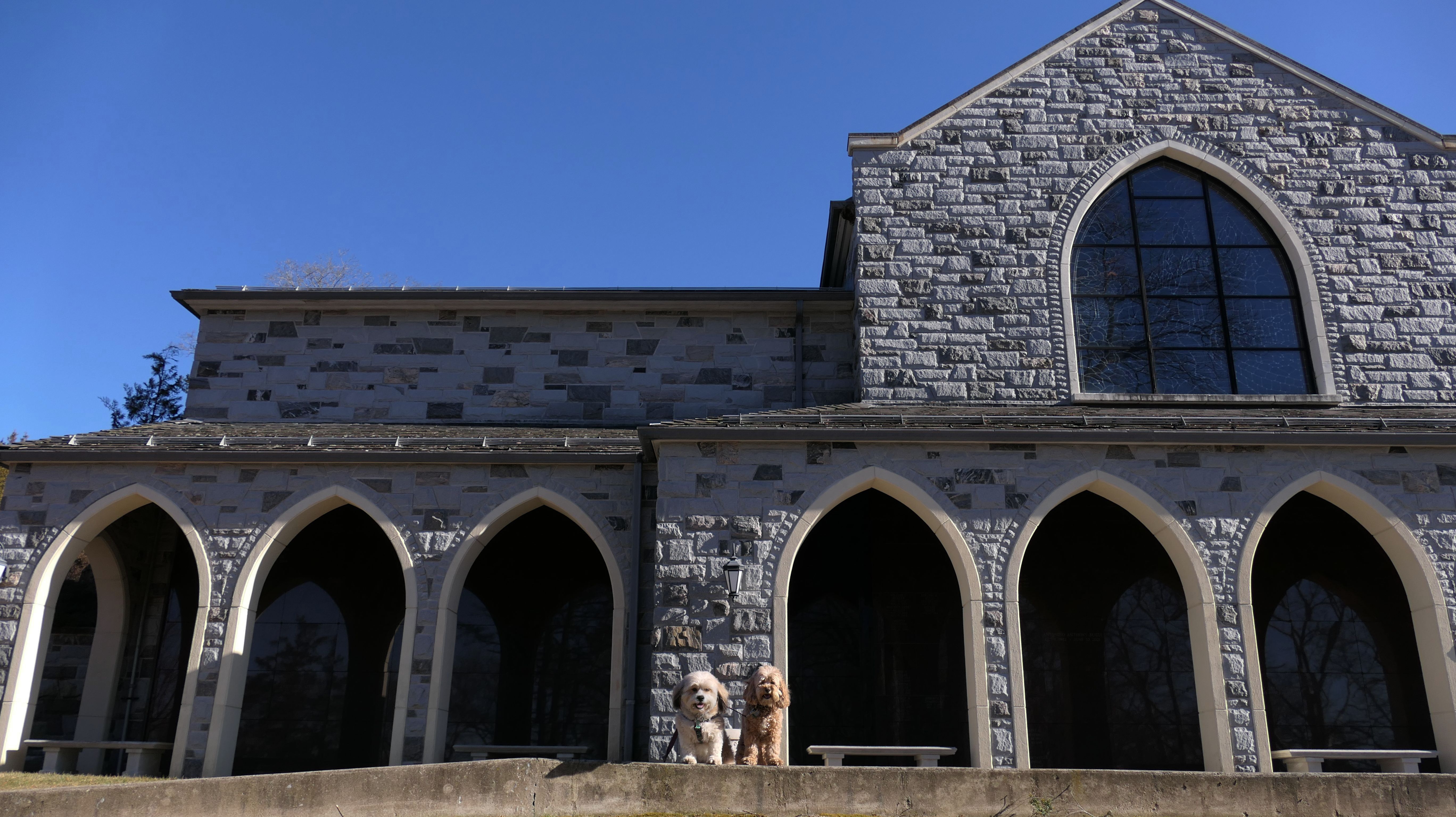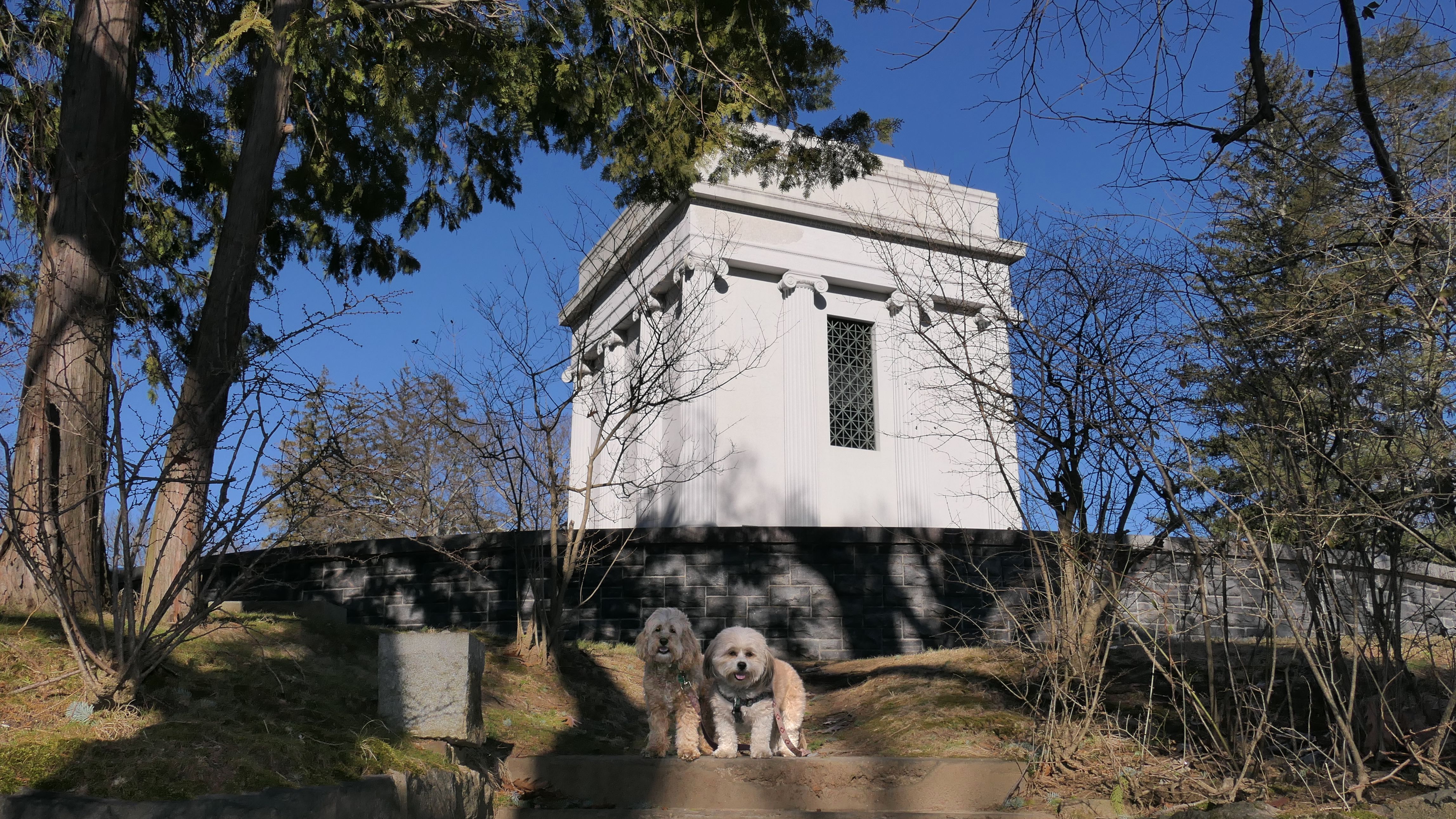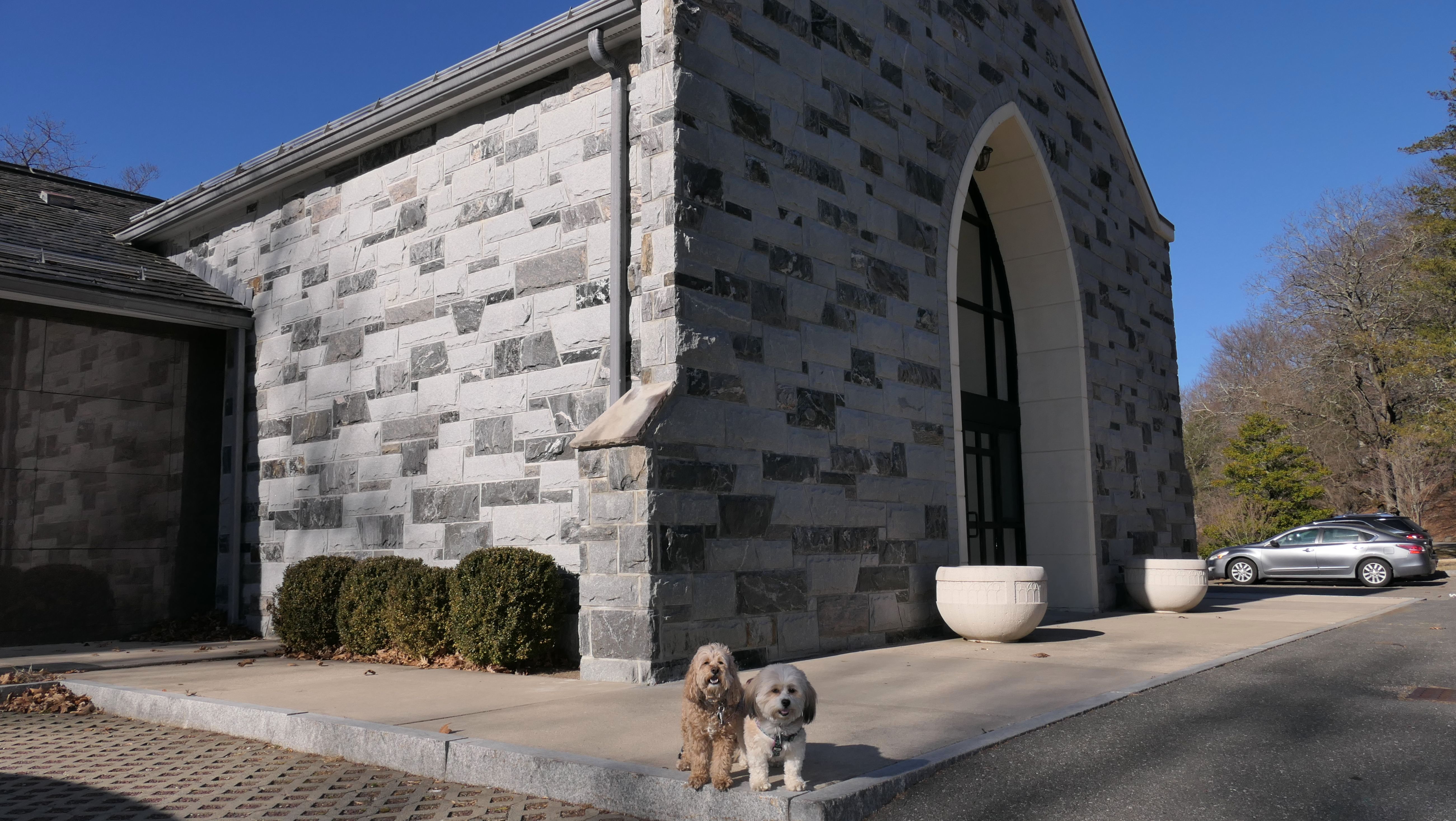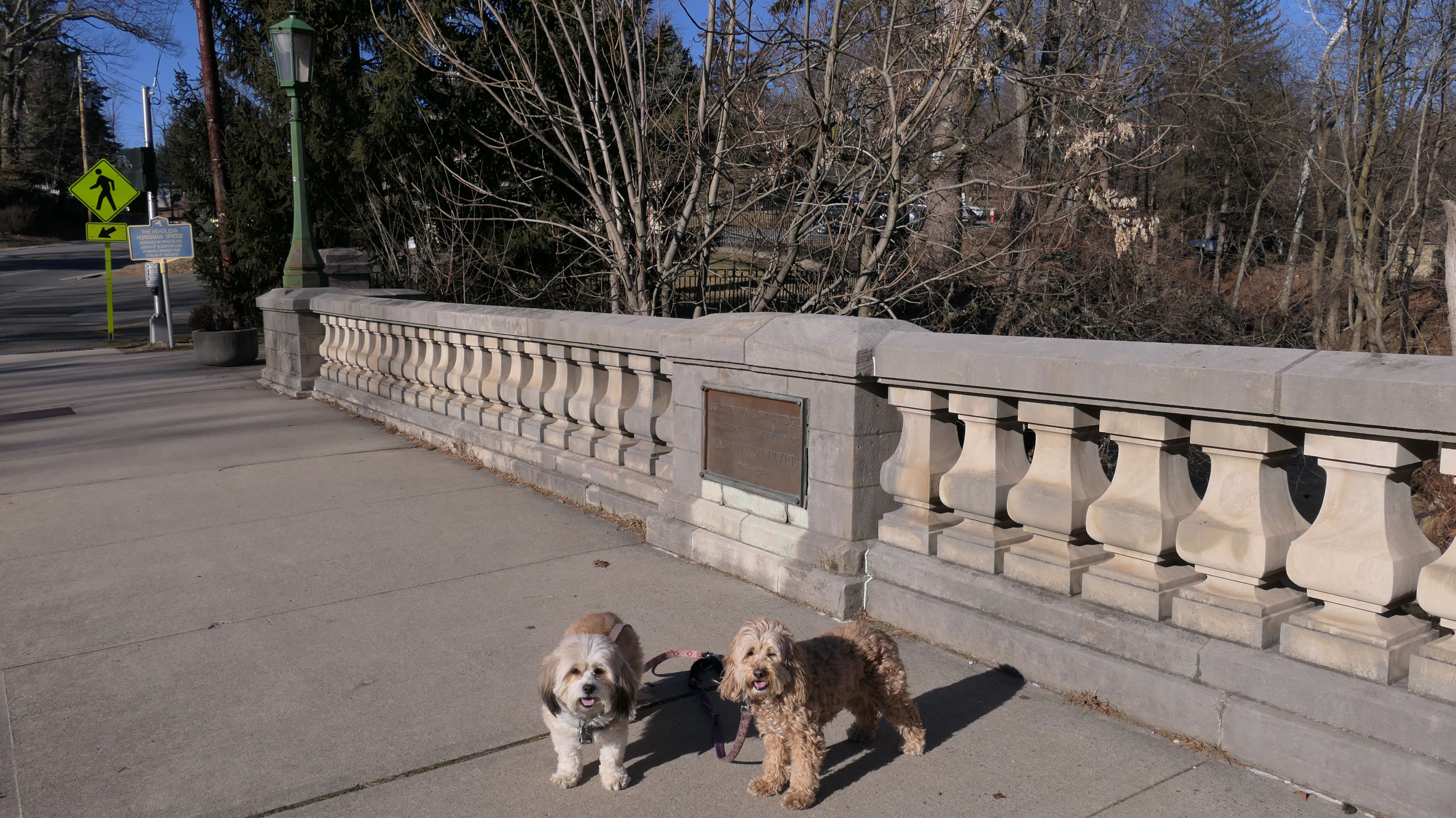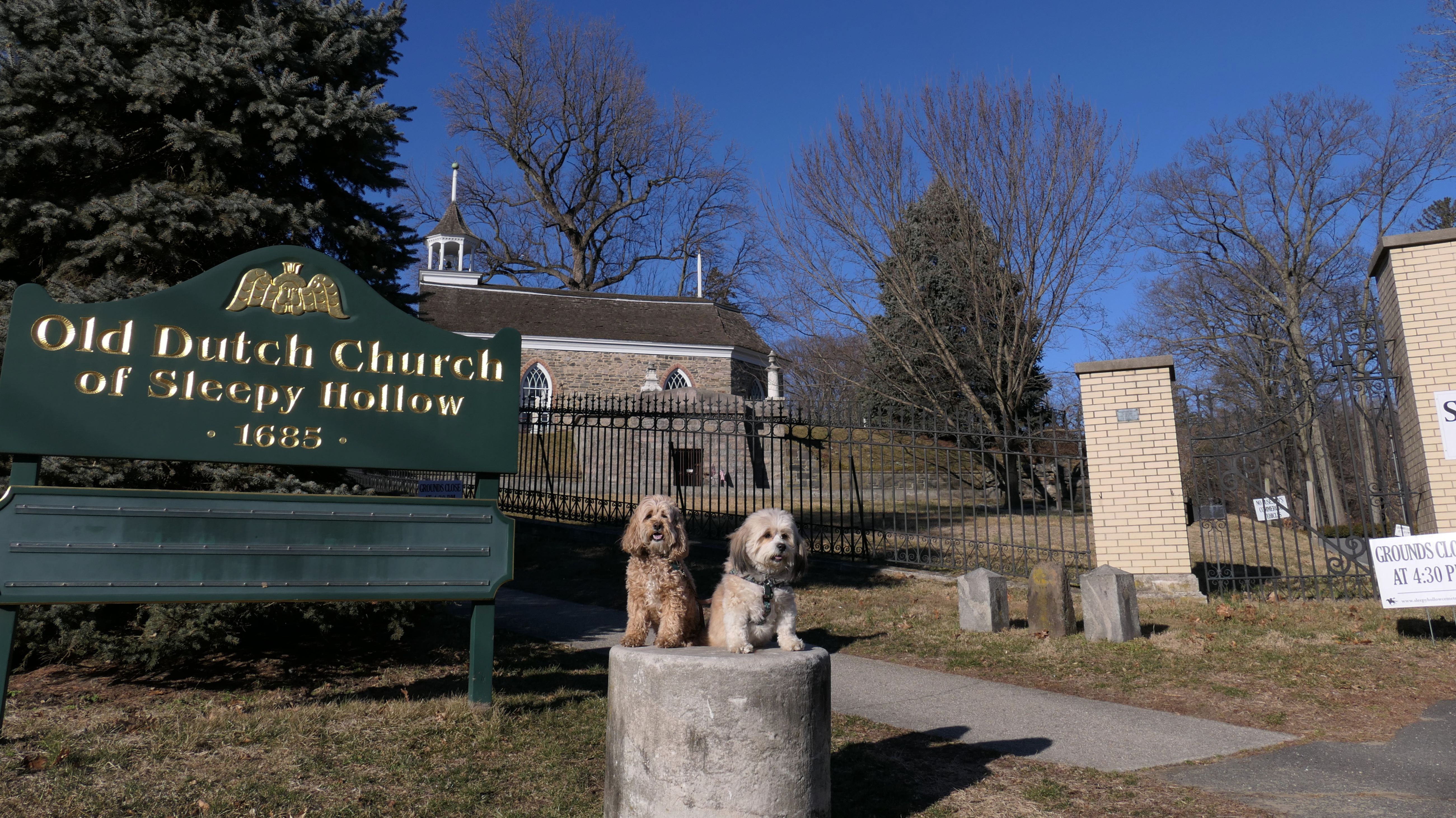 I was very surprised that dogs were allowed here because it is a cemetery, but there were "Pets Must Be Leashed" and "Pick Up After Your Pet" signs. The Sleepy Hollow Cemetery is a National Historic Site, so it is a tourist attraction. There were a few others walking their dogs on the grounds as well. My only knowledge of the "Legend of Sleepy Hollow "comes from that silly Fox TV show that was on a few years back, so I am not well versed on the historical significance of the place. The architecture of the buildings is unique, and the grounds are very well maintained. We also visited the Old Dutch Church of Sleepy Hollow which is situated in front of the cemetery, as well as the statue of the Headless Horseman which is just across the street.