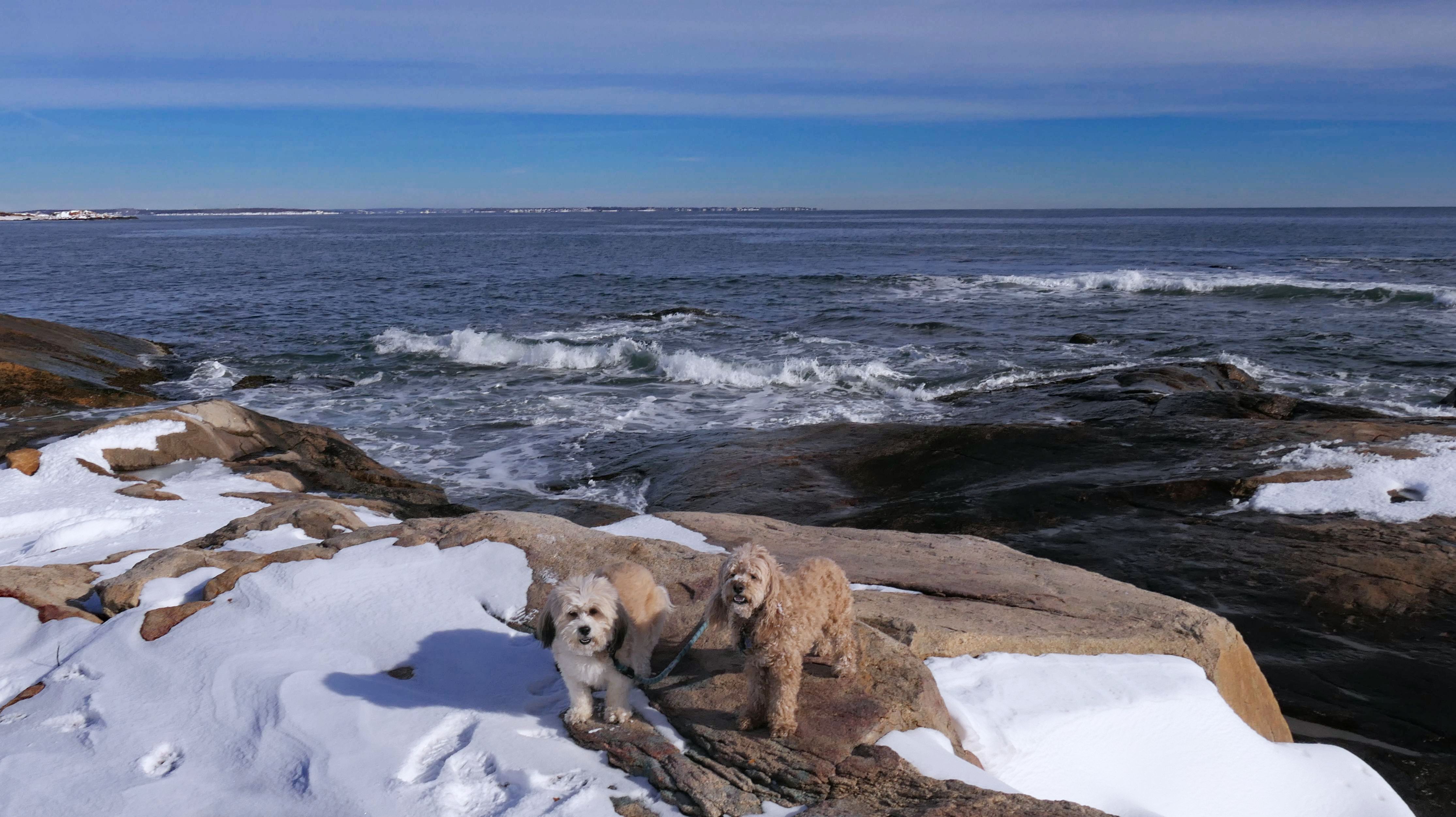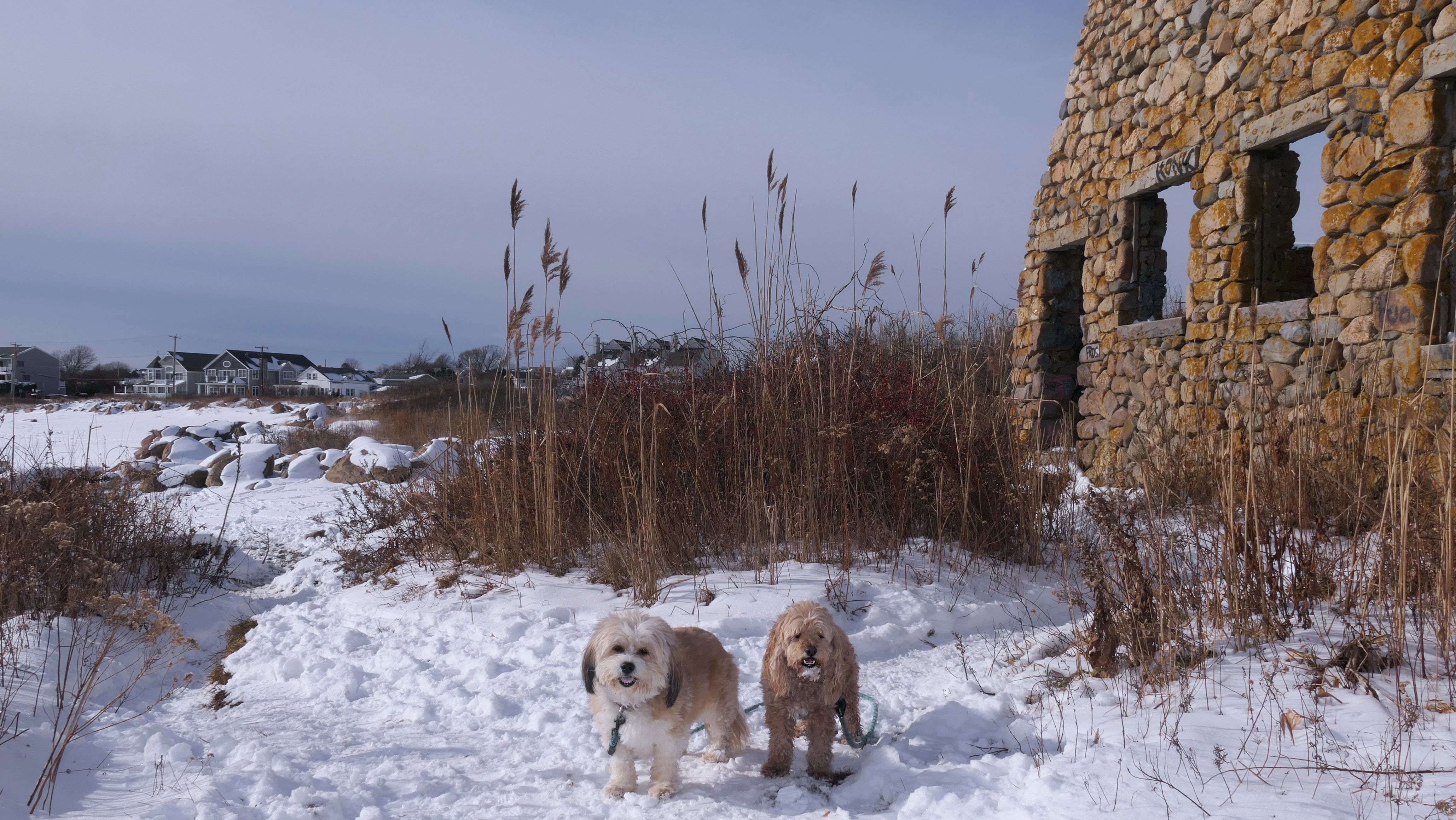 My brother was visiting from Colorado, and I wanted to take him to one of my favorite spots to bring the dogs. This is the first time we've ever been here with snow on the ground. That made this trip feel unique! We stuck mostly to the trail, though we did try to explore the rocks a bit. The snow and ice made navigating them a challenge. After reaching the ruins, we continued along Scarborough Beach for a short stretch before turning around and heading back.