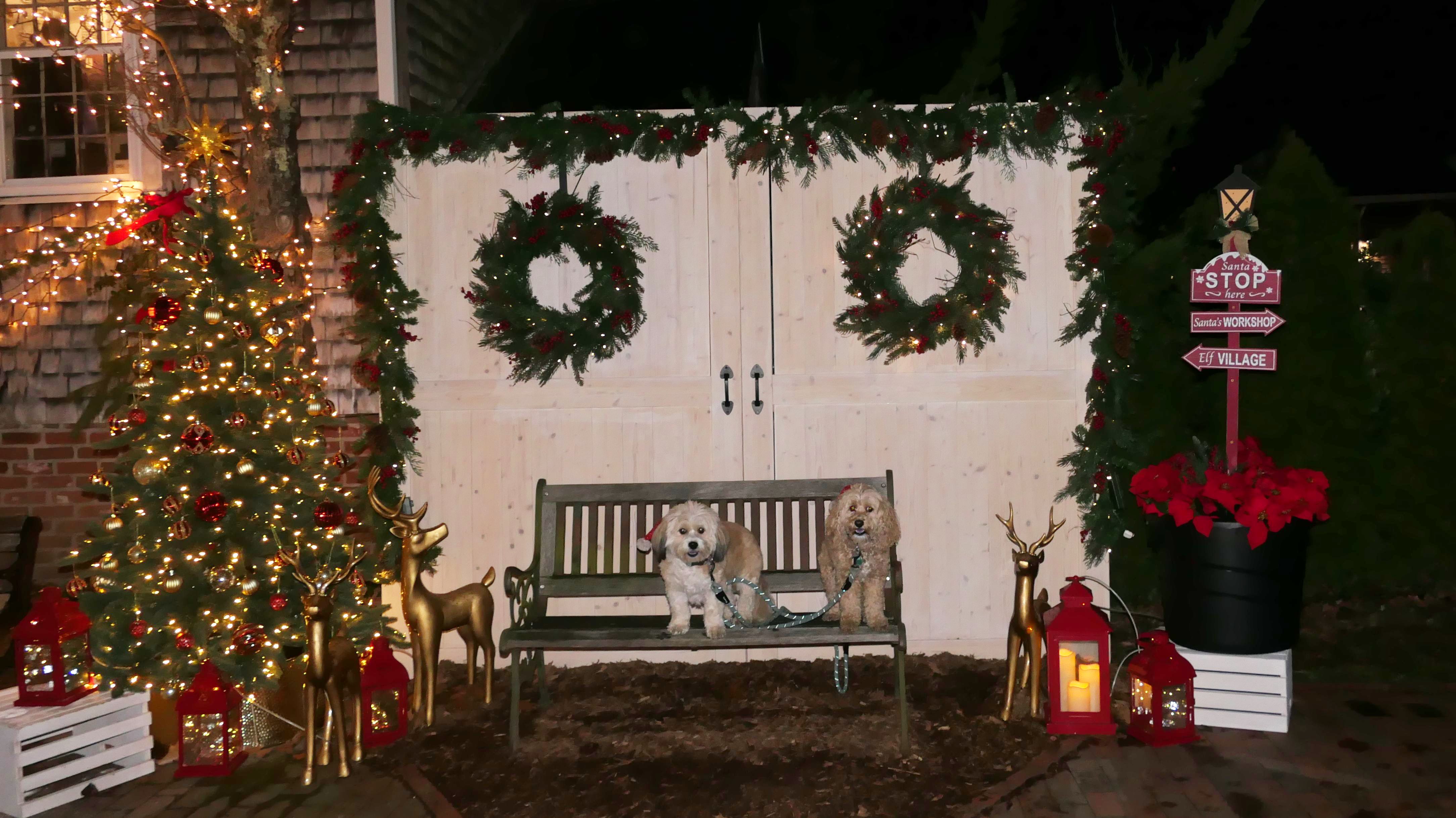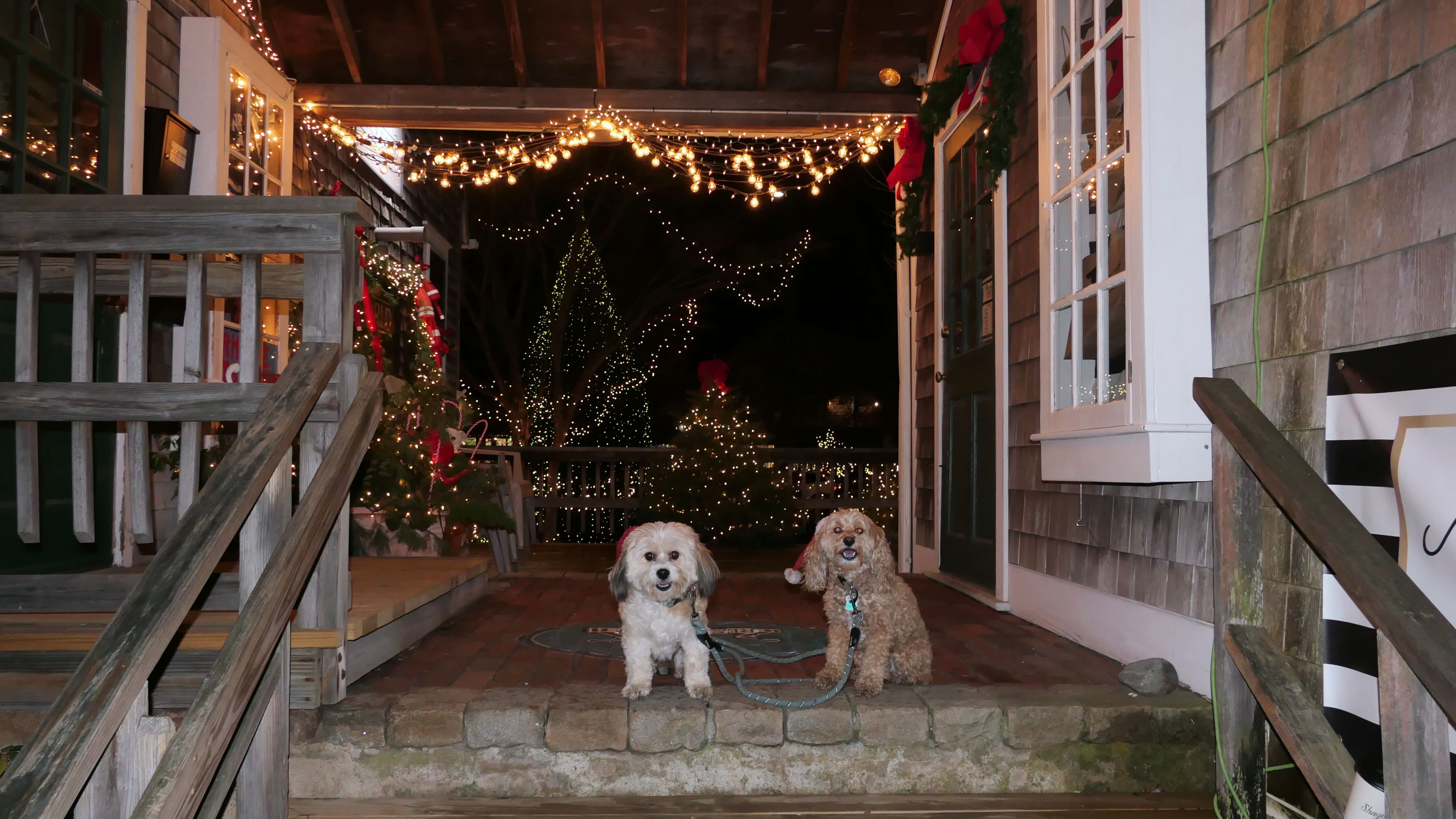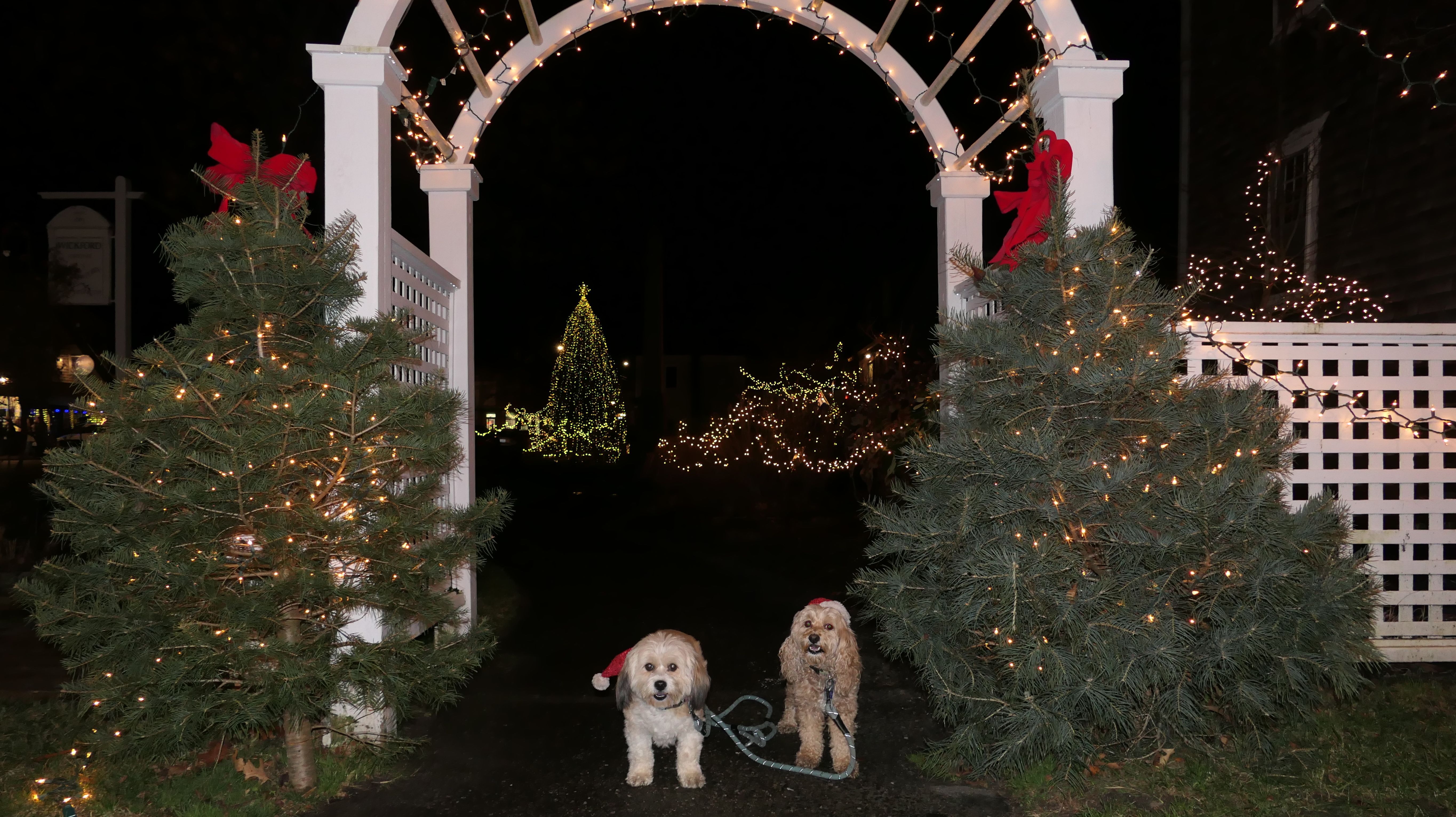 I don't usually go to the same place for Christmas pictures two years in a row, but we were in town for a pizza at Mickey's anyway. (We discovered Mickey's when we were here for the "Spooky Sip & Stroll" in October). This time we were here in the evening, so all of the lights were lit up. This village does a great job with the holiday decorations, so it was worth walking through again.