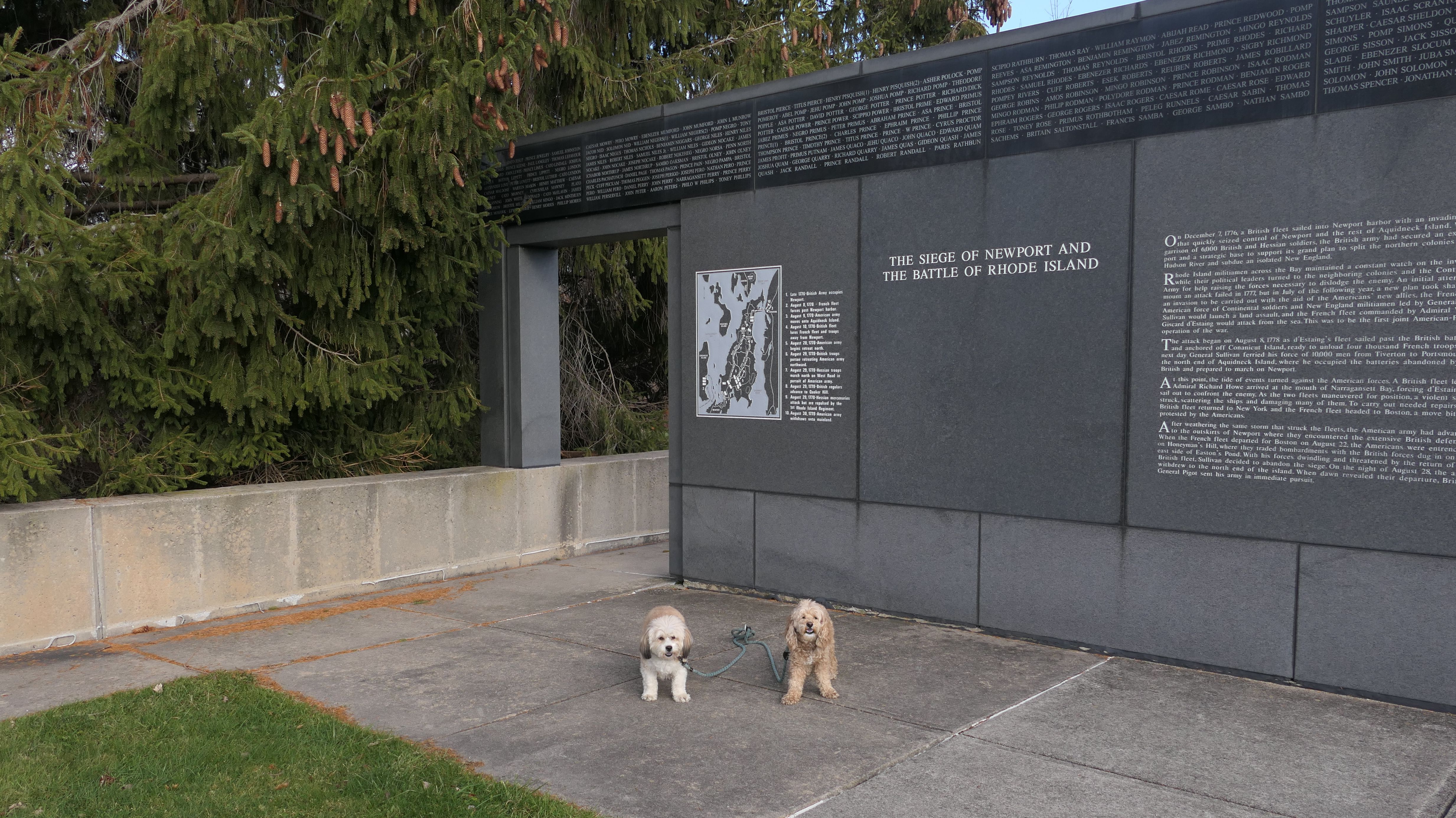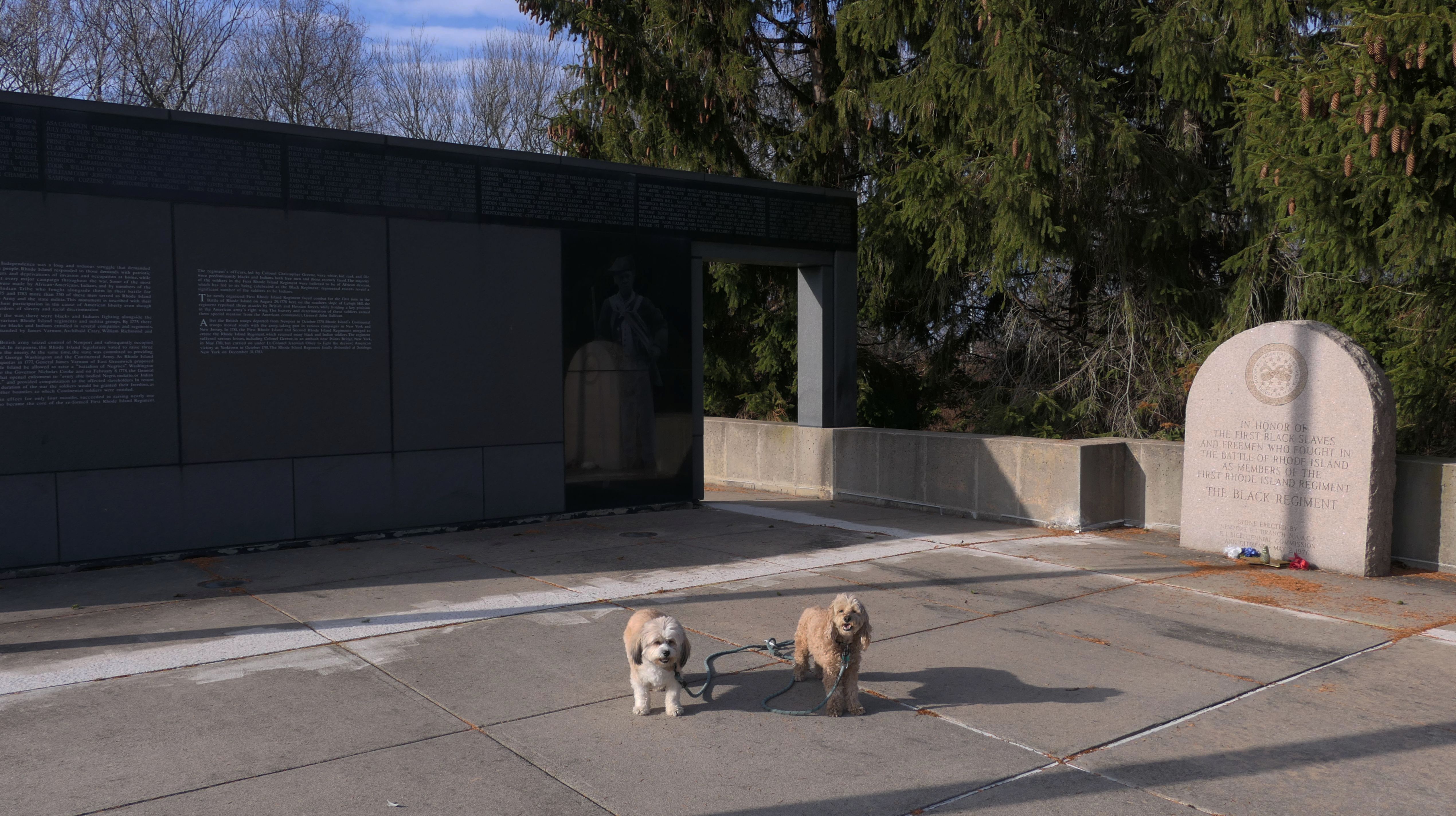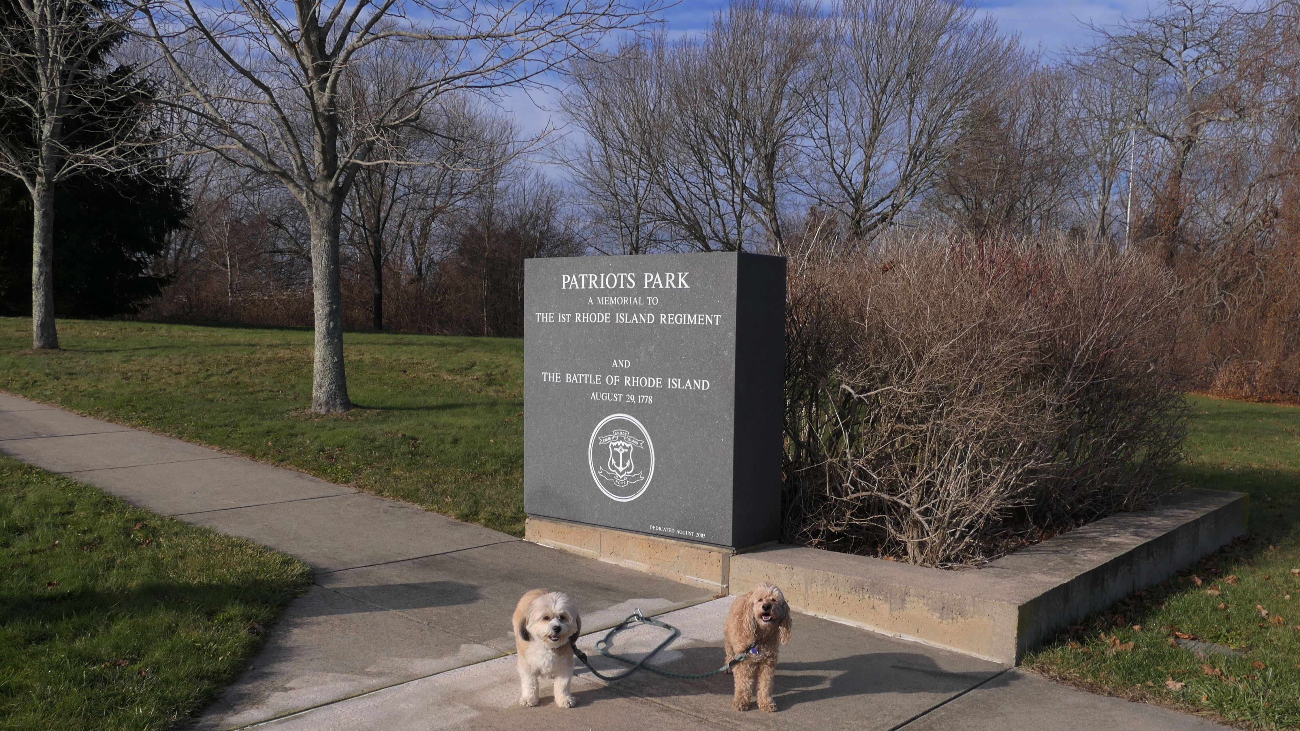 There are signs from the highway for this park, so I thought it would be bigger. It's actually pretty small, and more of a memorial than a park. It commemorates "The 1st Rhode Island Regiment and The Battle of Rhode Island" which took place on August 29, 1778. There is also a monument dedicated to the "The First Black Slaves and Freemen who fought in the battle". There's a plaque on the rear side of the wall with the entire story of the battle. It's certainly interesting stuff to learn about, but there's not much to do with the dogs here.