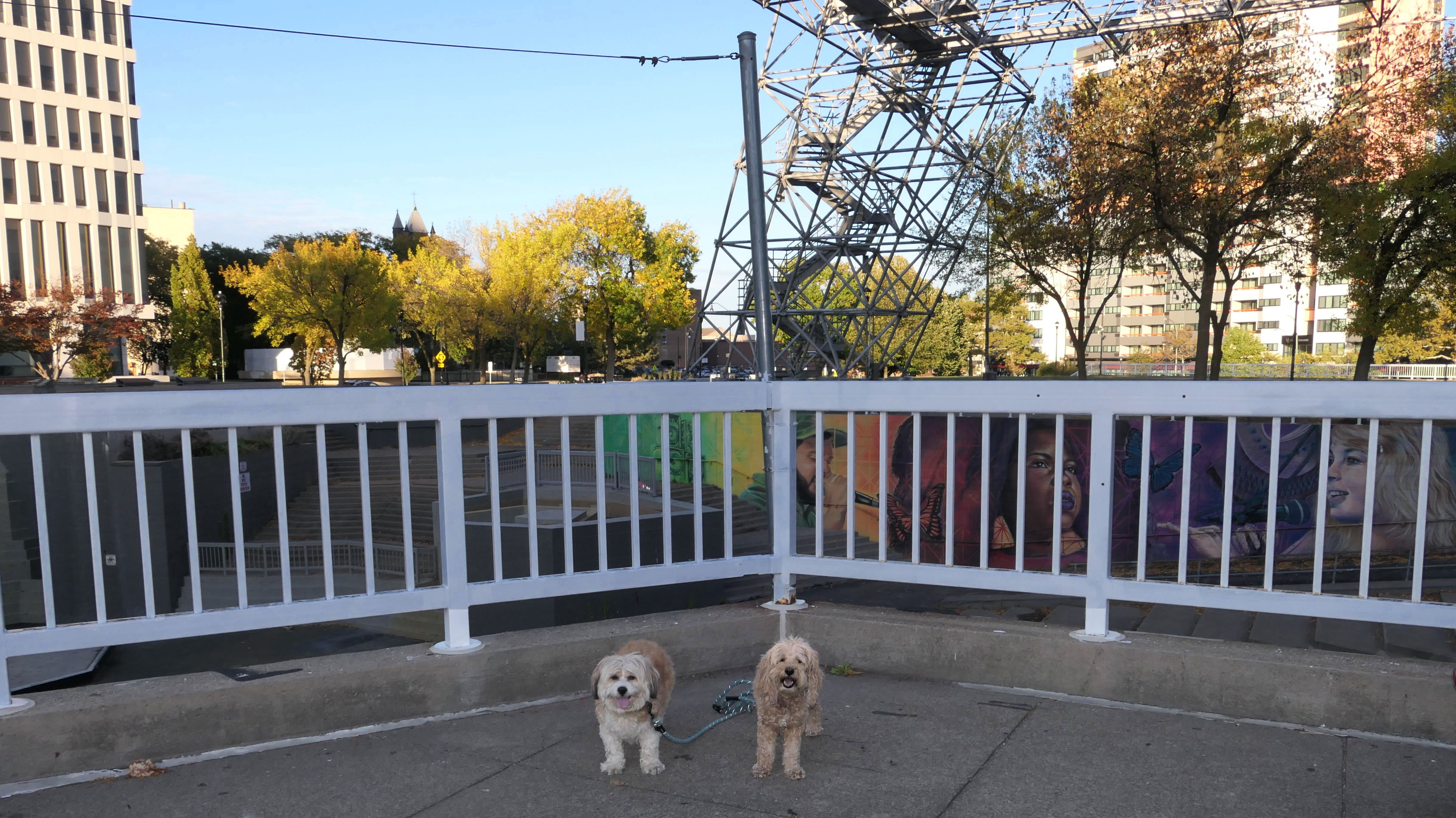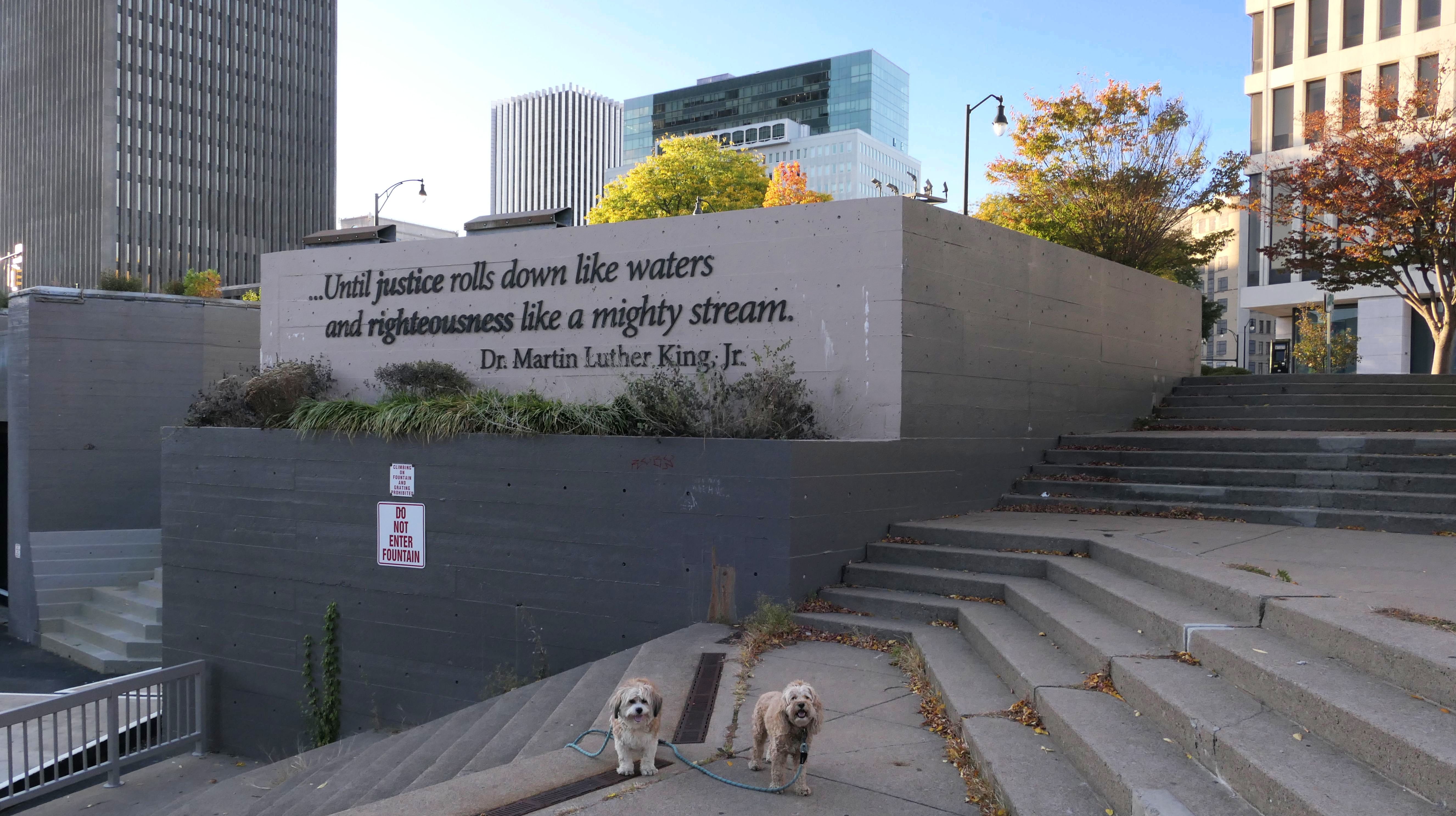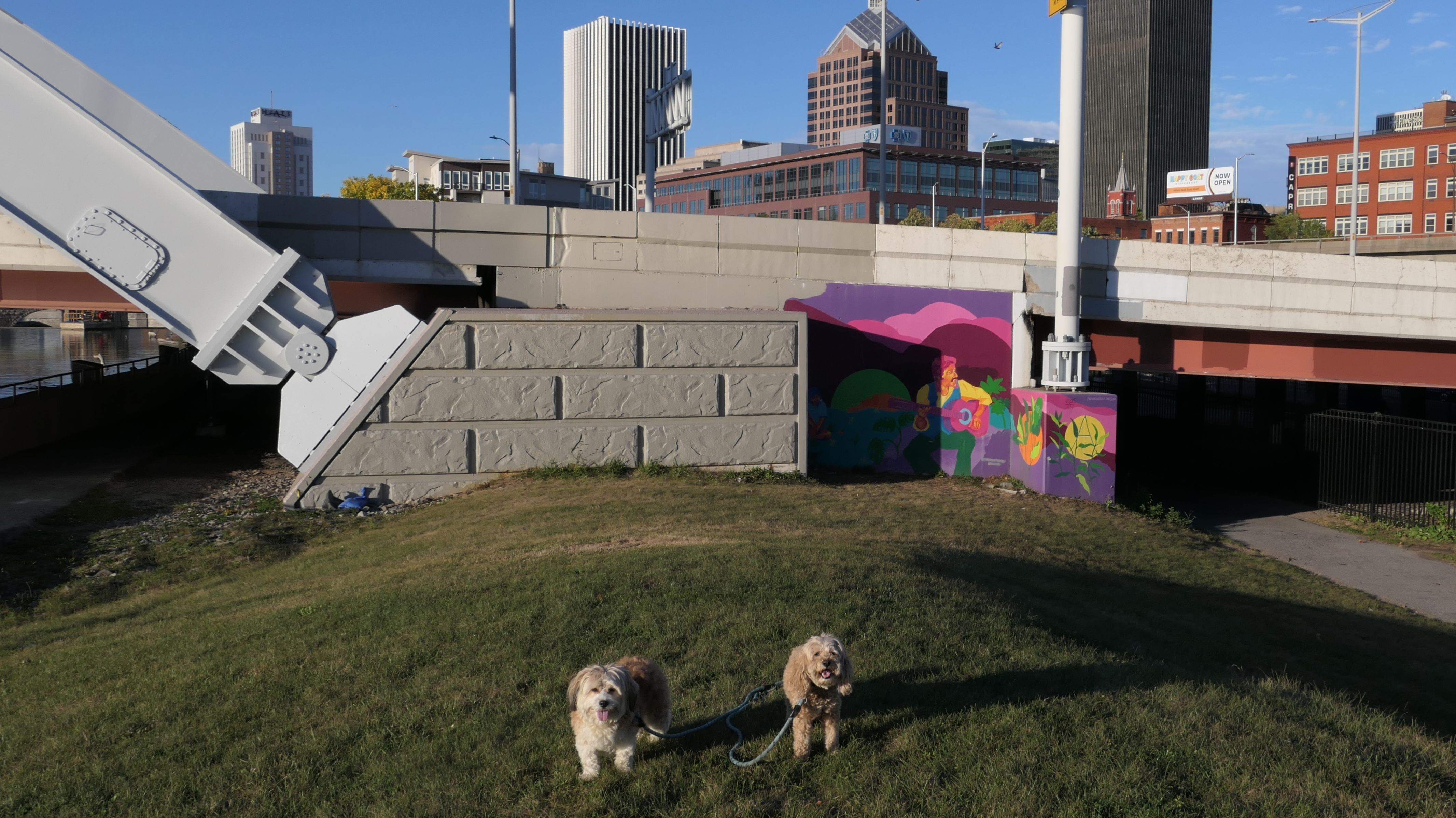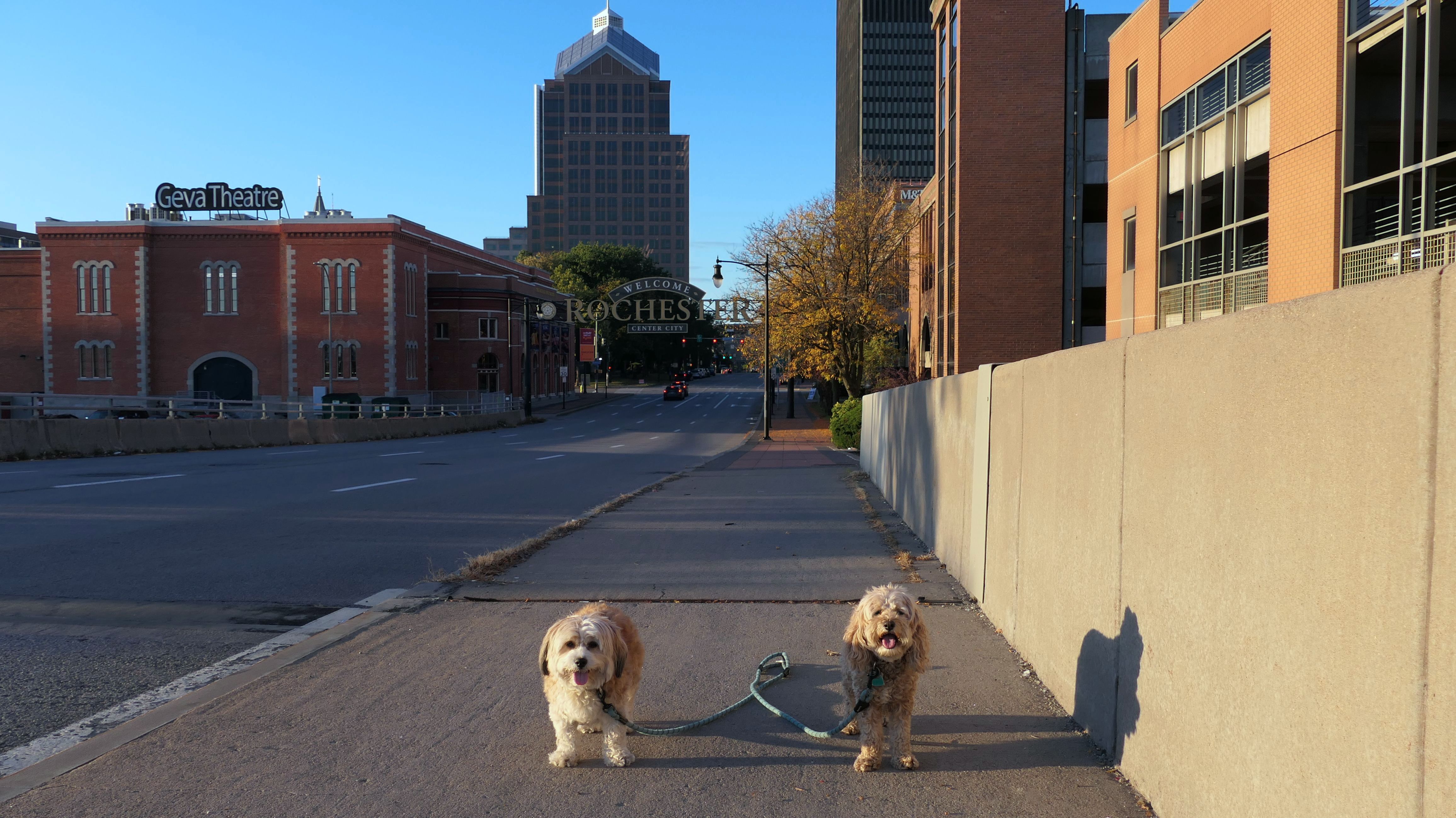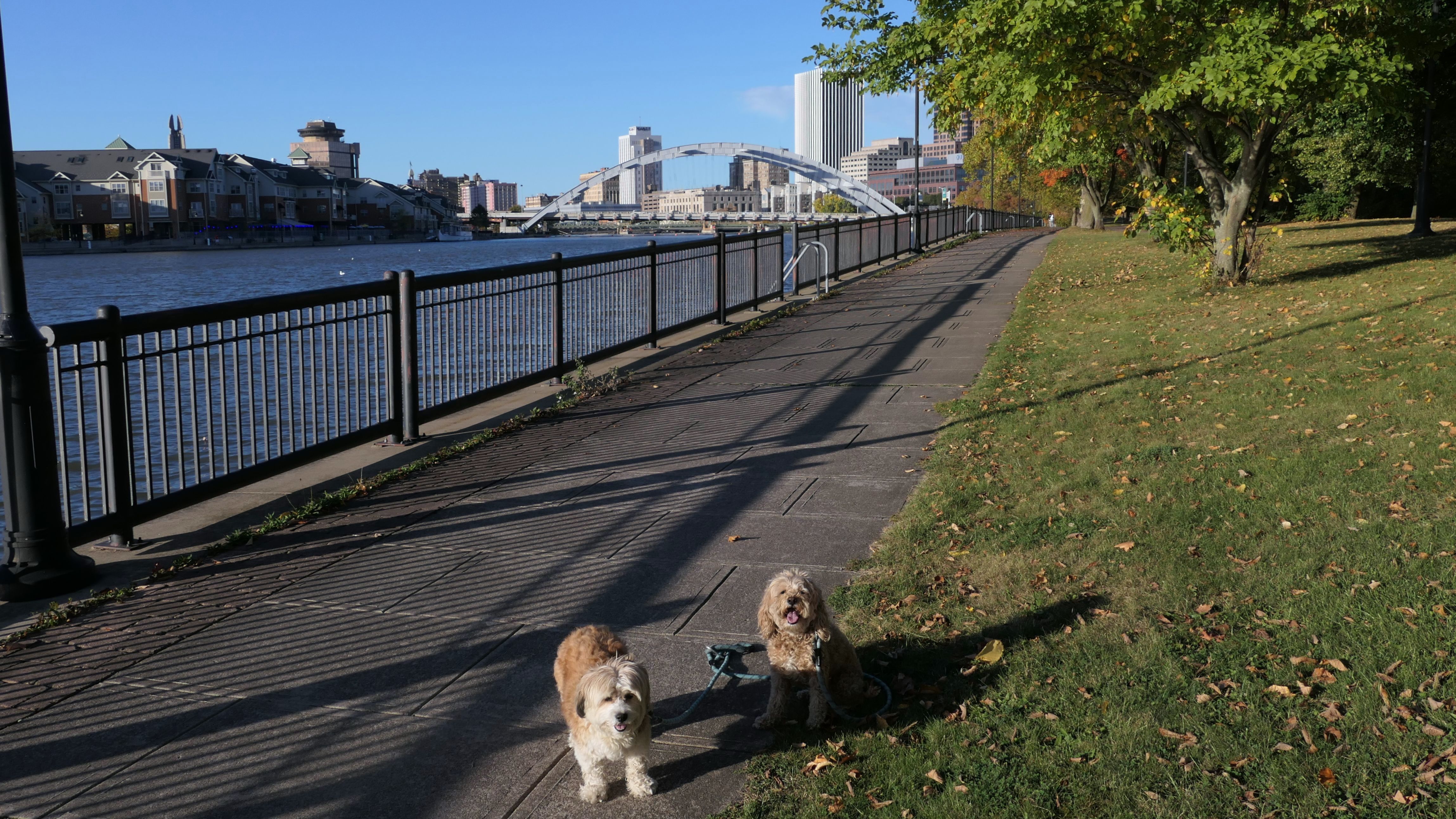 We actually adopted Mandy in Rochester, 10 years and 18 days prior to this visit! This was a homecoming for her, but I'm sure she doesn't remember any of it, as she was pretty much kept in a crate outside before we rescued her. At any rate, we were out near Syracuse in a town named Geddes, and decided to drive an hour east for the sunny skies in Rochester! This park features paved walking paths along the river, with great views of the city. The park was clean and looked well maintained. We didn't arrive until about 5:15PM, so we didn't have a lot of daylight left. The path led us to the downtown area, where we explored what we could, before heading back to the park. We walked a little over two and half miles total on a beautiful autumn evening.