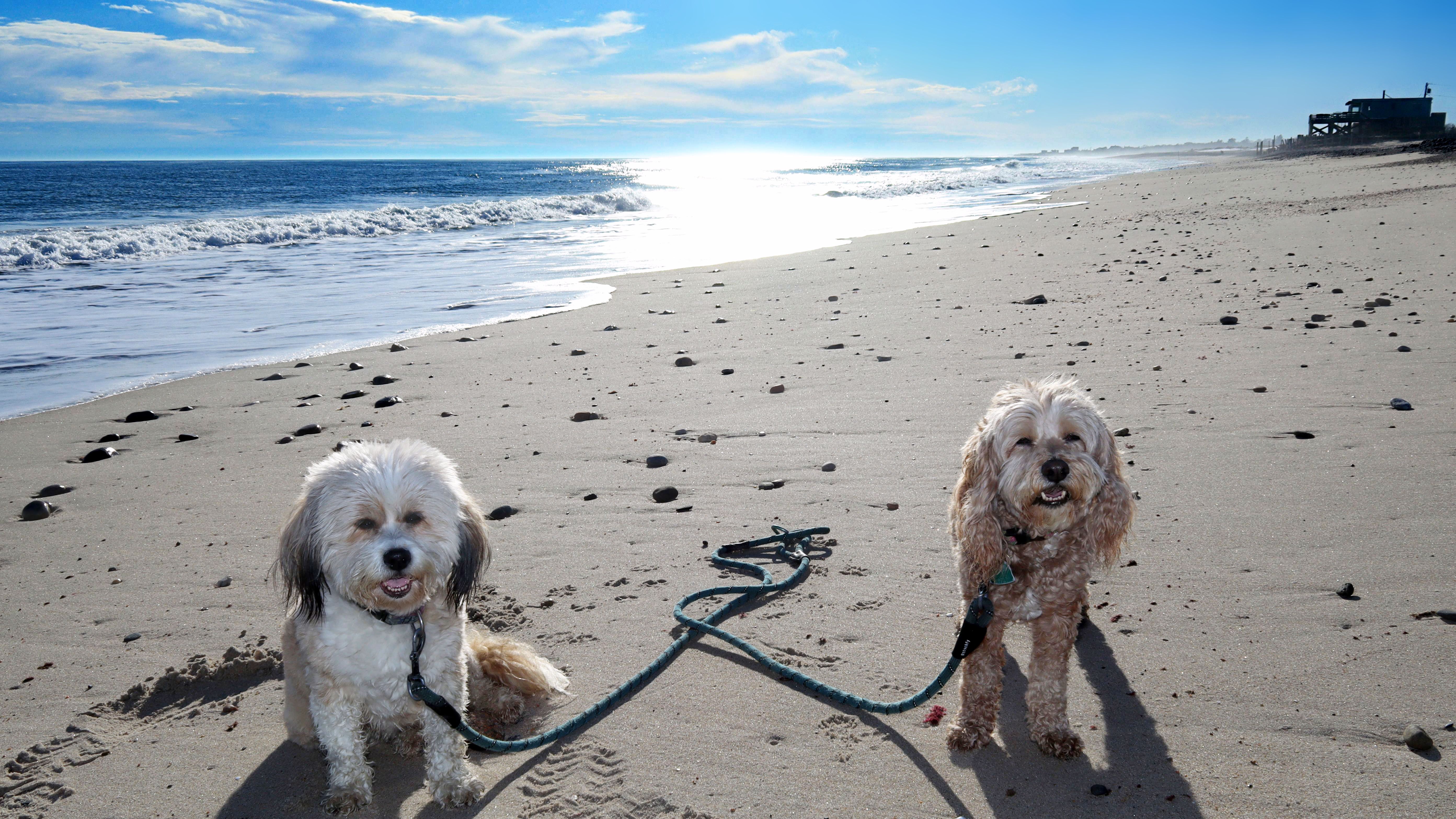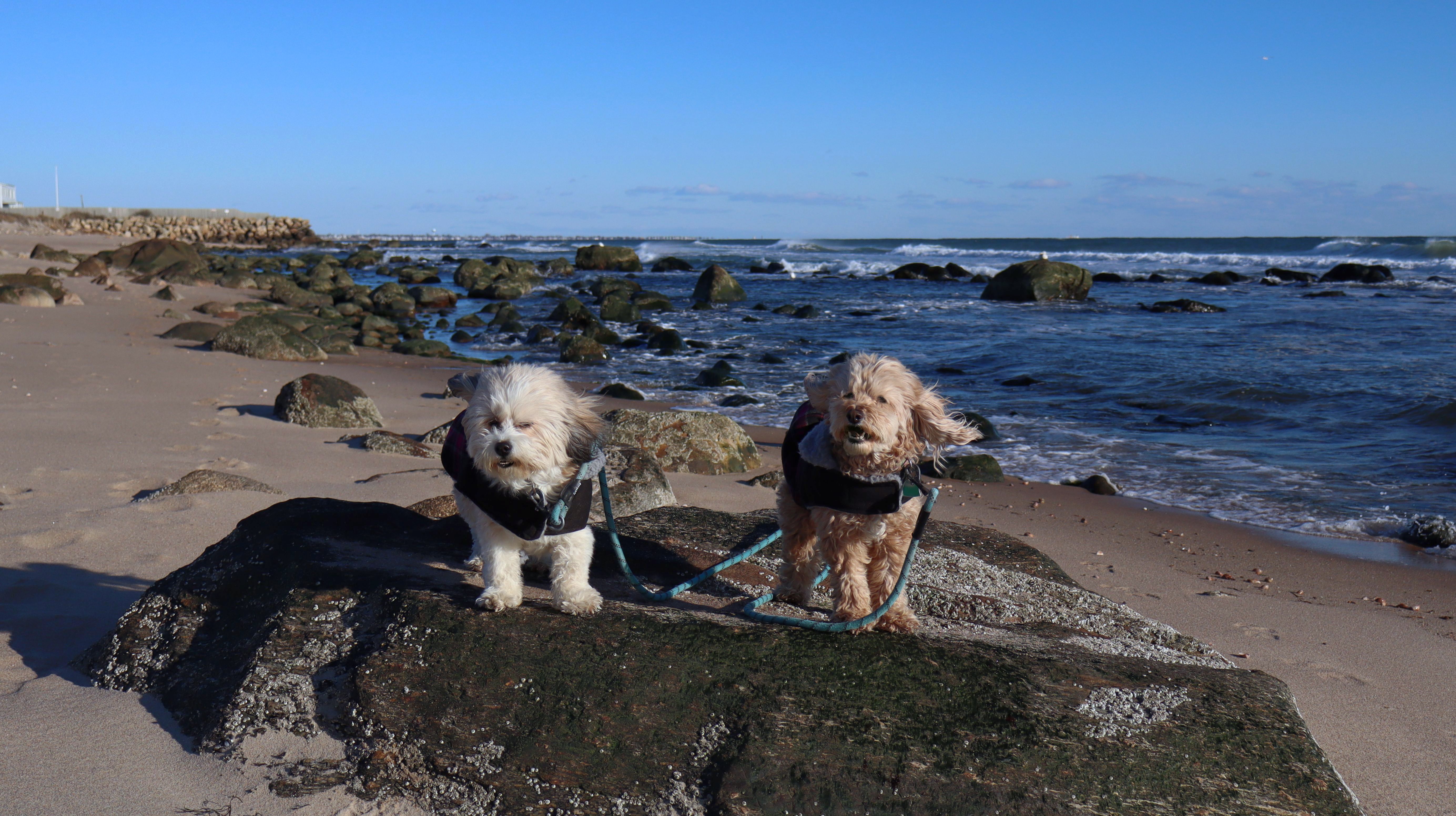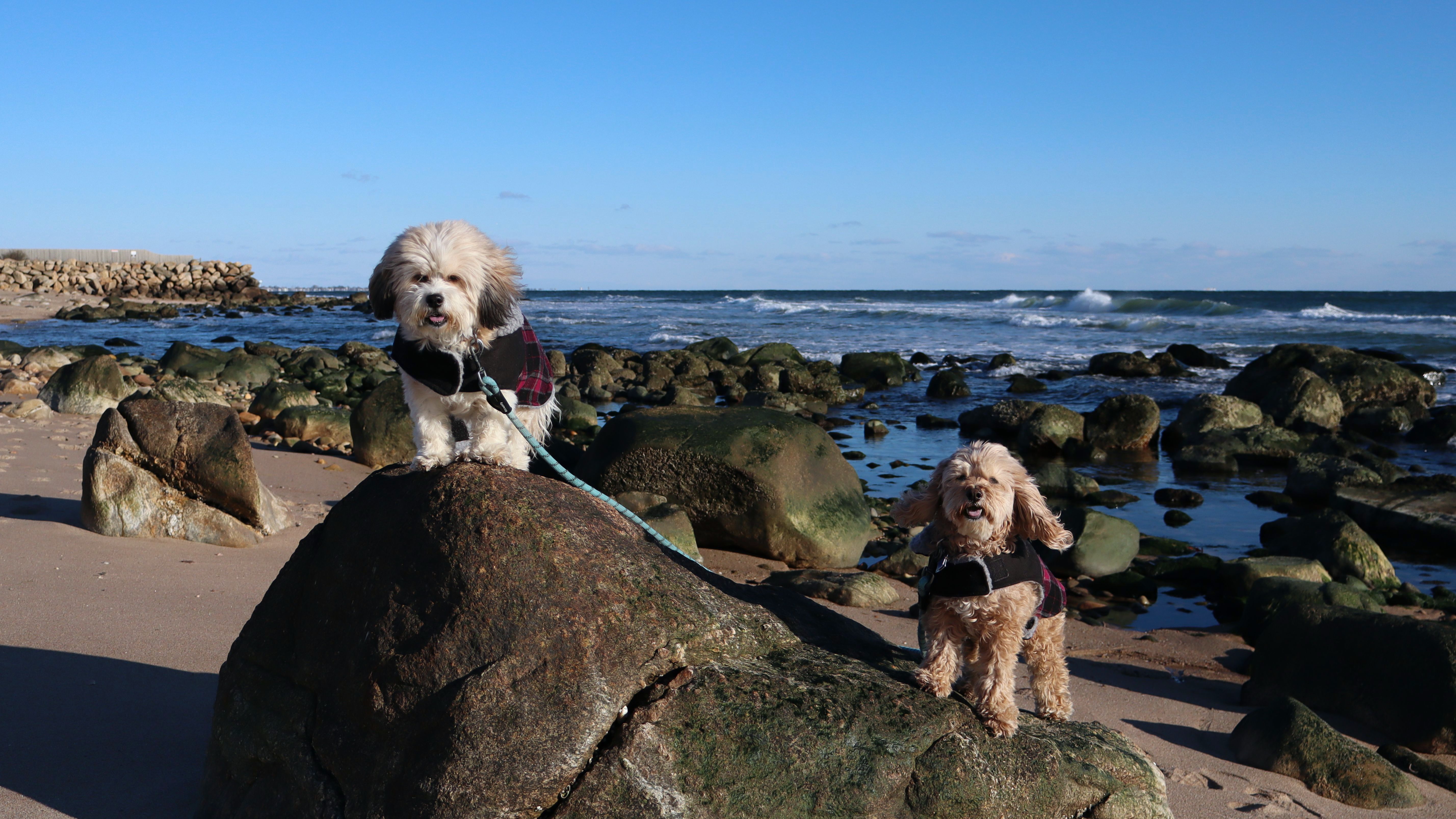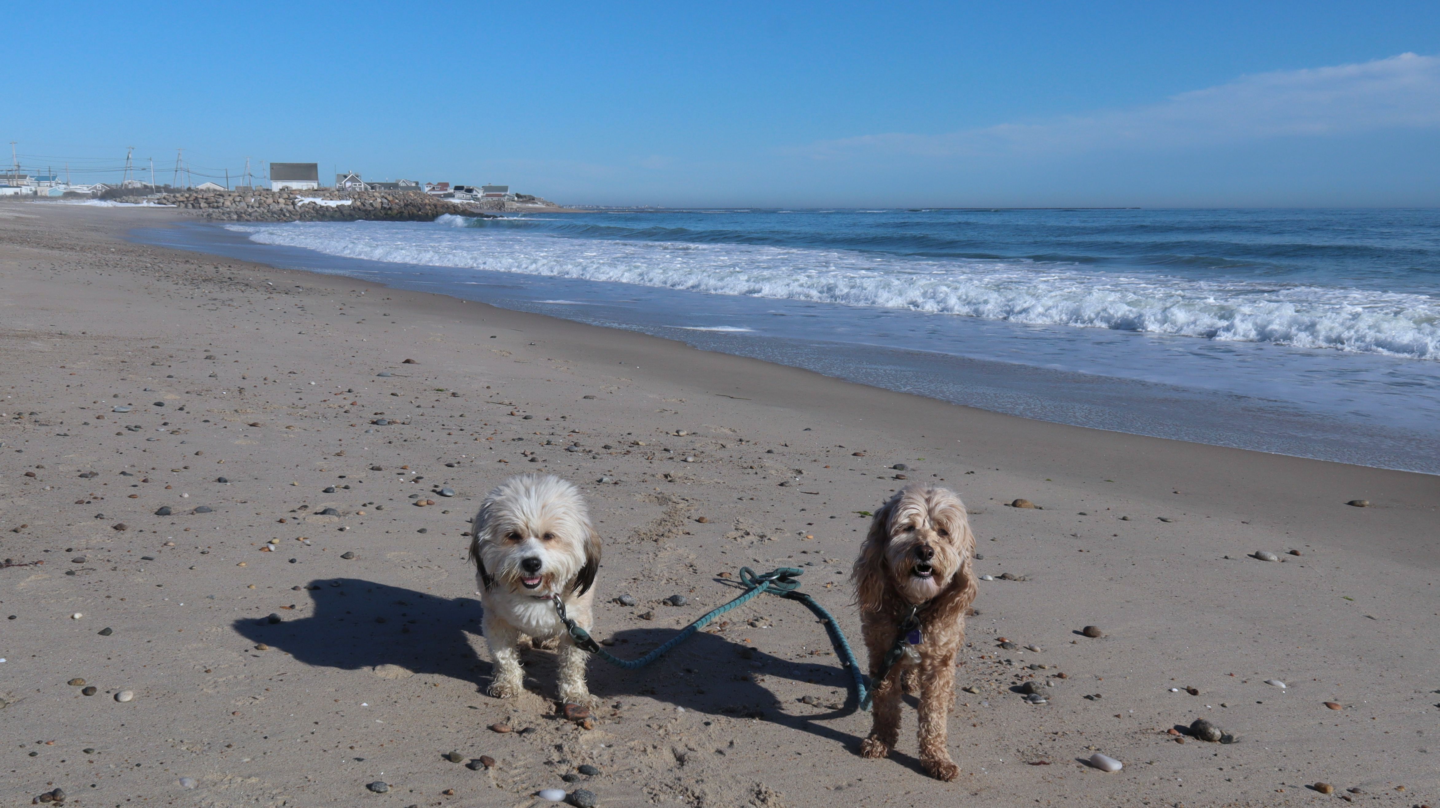 This was our second visit to this "secret" beach. We visited at the end of November last time, but this time it was a hot summer day in June! We stopped here while walking back to our car parked at Deep Hole, returning from the Ocean Avenue Shoreline Access Point. There's plenty of seaweed and muck at the edge of the beach, so it's not a great spot for the dogs to go into the water. We found a clean area near the rocks, where Mandy and Lexi were able to cool off. This is a neat spot for photos, but not a great beach for swimming or wading.
