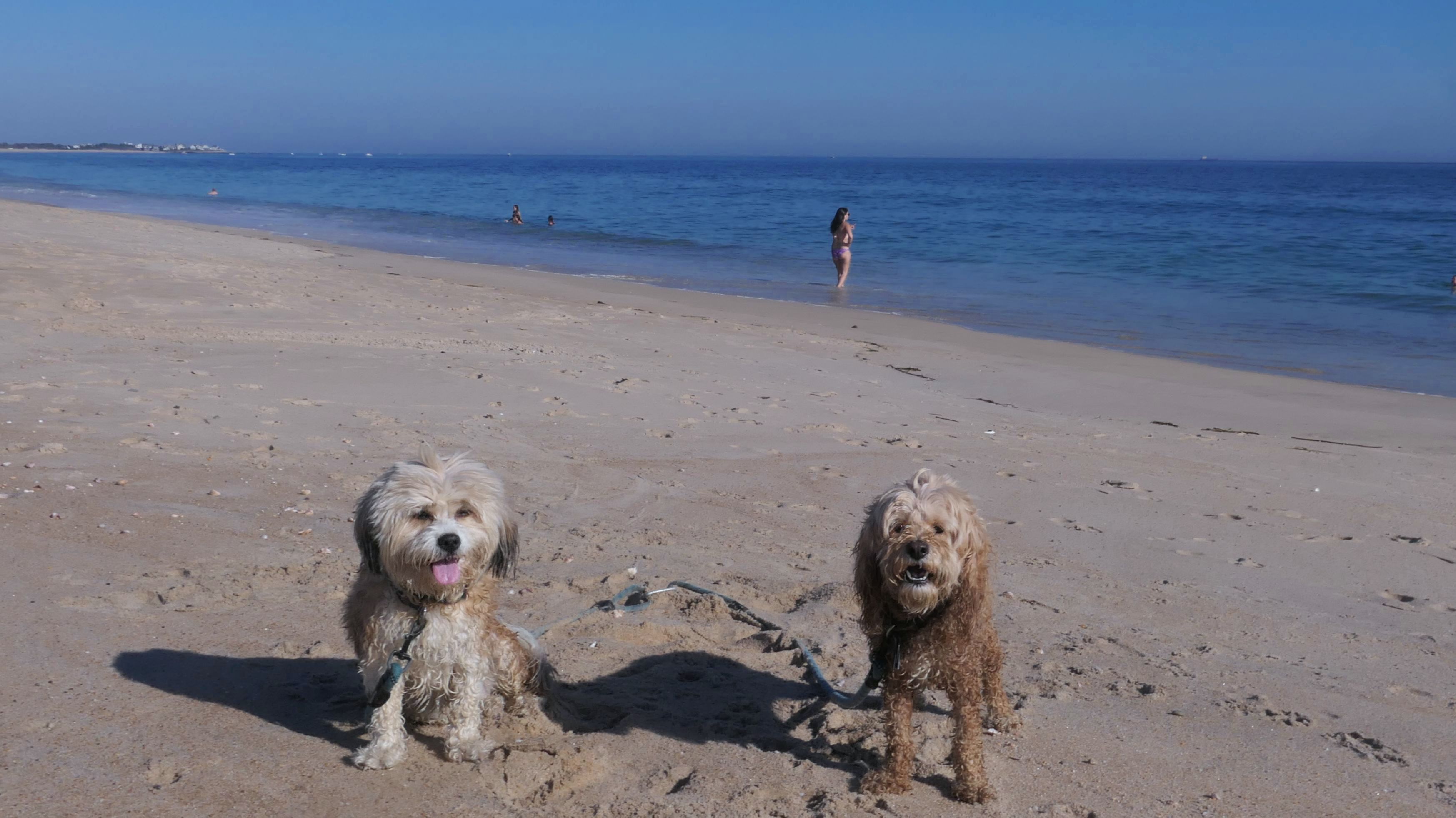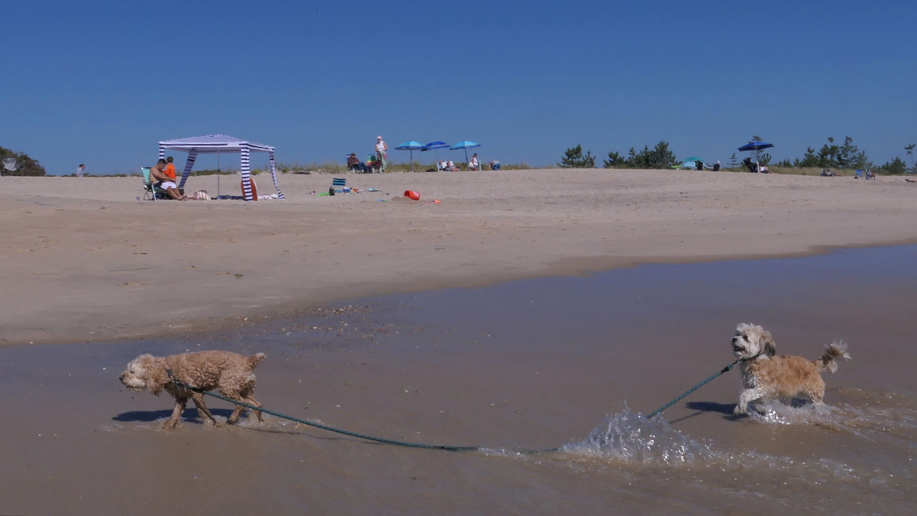 This was a wonderful late summer walk on the beach. Although dogs are technically allowed on the state beach until October, the town beaches on either side allow dogs after Labor Day. It's unclear where the borders are, so we basically just walked from Westerly Town Beach through the main tourist beach, and over to Misquamicut Fire District Beach, and back. The beach was moderately busy. It was a Thursday afternoon during the week, so even though it was a warm day, crowds weren't anything like what you'd see here during the summer peak. There were actually a good deal of people with their dogs here as well. We were here a day before the annual Fall Fest, so you can see the amusement park rides in the background of some of the photos. Lexi tried to get Mandy to play a couple times, but all Mandy wanted to do was relax in the water!