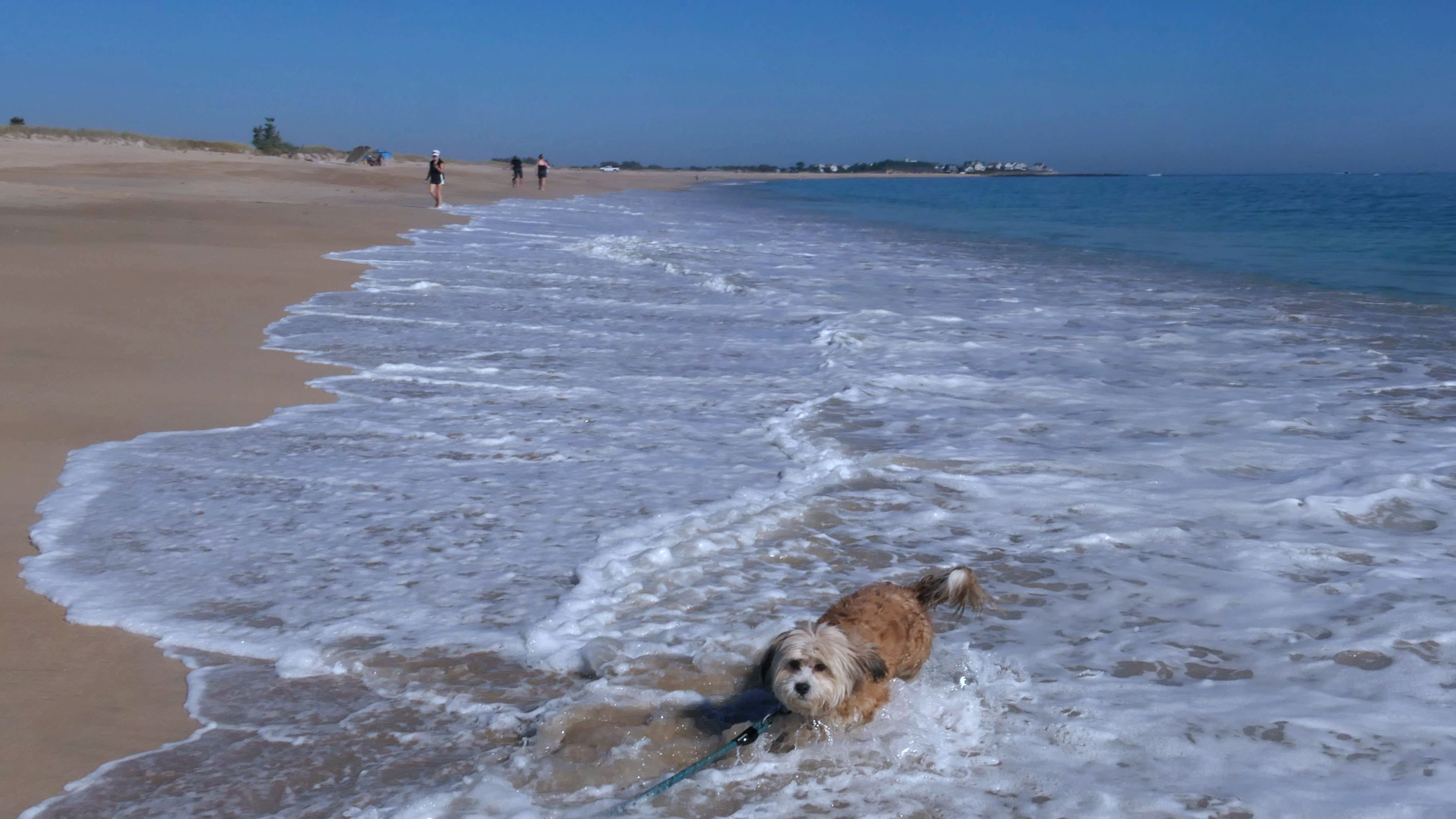 It was the hottest day of the year, and this was our final stop. We waded through the edge of the waves, walking about a half mile up the beach before turing around and heading back to Watch Hill. We've been here a bunch of times before. It's one of our favorite places, and dogs are allowed after 6PM during the summer months. This was a nice way to wrap up a very busy day that started in Narragansett and ended here.
