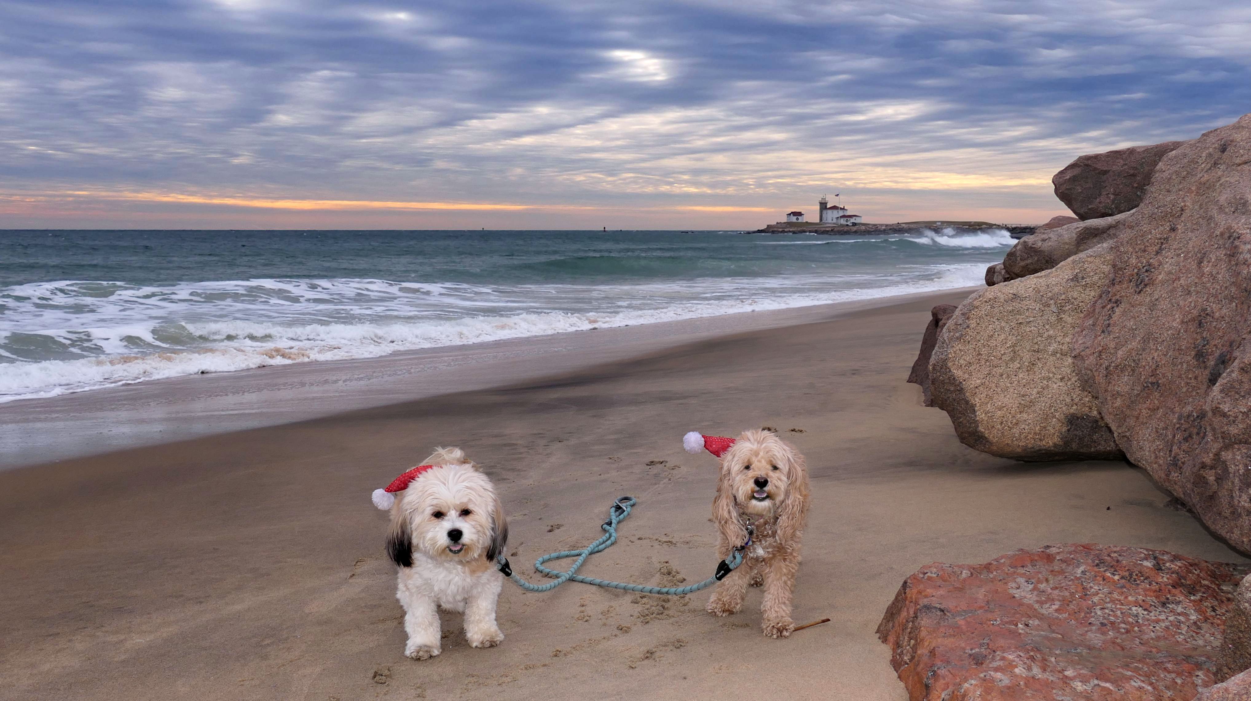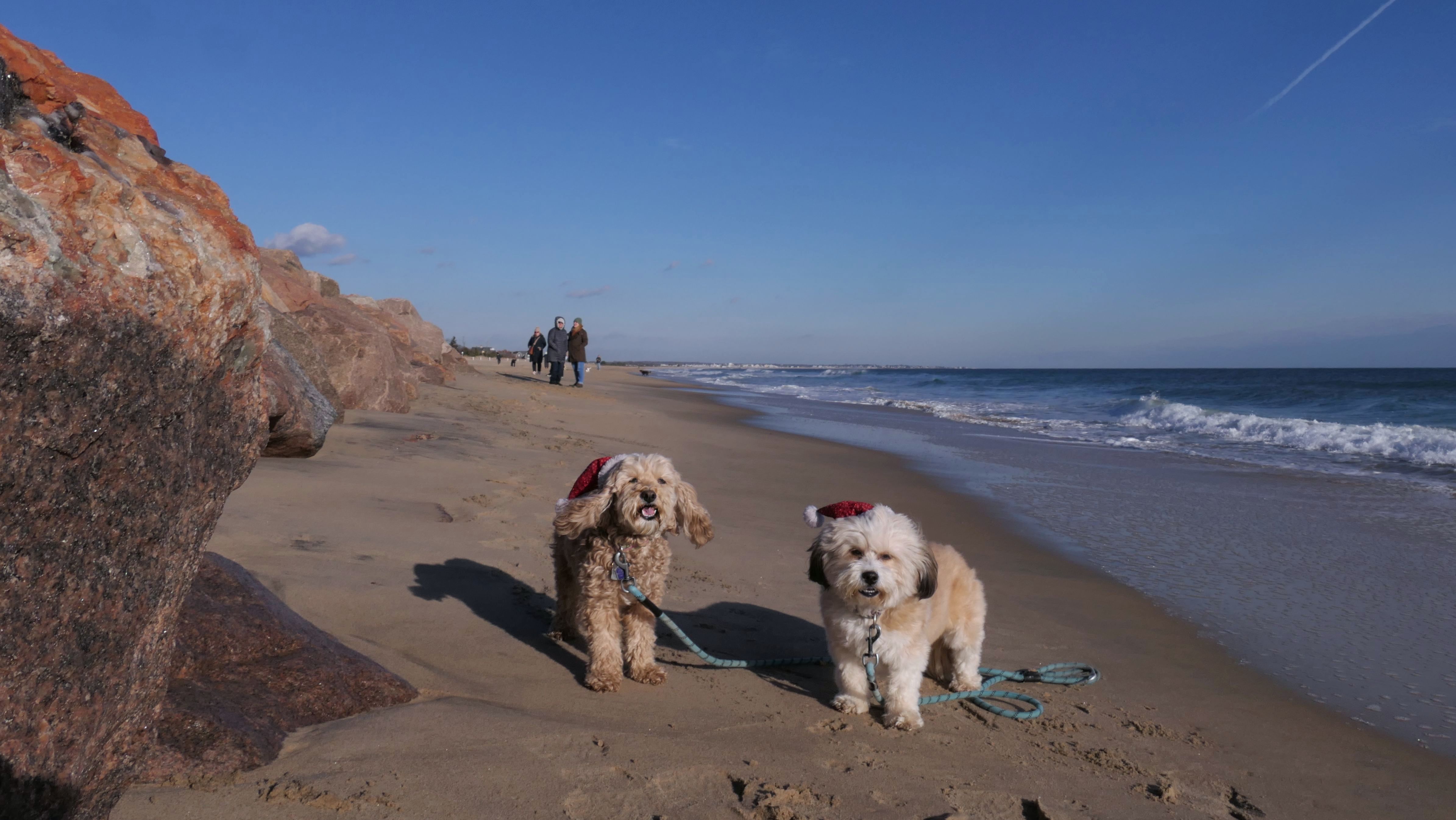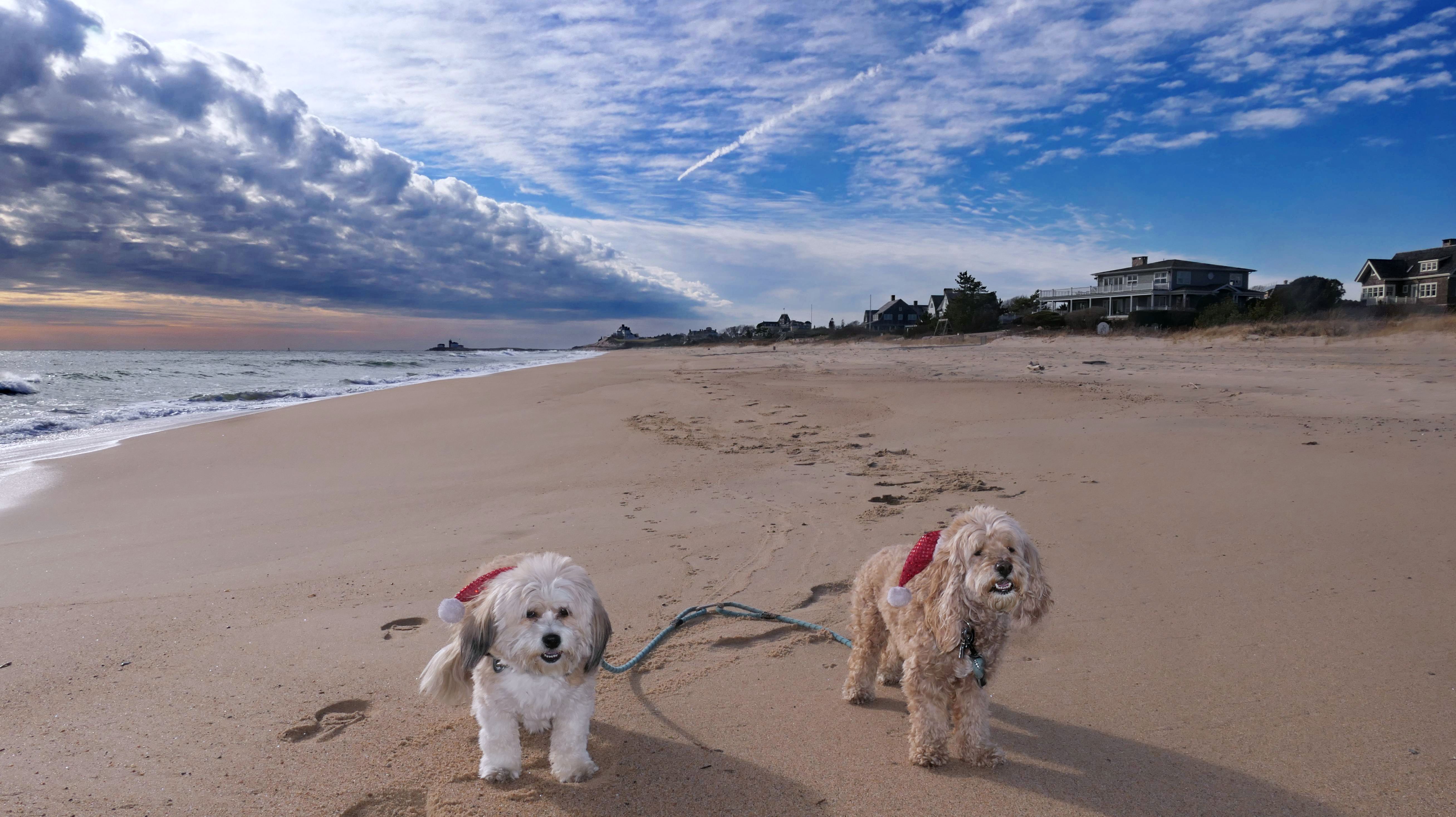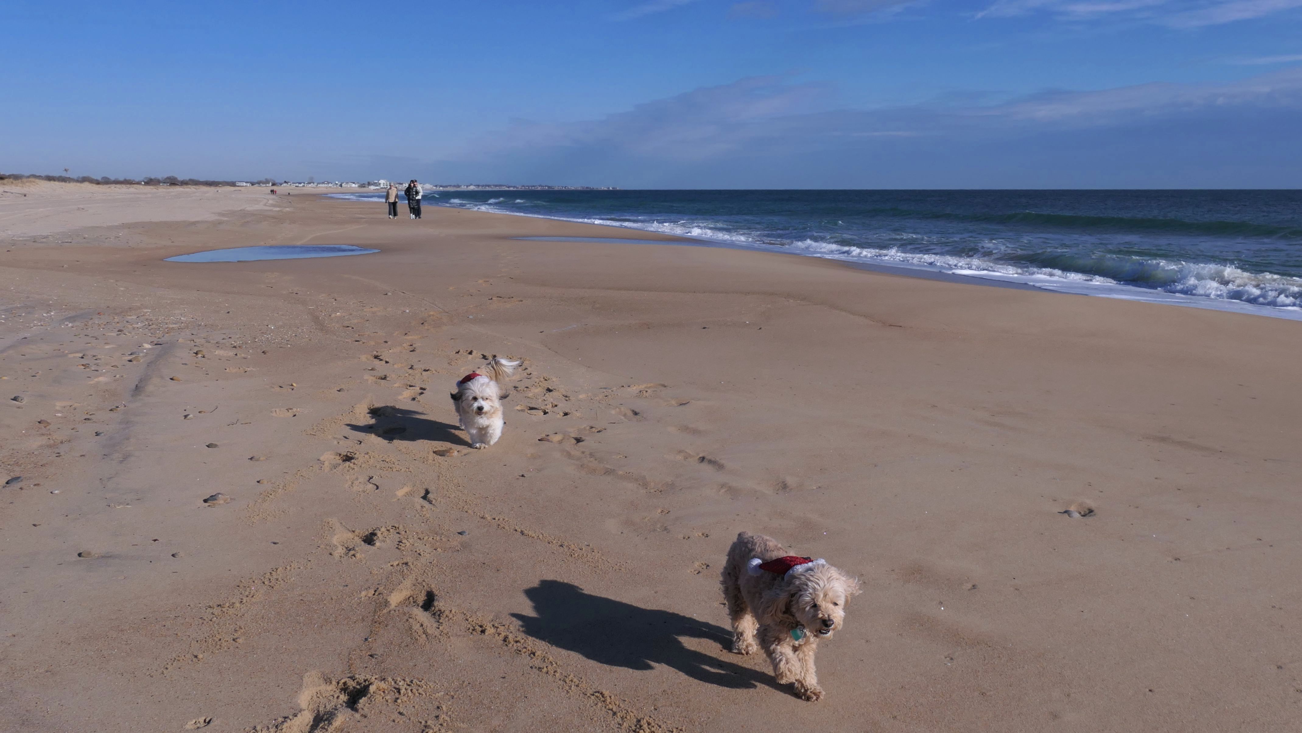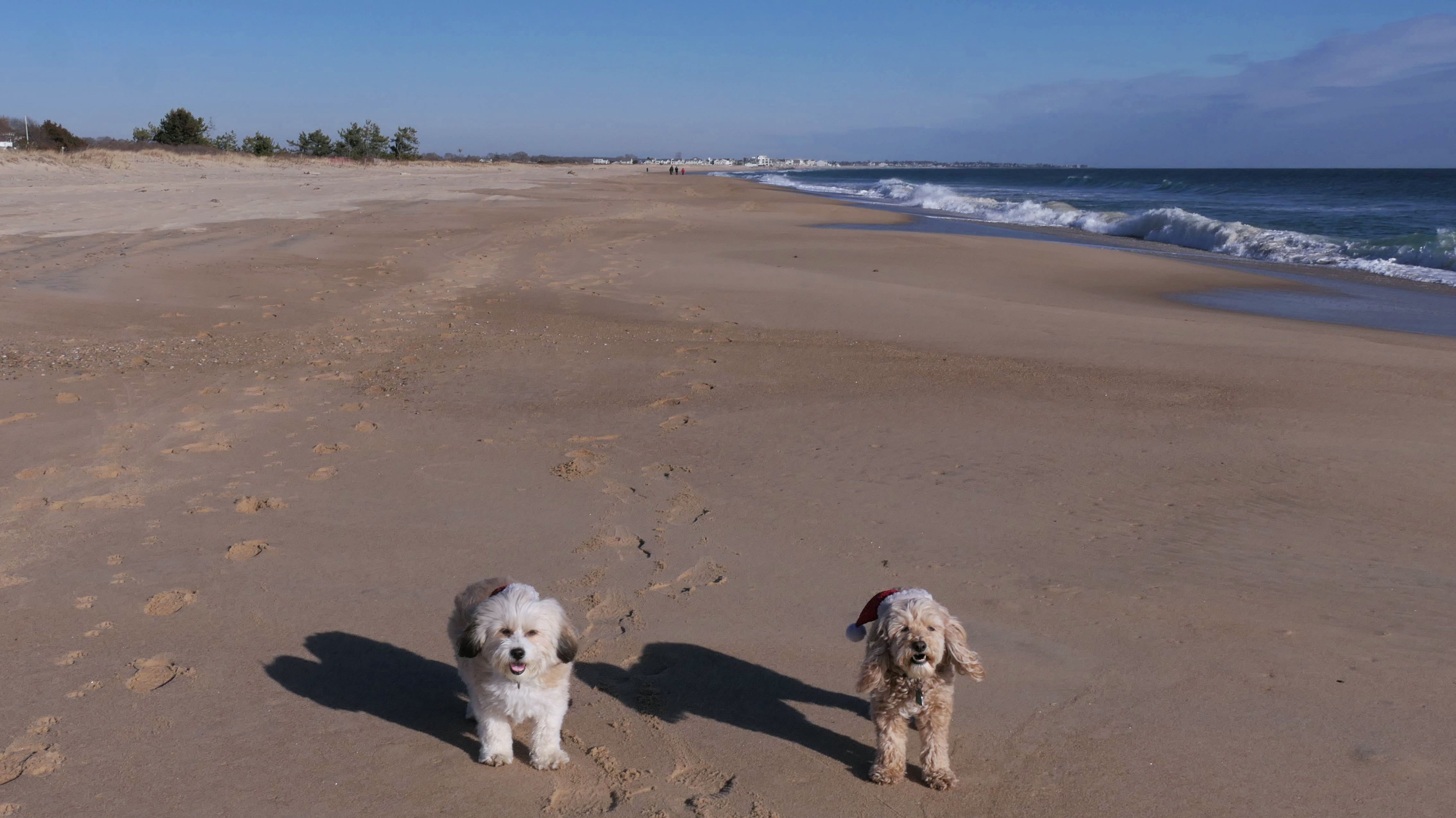 Nothing says Christmas in New England like a trip to the beach! We had a great four mile walk on Christmas Morning. It was damp, dreary, cloudy and foggy in the Hartford Connecticut area, but sunny and near 60 in Westerly. We couldn't park at the main lot since Atlantic Avenue was still flooded from the storm the week before. We parked at Dunes Park just to the west of the breachway, and walked west along the beach. Our route overlapped a bit with a section of the beach we we walked when we were at Misquamicut last year. The dogs were great sports with their Santa hats! And with the hats, we can tell these photos were taken on Christmas and not some day in July!