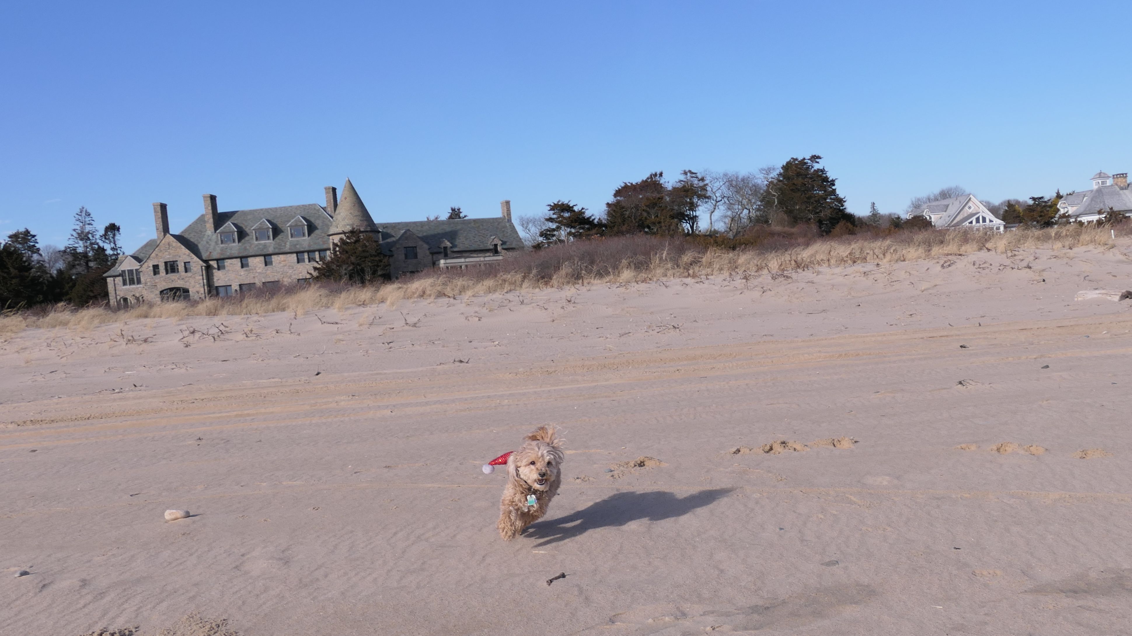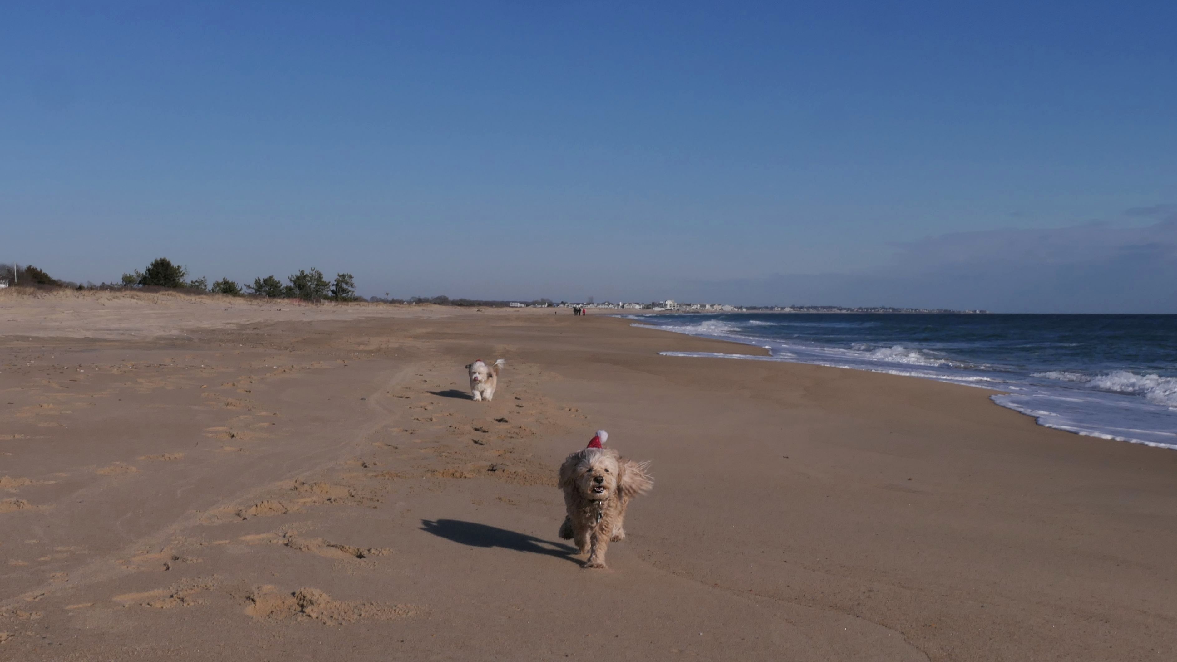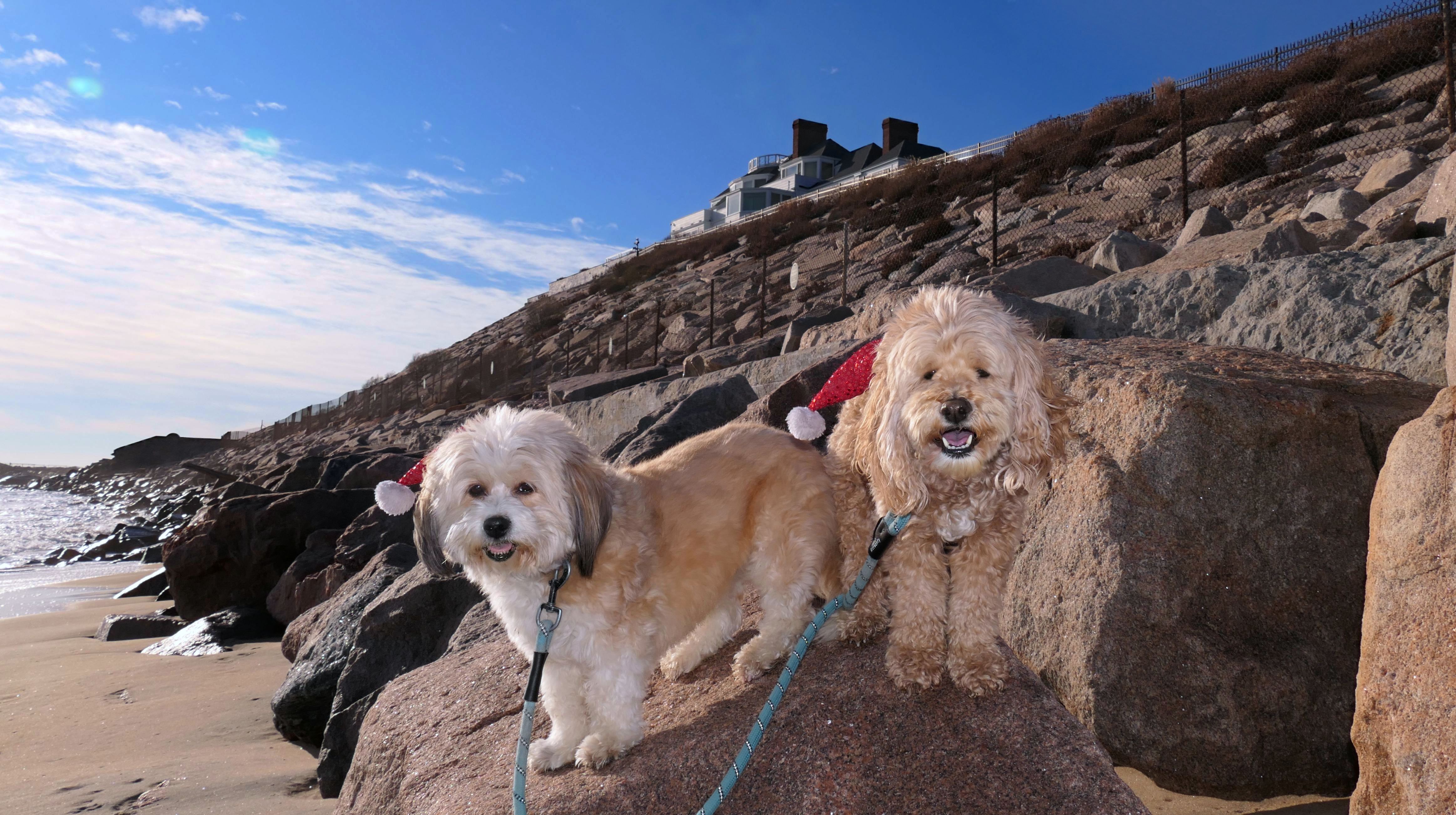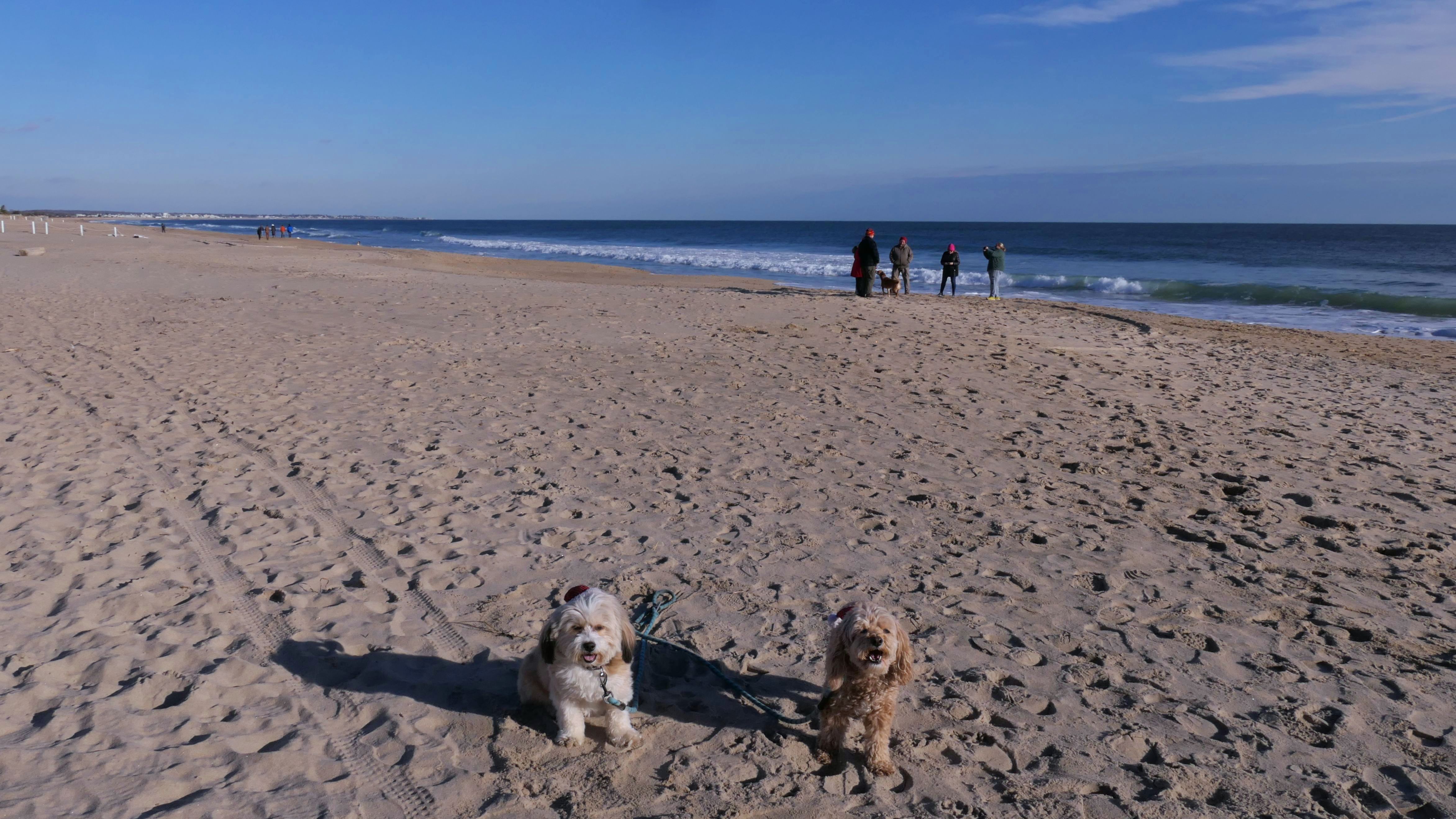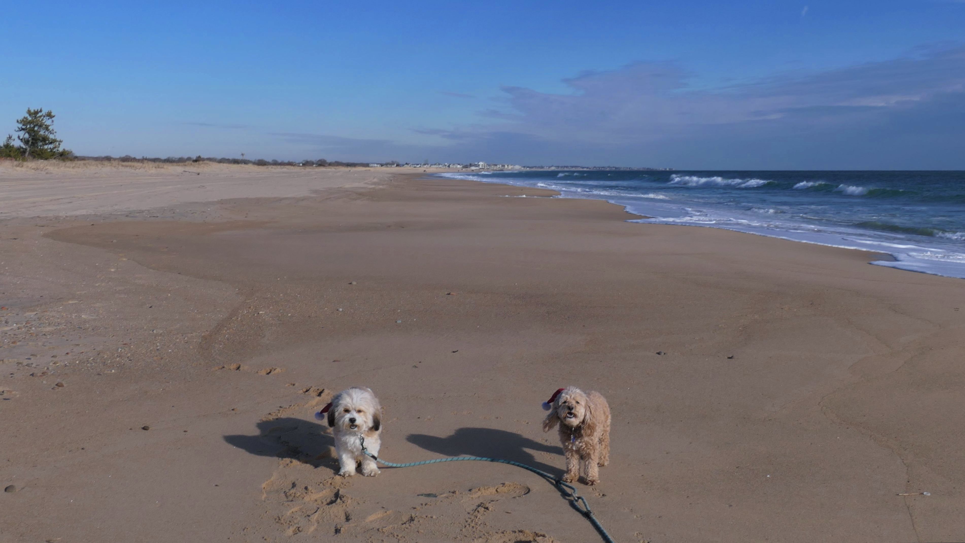 Nothing says Christmas in New England like a trip to the beach! We had a great four mile walk on Christmas Morning. It was damp, dreary, cloudy and foggy in the Hartford Connecticut area, but sunny and near 60 in Westerly. We couldn't park at the main lot since Atlantic Avenue was still flooded from the storm the week before. We parked at Dunes Park just to the west of the breachway, and walked west along the beach. Our route overlapped a bit with a section of the beach we we walked when we were at Misquamicut last year. The dogs were great sports with their Santa hats! And with the hats, we can tell these photos were taken on Christmas and not some day in July!