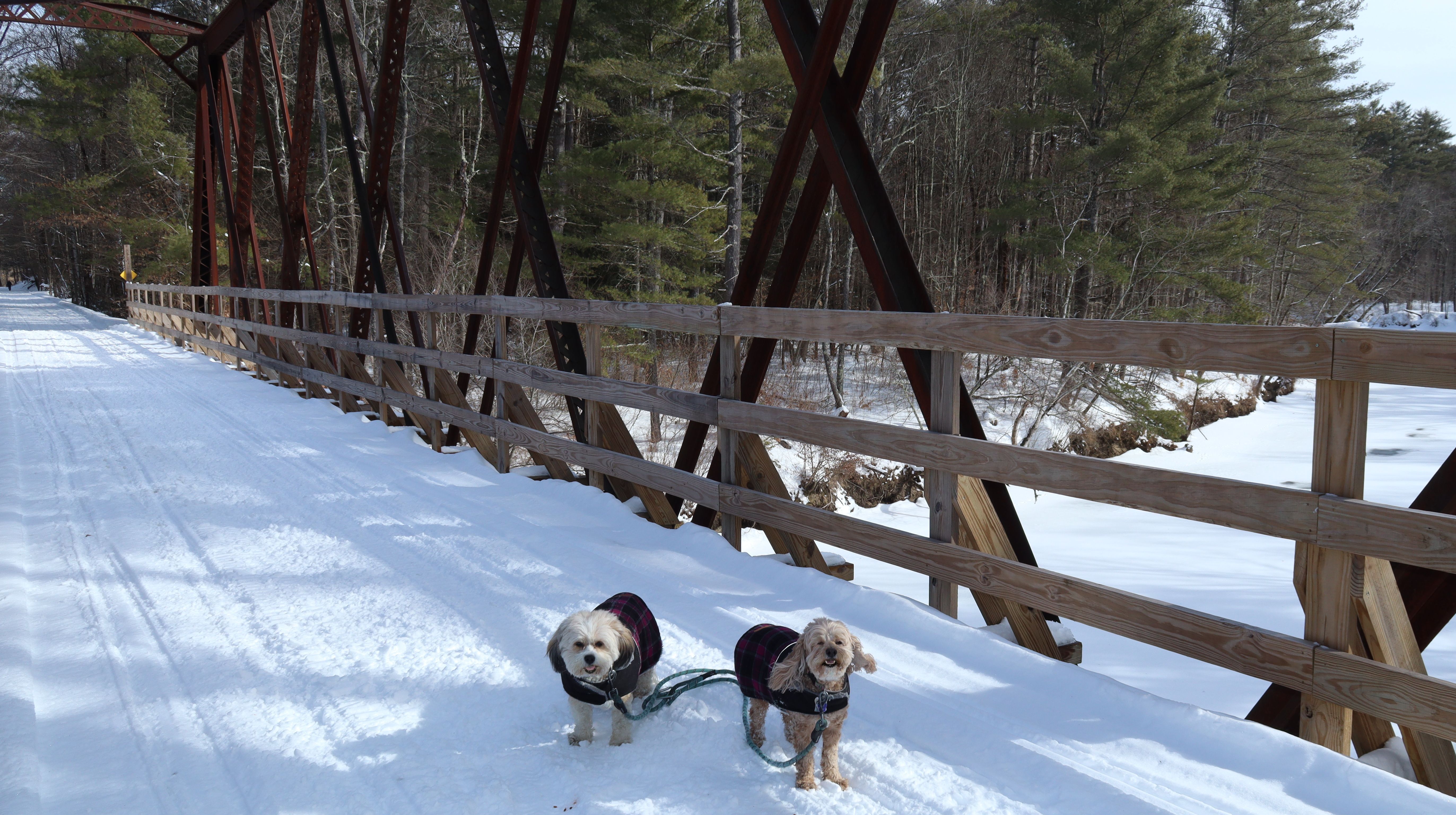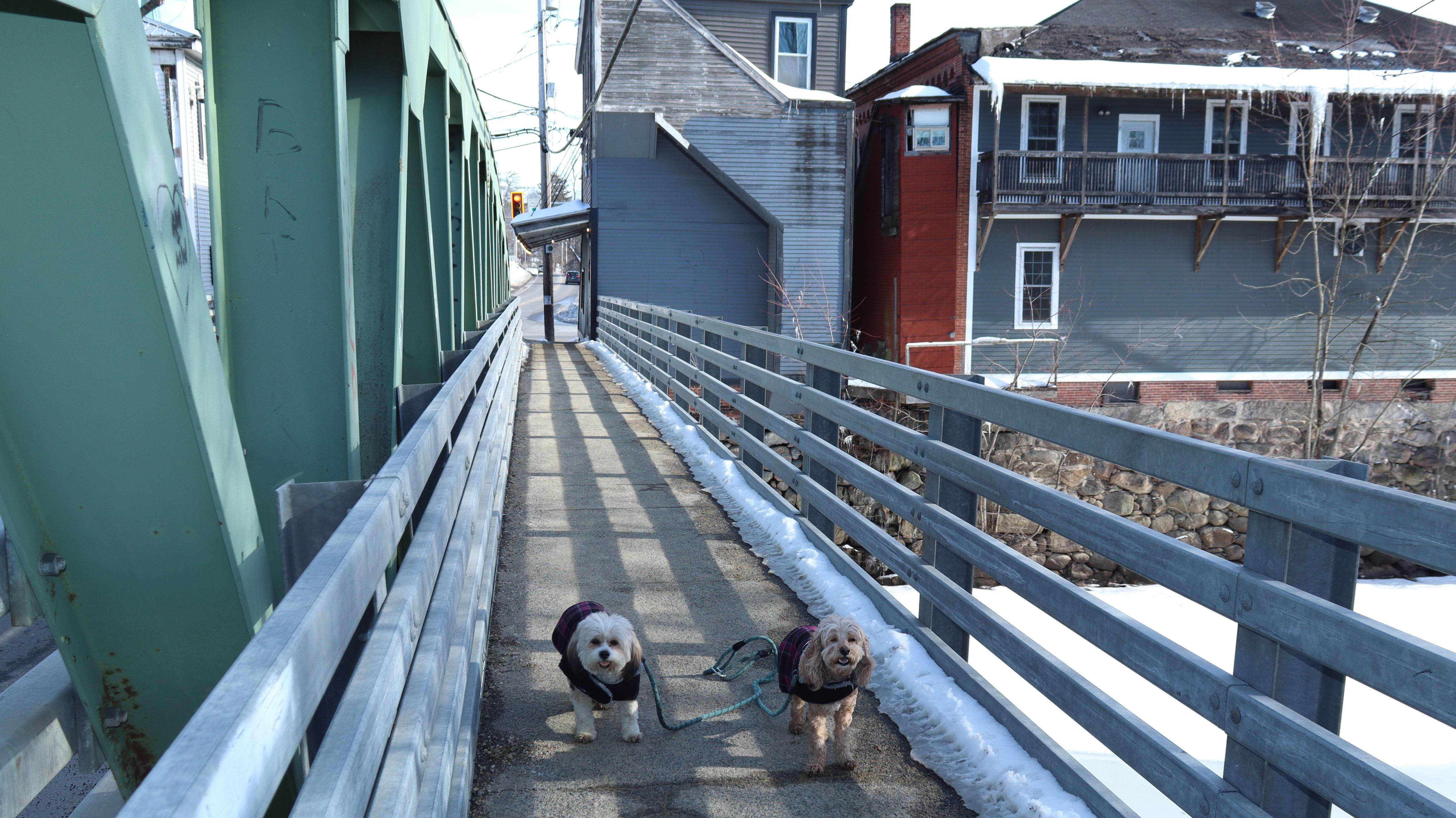 Mandy and Lexi had been a little off-the-wall of late. With the 'Blizzard of '26' dumping feet of snow around the area earlier in the week, it's been difficult finding places to visit. There was actually less snow to the north, and a sunnier forecast, so we headed up to southern New Hampshire. The plan was to take a few photos near this bridge, then head to the Downtown Historic District for the majority of our walk. This is a very cool covered bridge. It features pedestrian sidewalks on either side, but one side was closed. It's also very near the Ashuelot Rail Trail, which to my surprise, was passable so we actually headed there next.