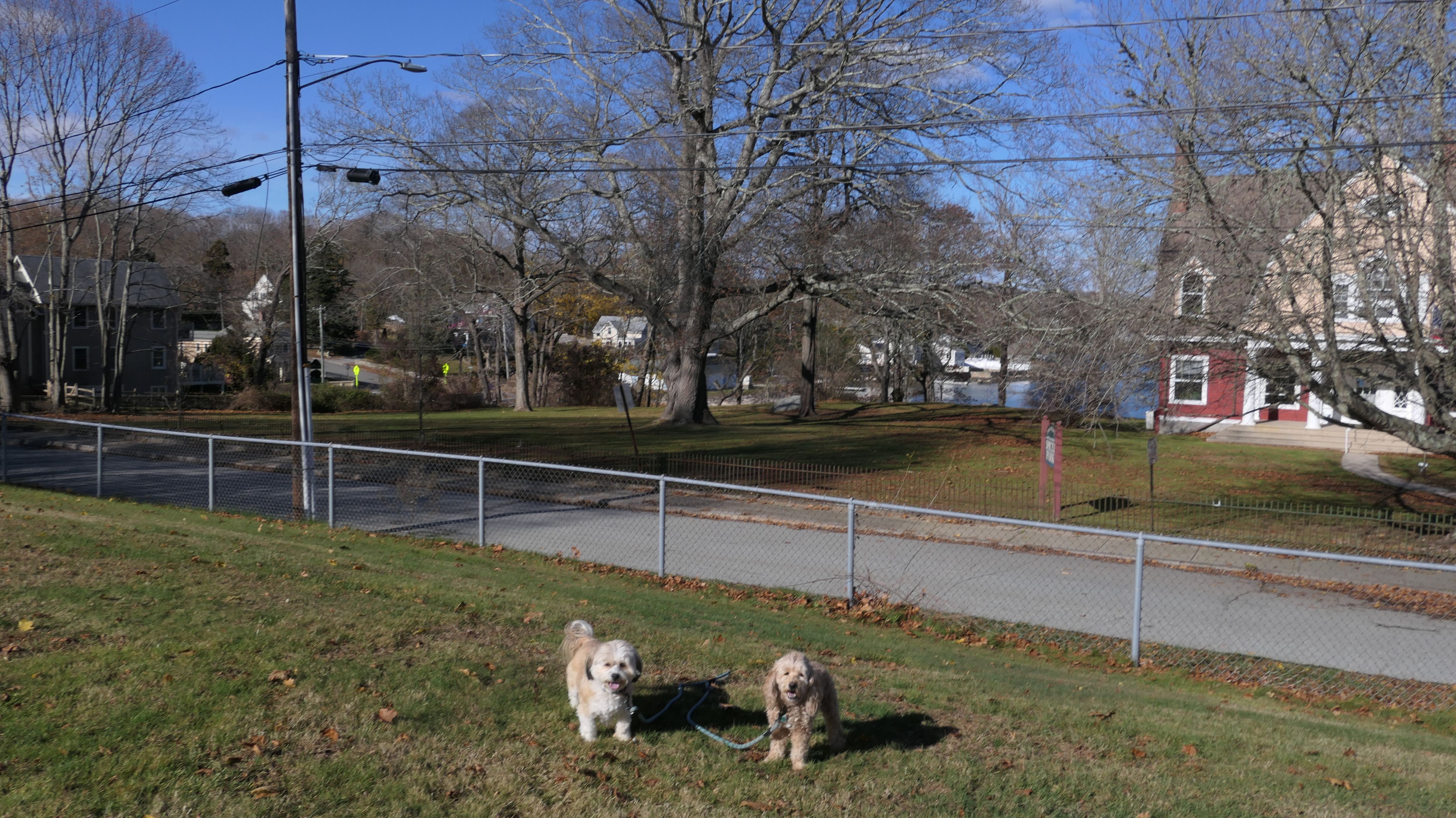 We visited this park as part of our walk through Noank Village on Thanksgiving morning. There is a walkway from Mosher Avenue that leads to a partially fenced in grassy area. The park continues across Spicer Avenue with a picnic area and boat dock, as well as the town parks and recreation building.