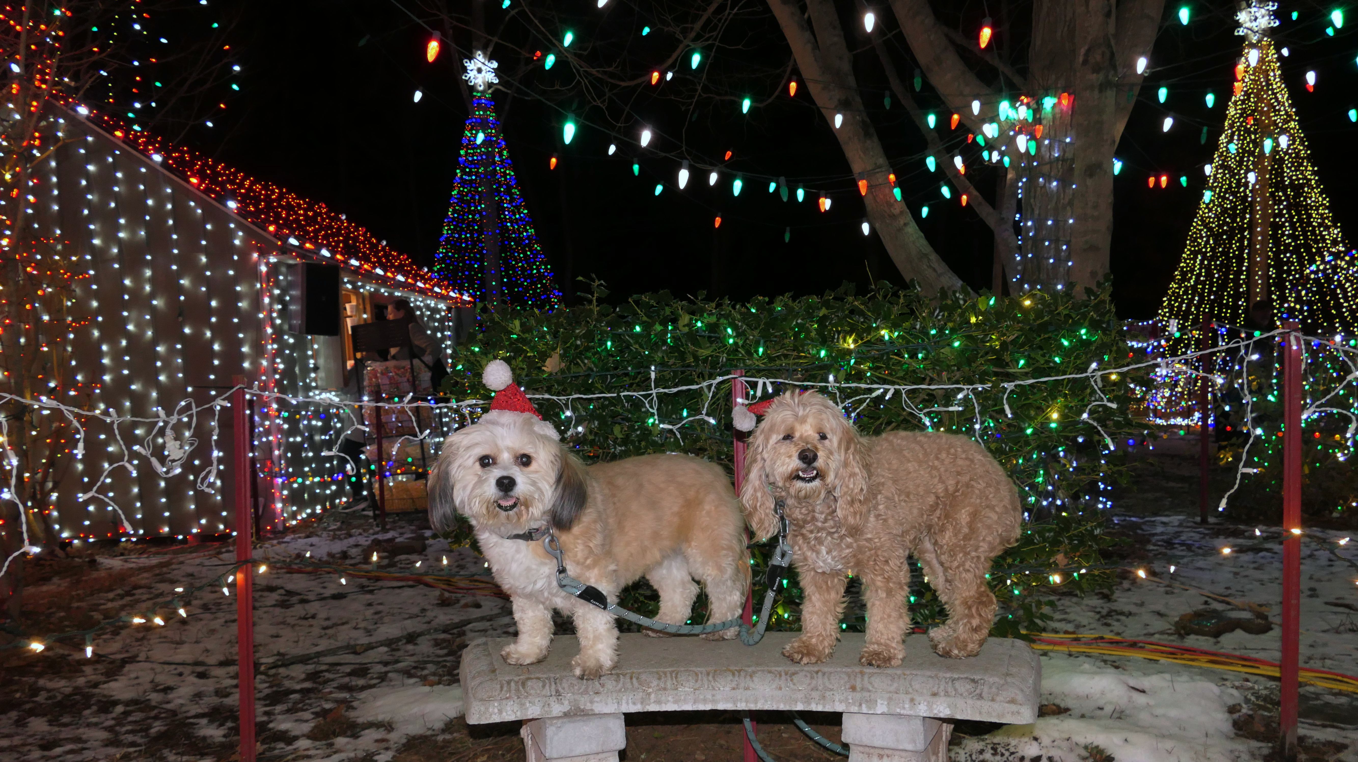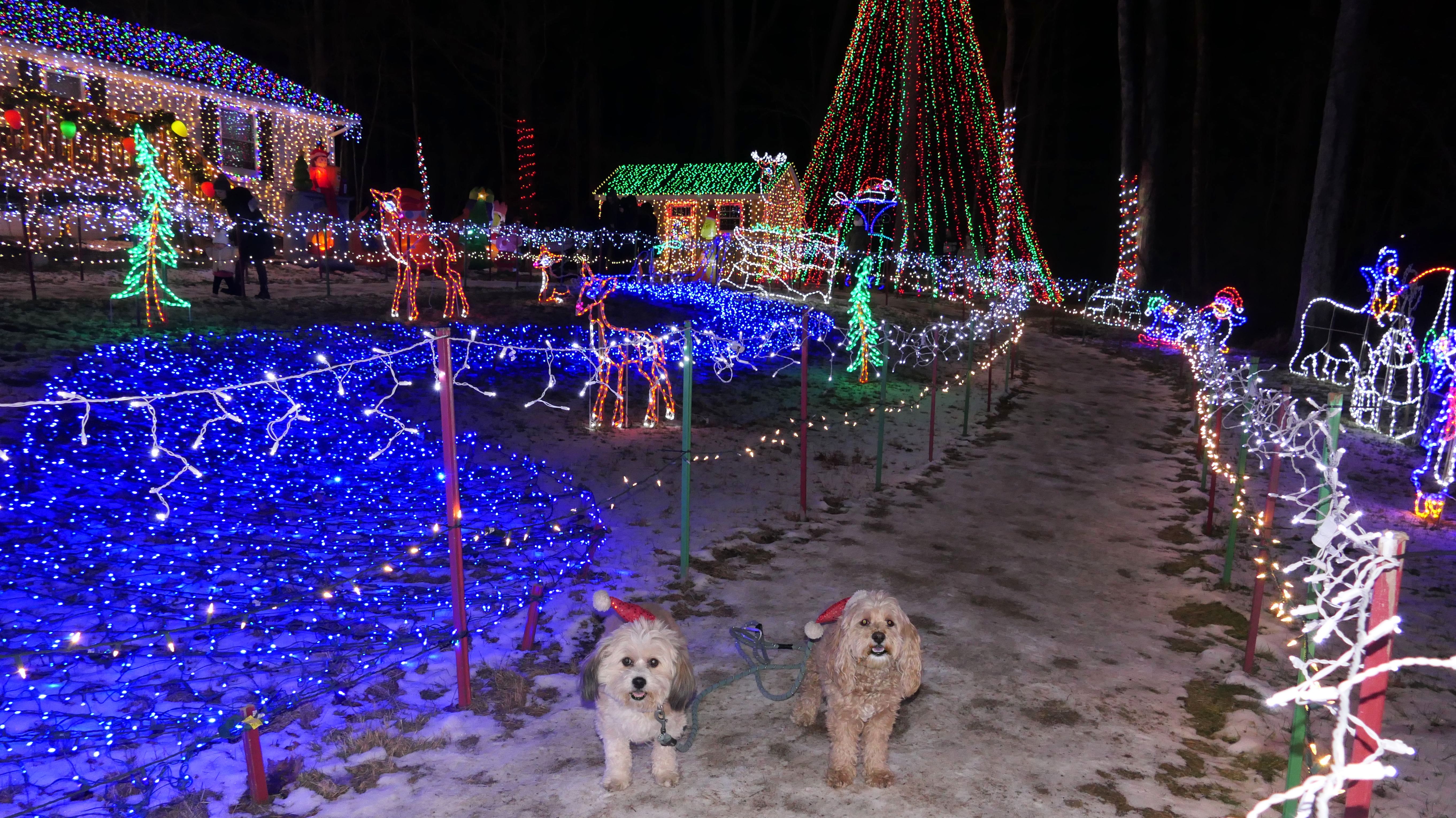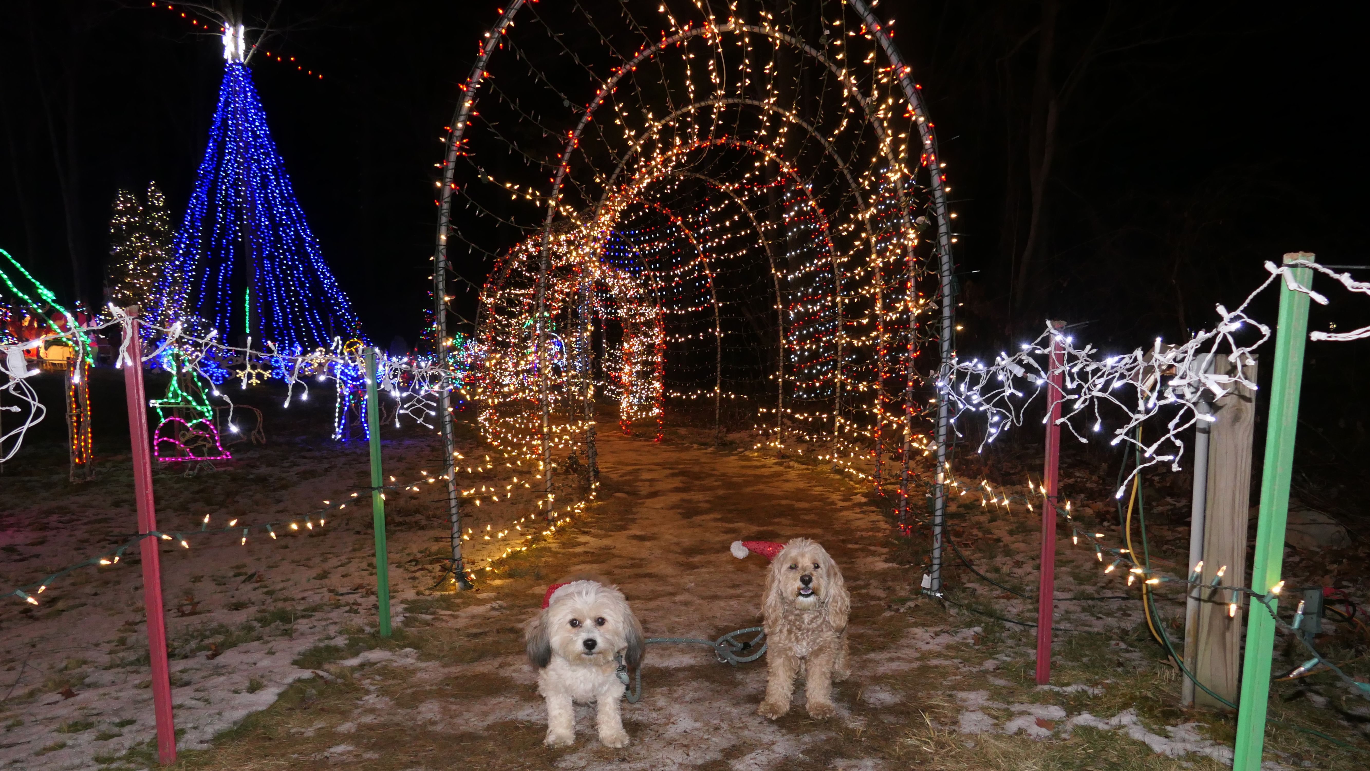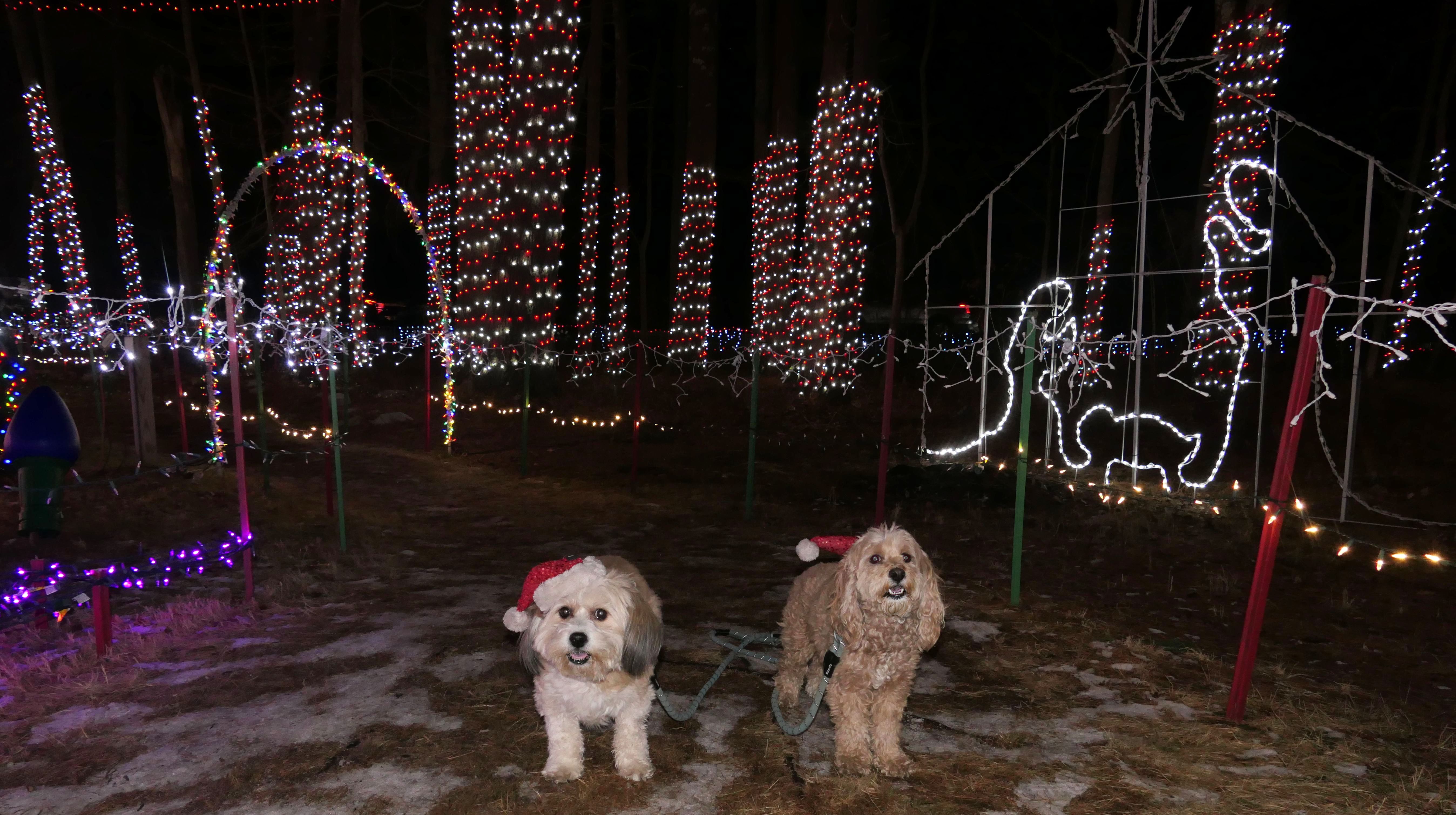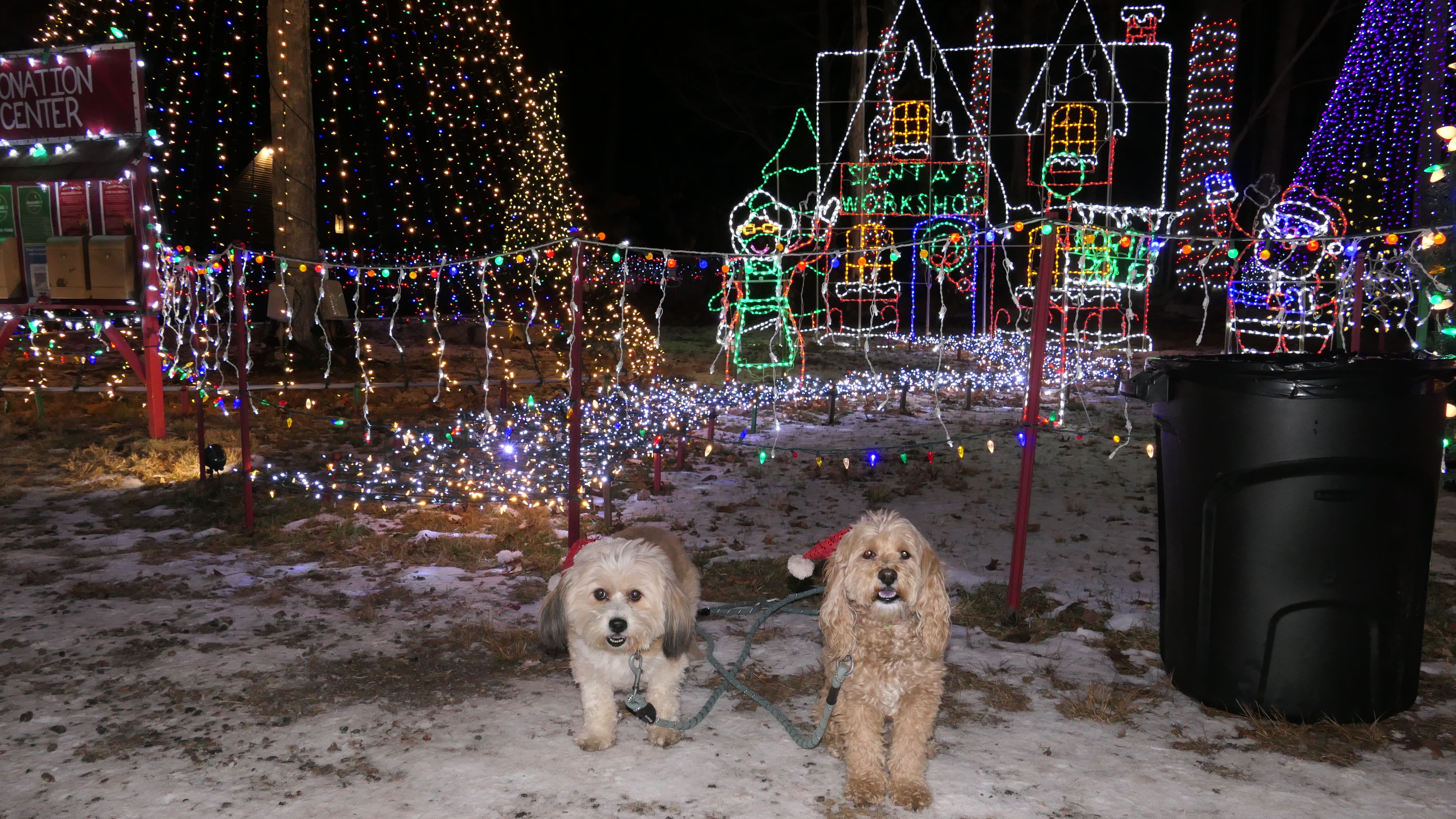 This is an impressive walk-through, dog-friendly light display in the Dayville section of Killingly. The display is open each night from 5PM to 9PM, Thanksgiving through New Years Day. There's a small stand that sells hot chocolate and snacks, as well as pup-cups for the dogs! As you can see, Mandy got her nose stuck in the pup-cup! This was a fun activity that got us out of the house after work, and we got some great holiday photos.