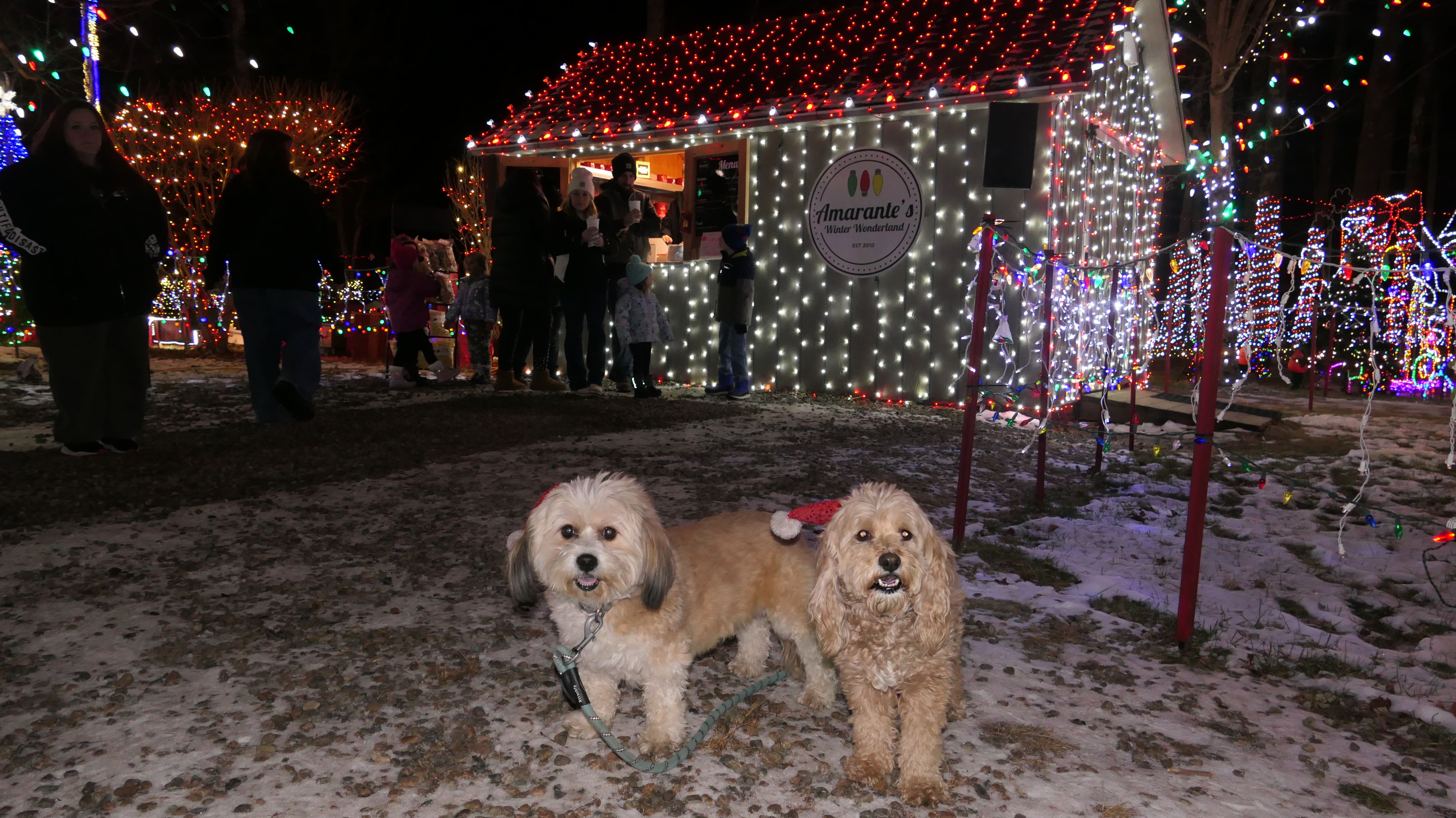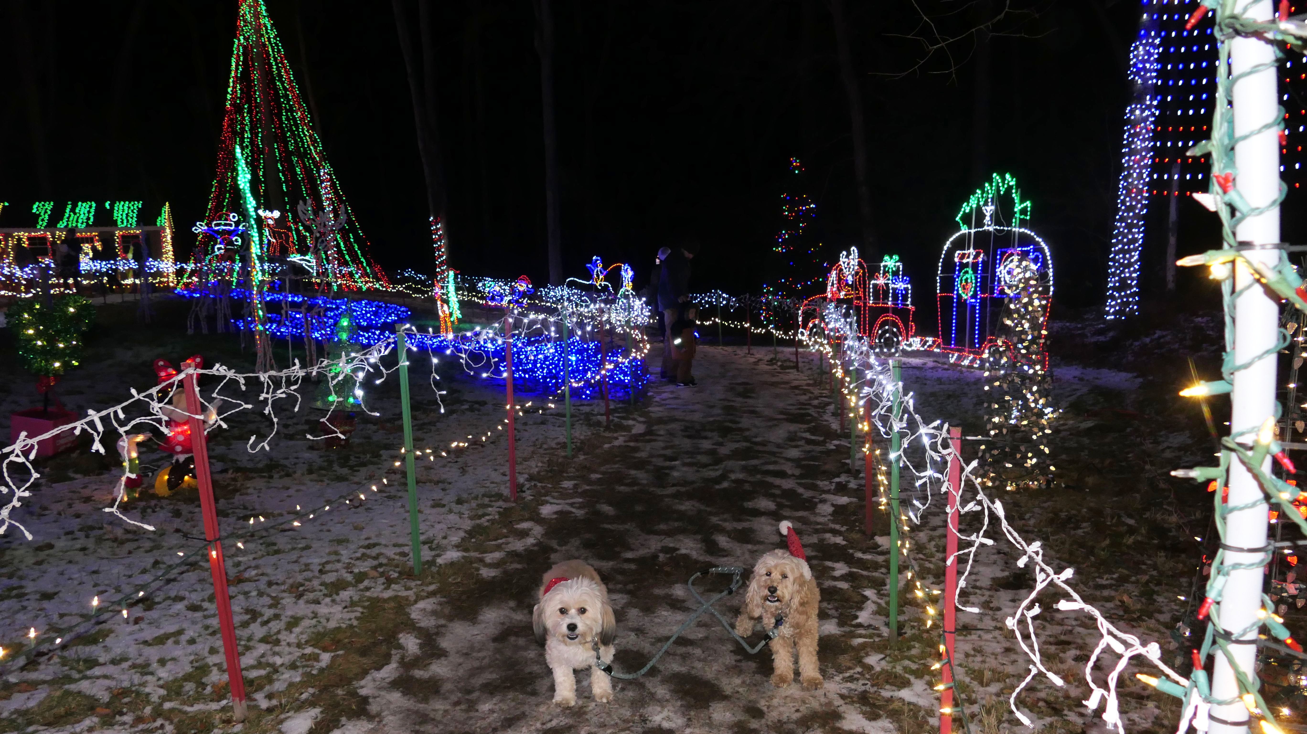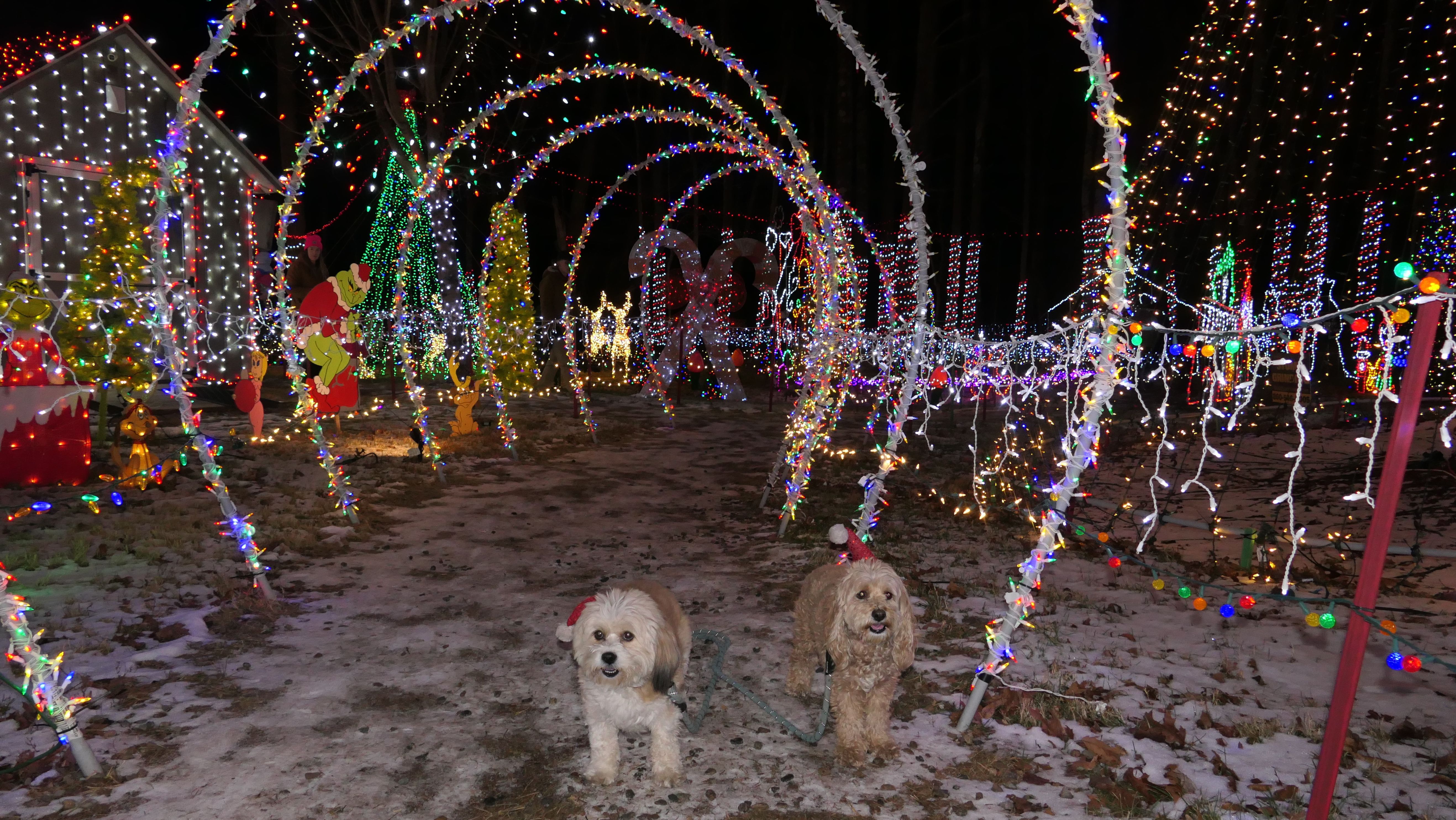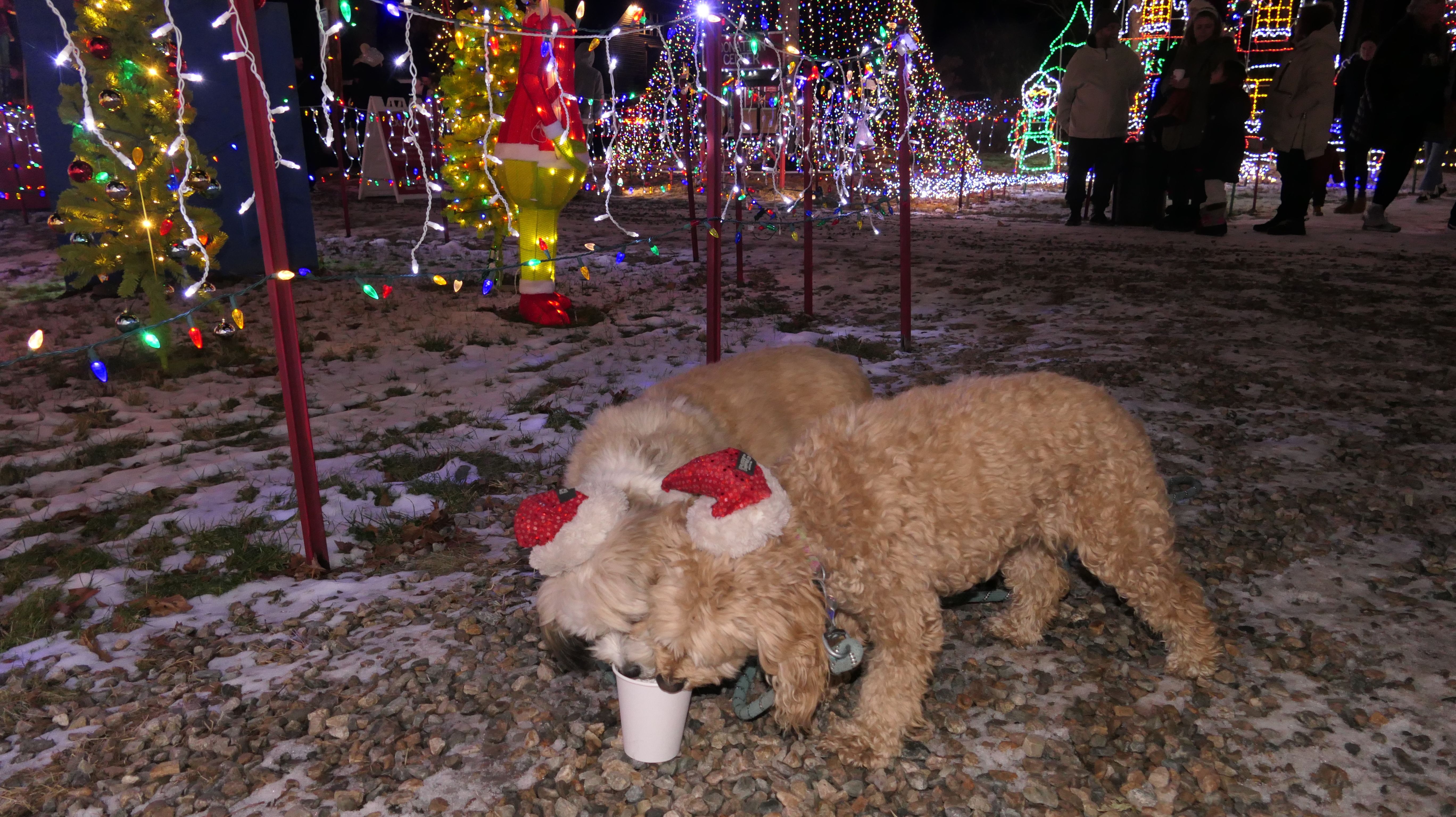 This is an impressive walk-through, dog-friendly light display in the Dayville section of Killingly. The display is open each night from 5PM to 9PM, Thanksgiving through New Years Day. There's a small stand that sells hot chocolate and snacks, as well as pup-cups for the dogs! As you can see, Mandy got her nose stuck in the pup-cup! This was a fun activity that got us out of the house after work, and we got some great holiday photos.