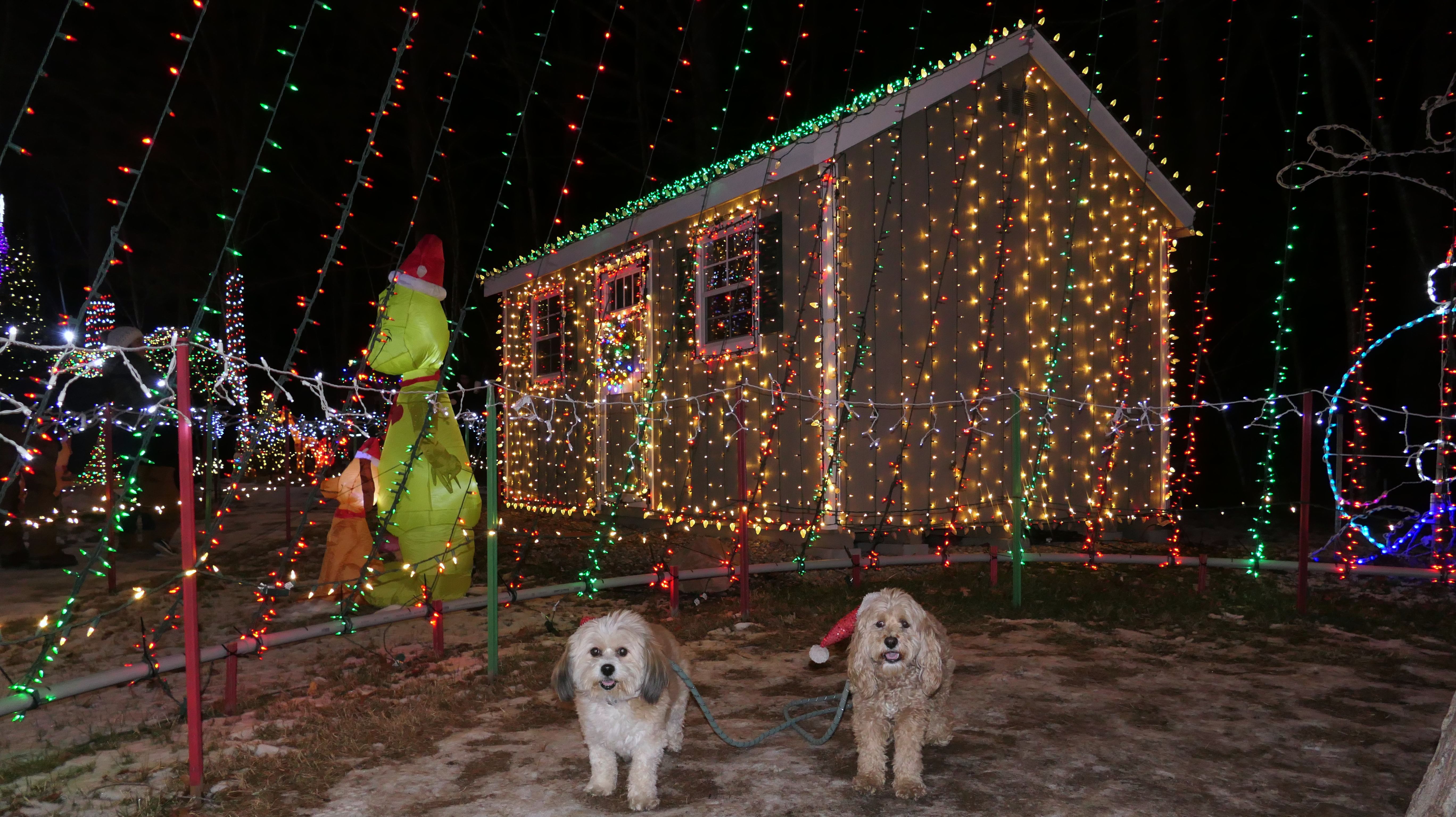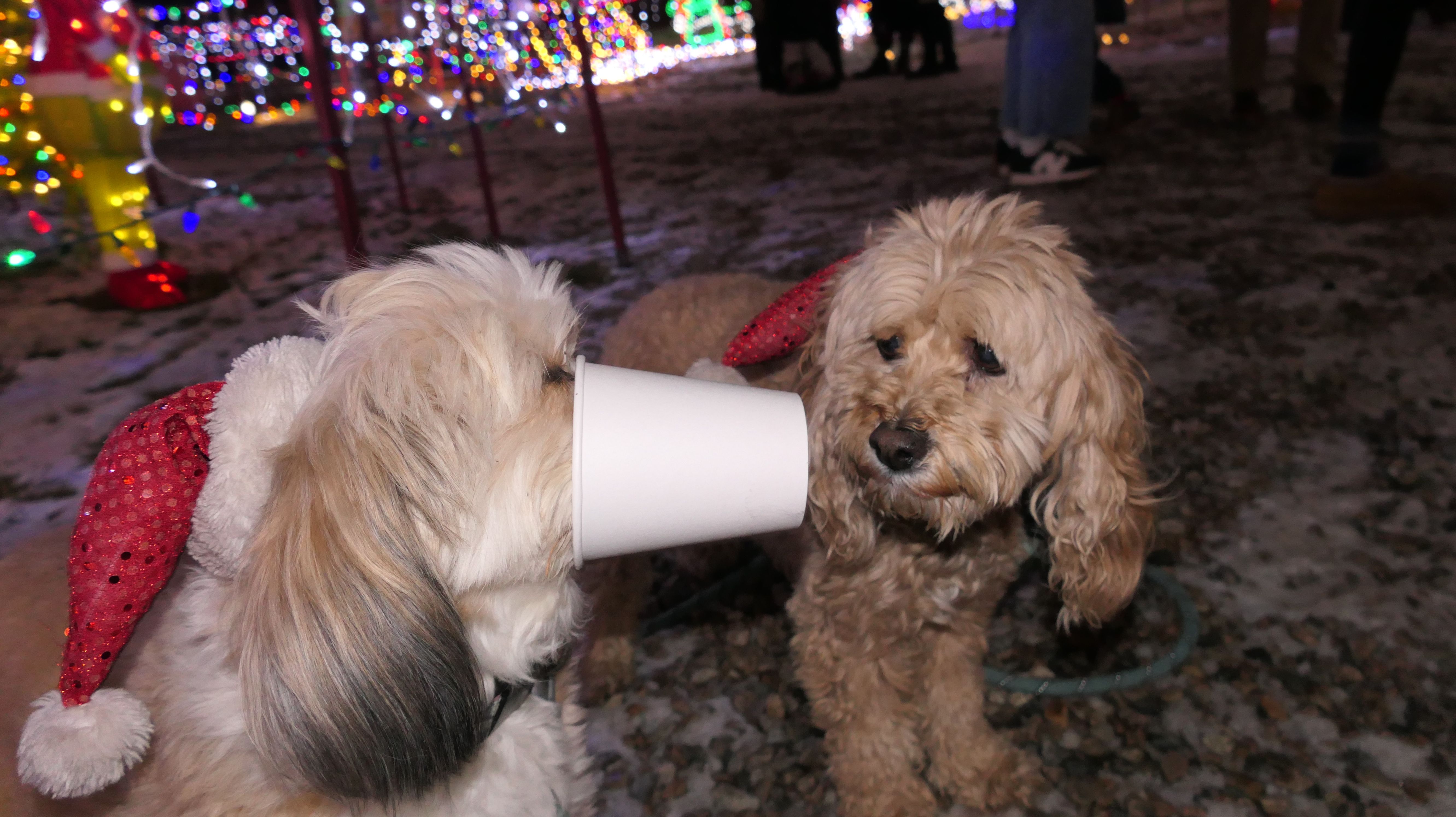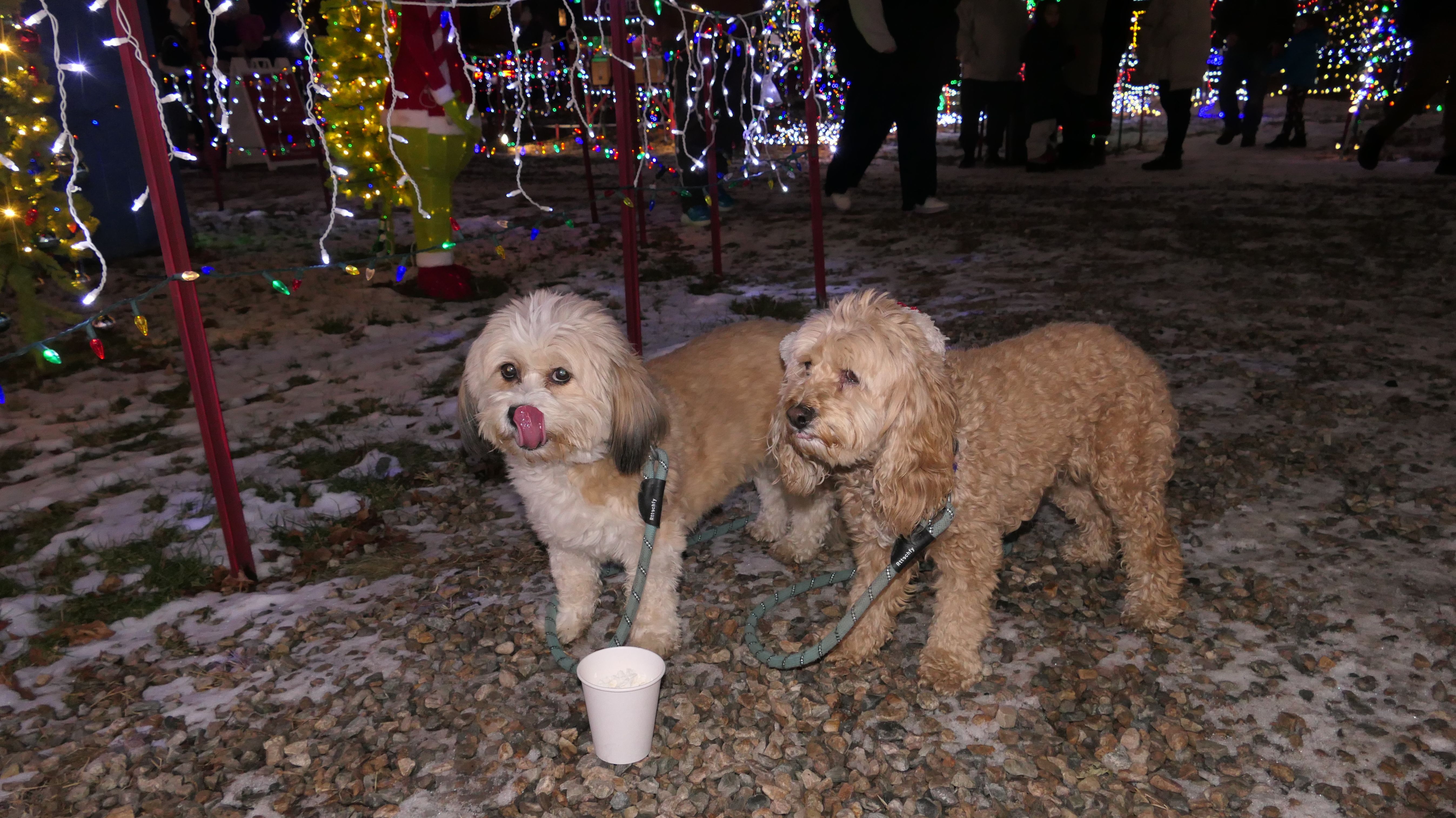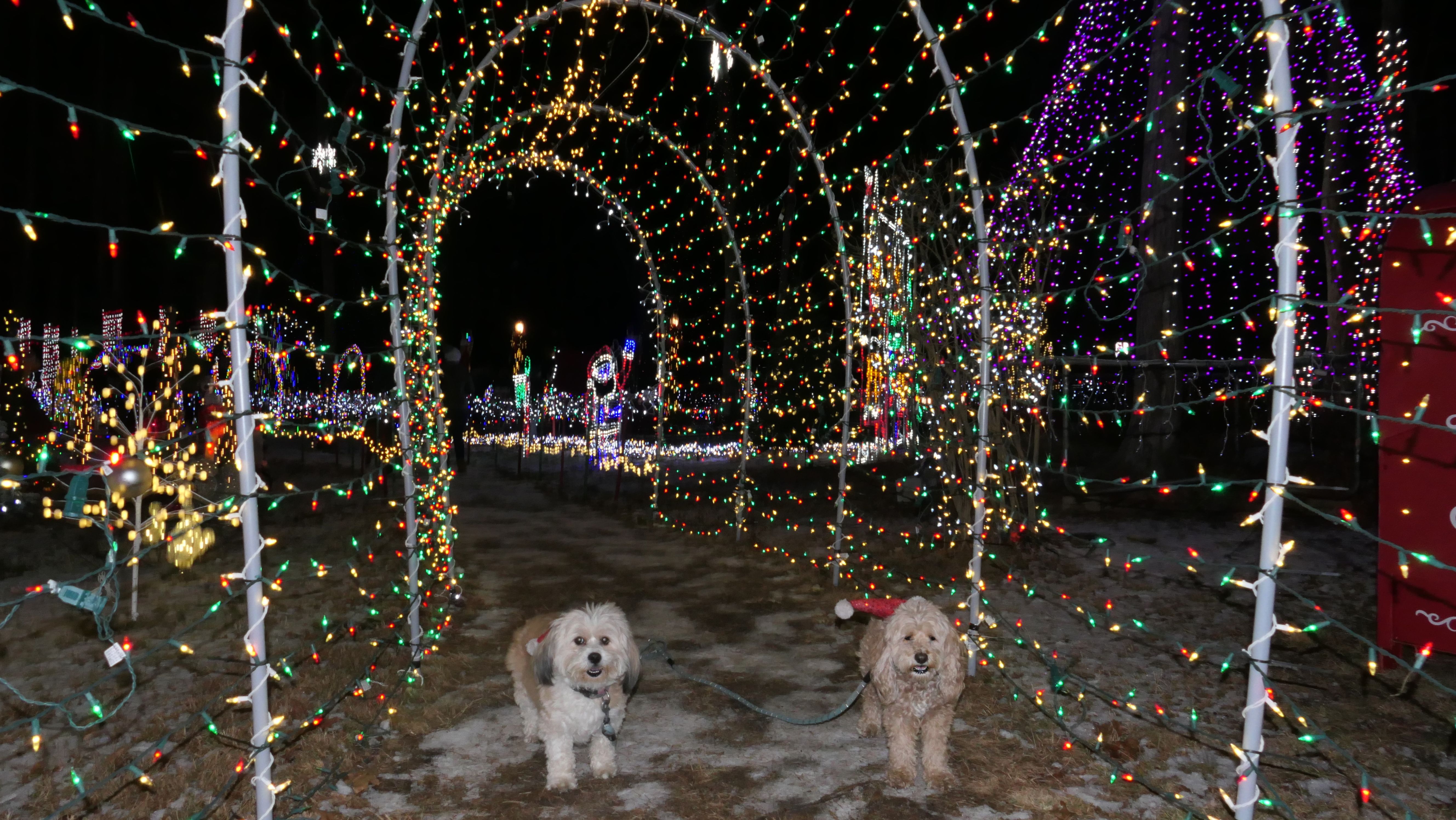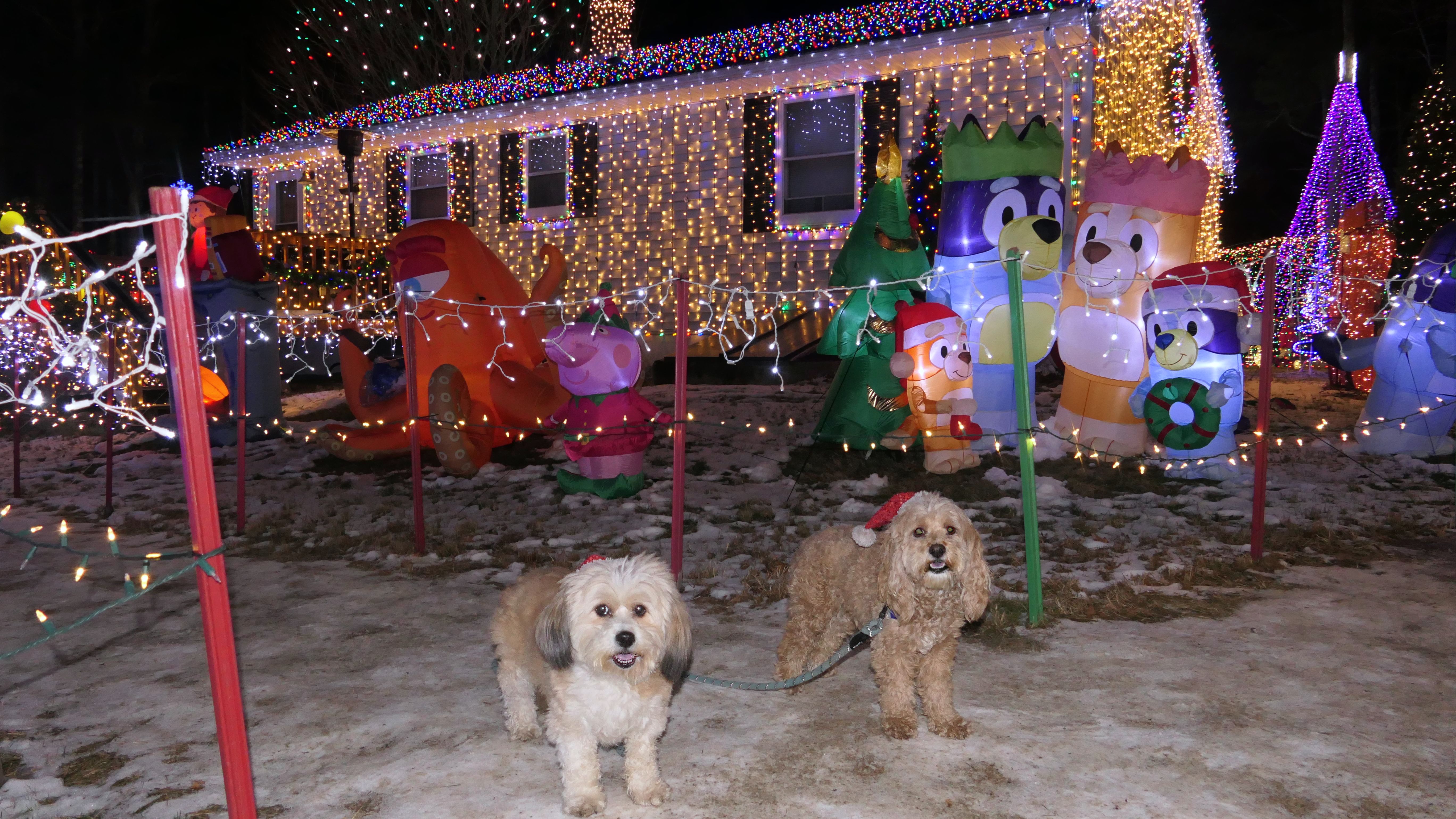 This is an impressive walk-through, dog-friendly light display in the Dayville section of Killingly. The display is open each night from 5PM to 9PM, Thanksgiving through New Years Day. There's a small stand that sells hot chocolate and snacks, as well as pup-cups for the dogs! As you can see, Mandy got her nose stuck in the pup-cup! This was a fun activity that got us out of the house after work, and we got some great holiday photos.