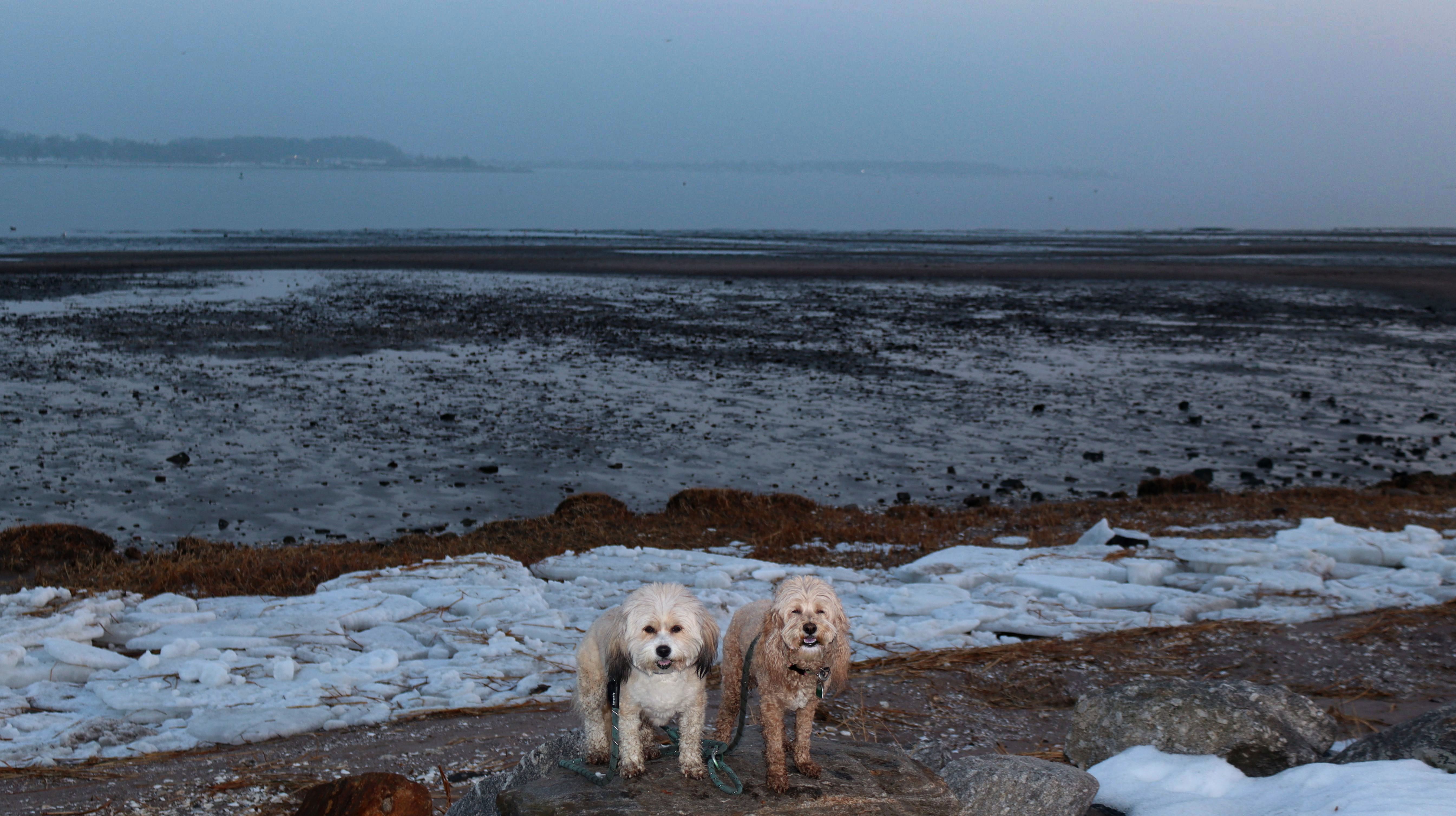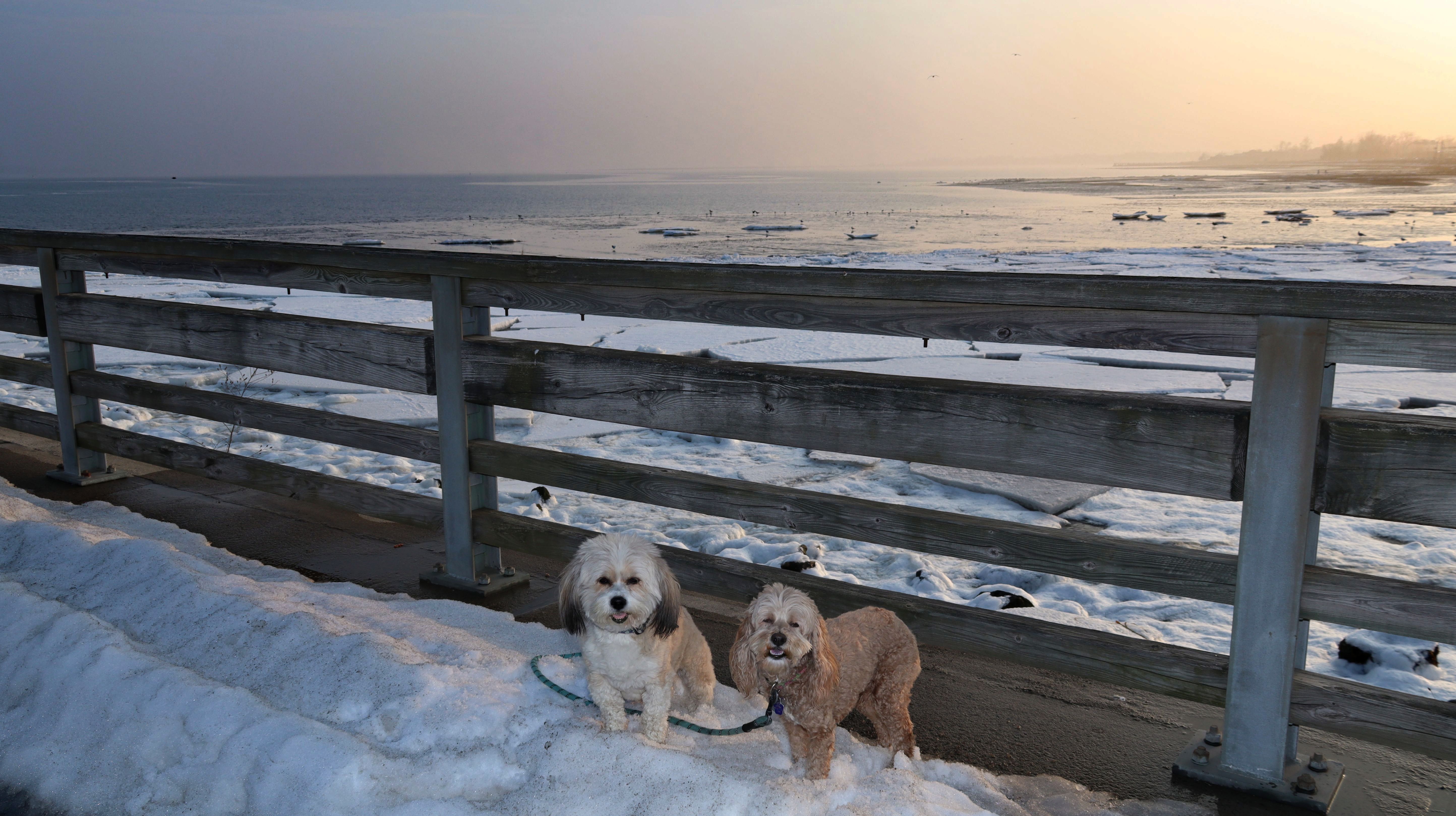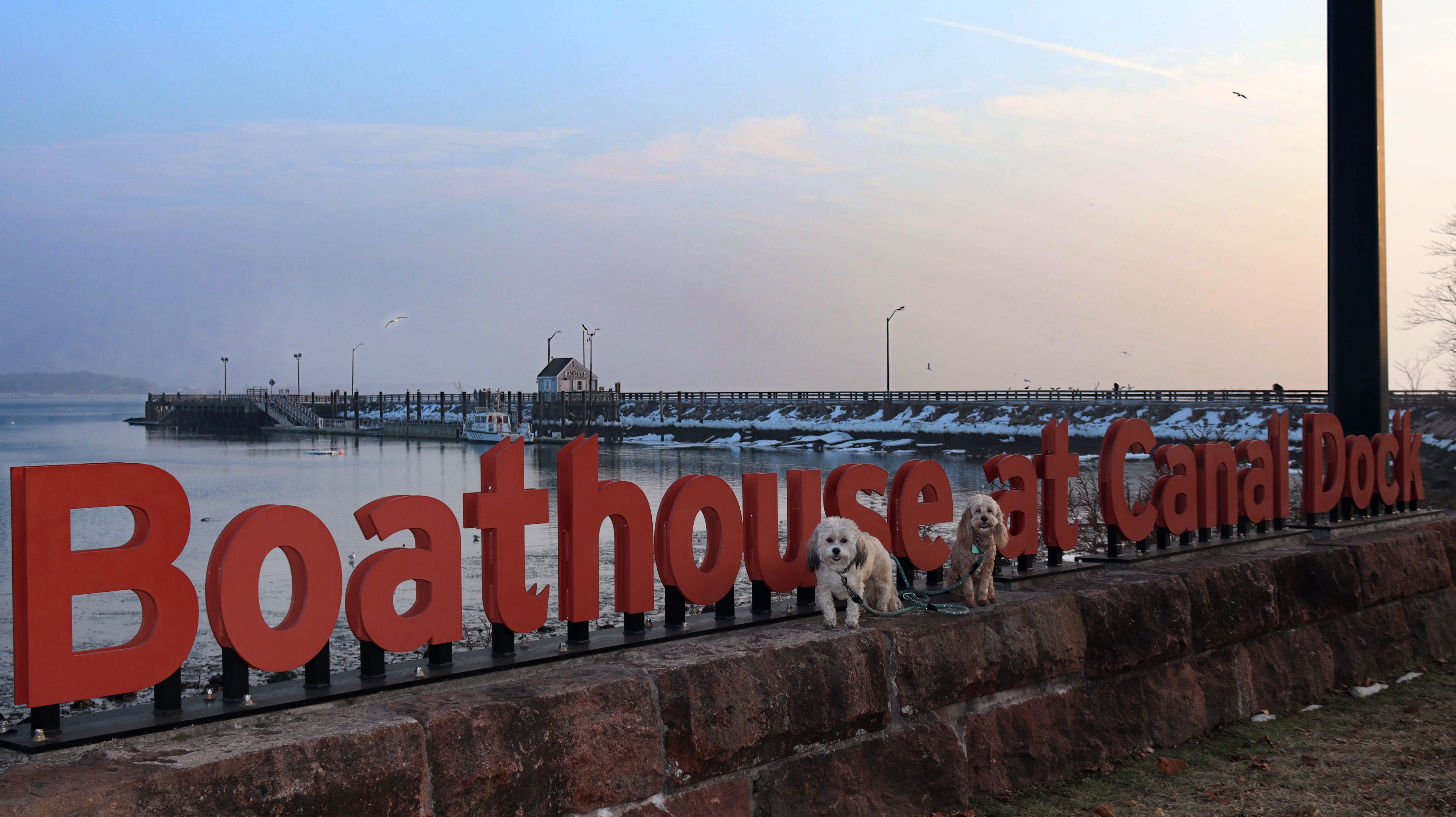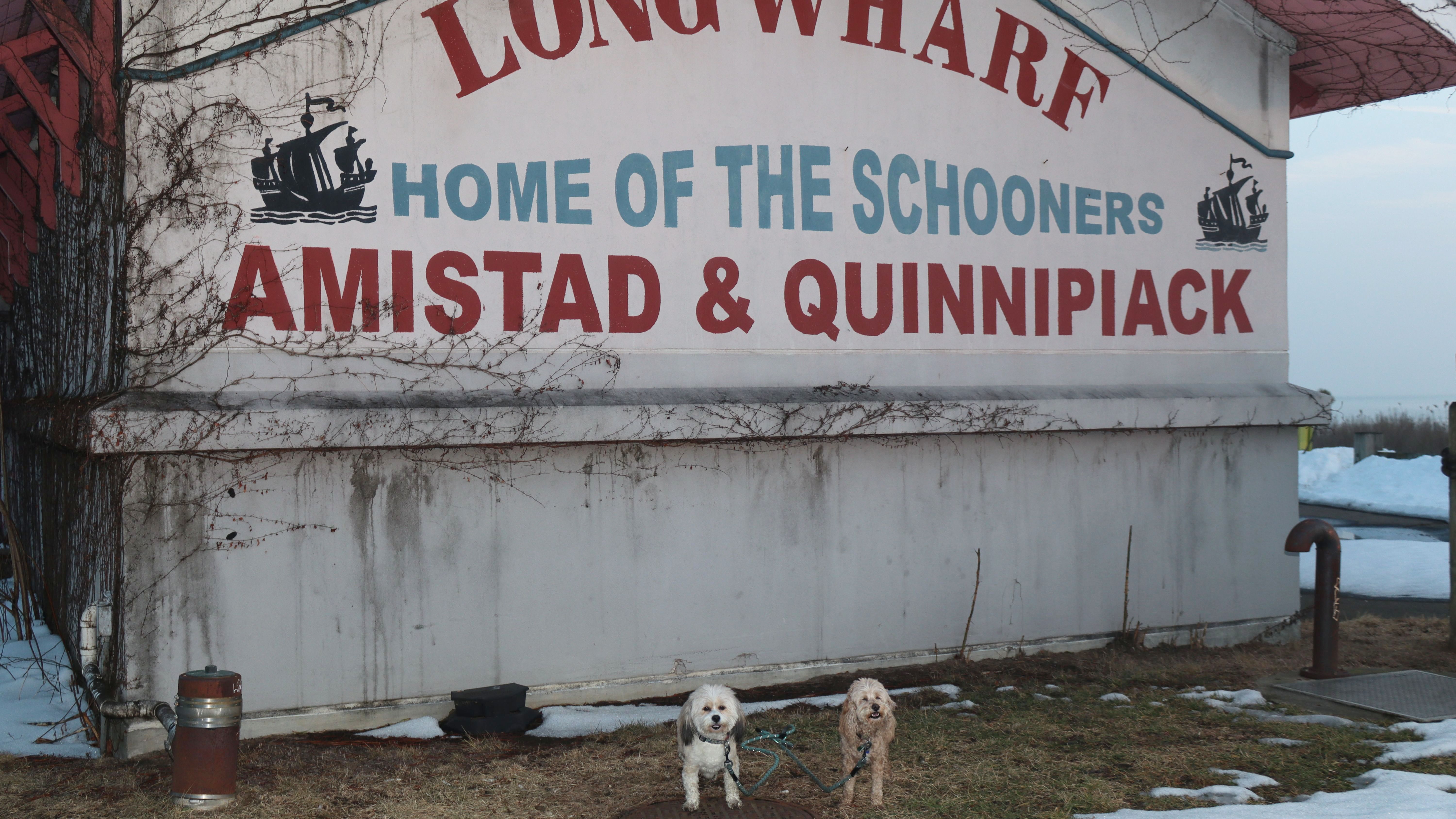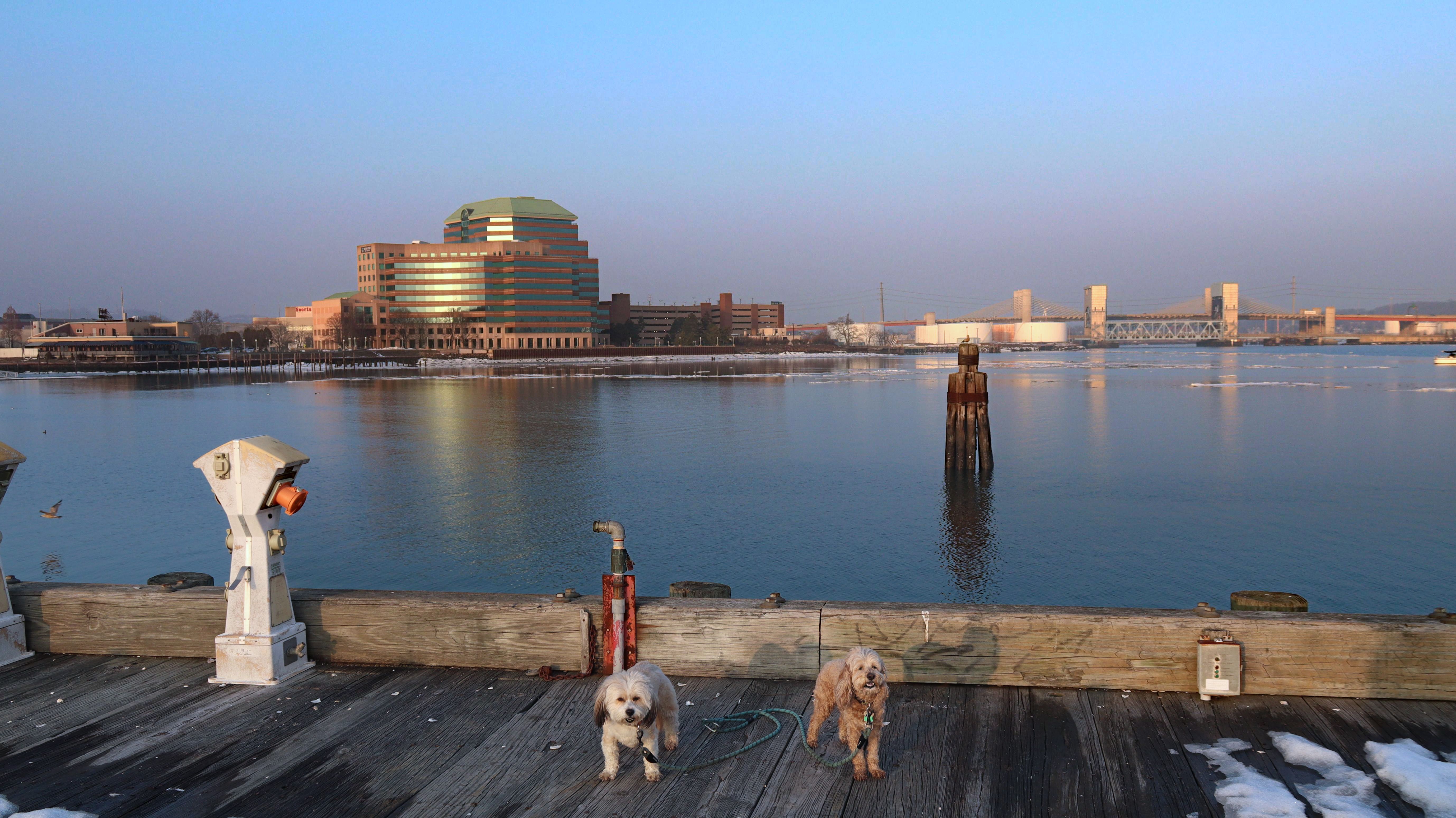 It was gray and gloomy for most of the day. The sun made a brief attempt to break through late in the afternoon, but it only left us with haze and fog, which created some interesting photo opportunities. We had visited before, first back in November of 2020, and later passed through again when we reached the southern end of the Farmington Canal Heritage Trail. It felt strange seeing chunks of ice floating in New Haven Harbor. We walked the full length of the harbor-side walkway, a little over two and a half miles round trip. On the opposite side of the street, food trucks were lined up, but every single one was a taco truck, so there wasn't much variety. The dogs enjoyed the walk, especially Mandy, who made it her personal mission to step in every puddle along the way.